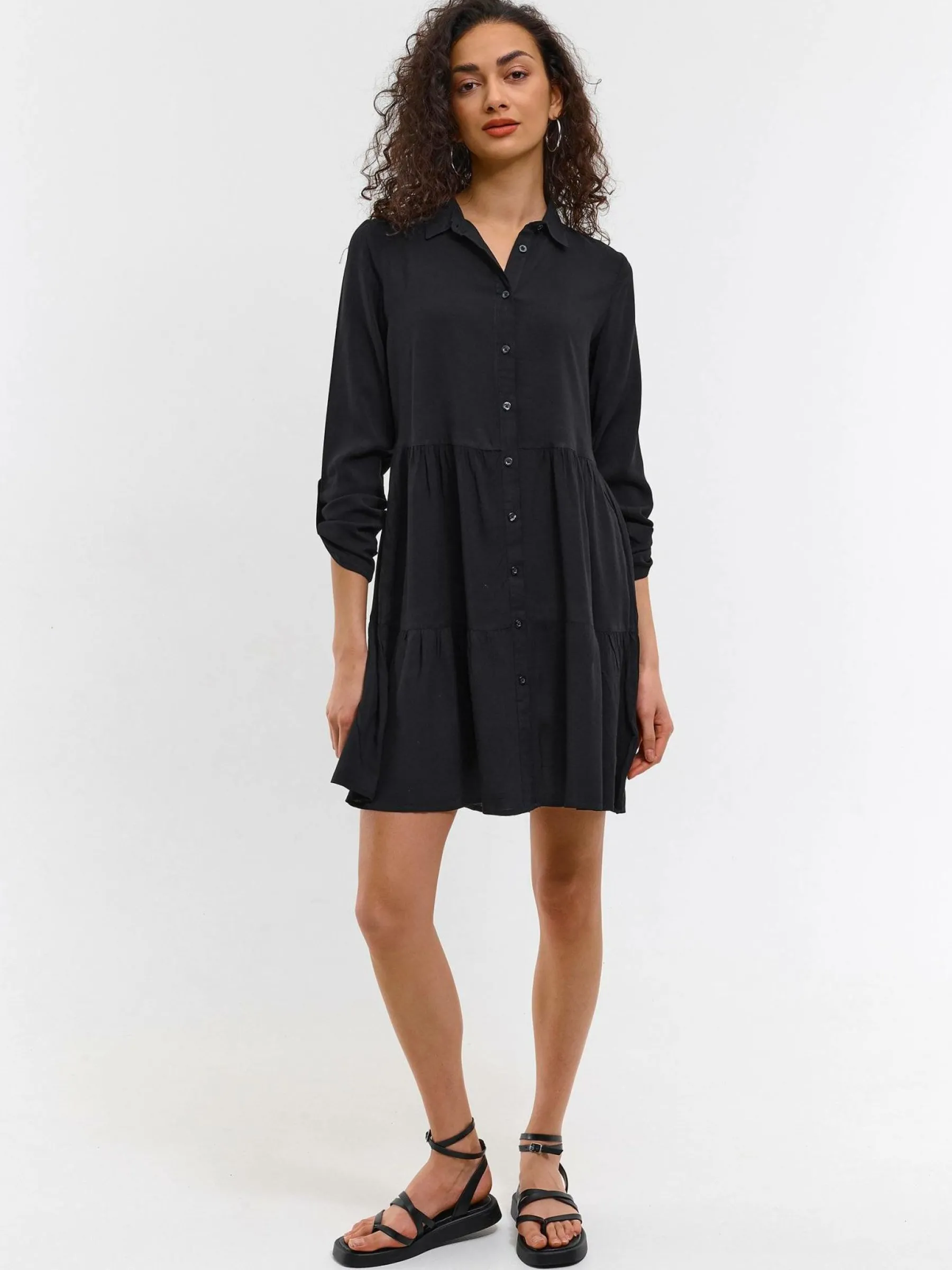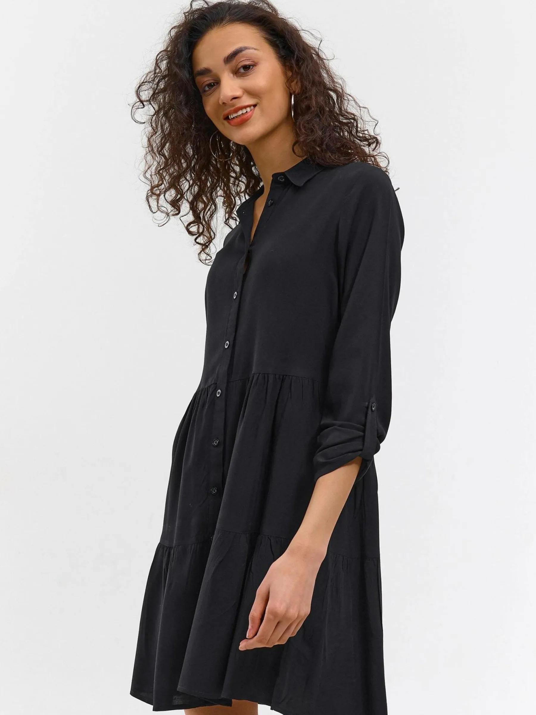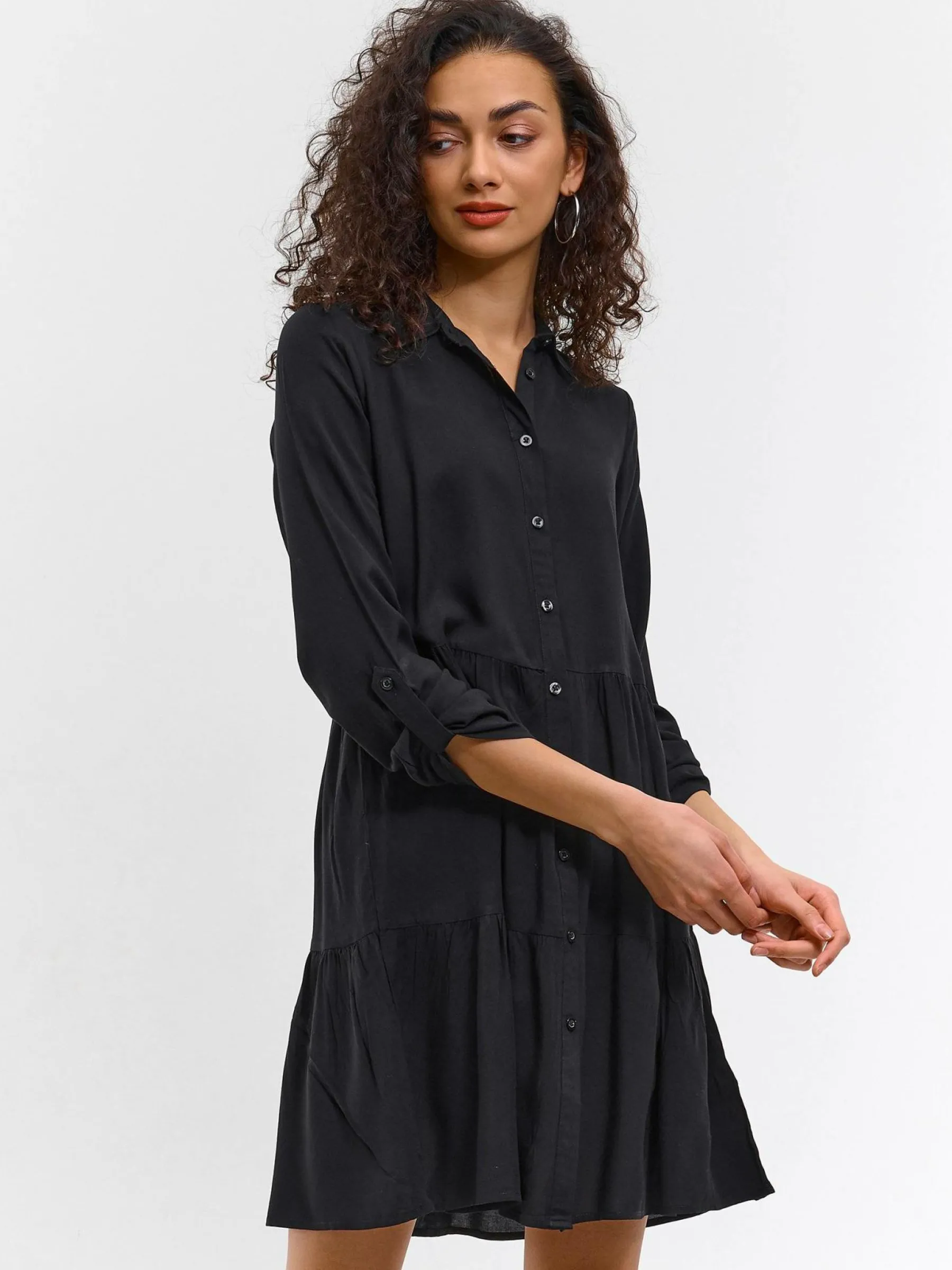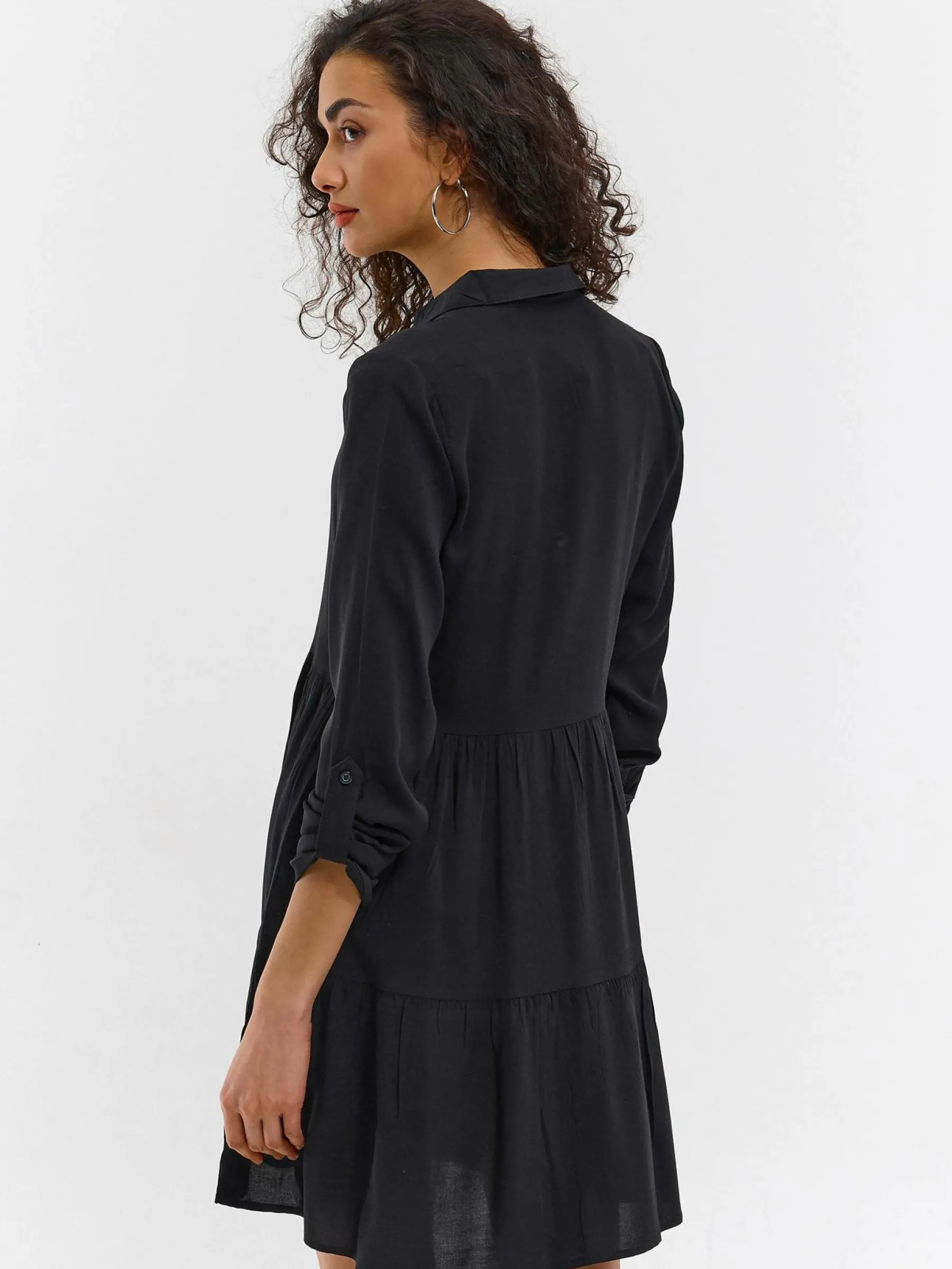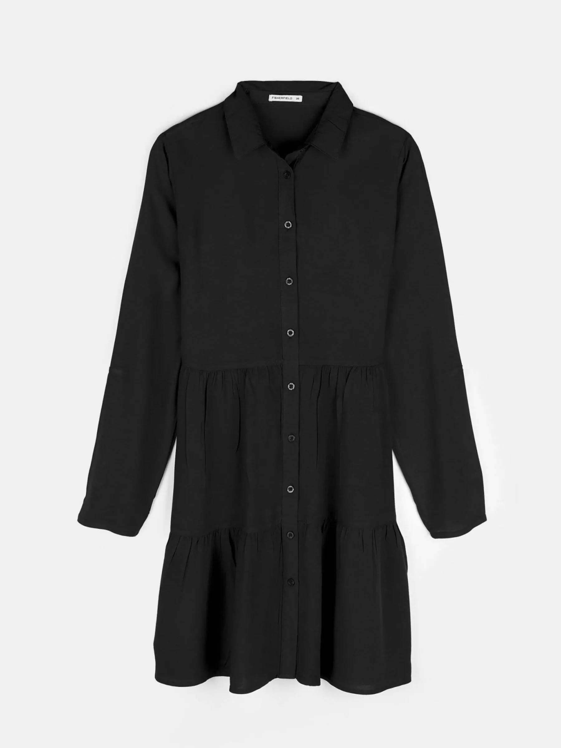 Kolor: czarnyKrój: koszulowe, z falbanąTyp: sukienkaRekaw: długi rękawDługość: miniPattern style: pojedynczy kolo…