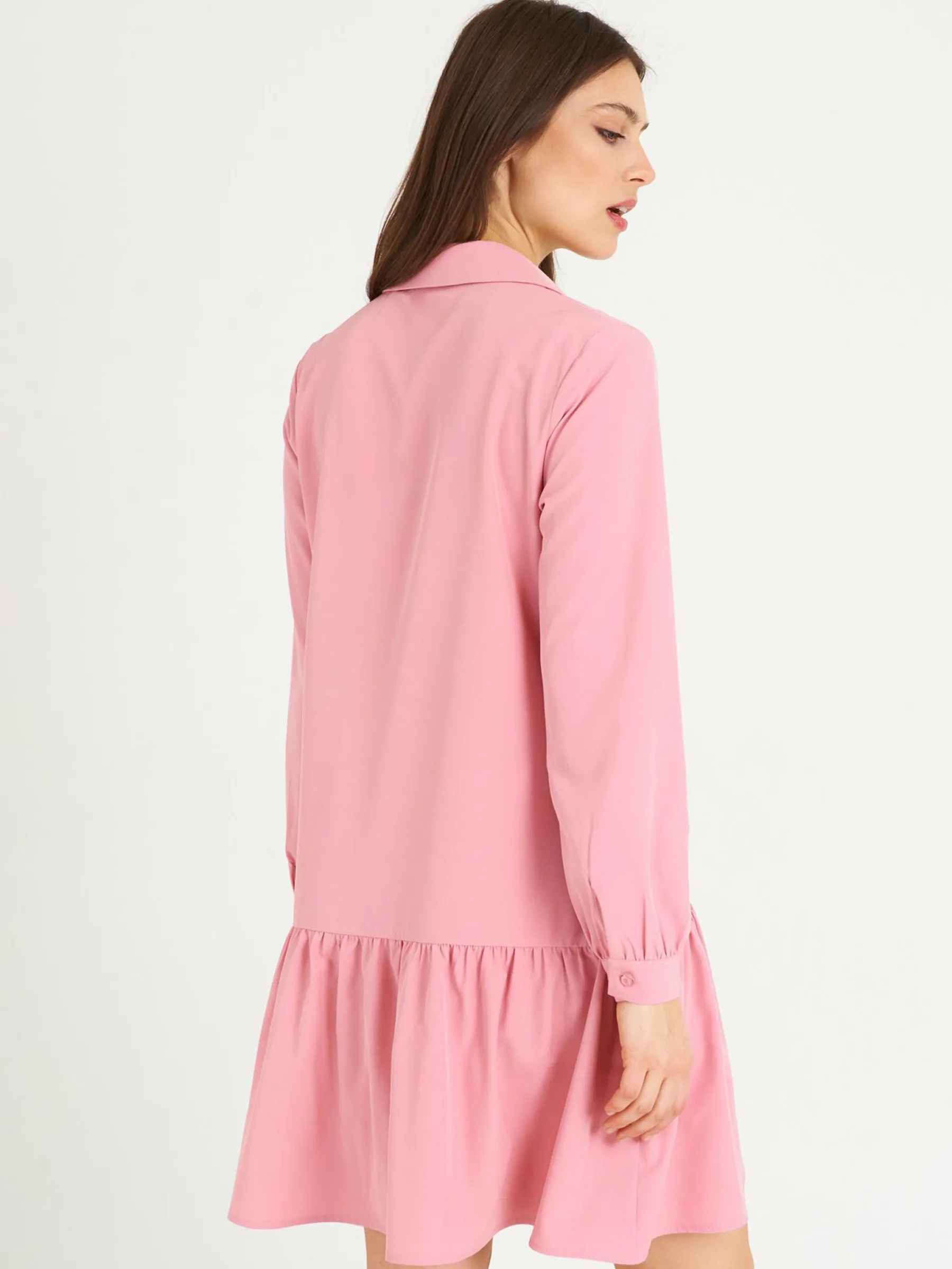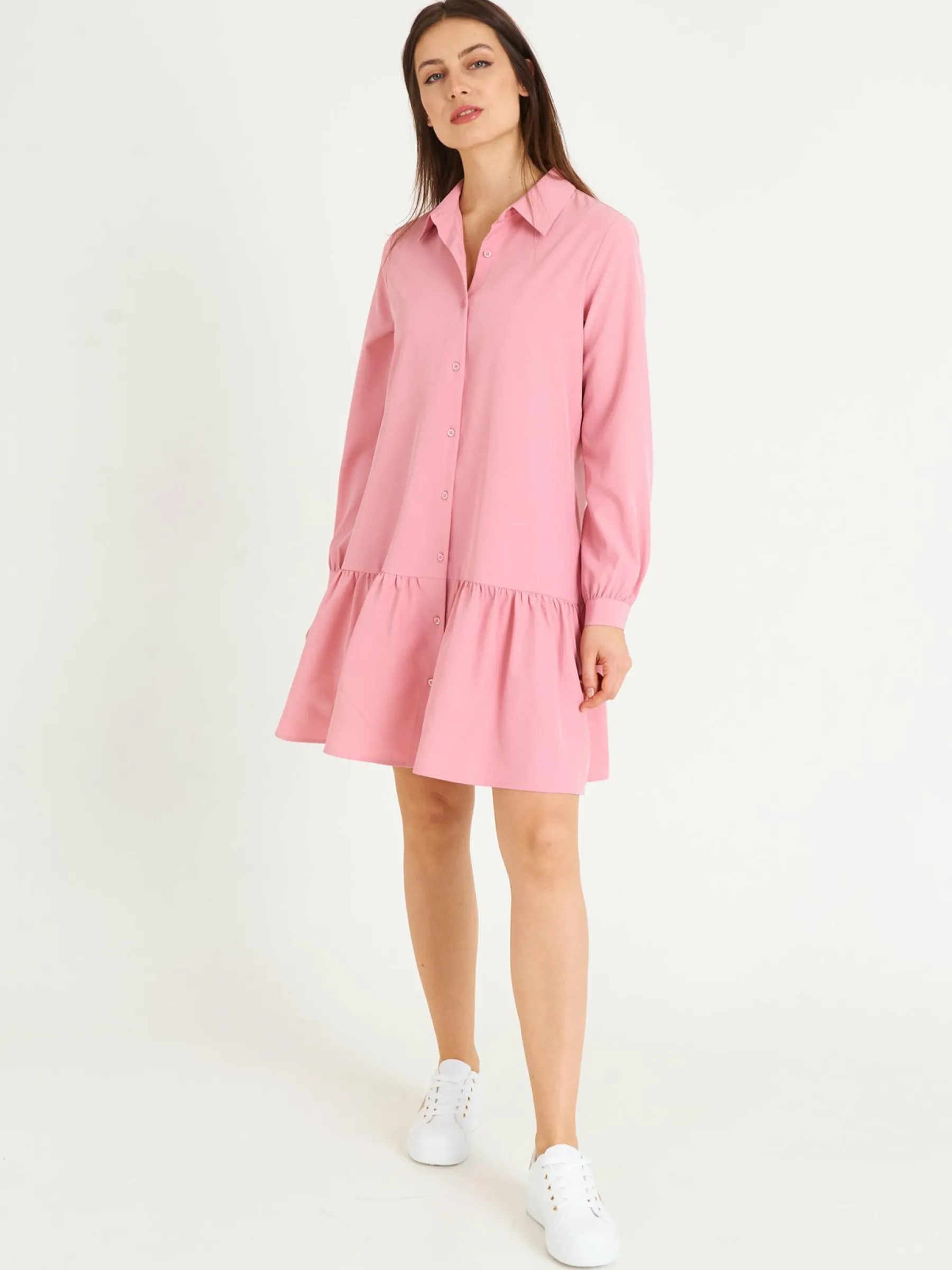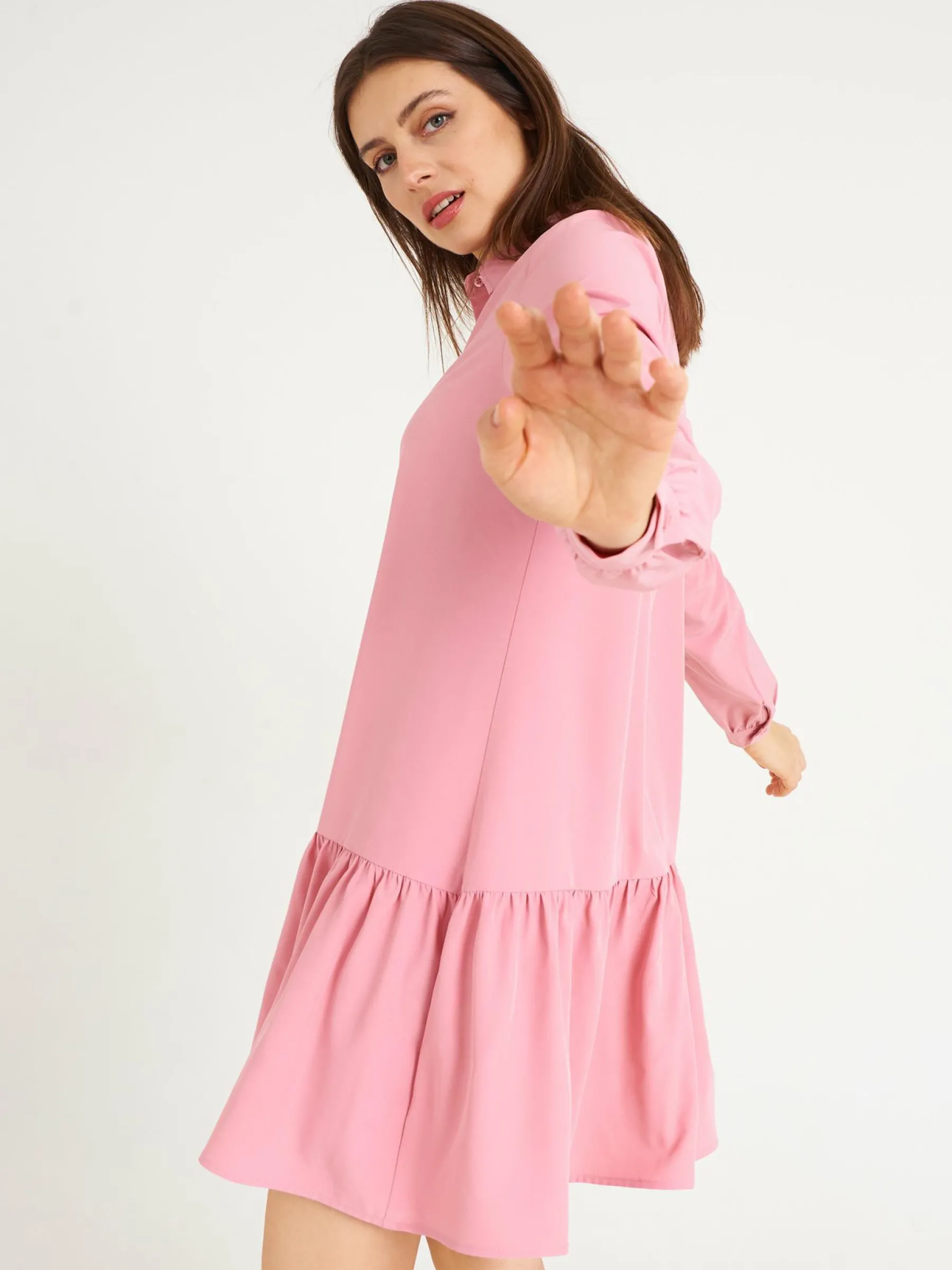 Kolor: różowyKrój: z falbaną, koszuloweTyp: sukienkaRekaw: długi rękawDługość: miniPattern style: pojedynczy ko…