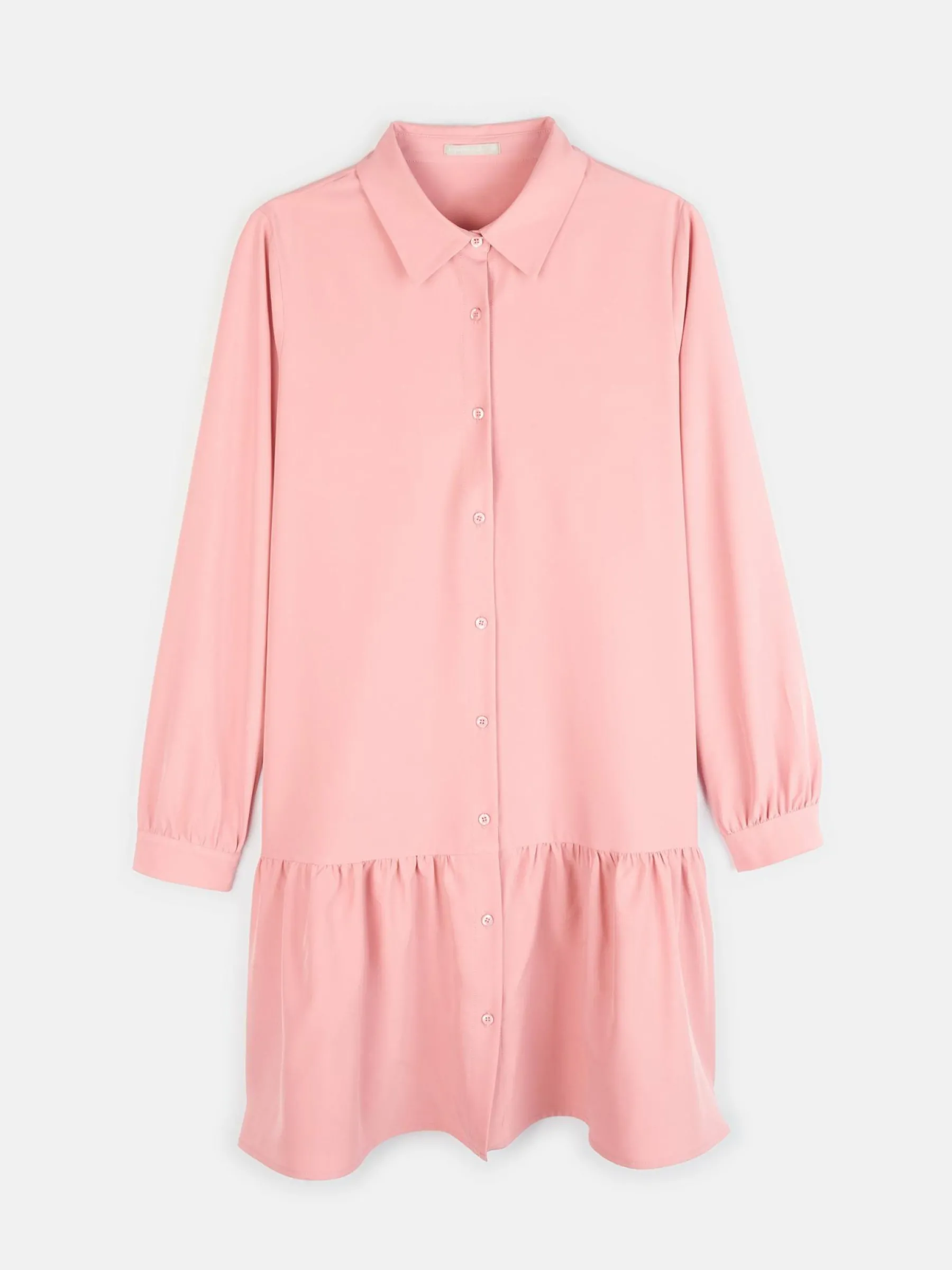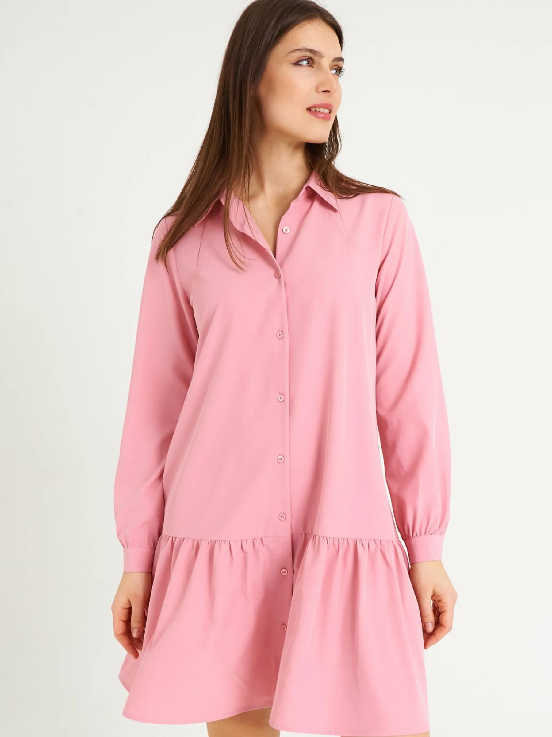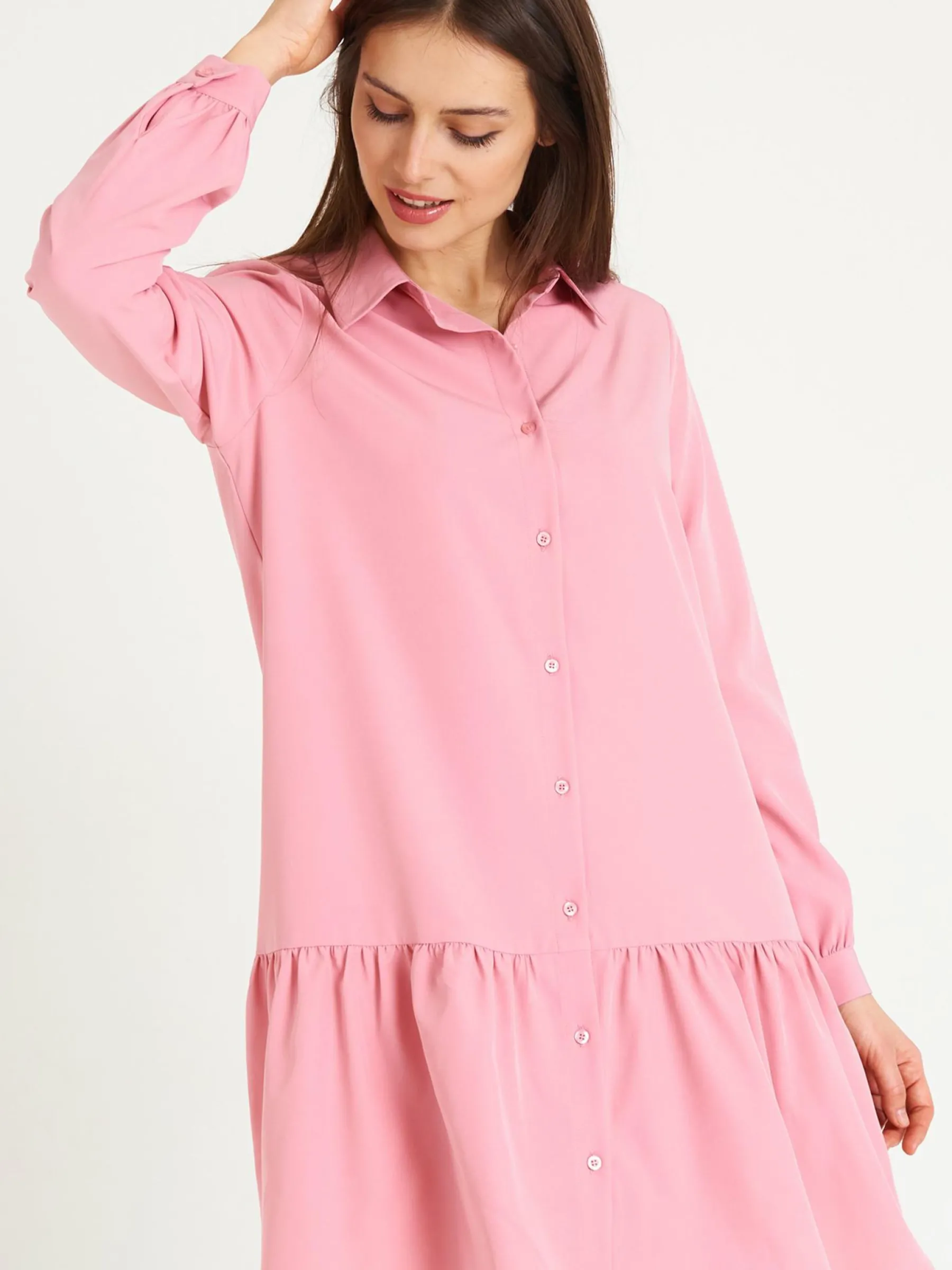 Kolor: różowyKrój: z falbaną, koszuloweTyp: sukienkaRekaw: długi rękawDługość: miniPattern style: pojedynczy ko…