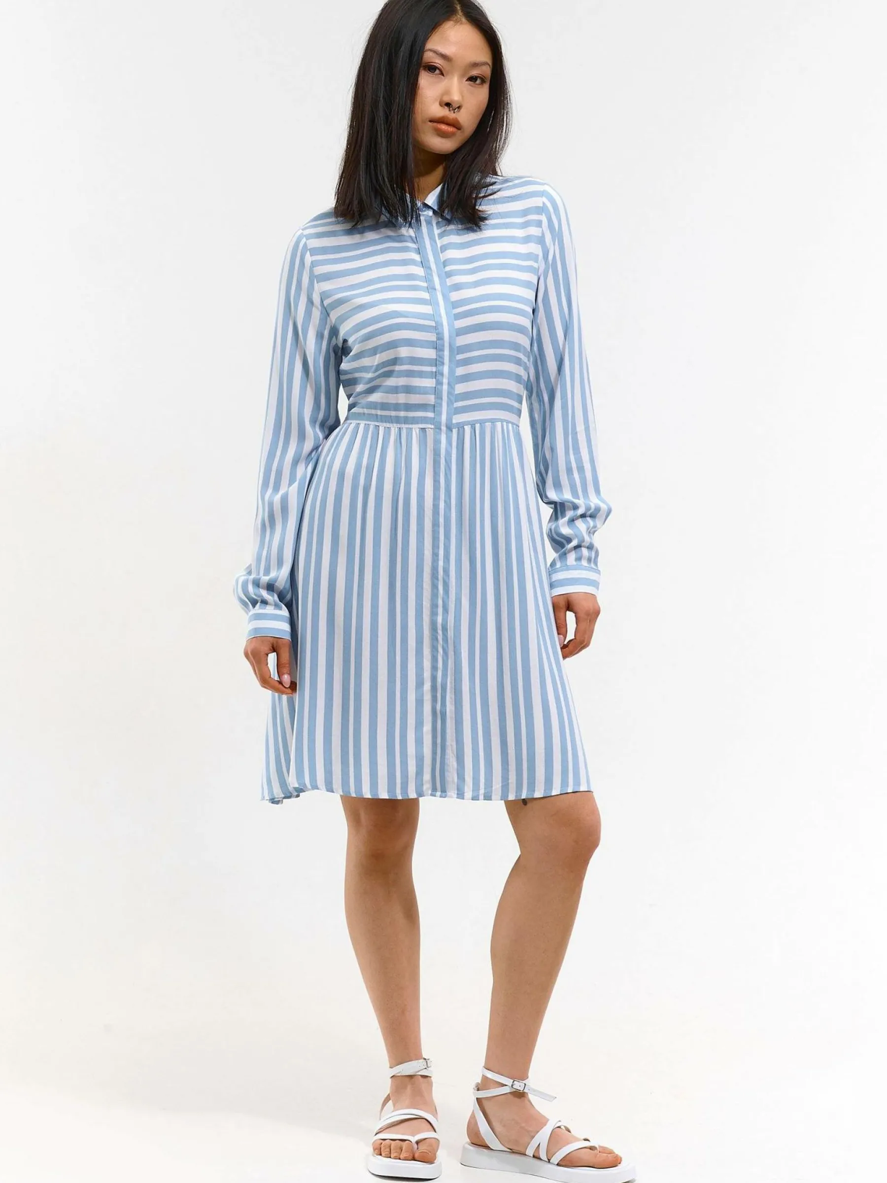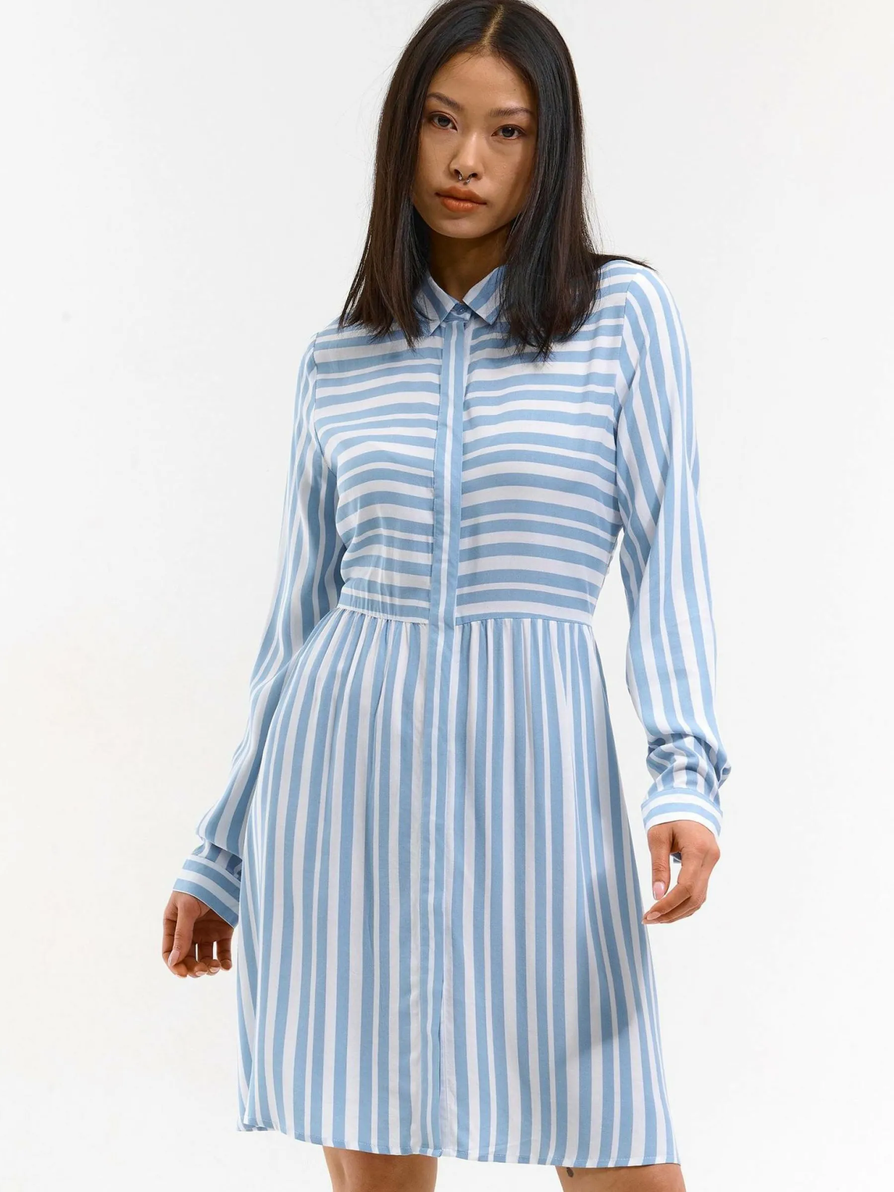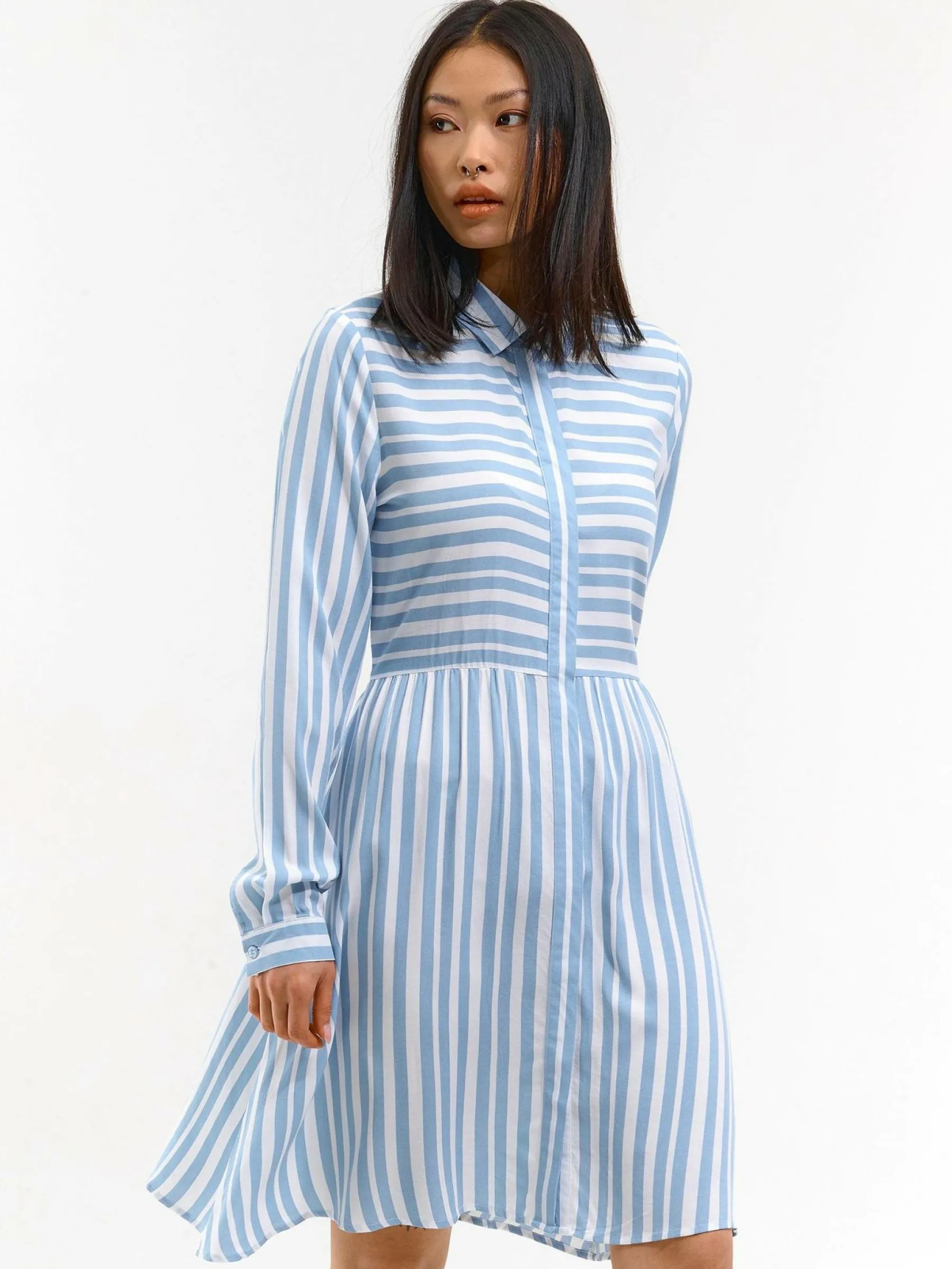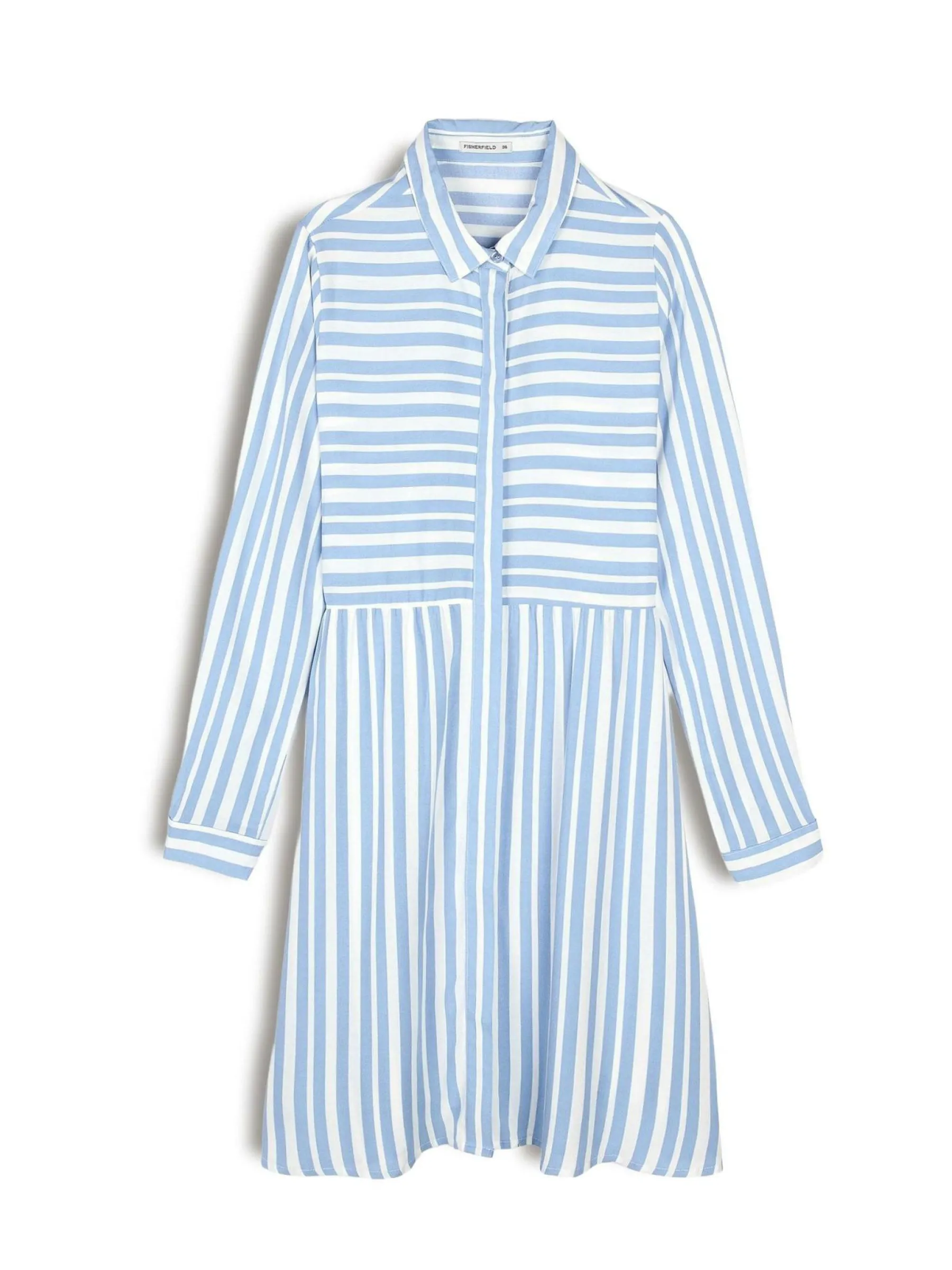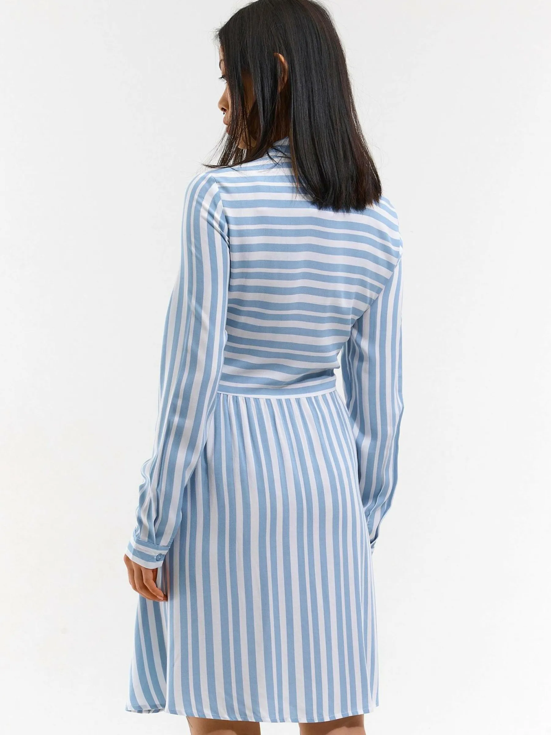 Kolor: niebieskiKrój: koszuloweTyp: sukienkaRekaw: długi rękawDługość: miniPattern style: w prążkiMateriał: wis…