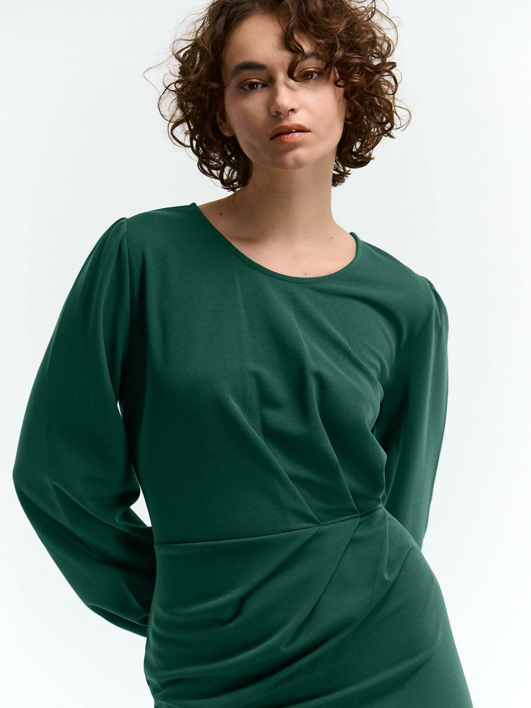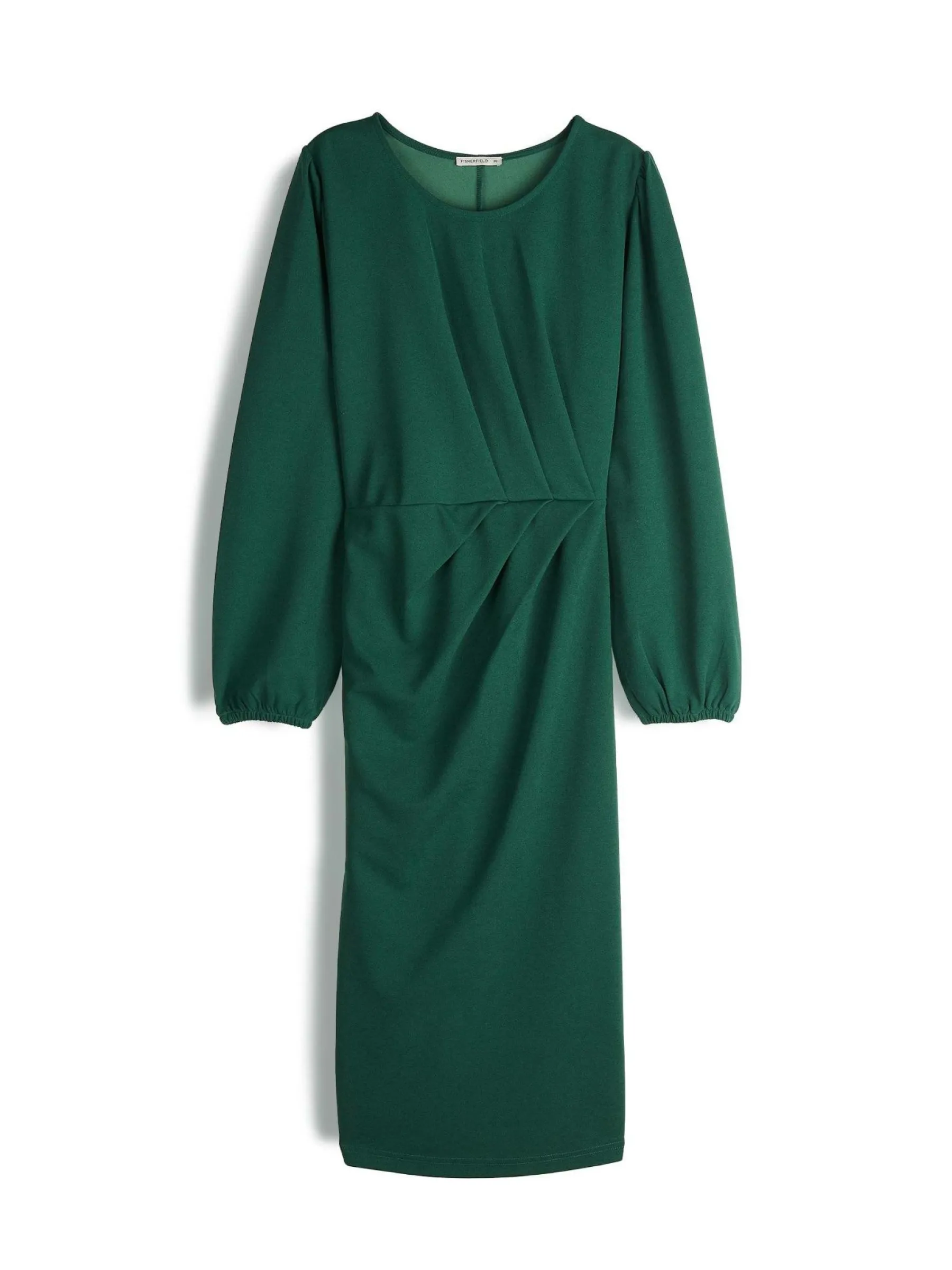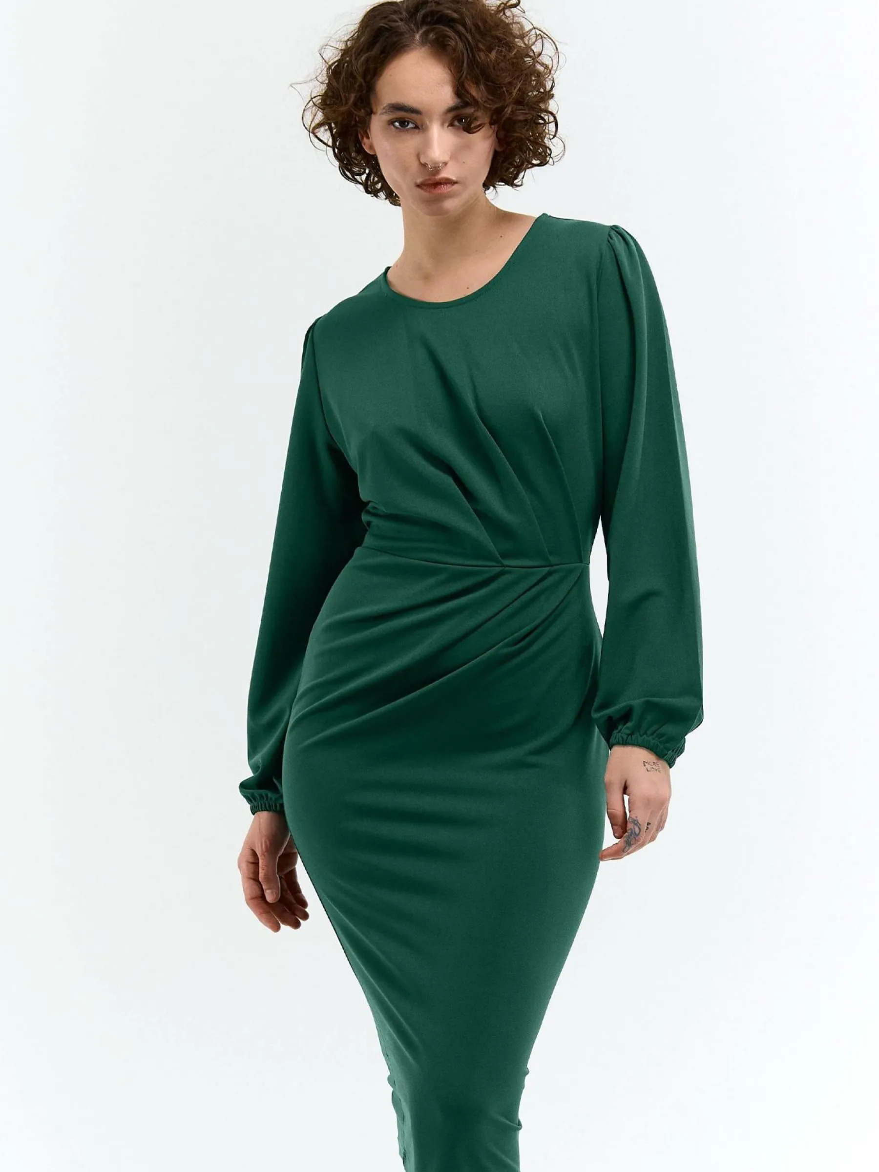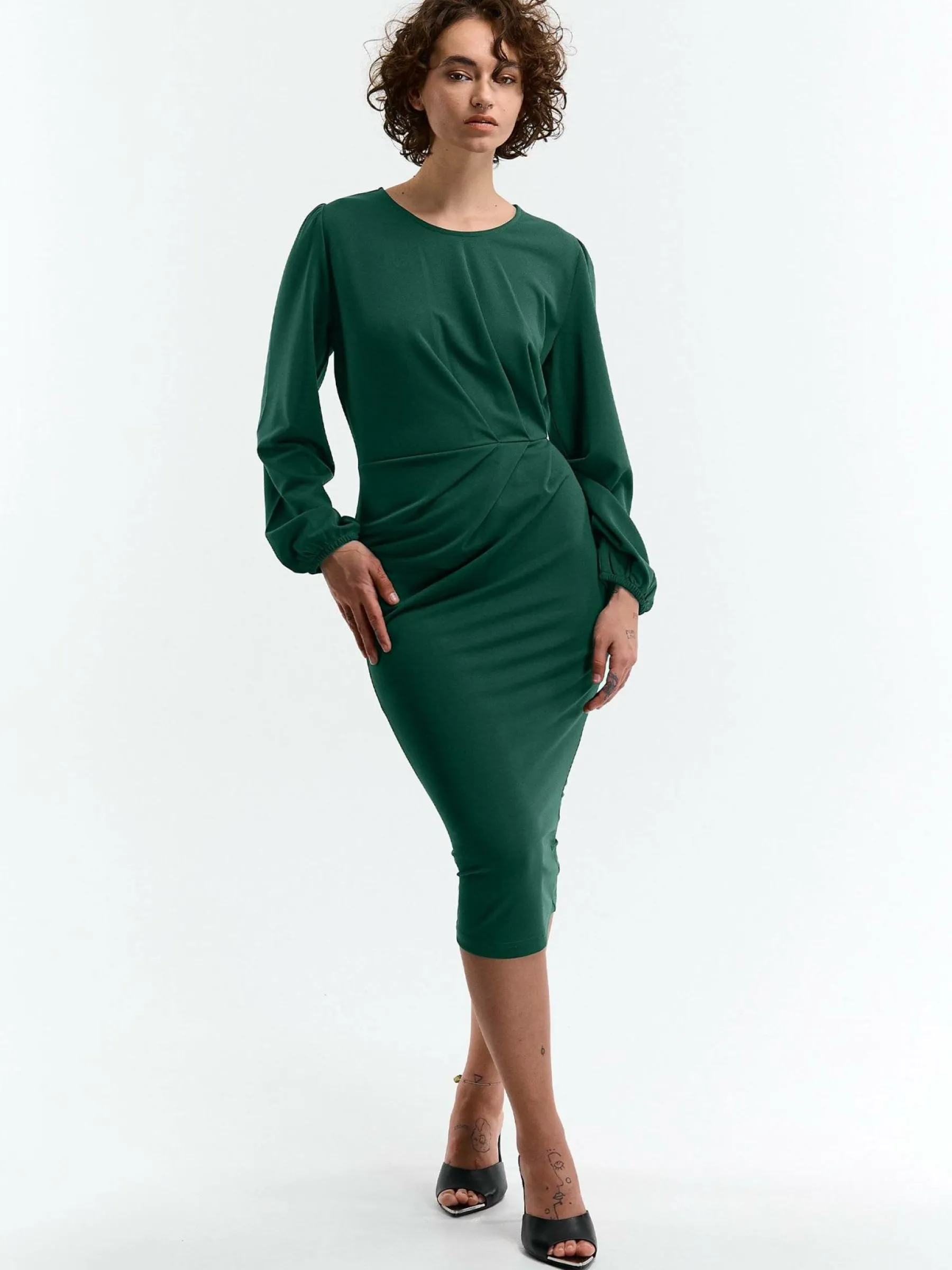 Kolor: zielonyKrój: z marszczeniem, ołówkoweTyp: sukienkaRekaw: długi rękawDługość: midiPattern style: pojedyncz…