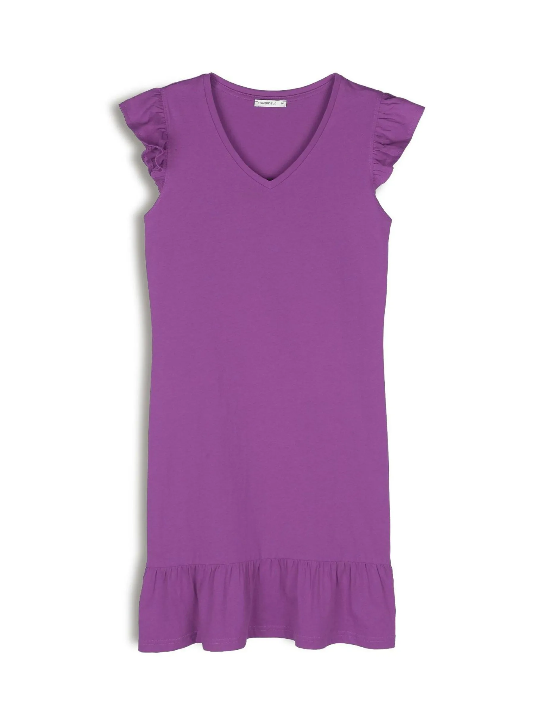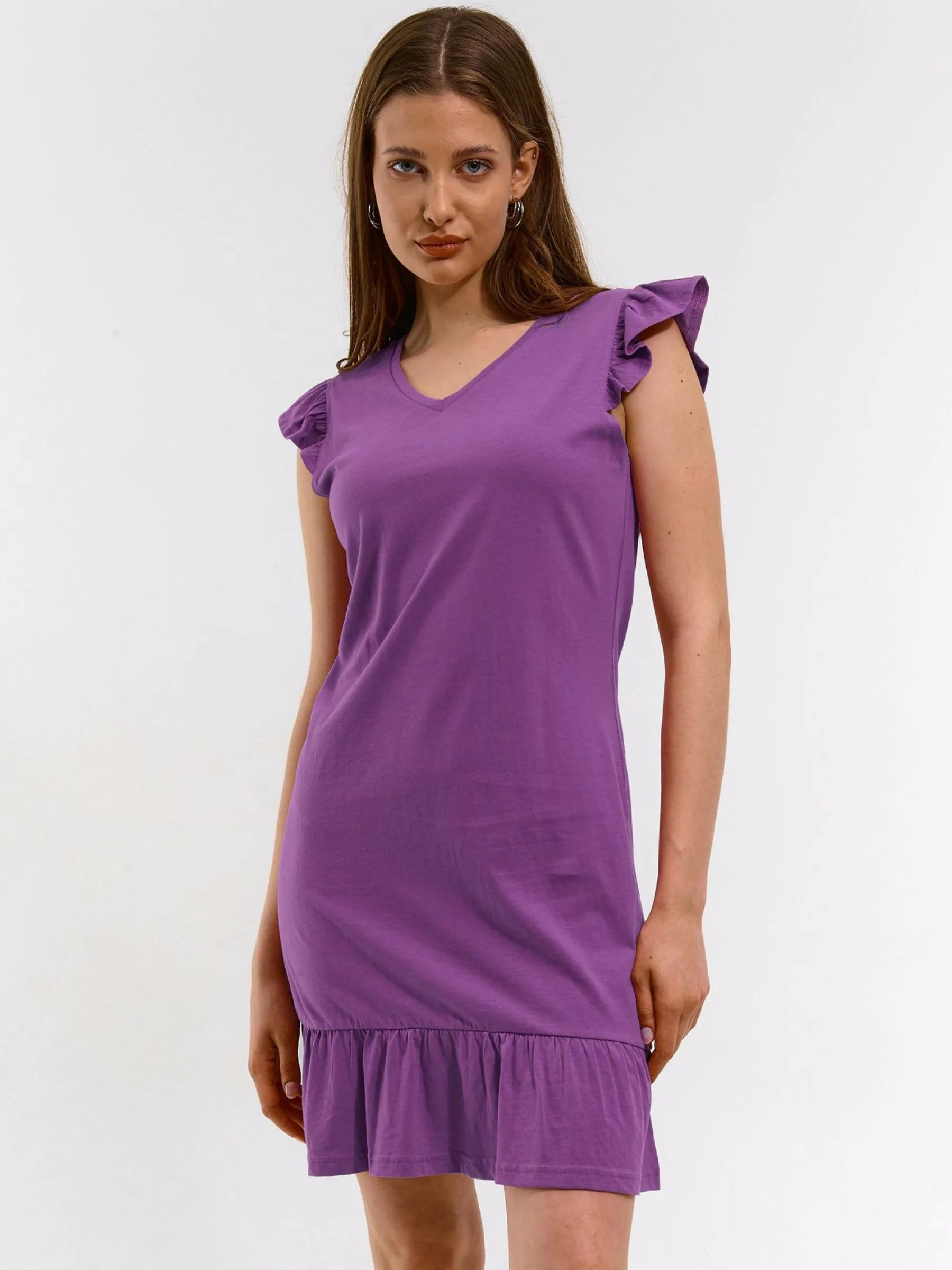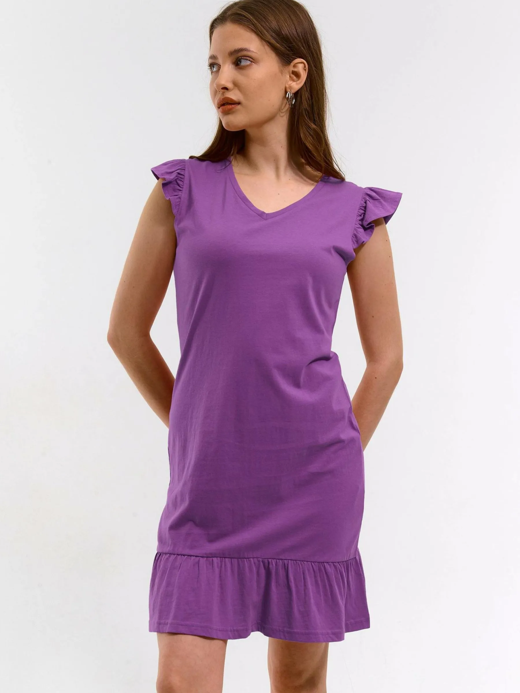 Kolor: purpurowyKrój: z falbanąTyp: sukienkaRekaw: krótki rękawDługość: miniPattern style: pojedynczy kolorDetal:…
