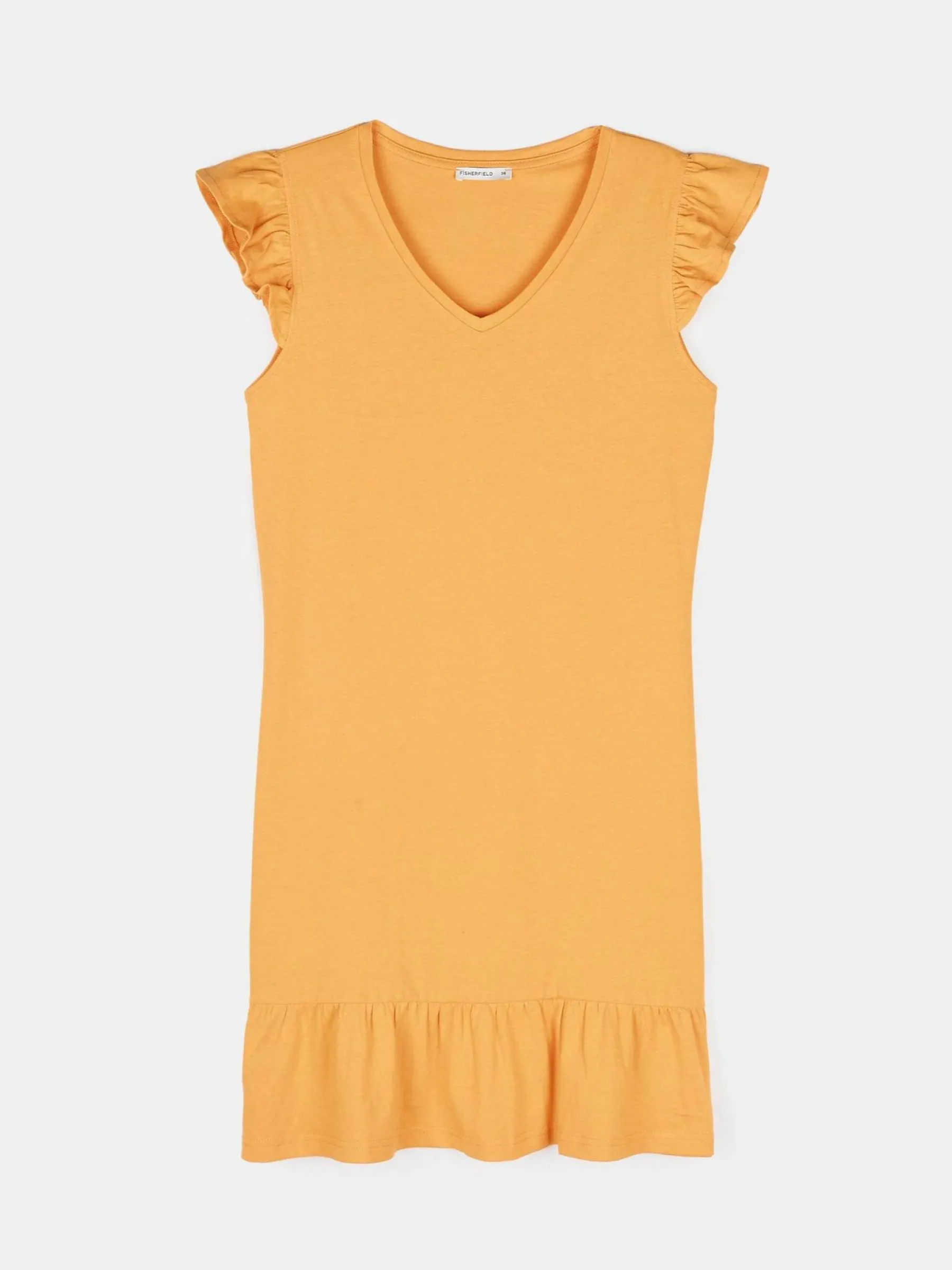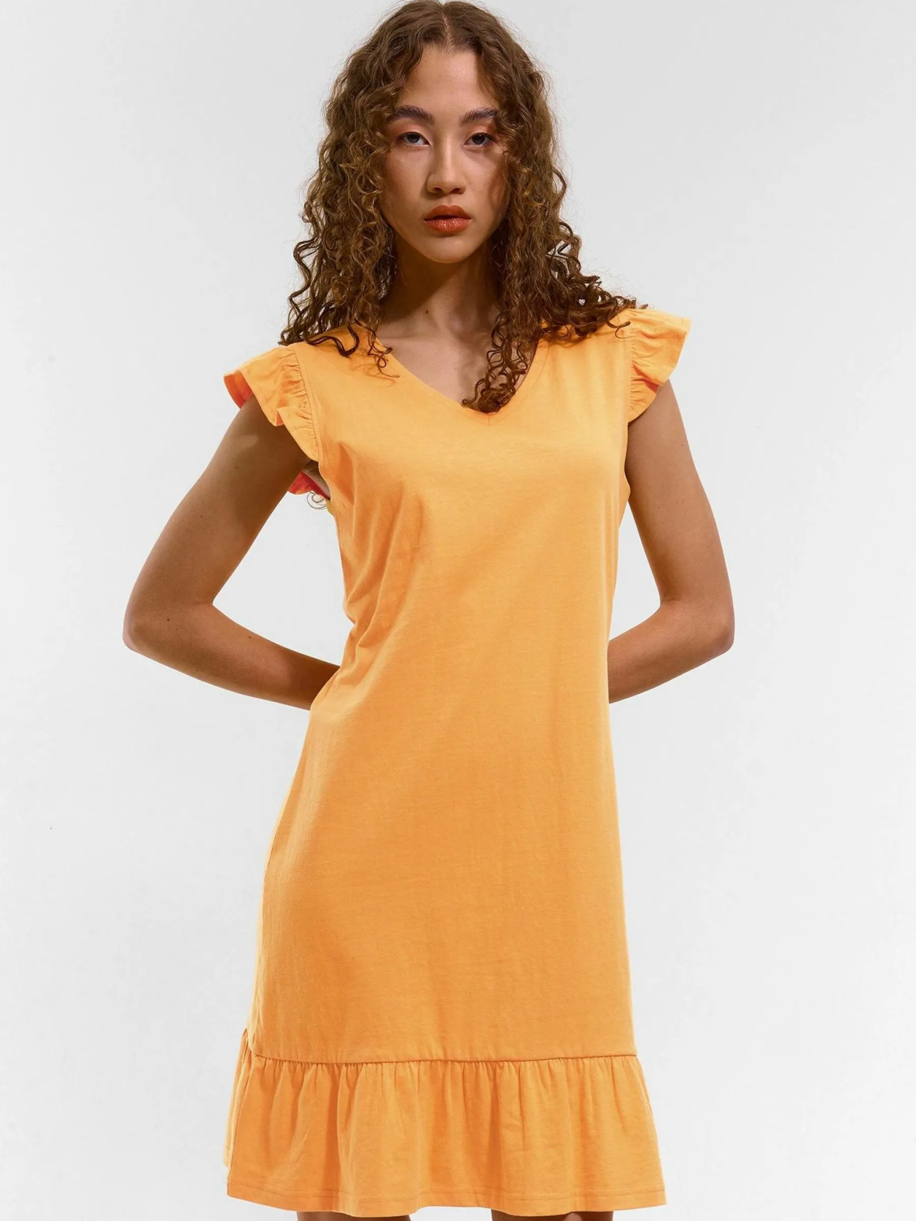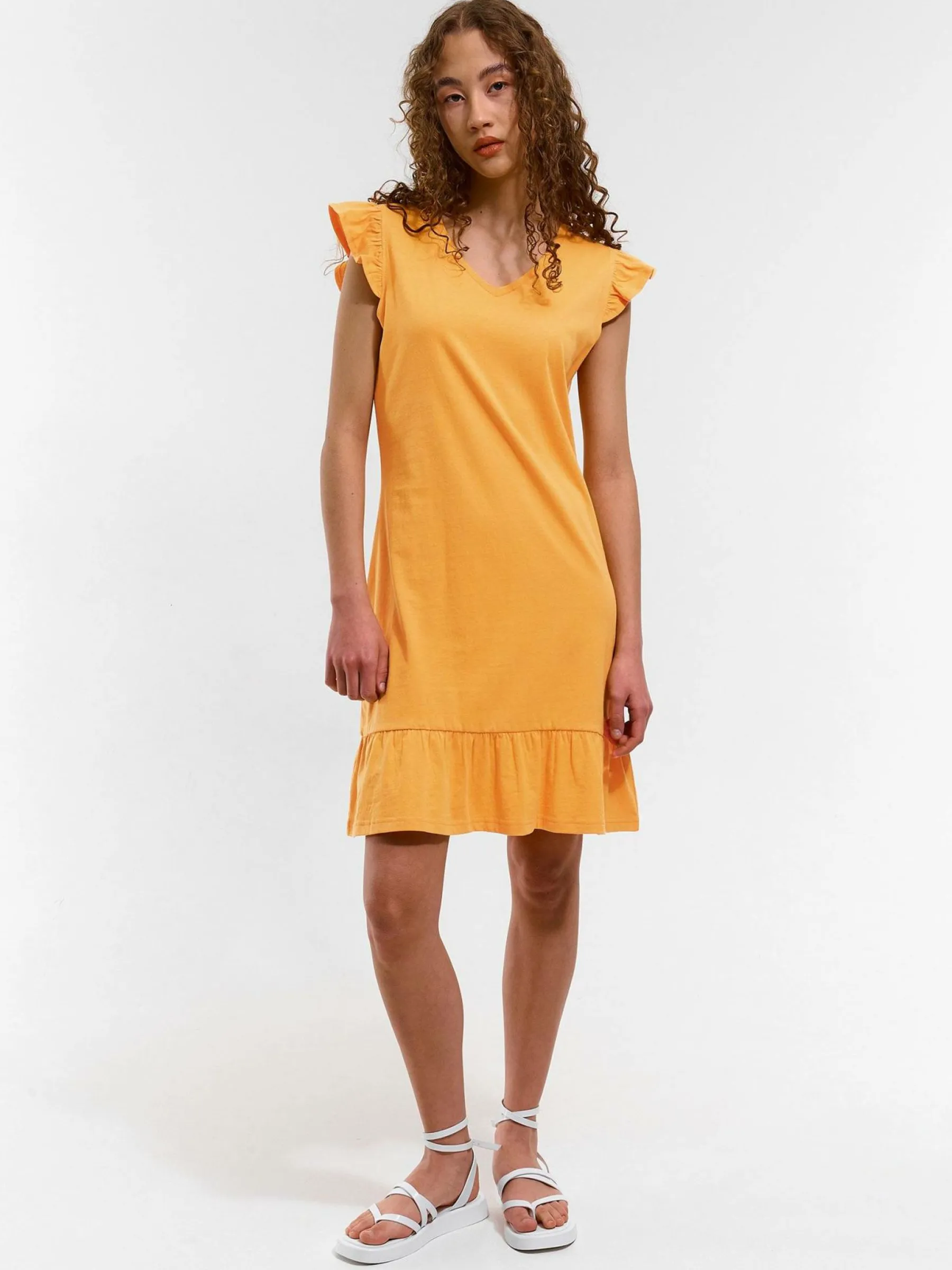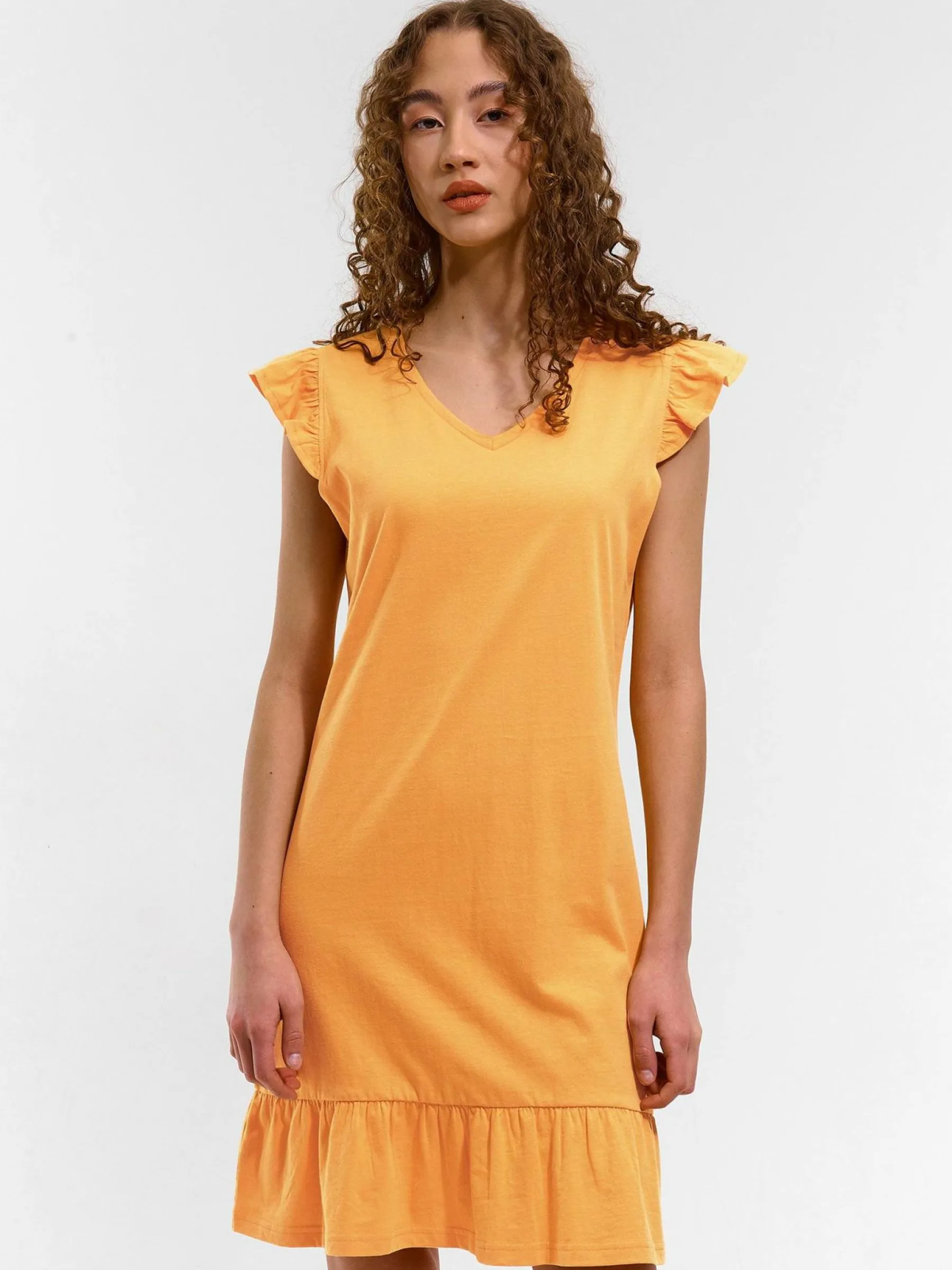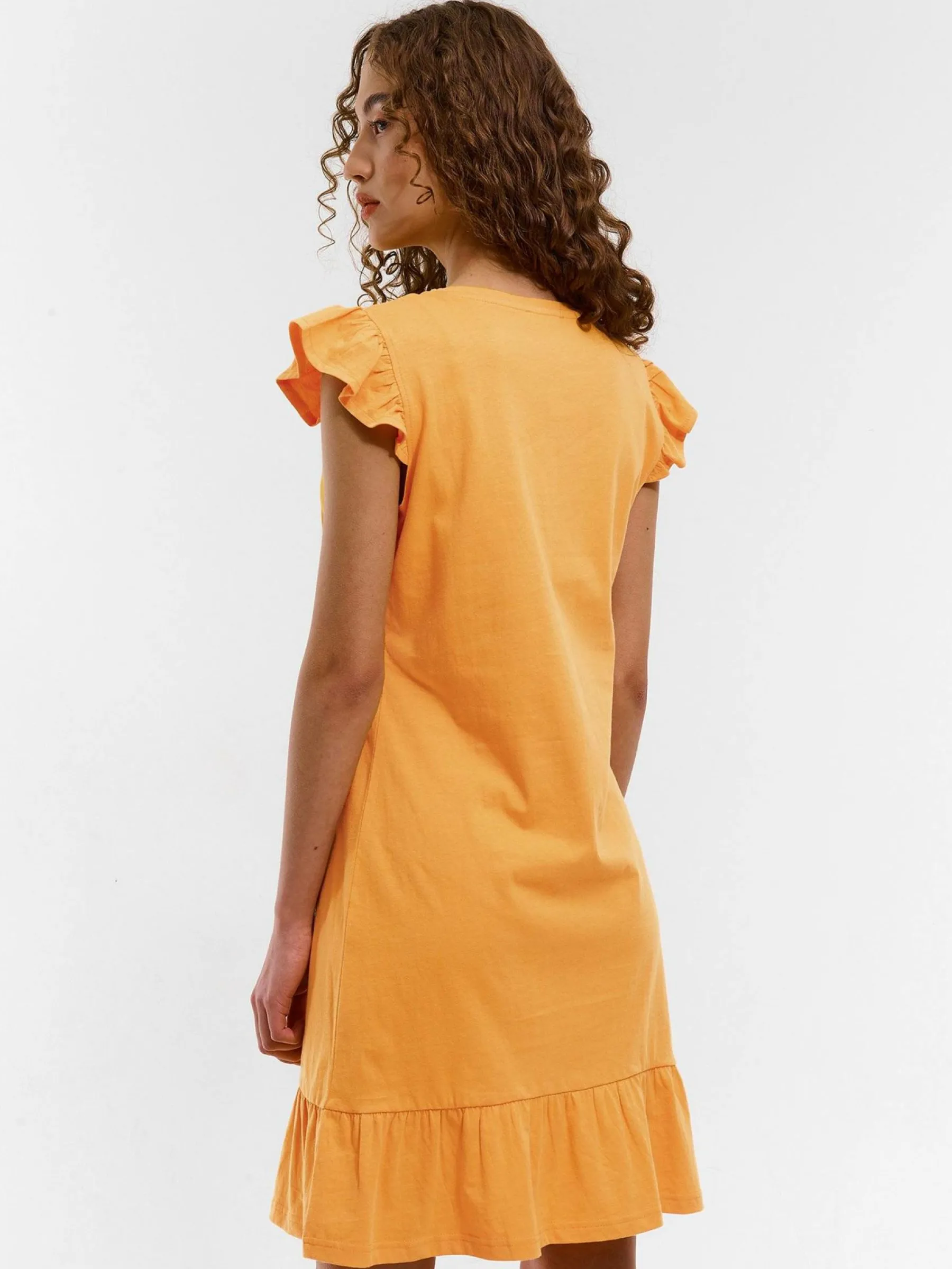 Kolor: pomarańczowyKrój: z falbanąTyp: sukienkaRekaw: krótki rękawDługość: miniPattern style: pojedynczy kolorDe…