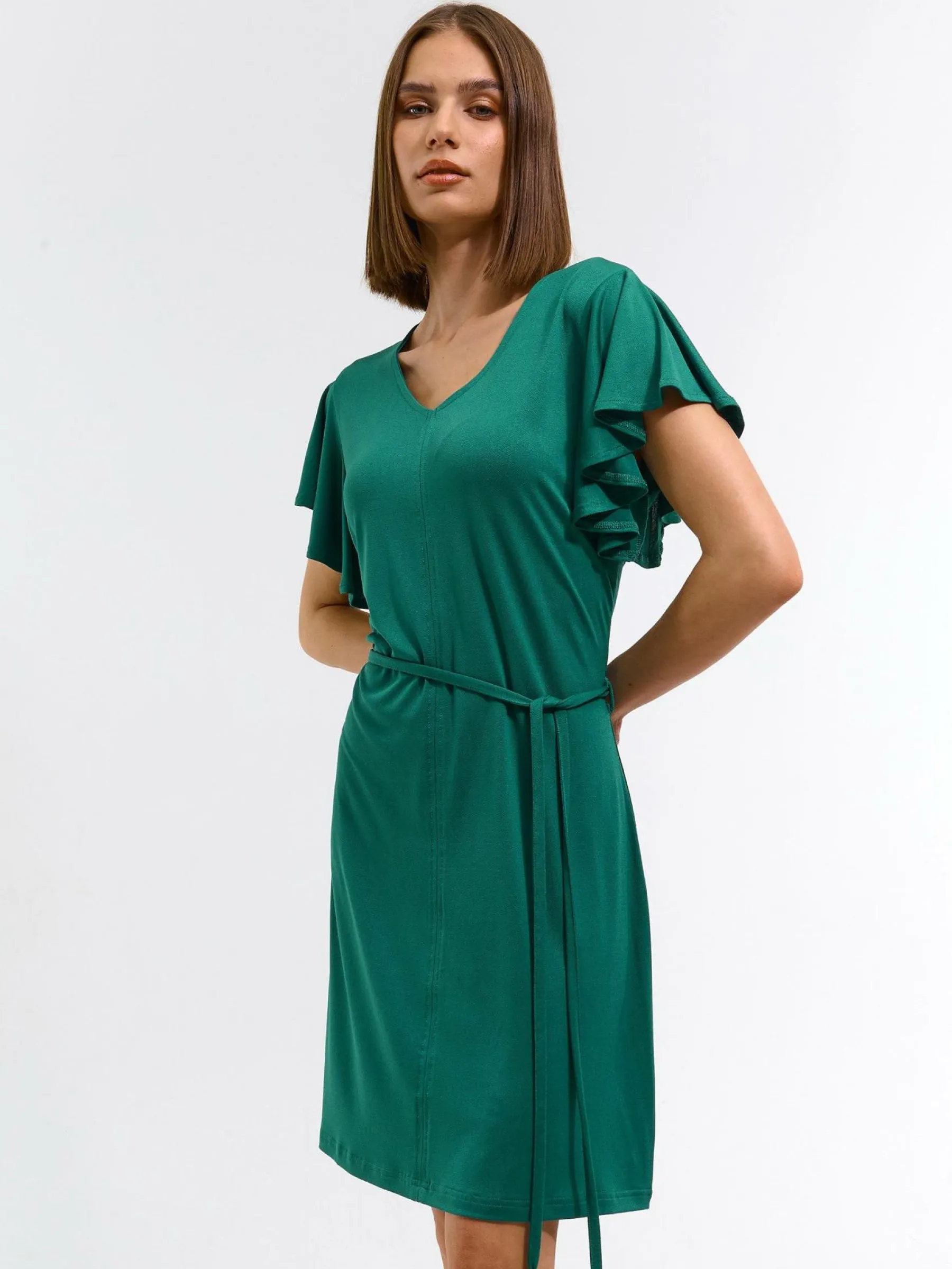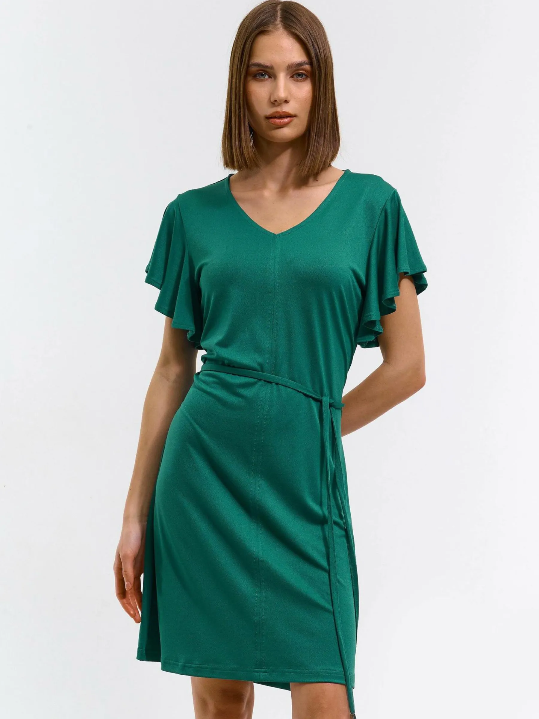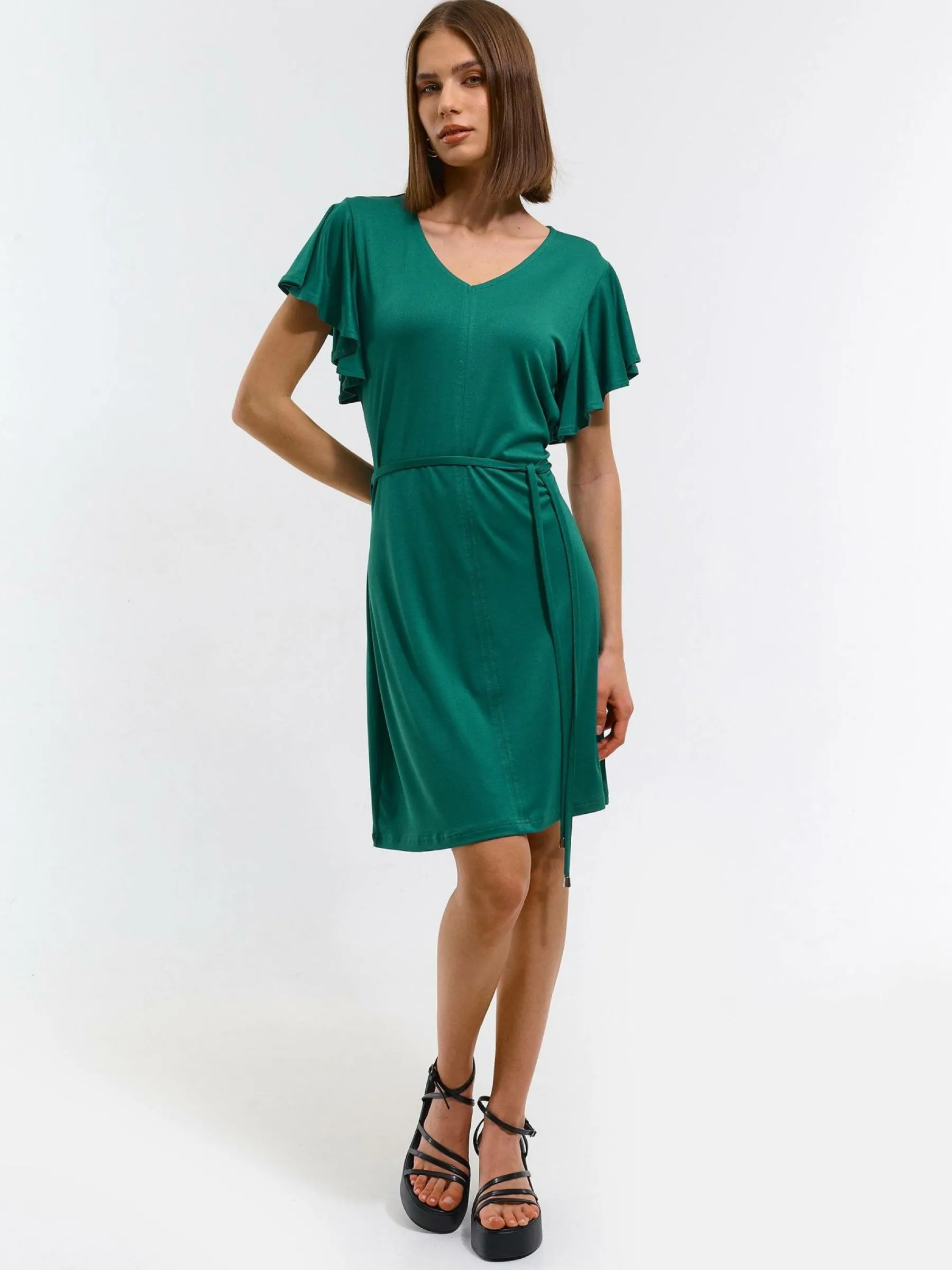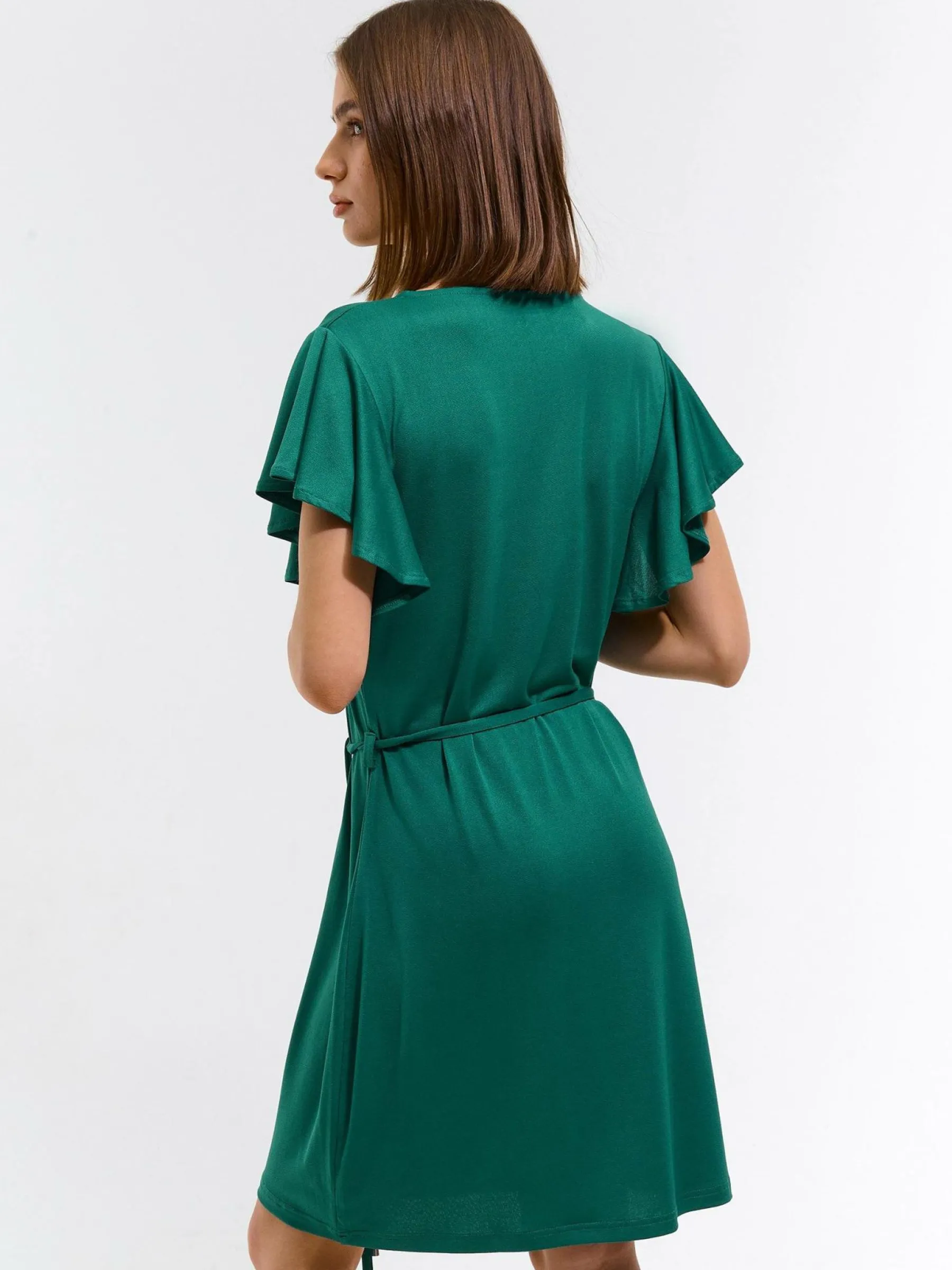 Kolor: zielonyKrój: z falbanąTyp: sukienkaRekaw: krótki rękawDługość: miniPattern style: pojedynczy kolorDetal: n…