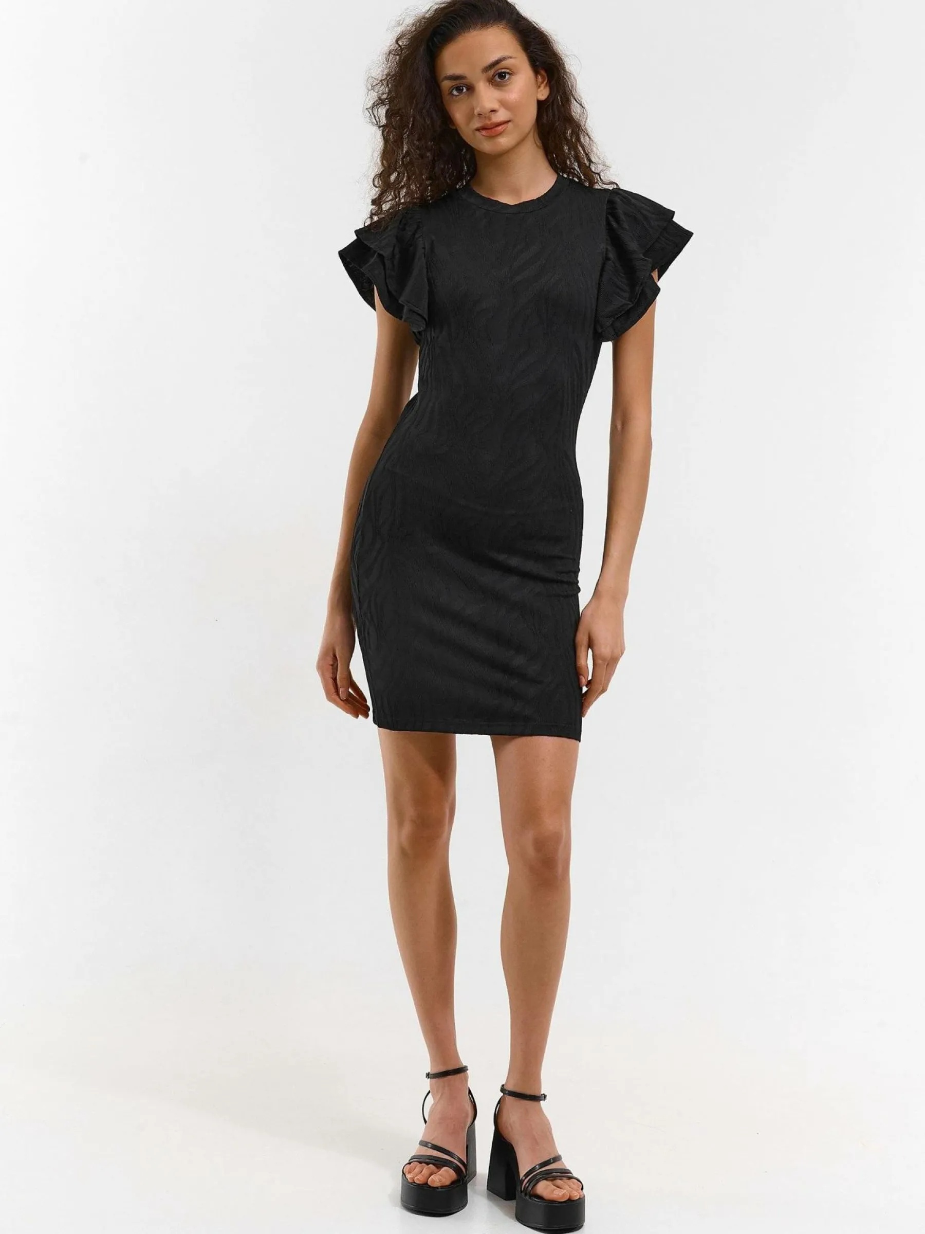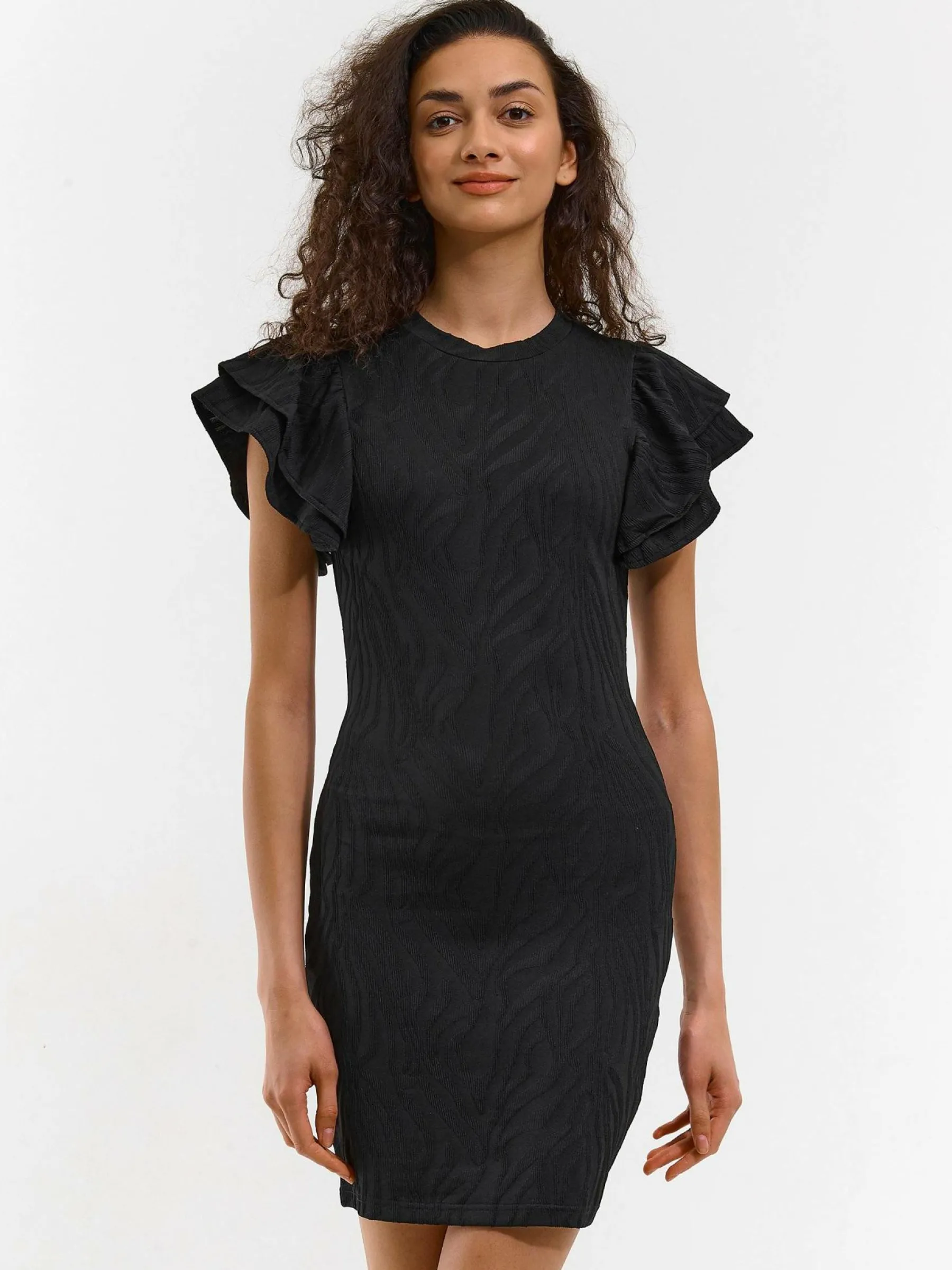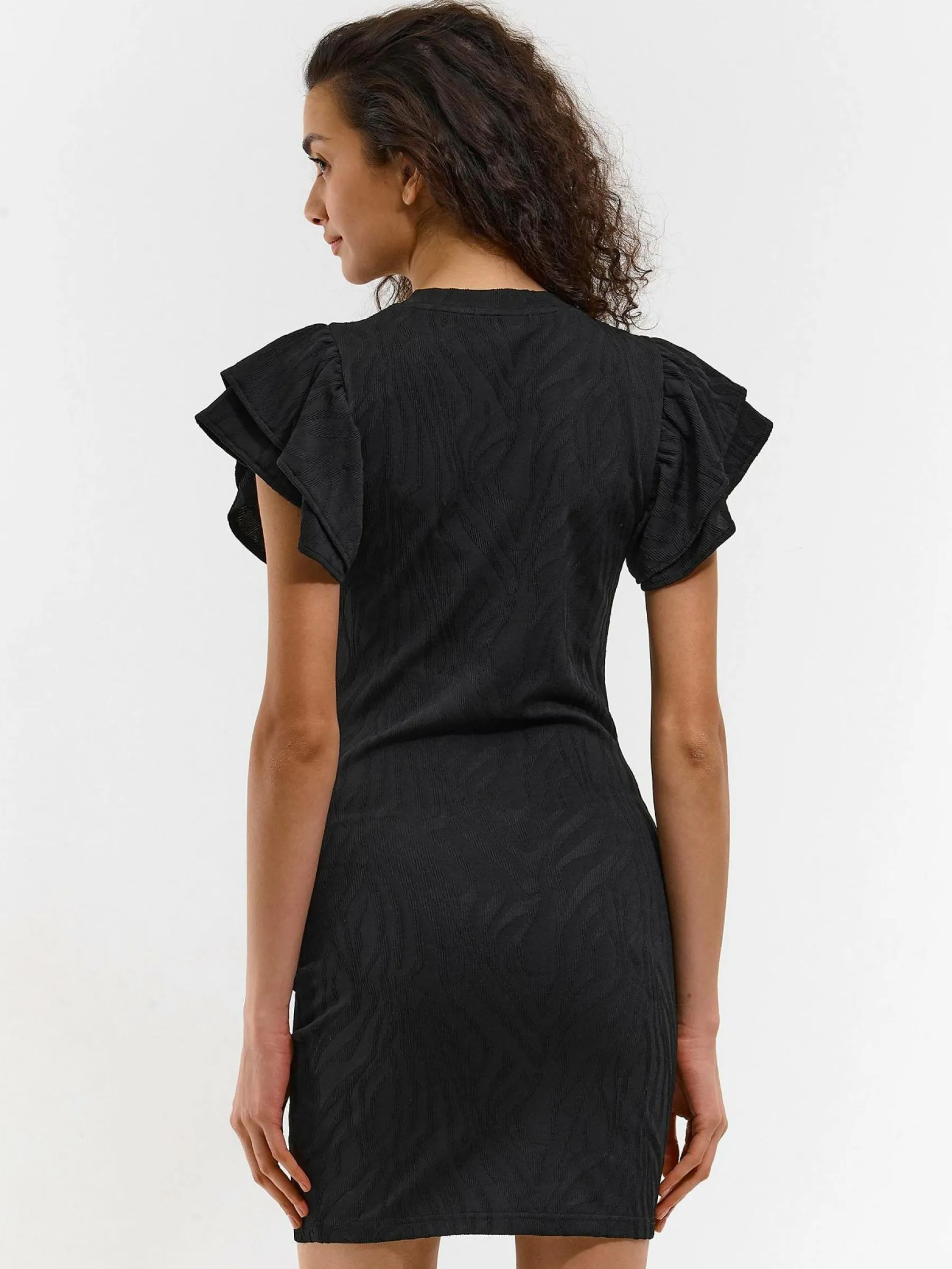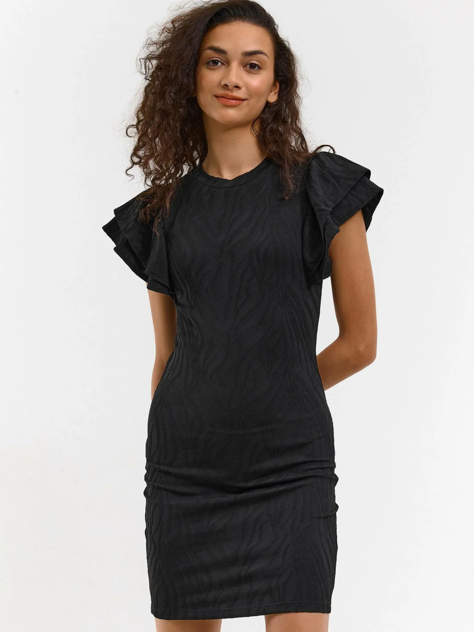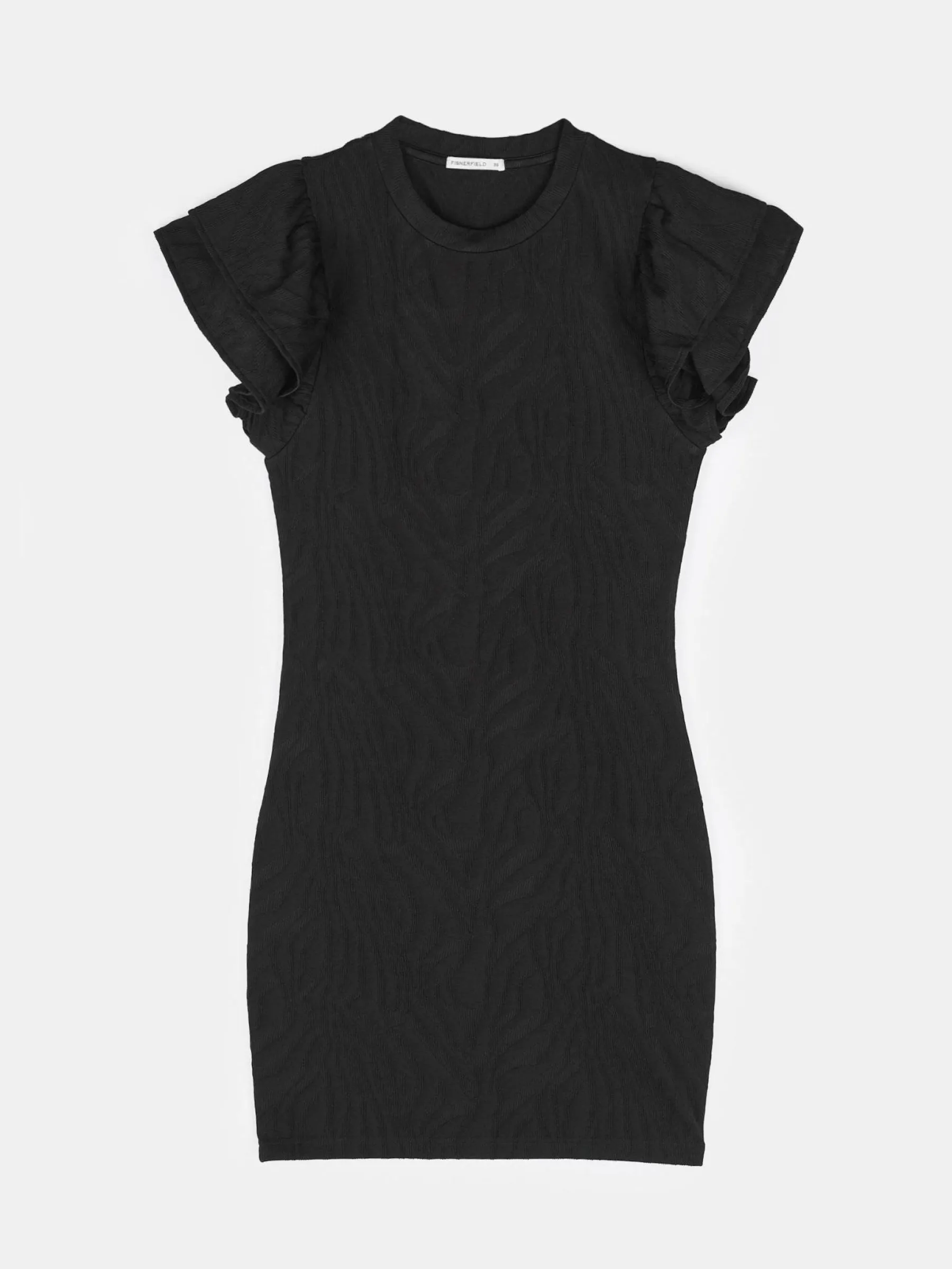 Kolor: czarnyKrój: ołówkoweTyp: sukienkaRekaw: krótki rękawDługość: miniPattern style: wzorzysteDetal: nad głow…