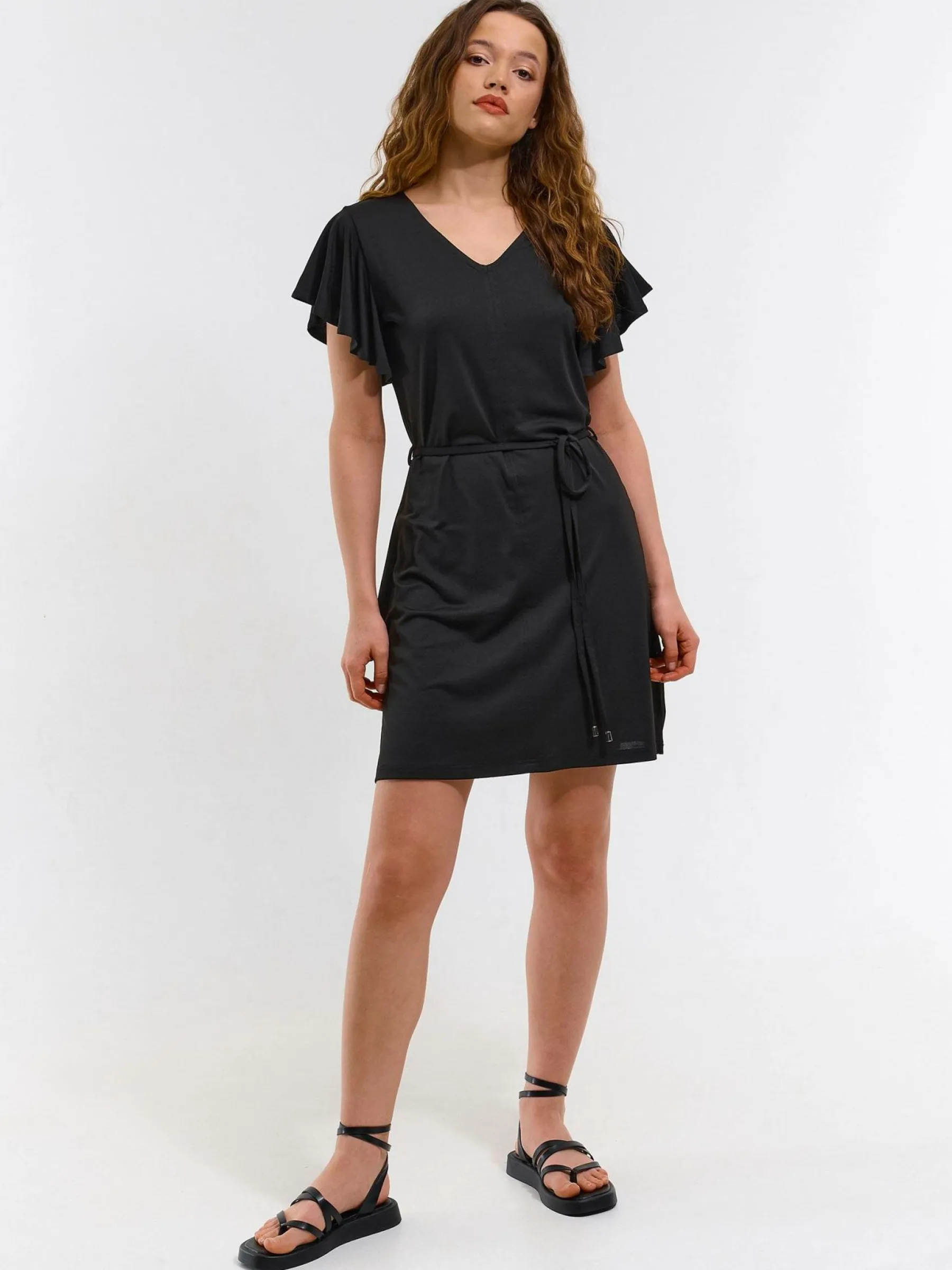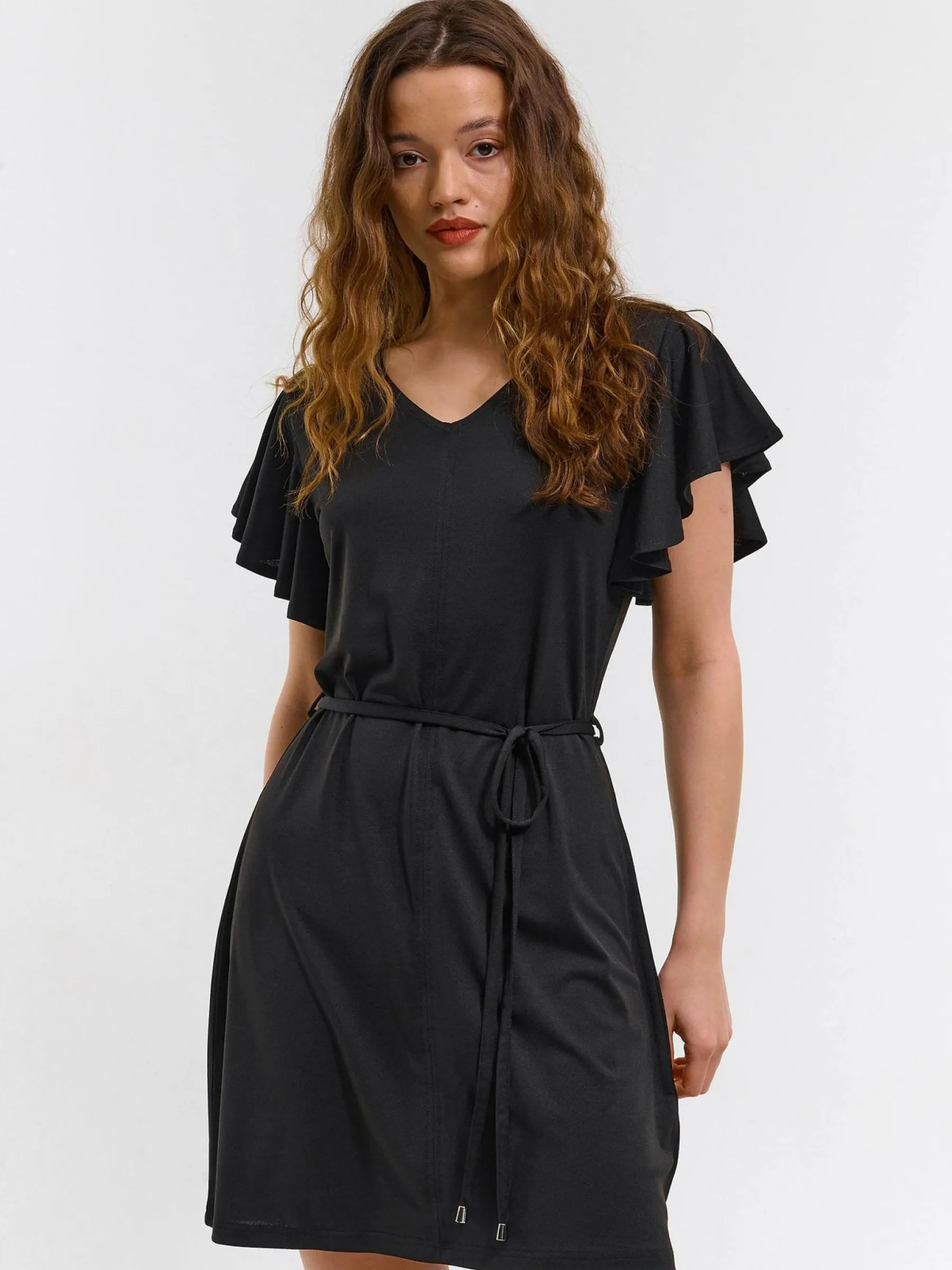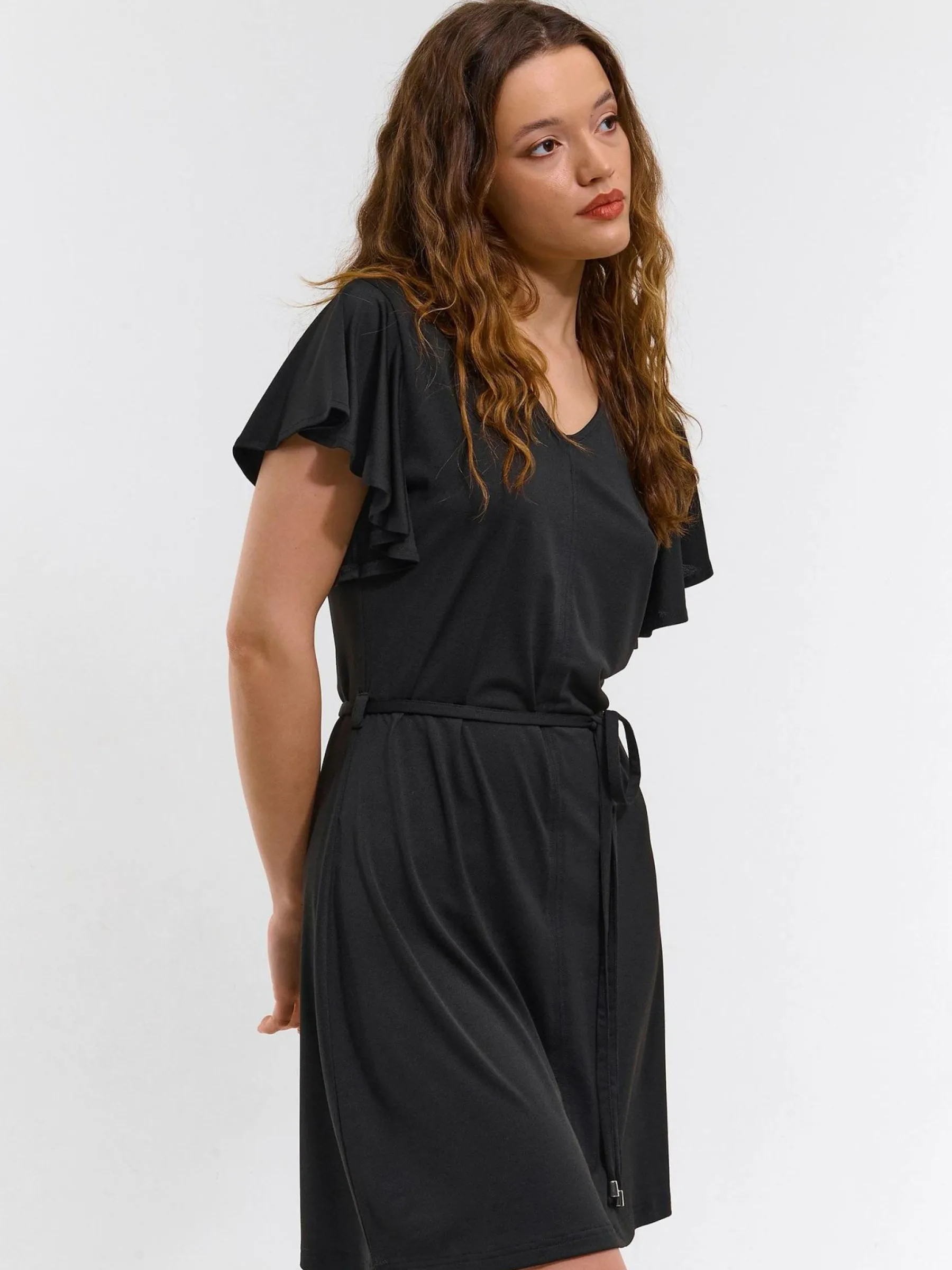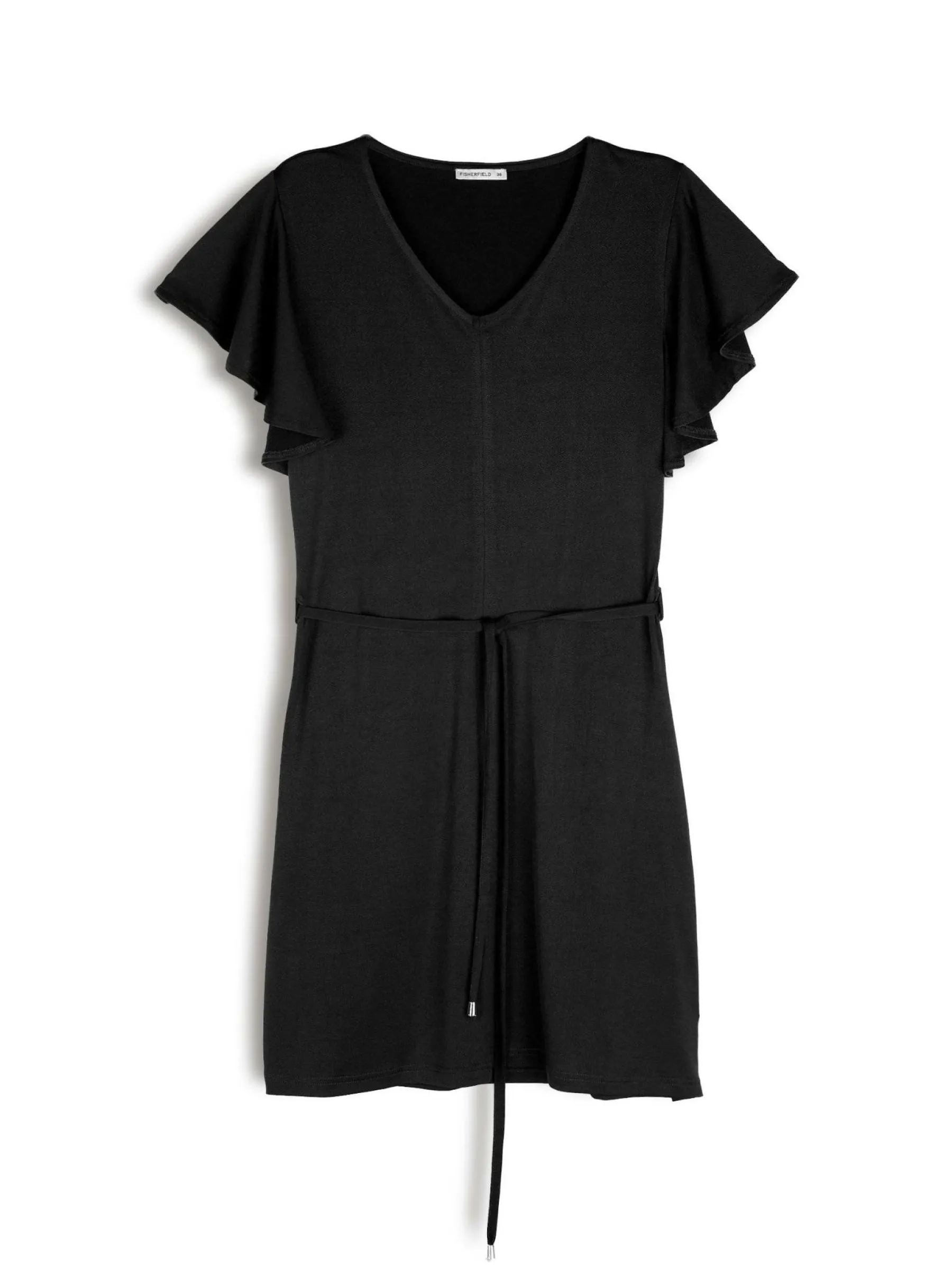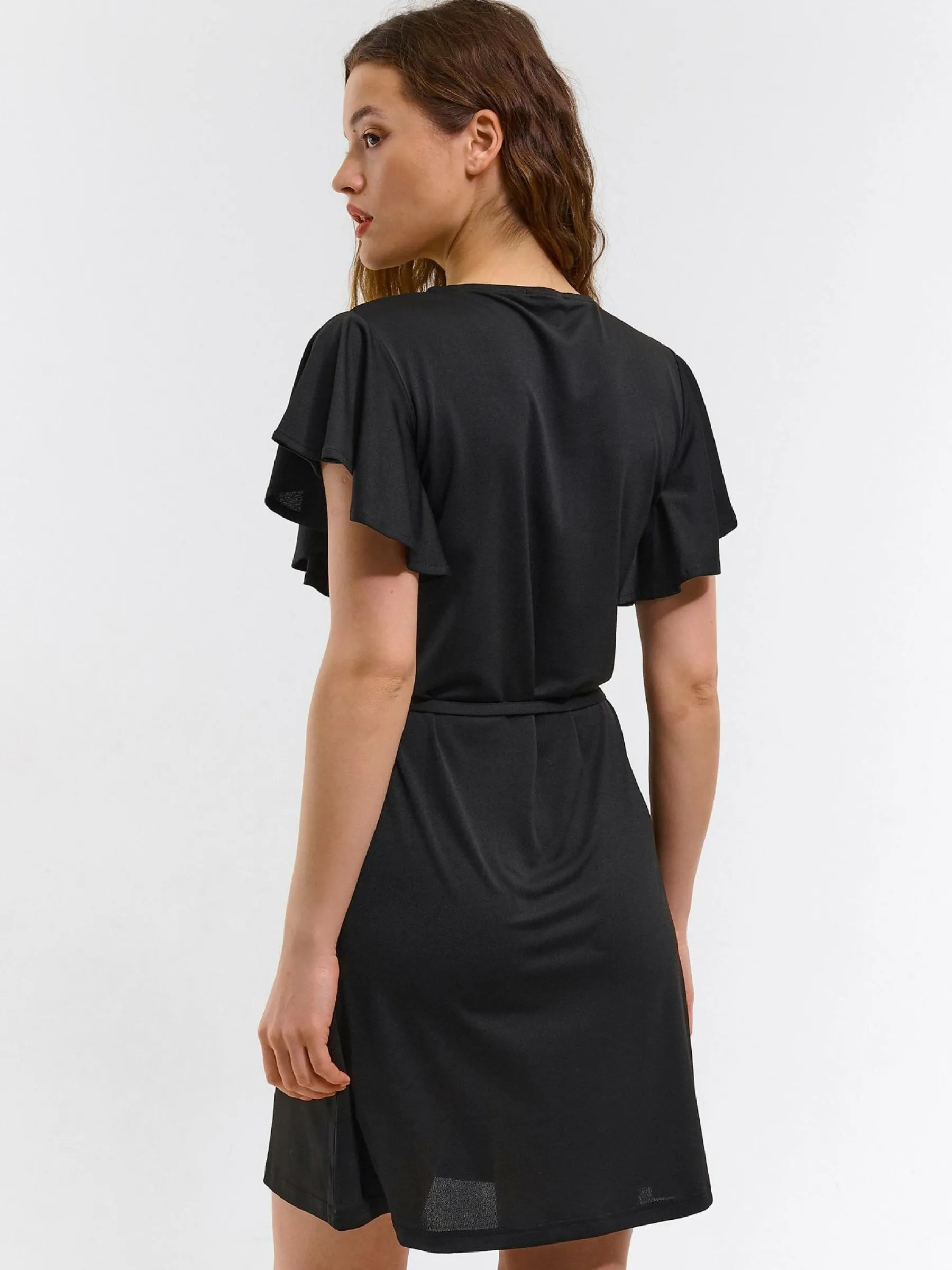 Kolor: czarnyKrój: z falbaną, asyTyp: sukienkaRekaw: krótki rękawDługość: miniPattern style: pojedynczy kolorDeta…
