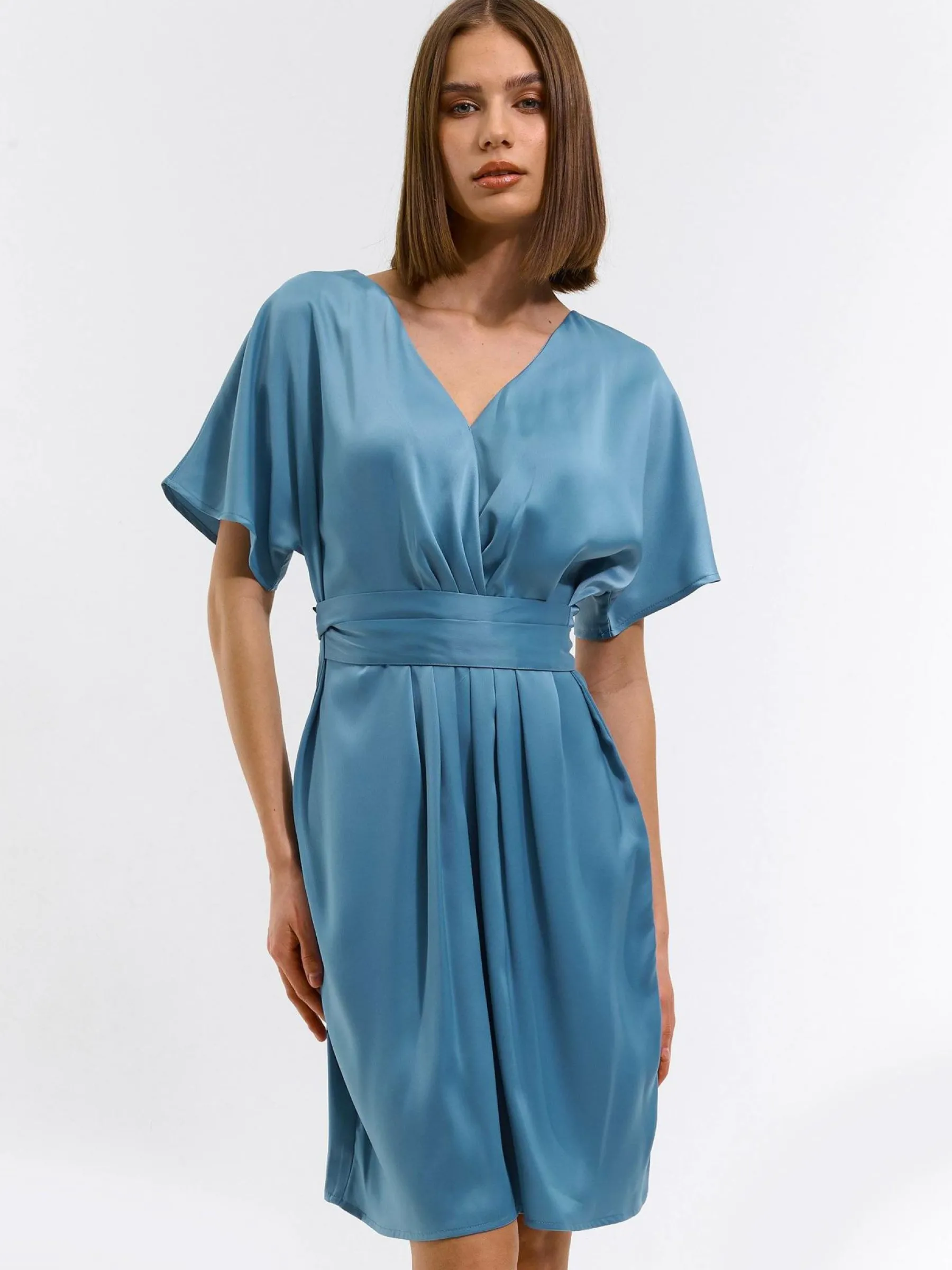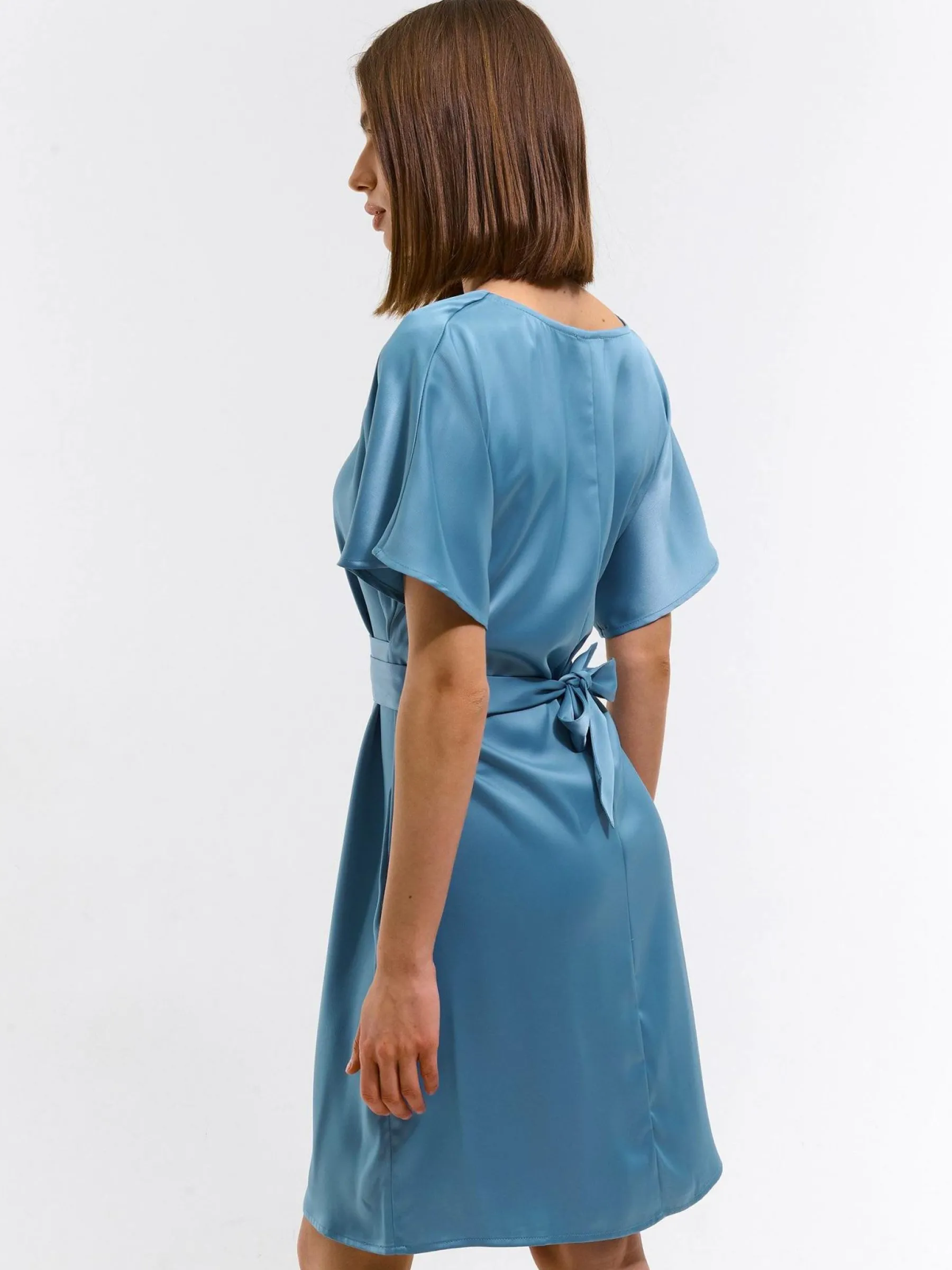 Kolor: niebieskiKrój: z marszczeniemTyp: sukienkaRekaw: krótki rękawDługość: miniPattern style: pojedynczy kolorDe…