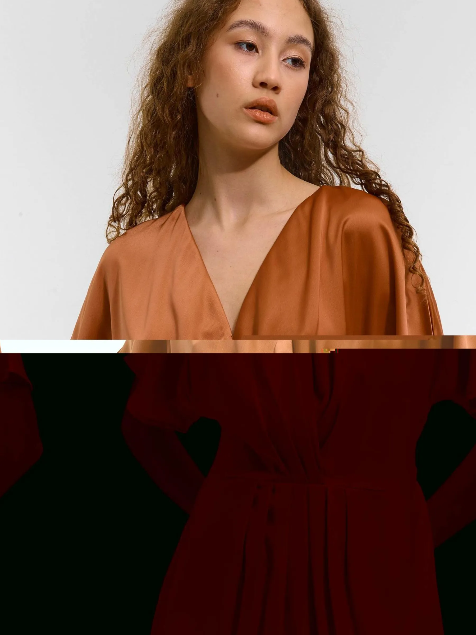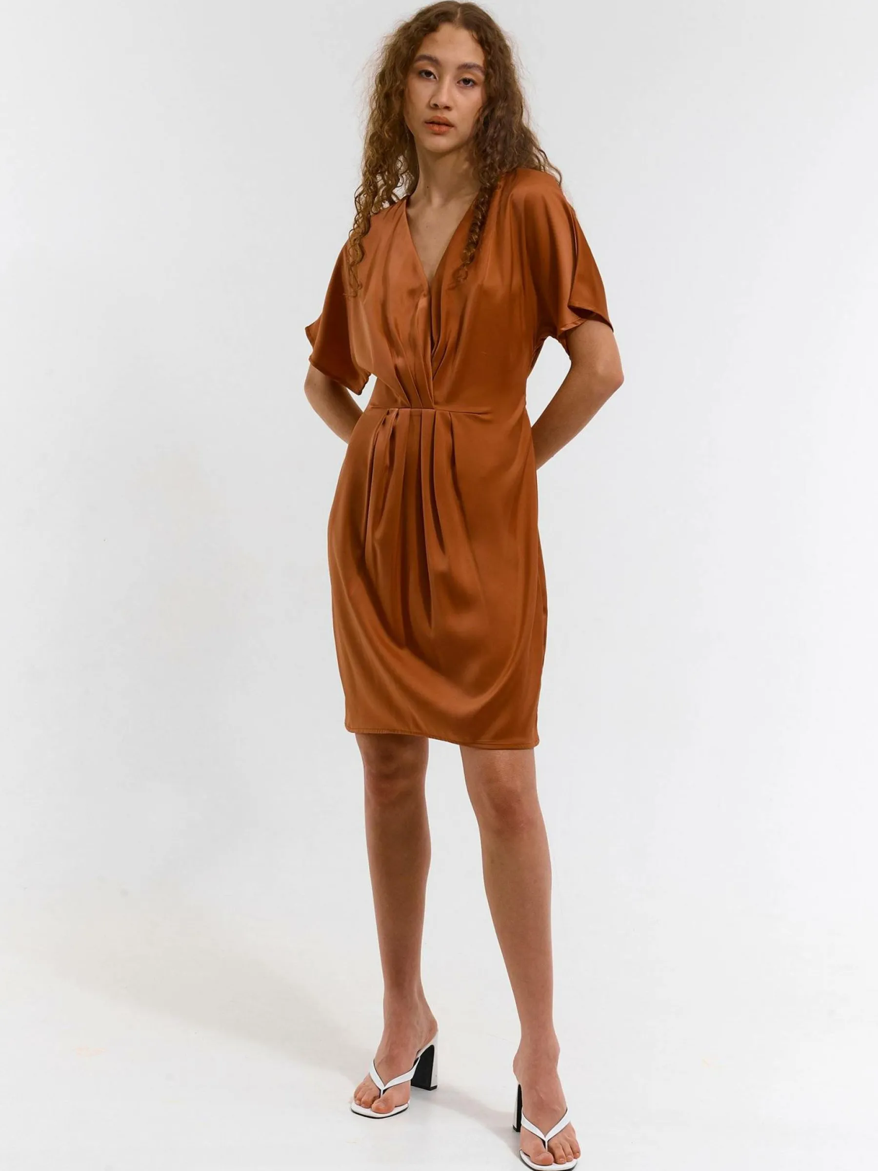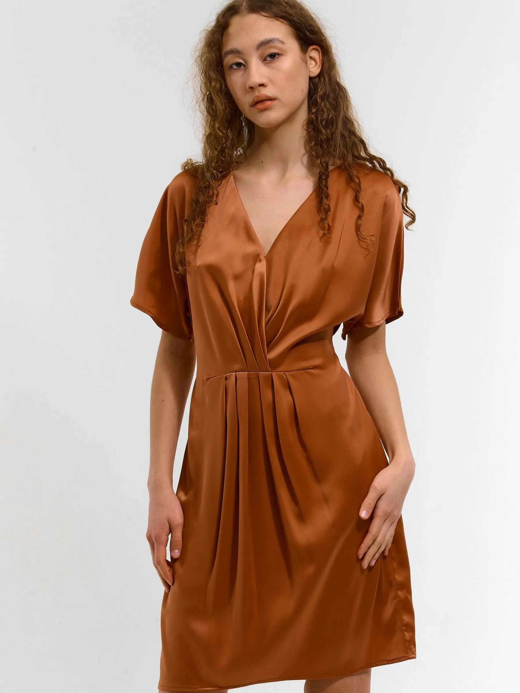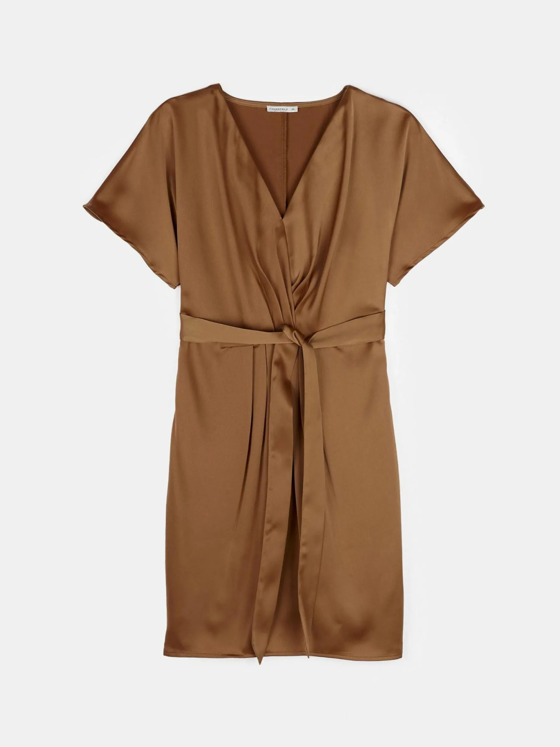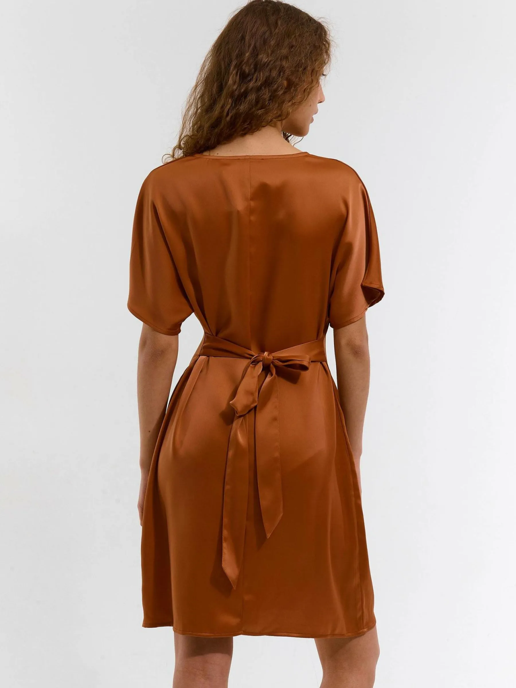 Kolor: brązowyKrój: z marszczeniemTyp: sukienkaRekaw: krótki rękawDługość: miniPattern style: pojedynczy kolorDet…