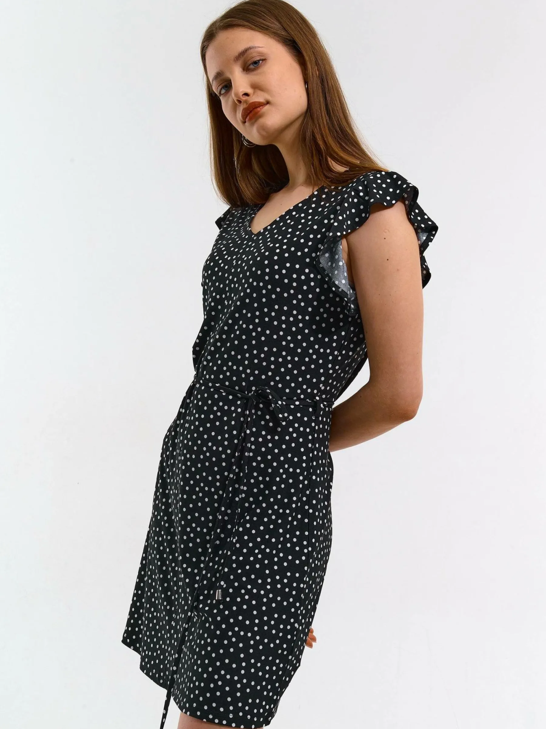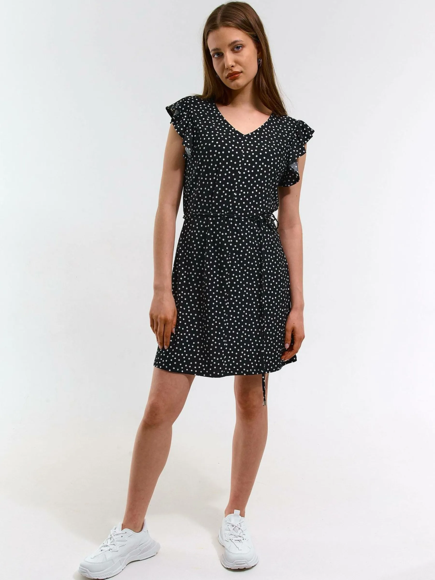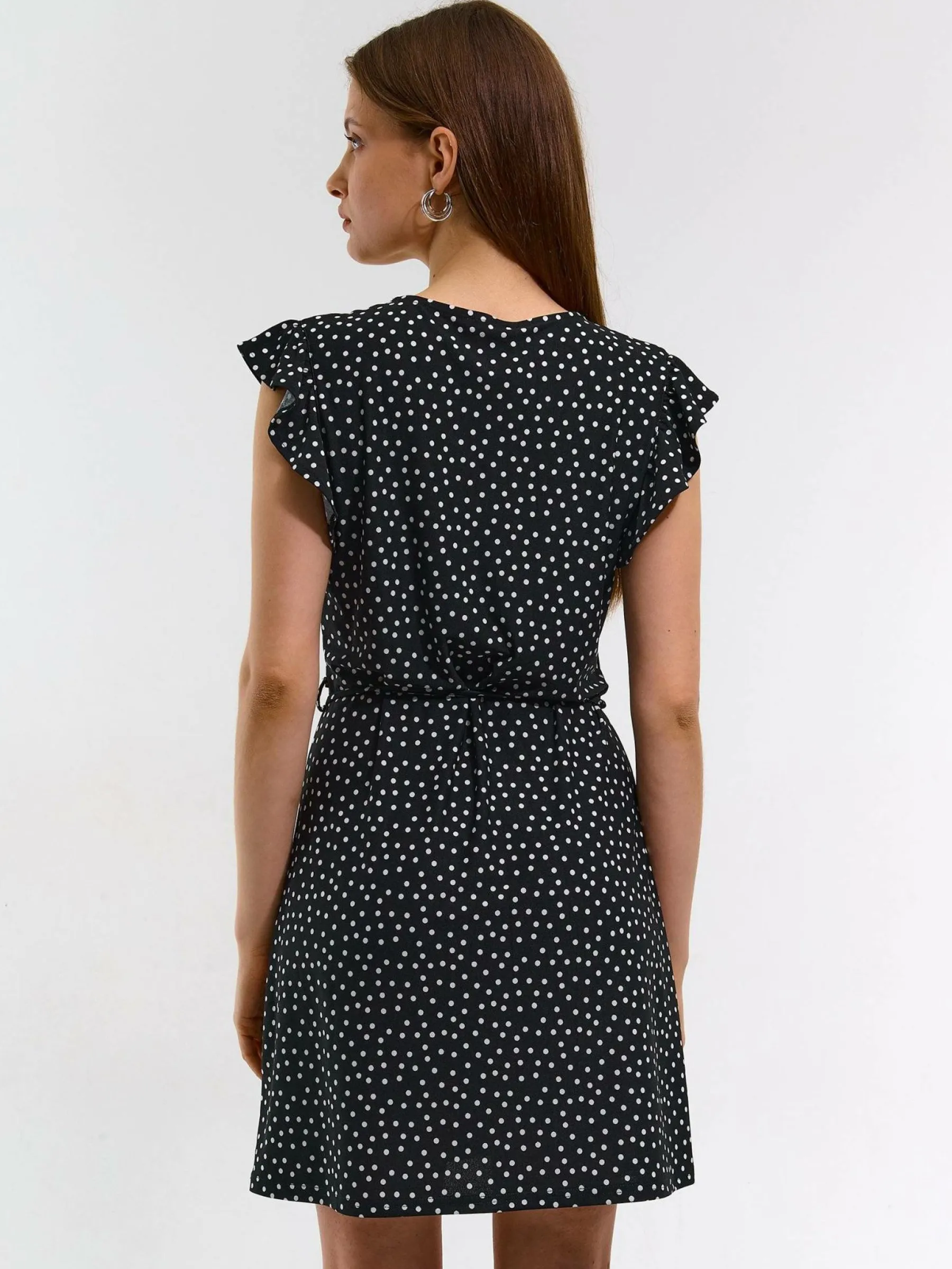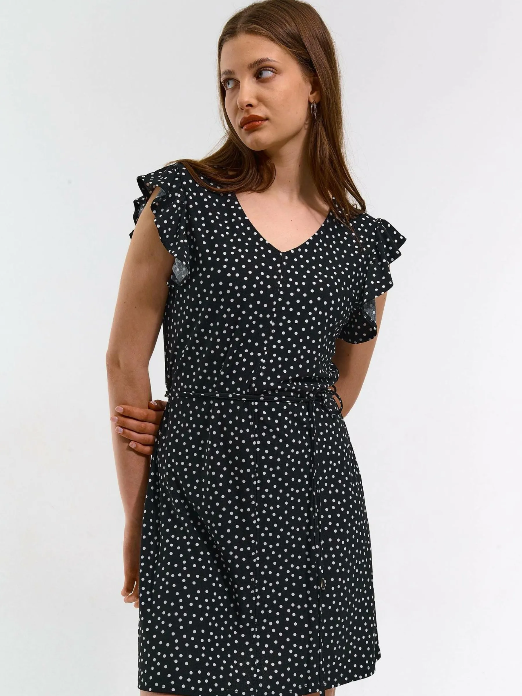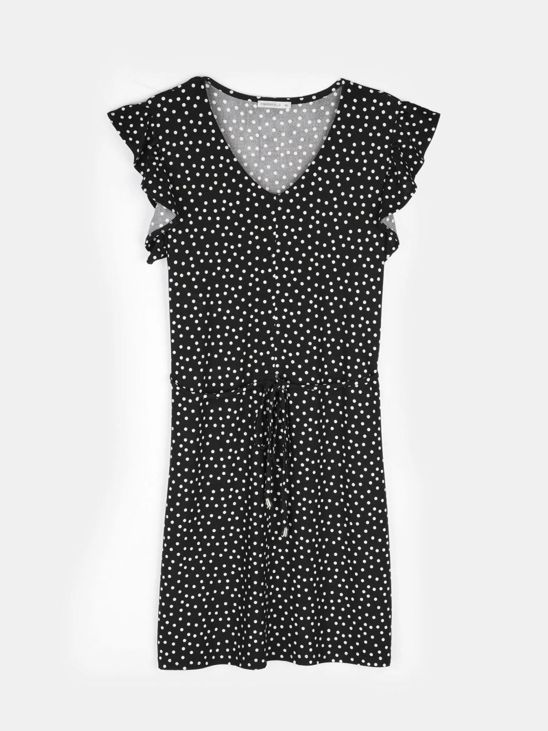 Kolor: czarnyKrój: z falbanąTyp: sukienkaRekaw: krótki rękawDługość: miniPattern style: w grochyDetal: z paskiem,…
