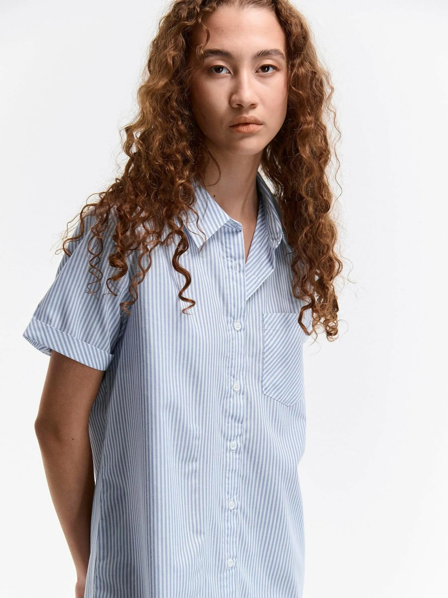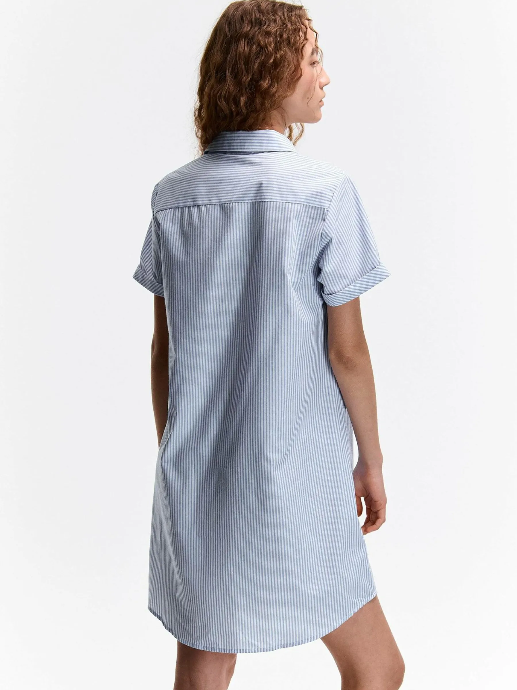 Kolor: niebieskiKrój: koszuloweTyp: sukienkaRekaw: krótki rękawDługość: miniPattern style: w prążkiDetal: na guz…