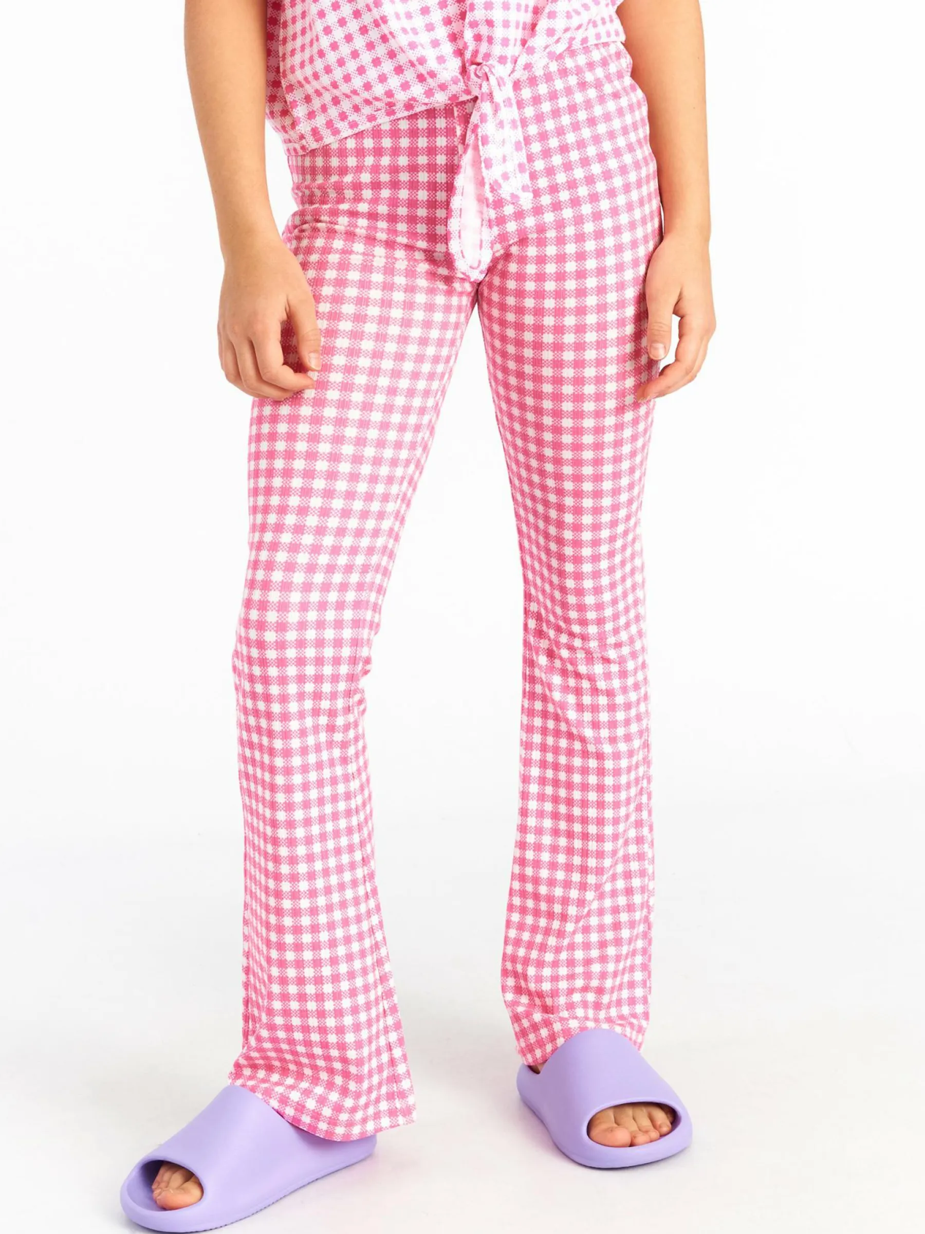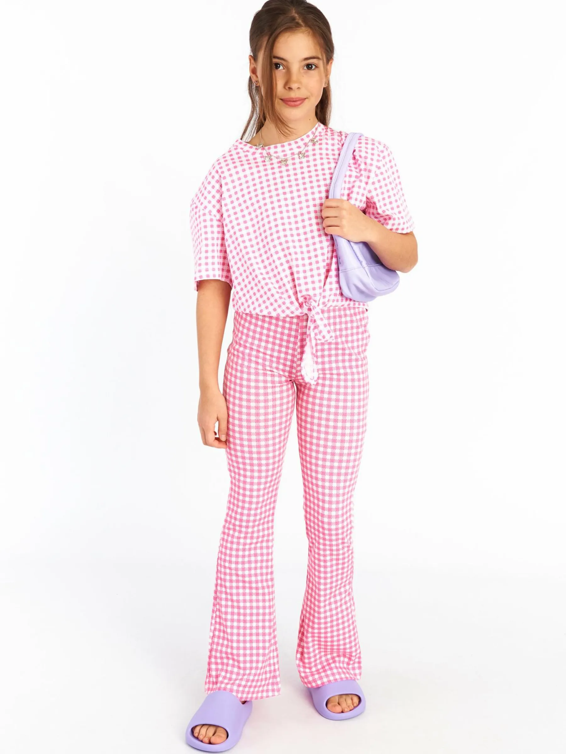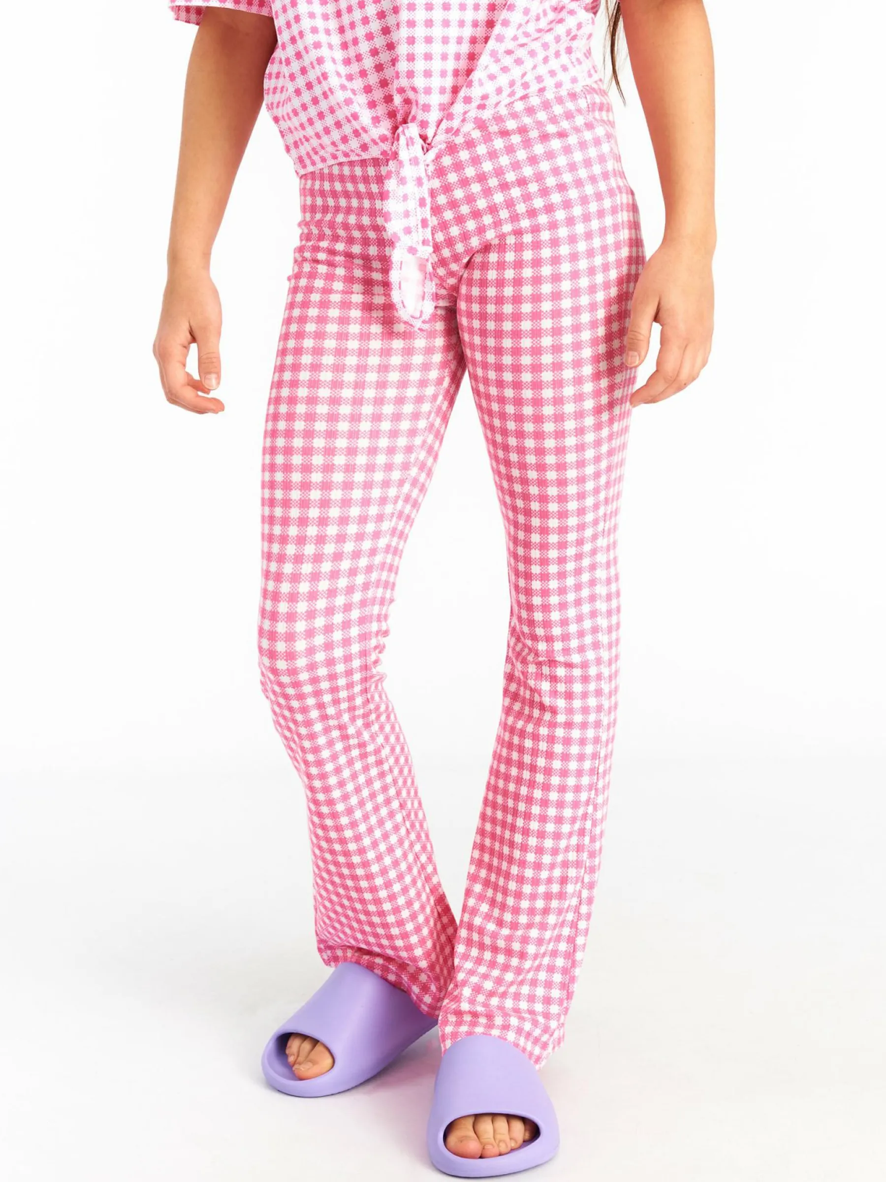 Kolor: różowyKrój: dzwonTyp: spodnieDługość: dlugiePattern style: w kratkęMateriał: syntetycznePłeć: dziewczyn…
