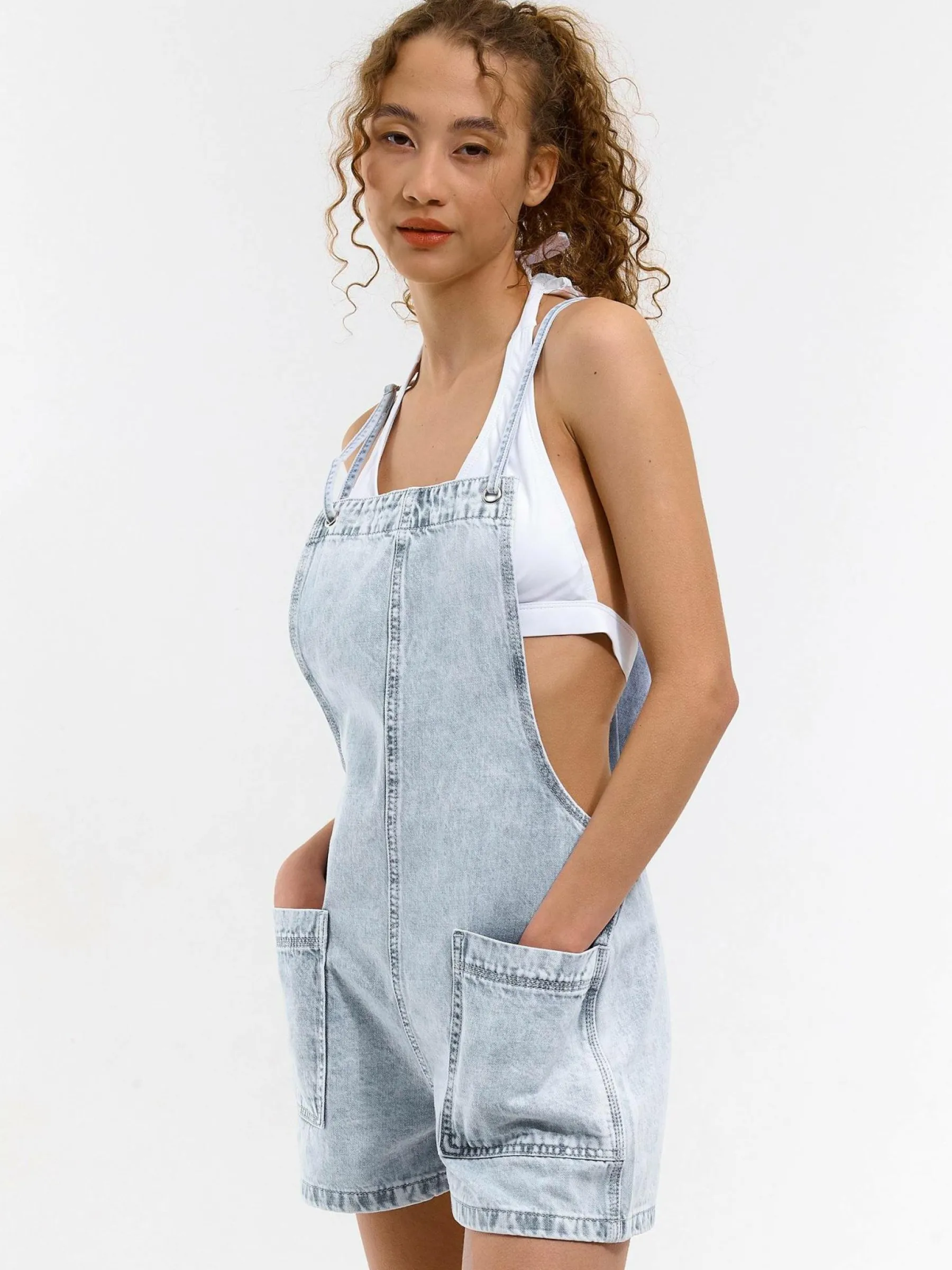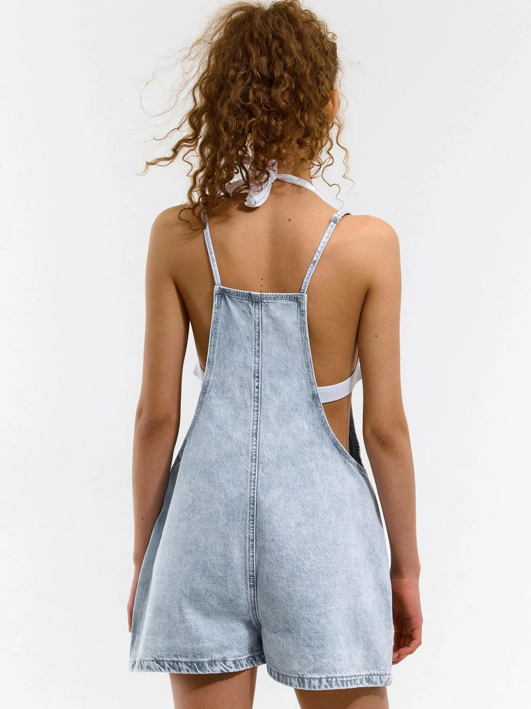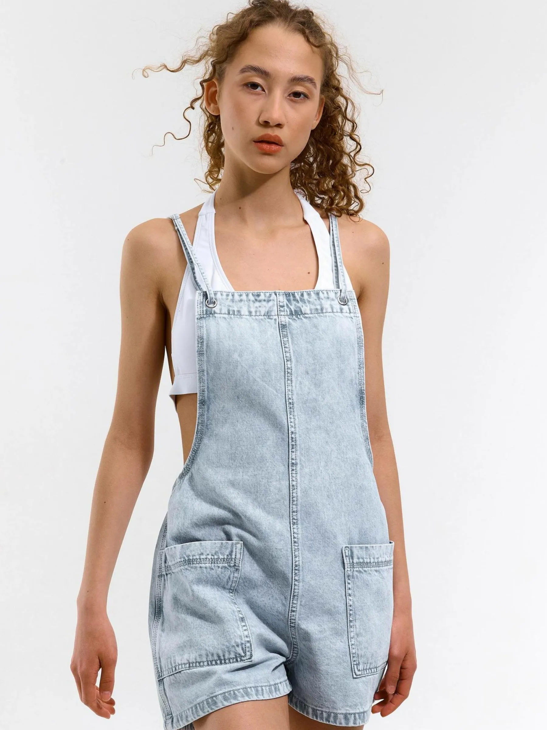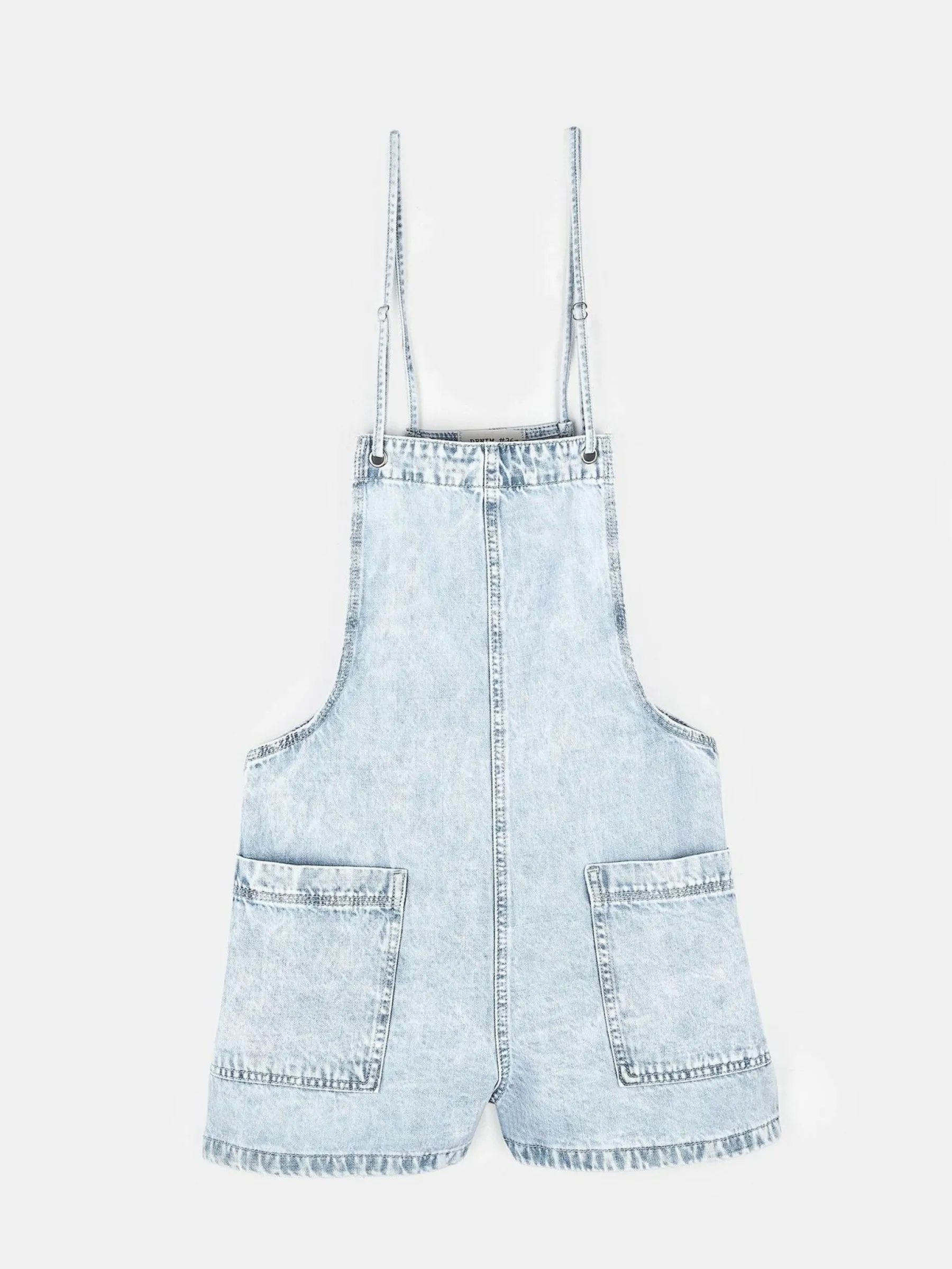 Kolor: niebieskiKrój: na szelkachTyp: spodenkiDługość: krótkiPattern style: pojedynczy kolorMateriał: dżinsowePł…