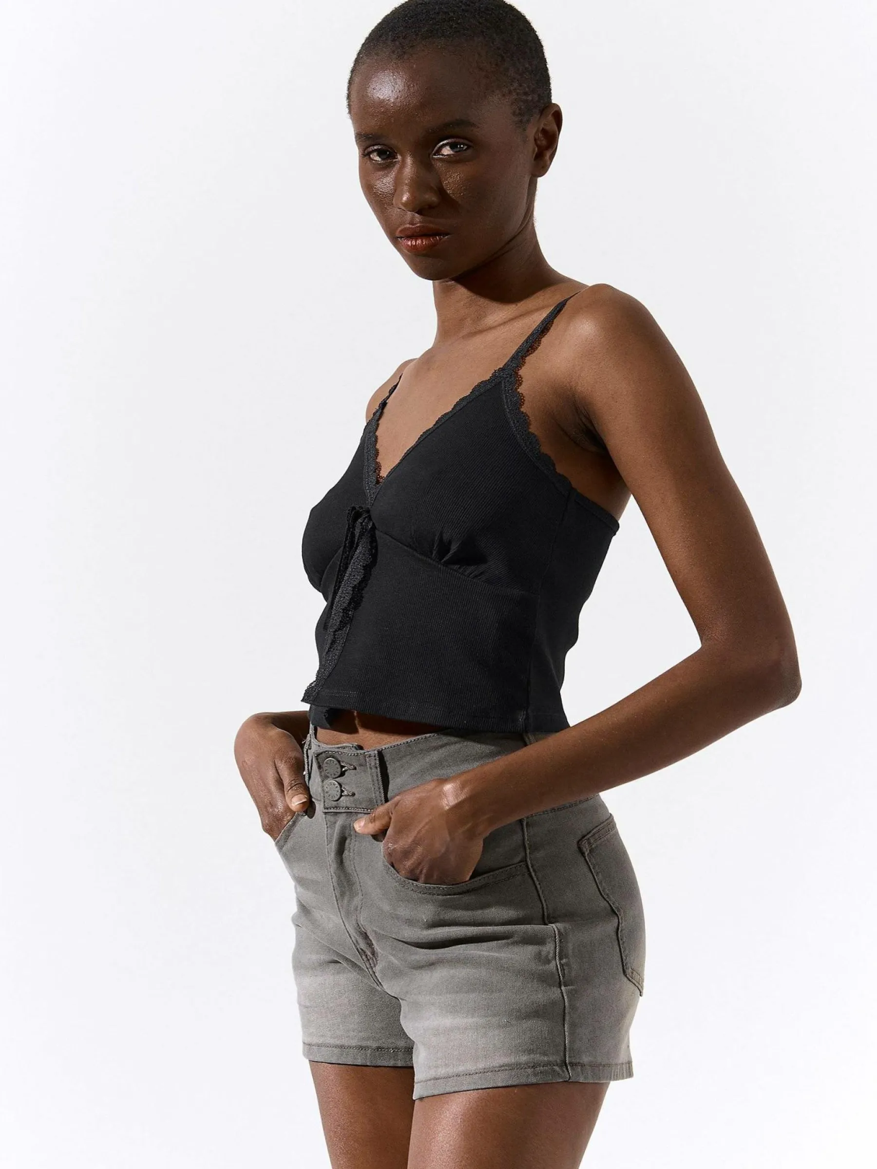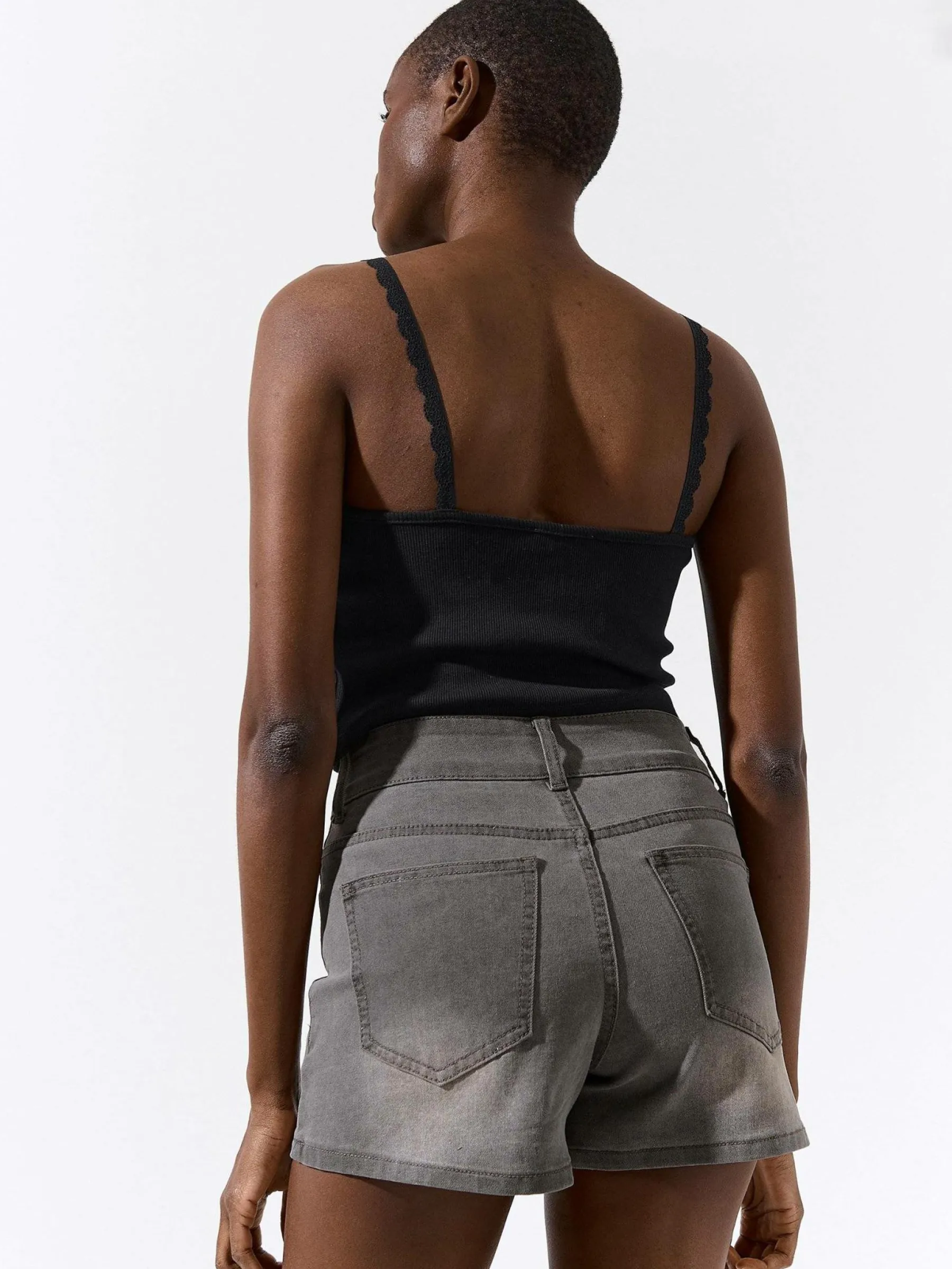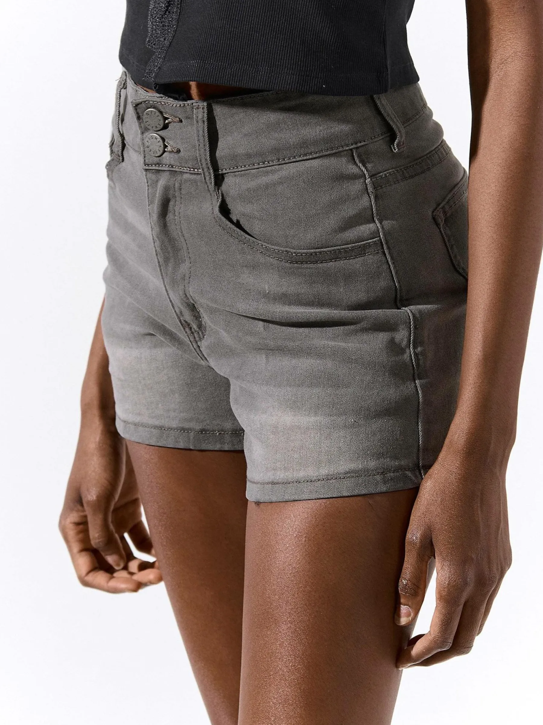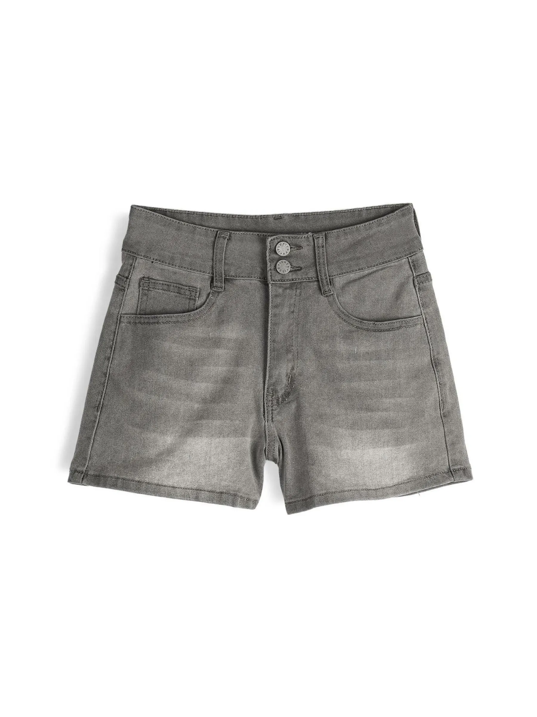 Kolor: szaryKrój: skinny, z wysokim stanemTyp: spodenkiDługość: krótkiPattern style: pojedynczy kolorDetal: na guzi…