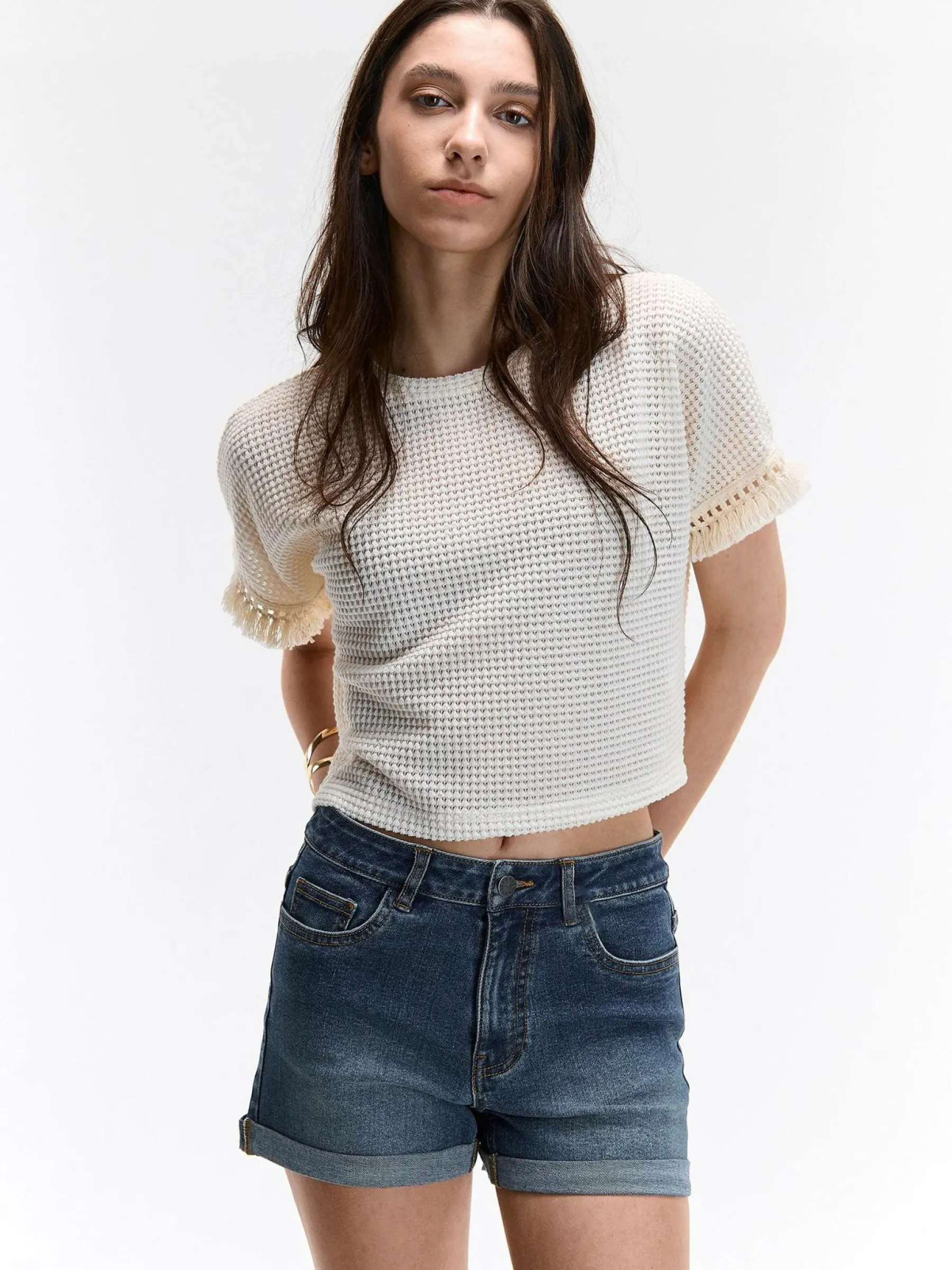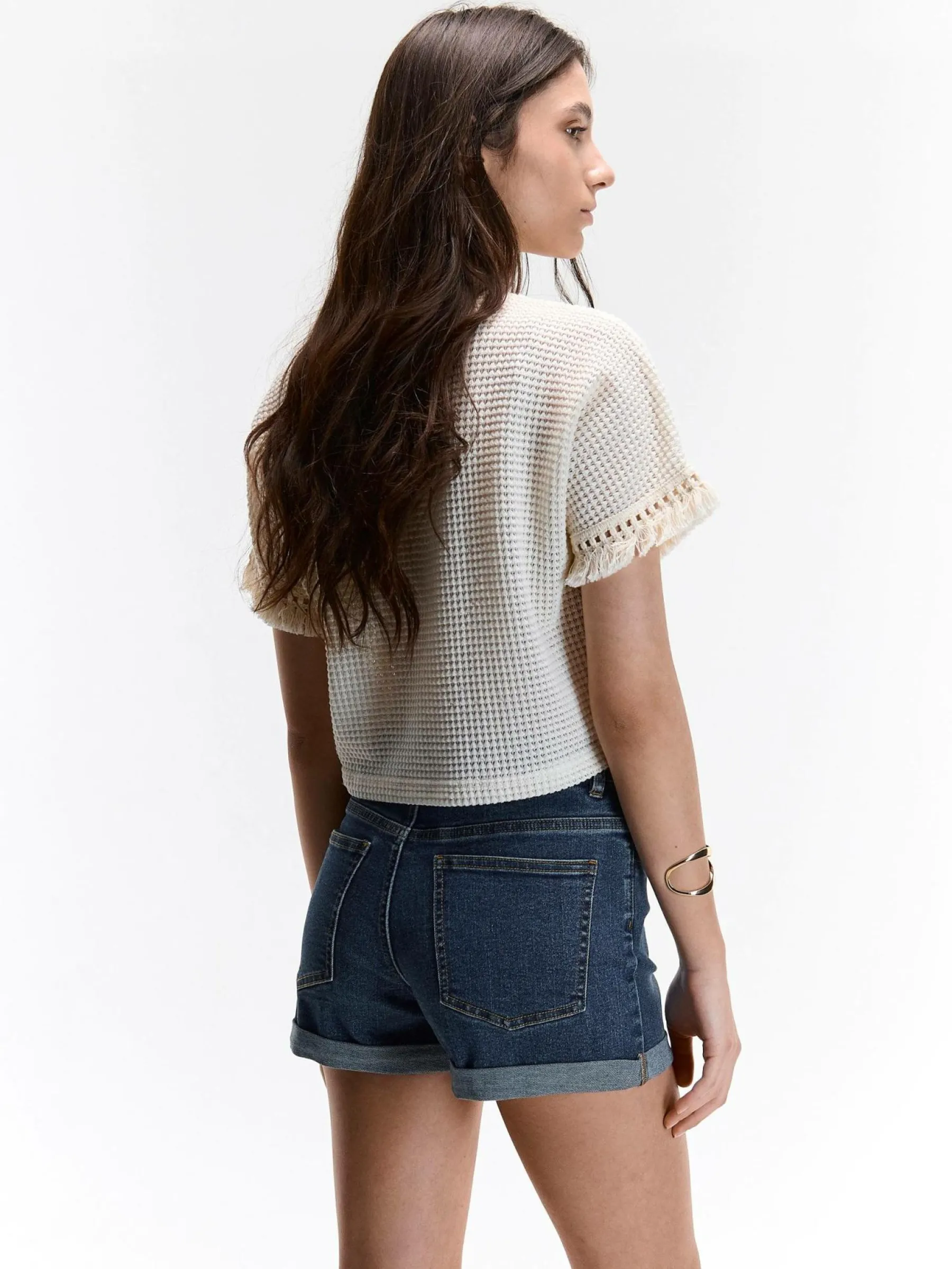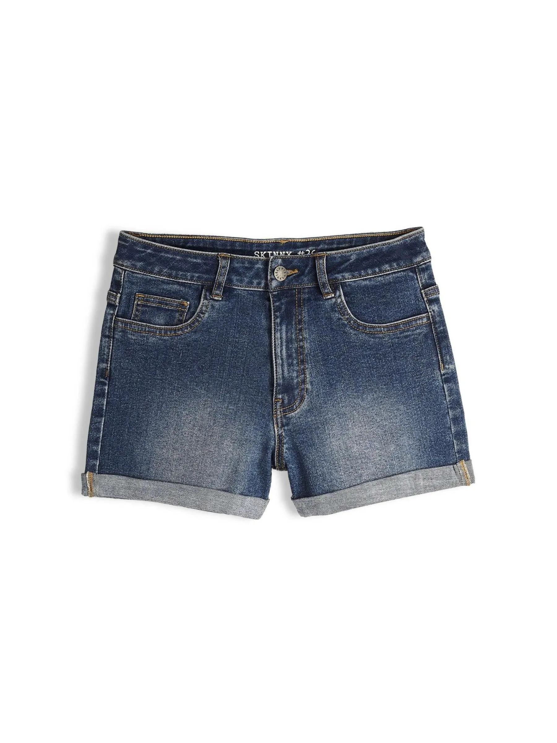 Kolor: niebieskiKrój: skinnyTyp: spodenkiDługość: krótkiPattern style: pojedynczy kolorDetal: na zamek, z kieszenia…
