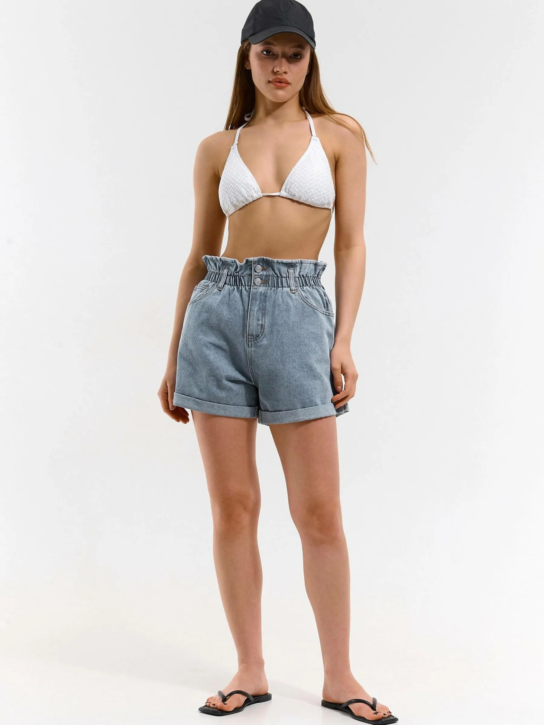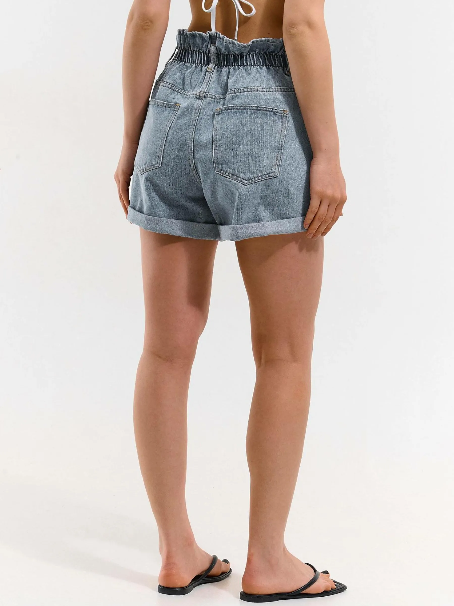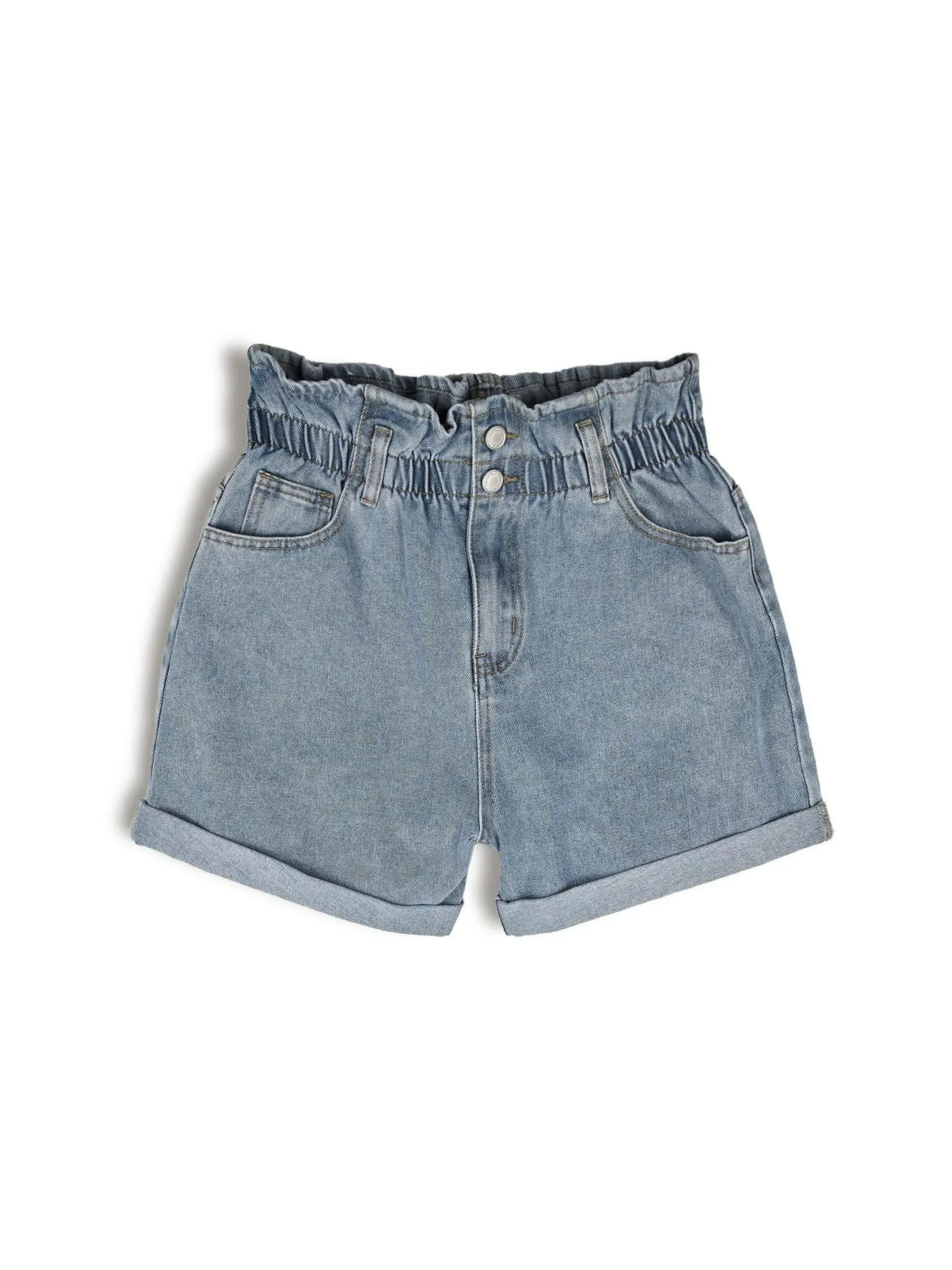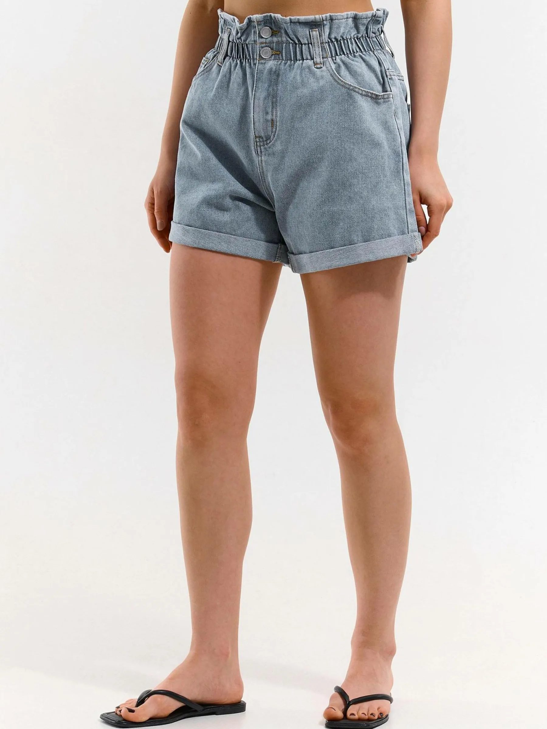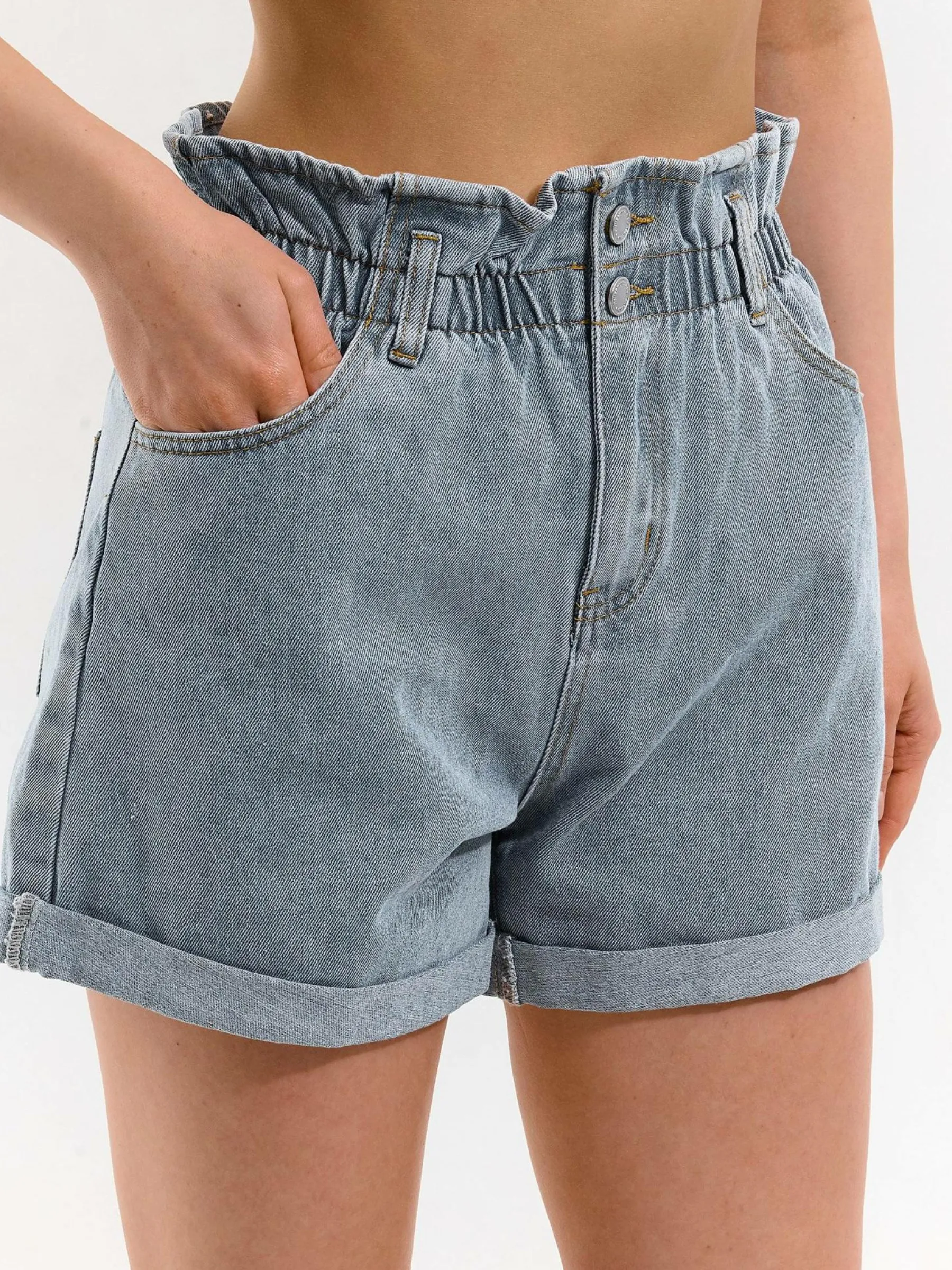 Kolor: niebieskiKrój: paperbagTyp: spodenkiDługość: krótkiPattern style: pojedynczy kolorDetal: na guzikiMateriał:…