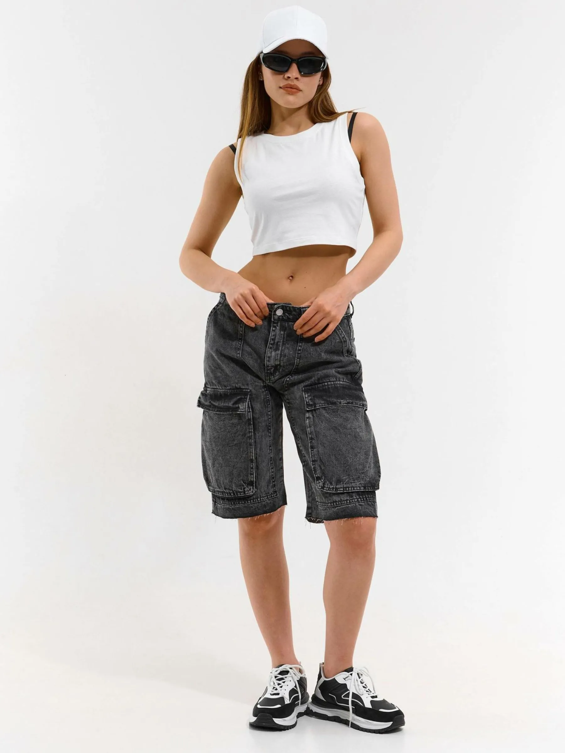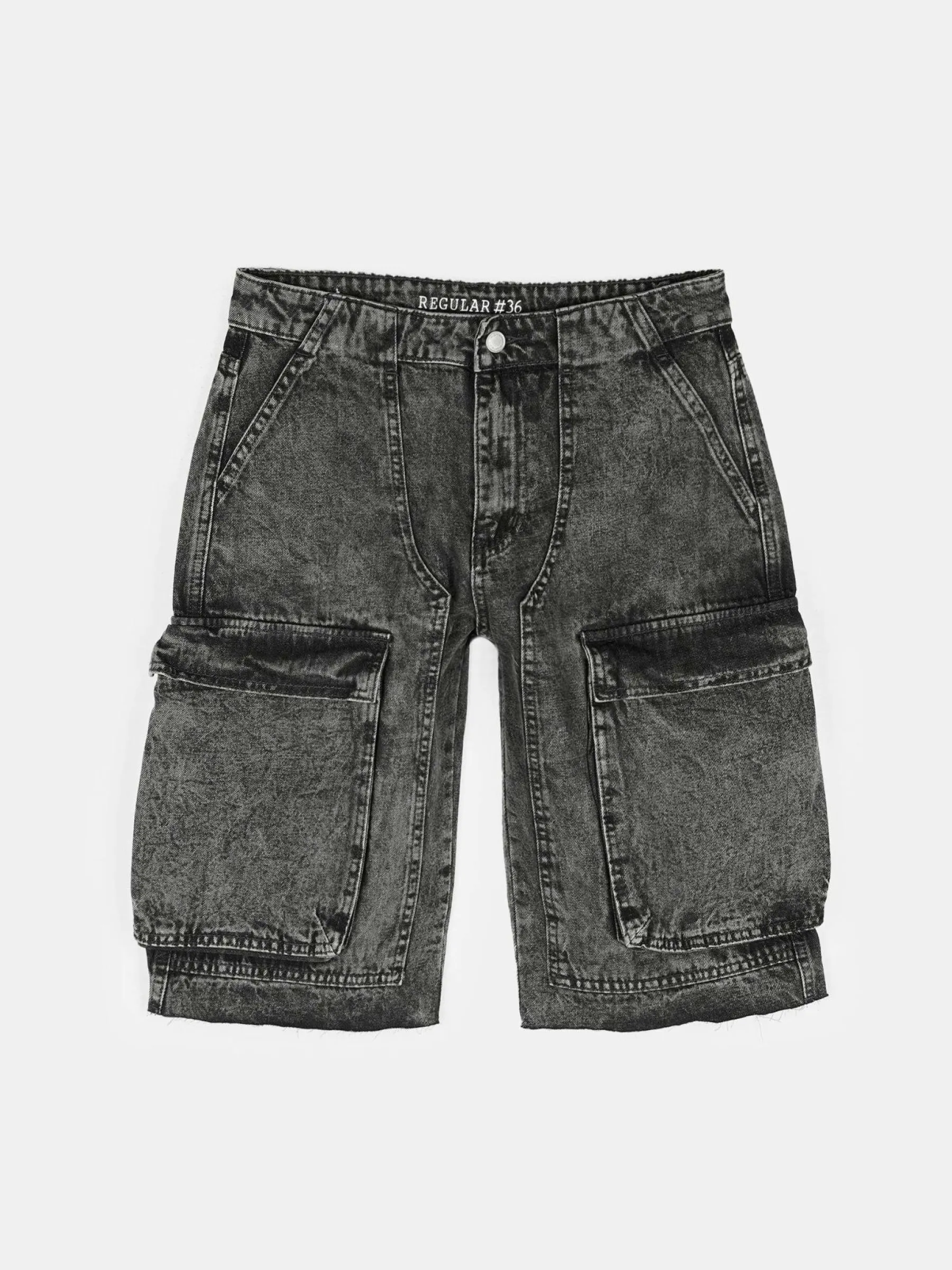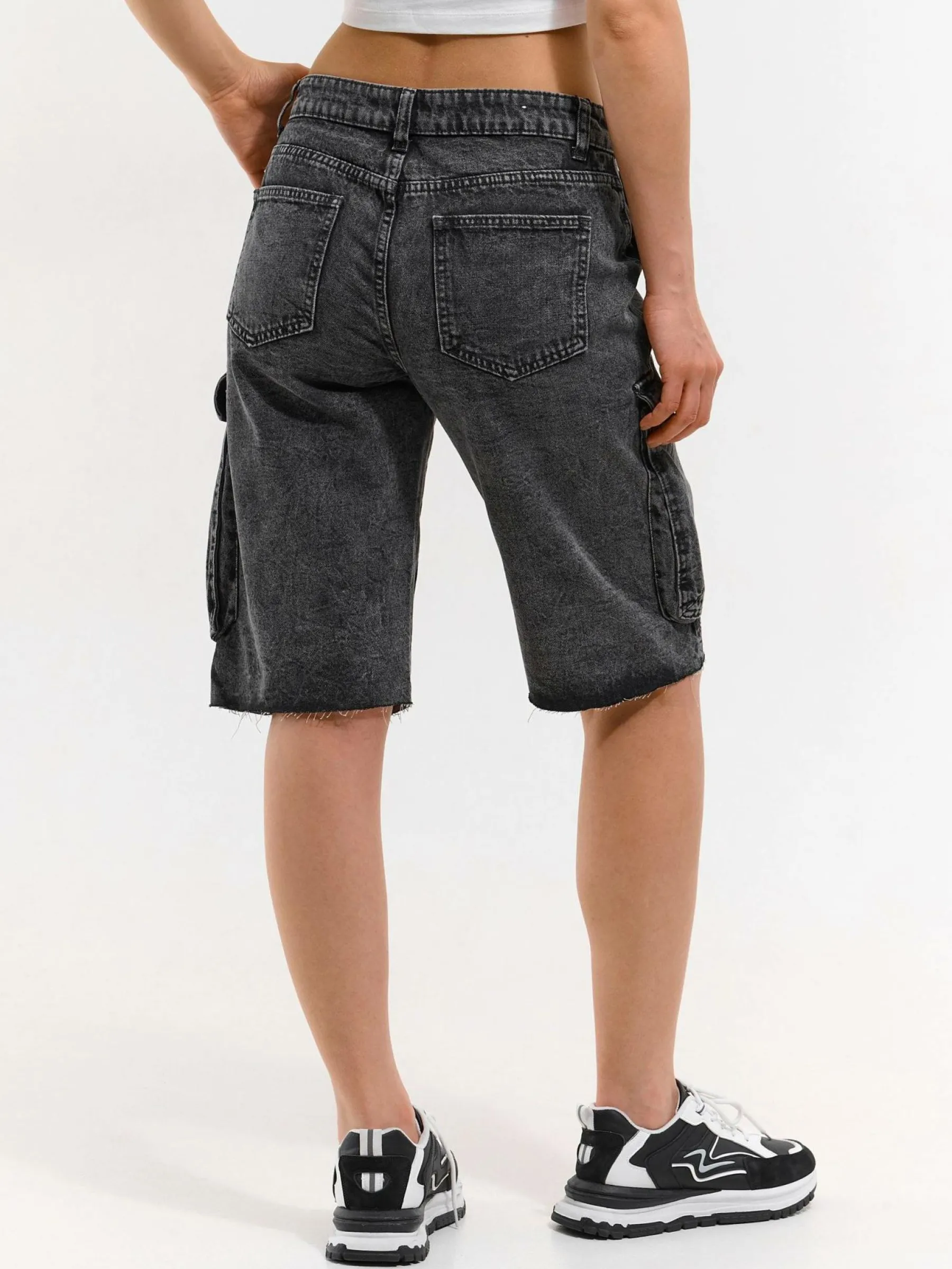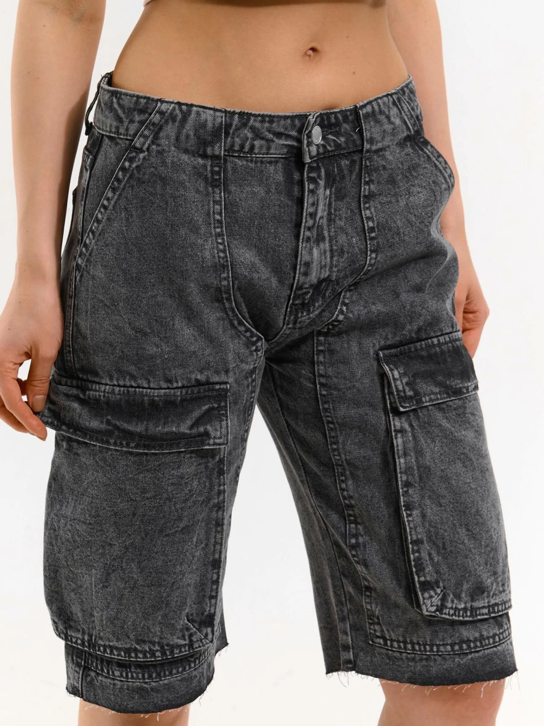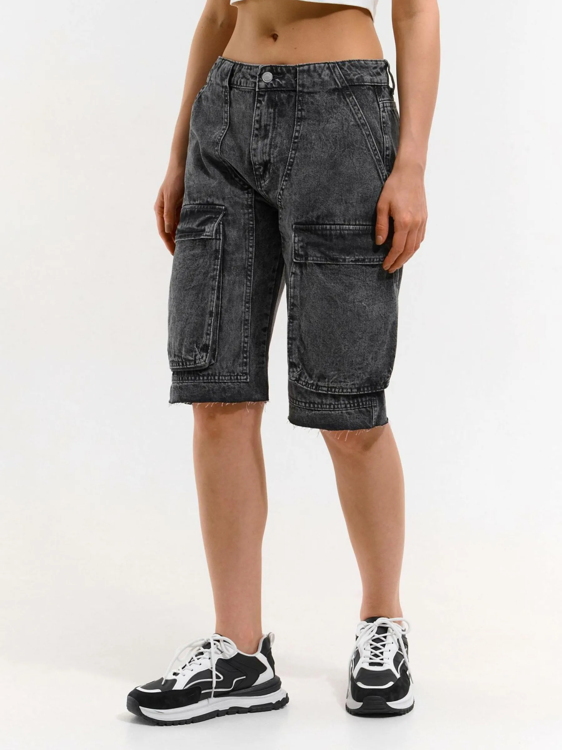Kolor: szaryKrój: straightTyp: spodenkiDługość: krótkiPattern style: pojedynczy kolorDetal: na zamek, z kieszeniami…