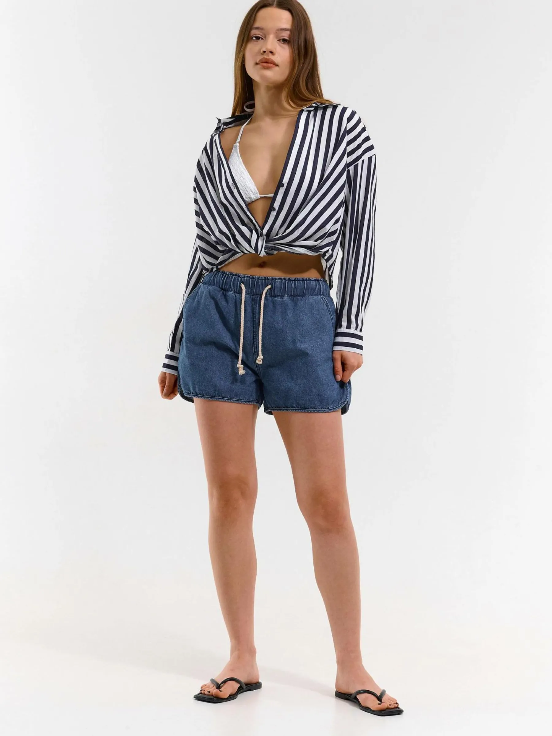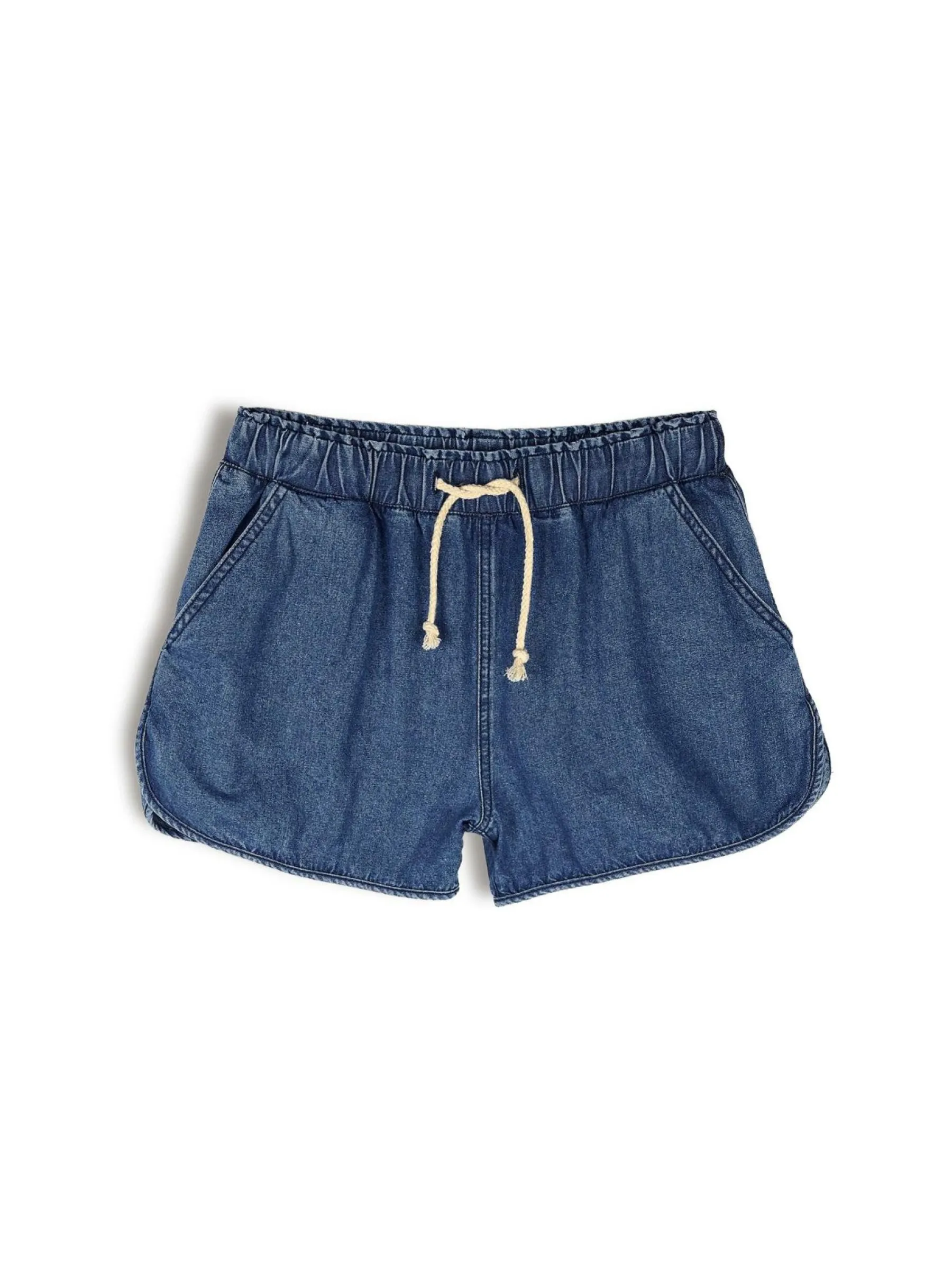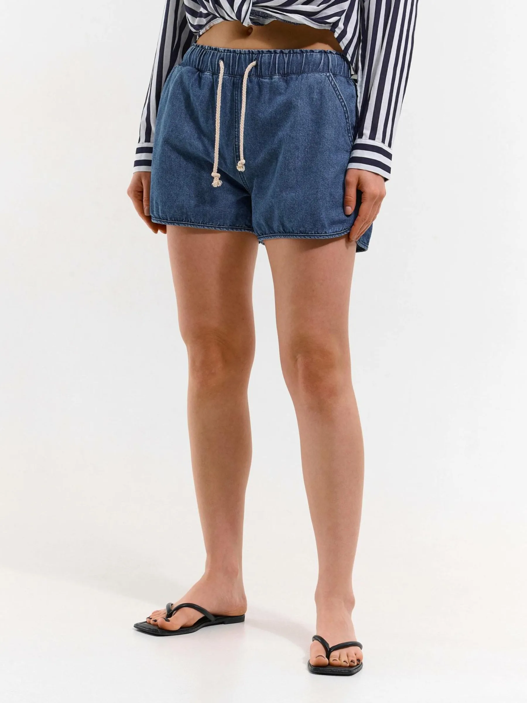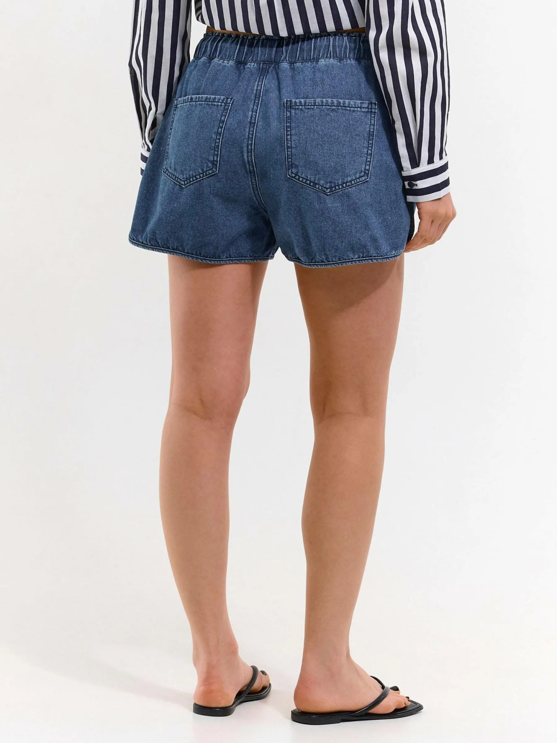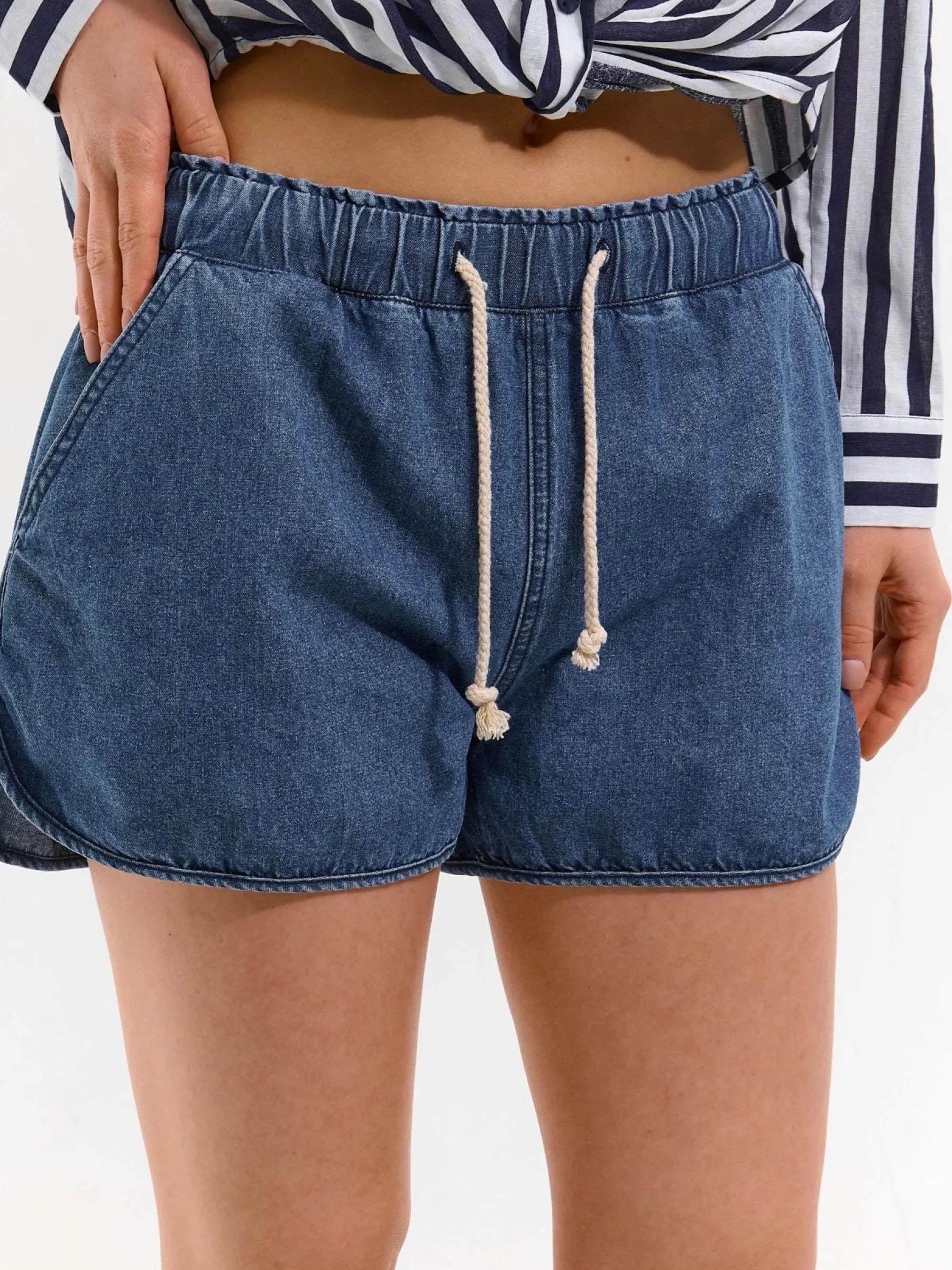Kolor: niebieskiKrój: straightTyp: spodenkiDługość: krótkiPattern style: pojedynczy kolorDetal: ze sznurowaniemMate…