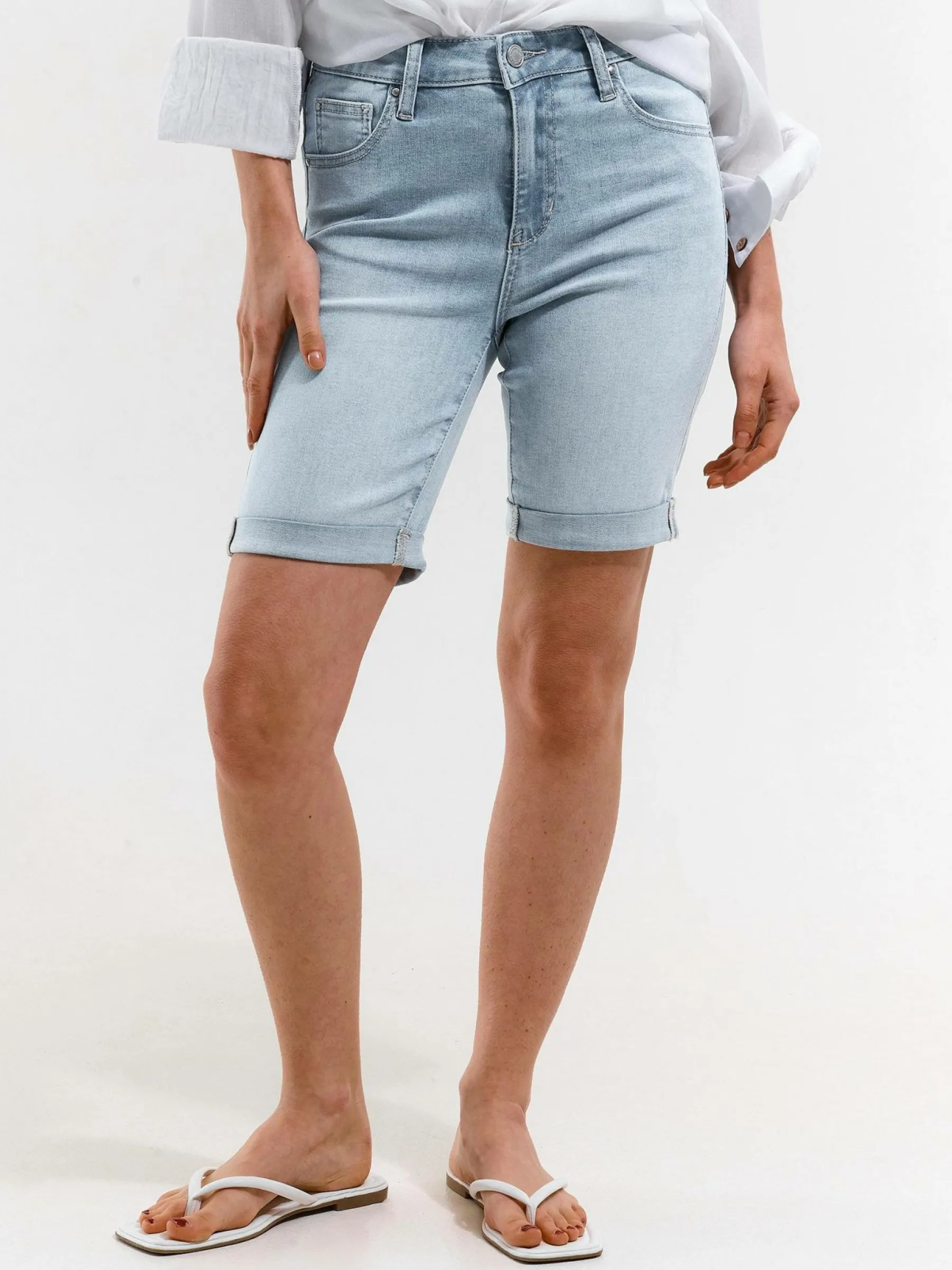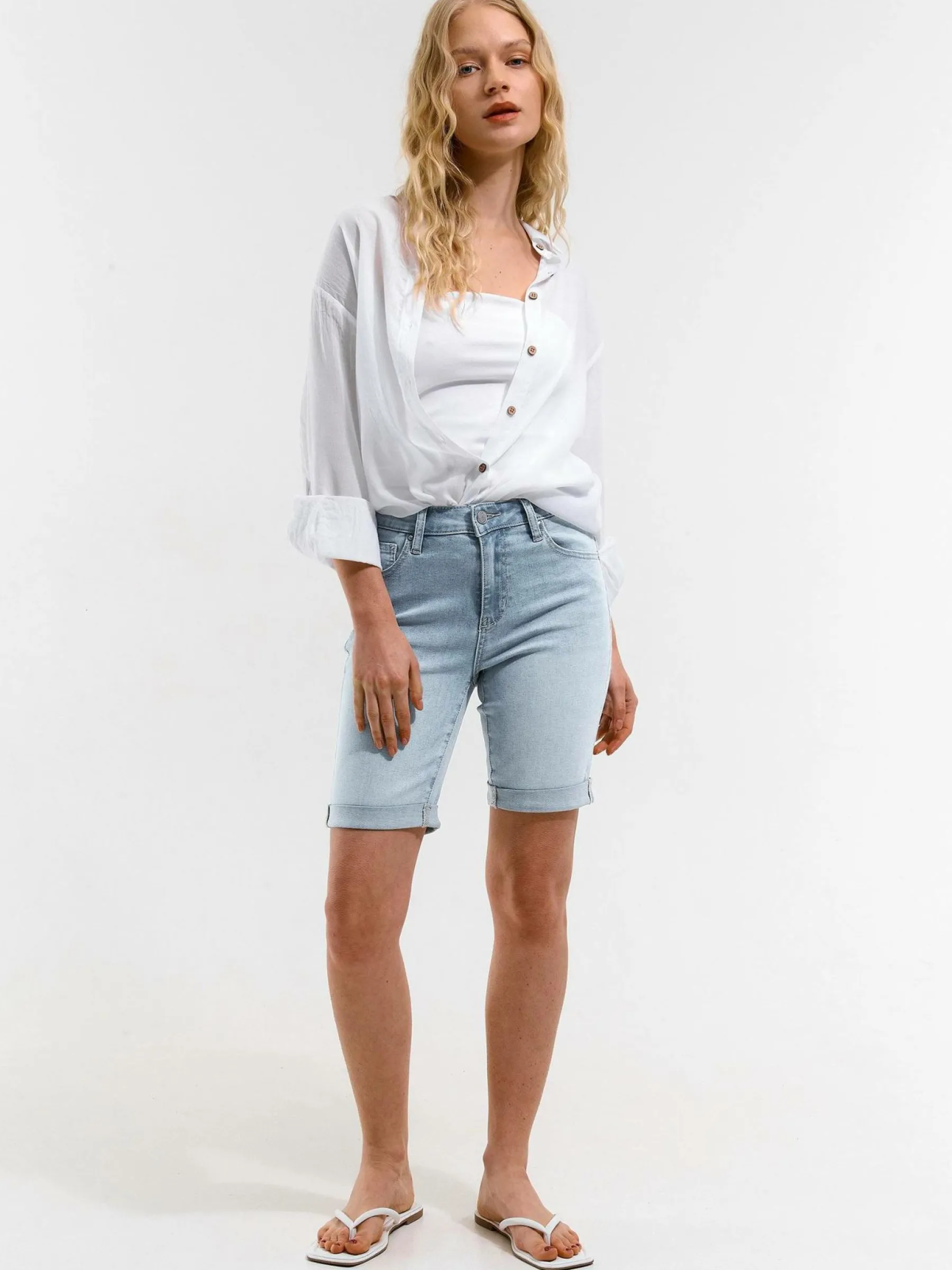 Kolor: niebieskiKrój: skinnyTyp: spodenkiDługość: krótkiPattern style: pojedynczy kolorDetal: na zamek, z kieszenia…