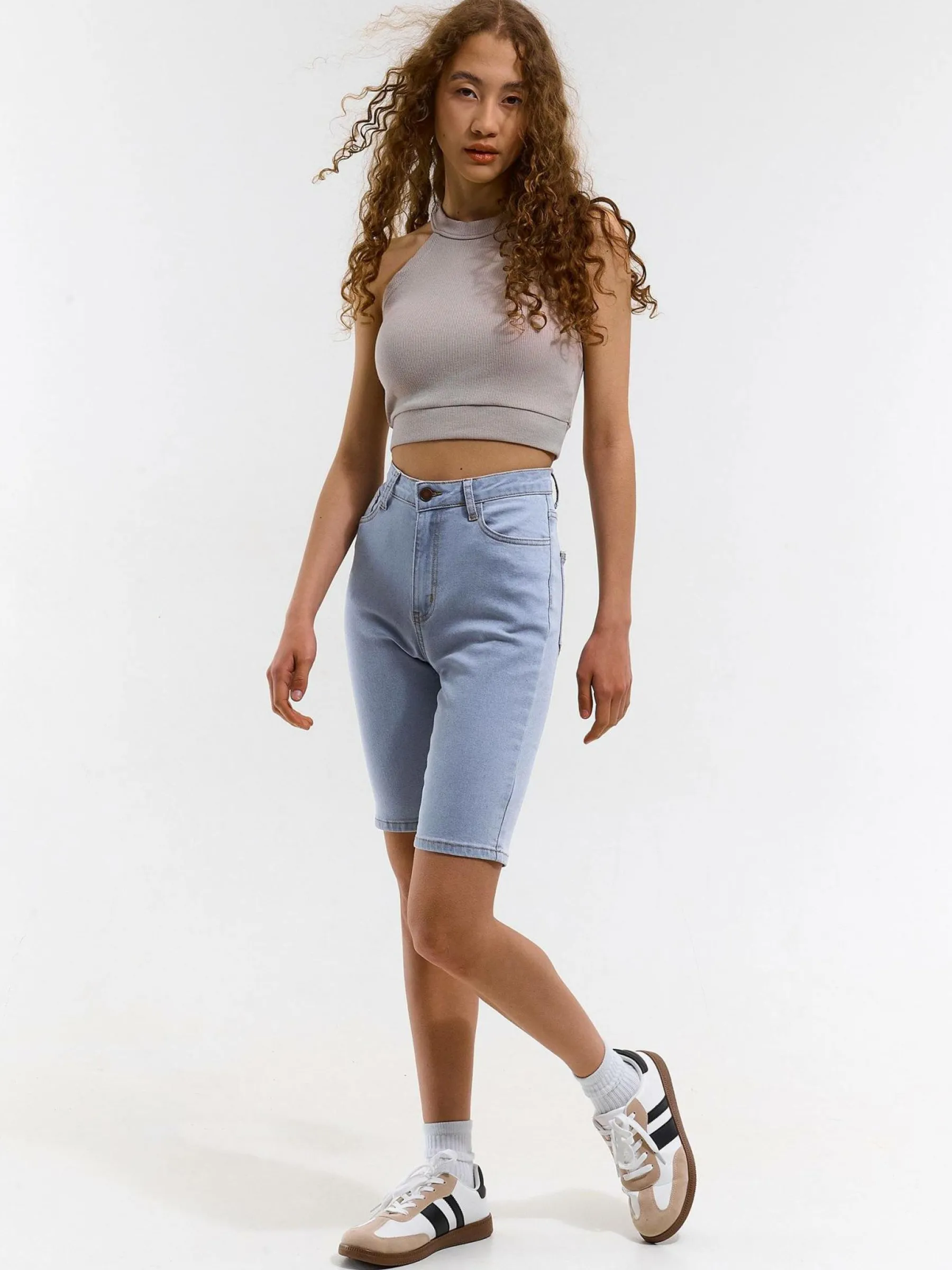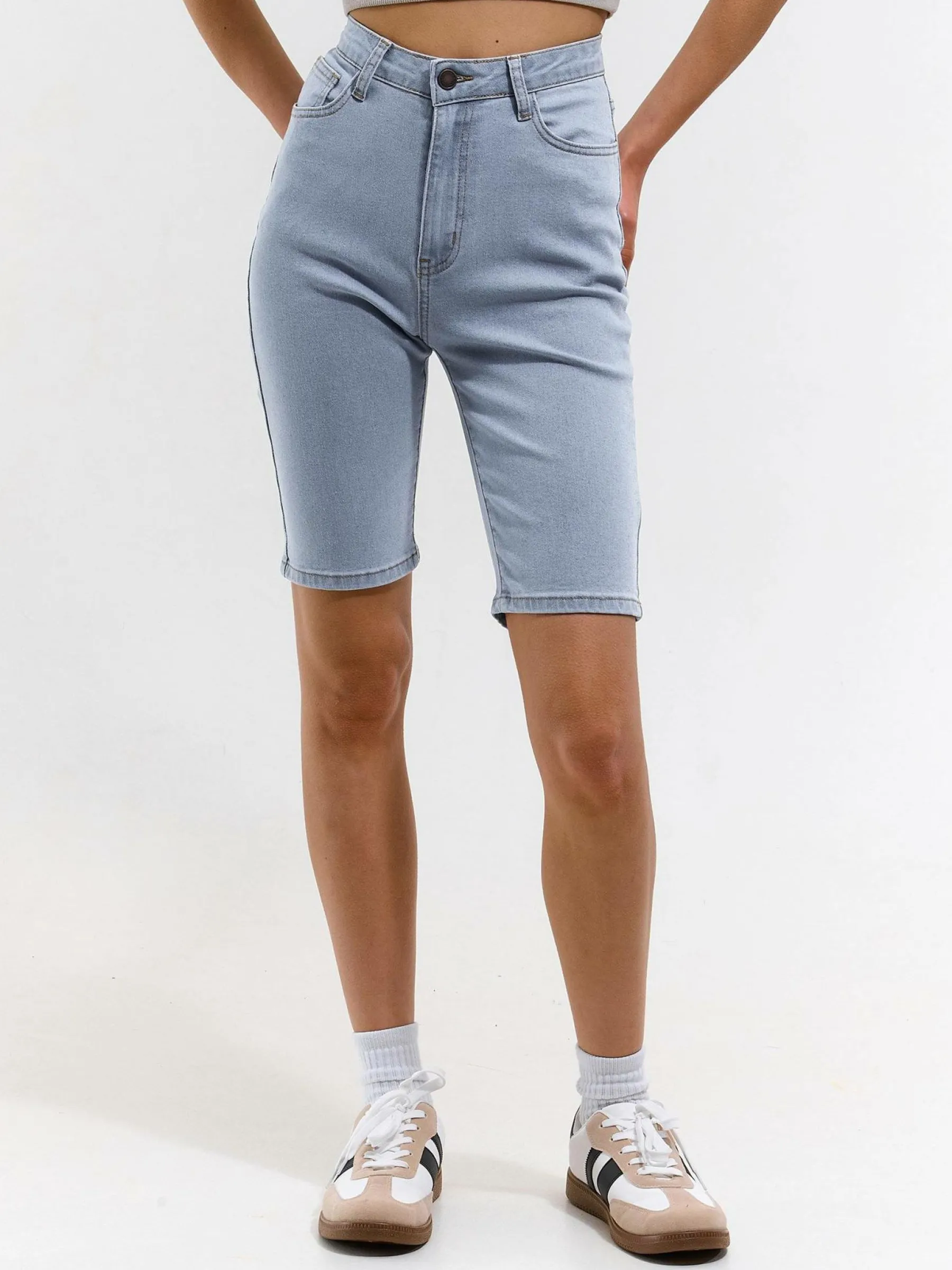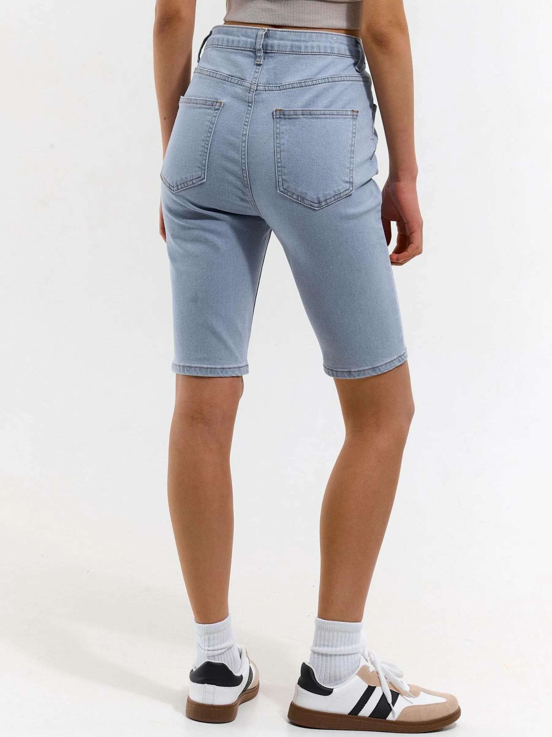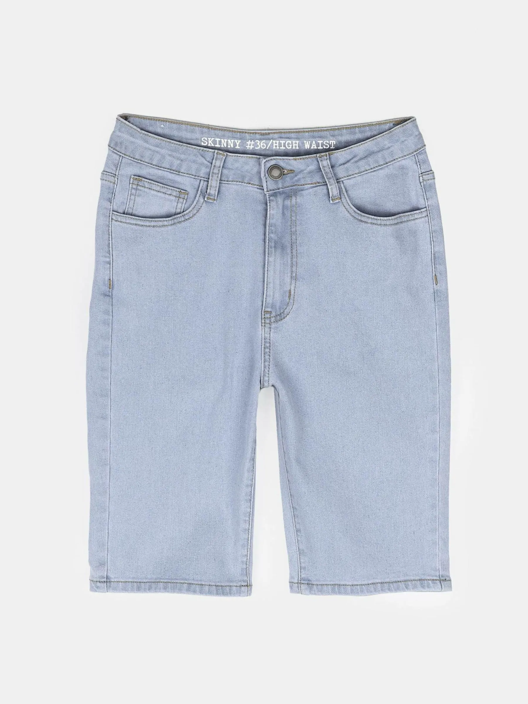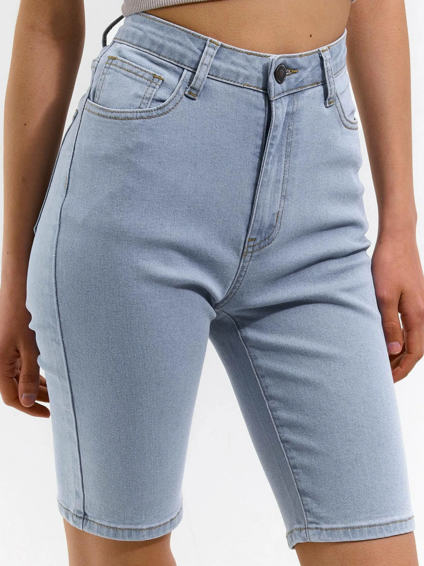 Kolor: niebieskiKrój: skinnyTyp: spodenkiDługość: krótkiPattern style: pojedynczy kolorDetal: na zamek, z kieszenia…