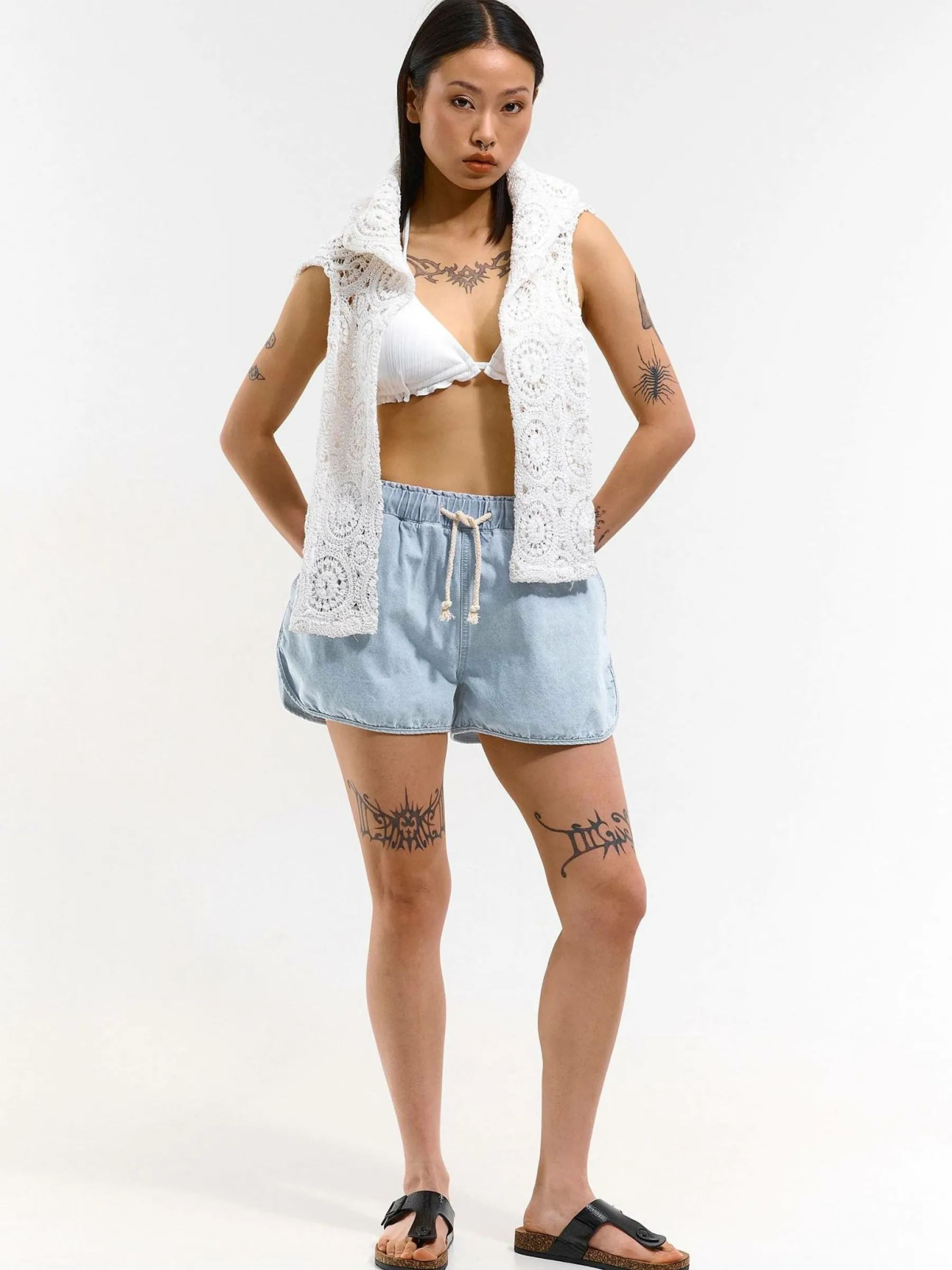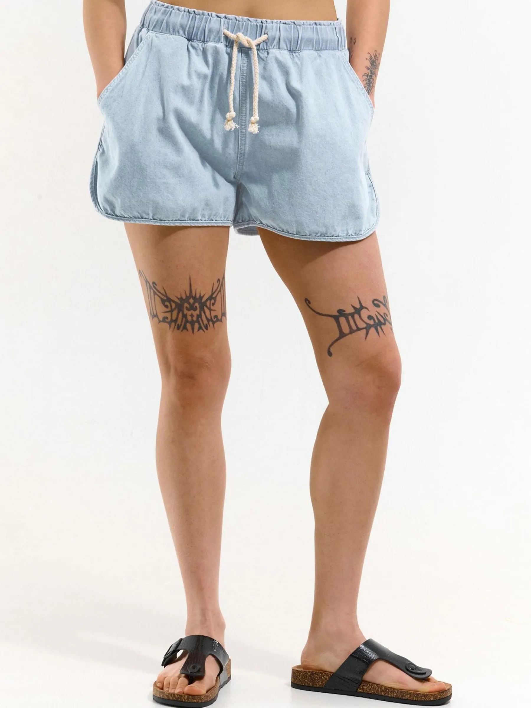 Kolor: niebieskiKrój: straightTyp: spodenkiDługość: krótkiPattern style: pojedynczy kolorDetal: ze sznurowaniem, z …