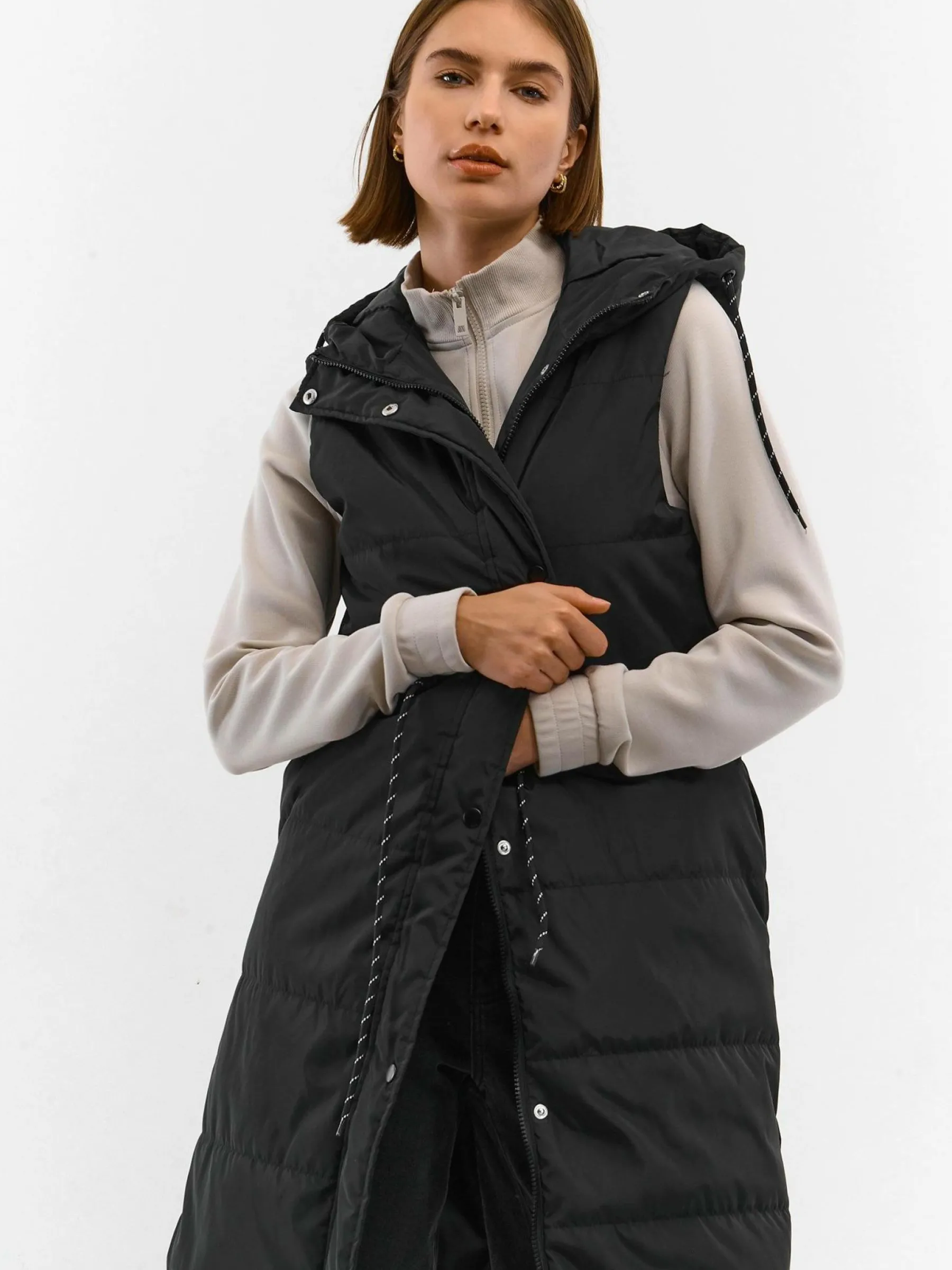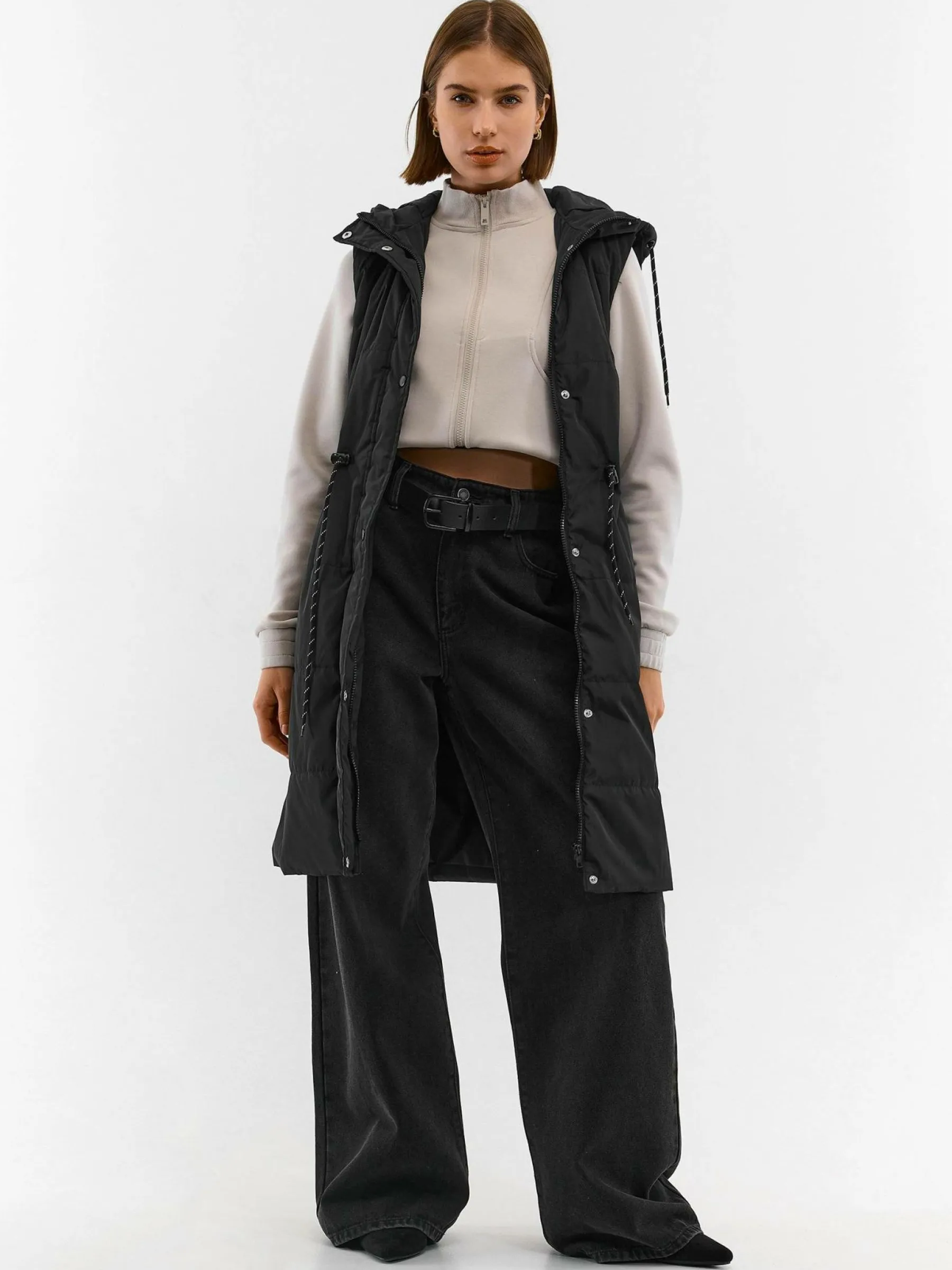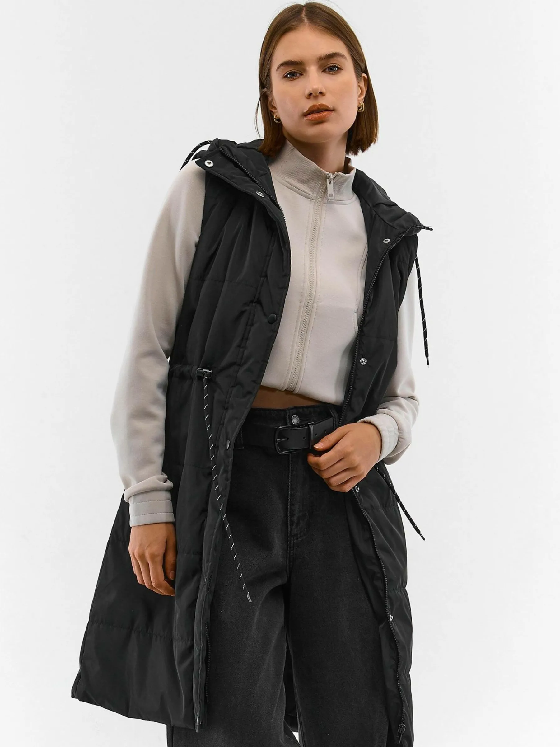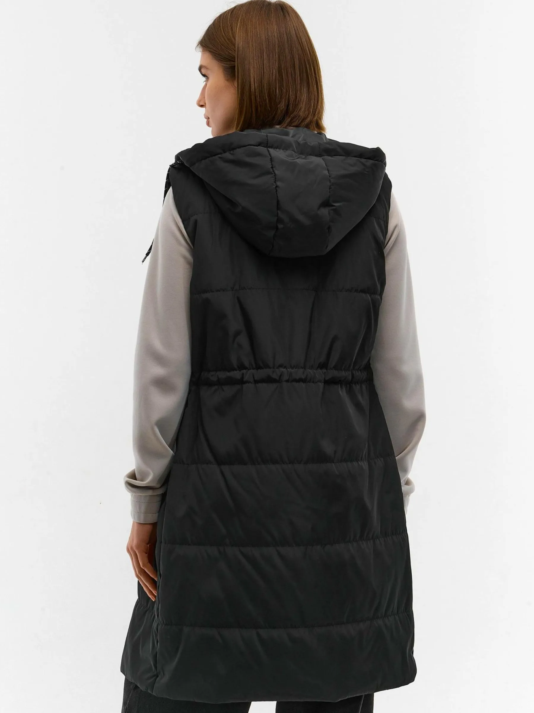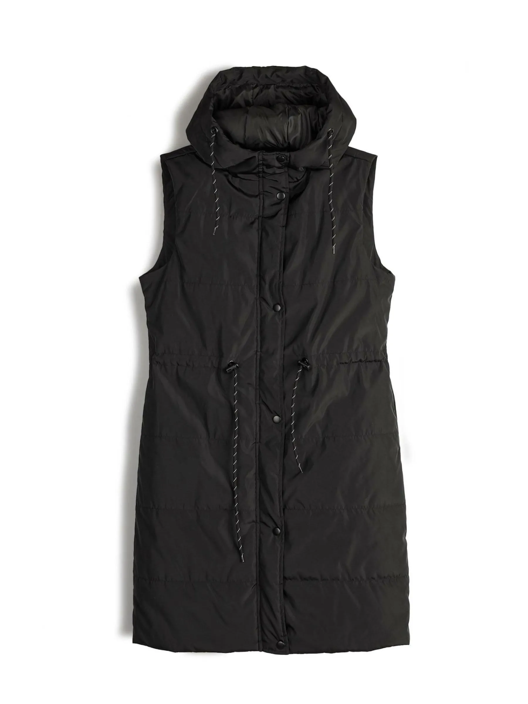 Kolor: czarnyKrój: pikowaneTyp: zimowa/przejściowa kamizelkaRekaw: bez rękawówDługość: dlugiePattern style: pojed…