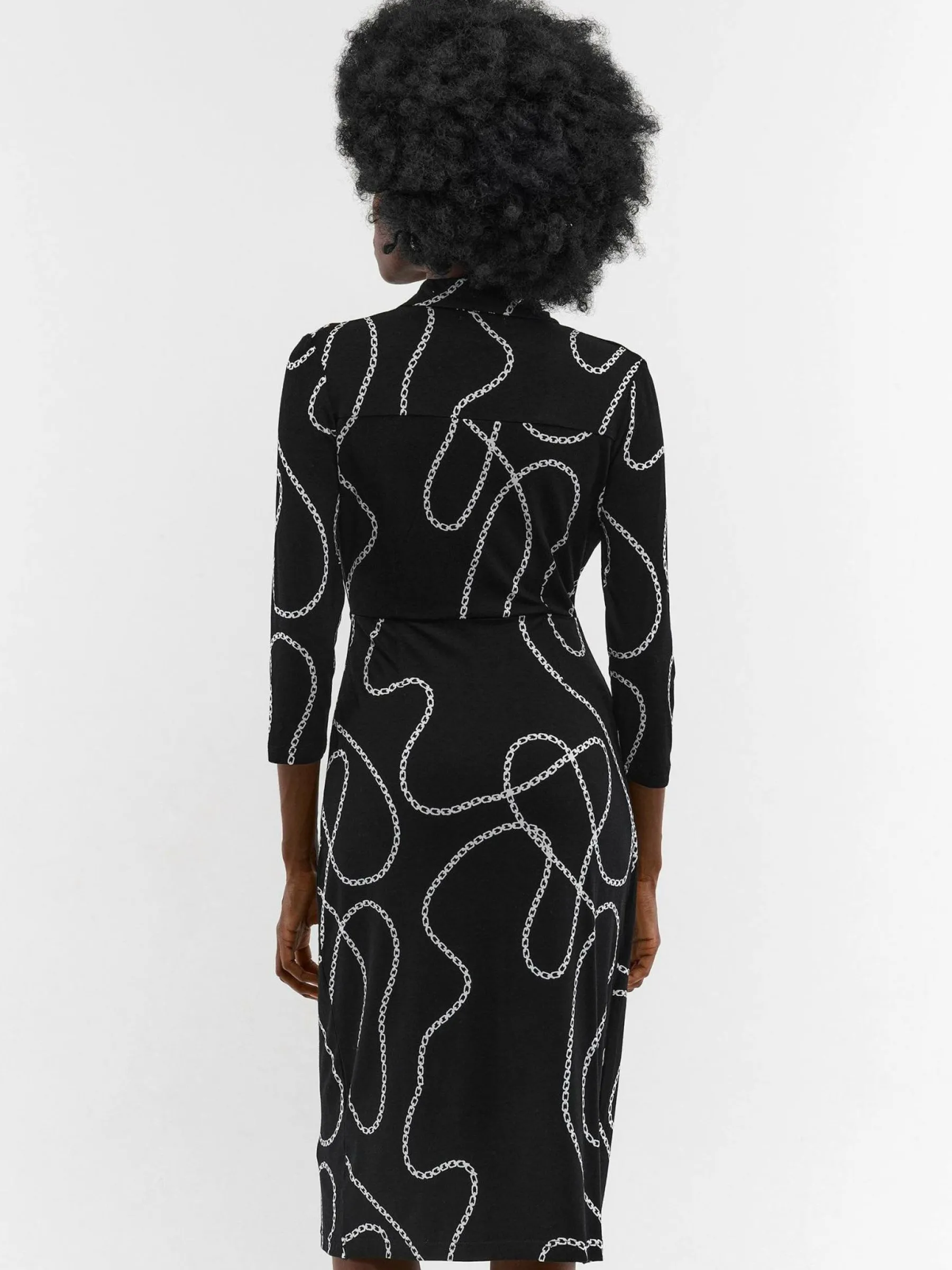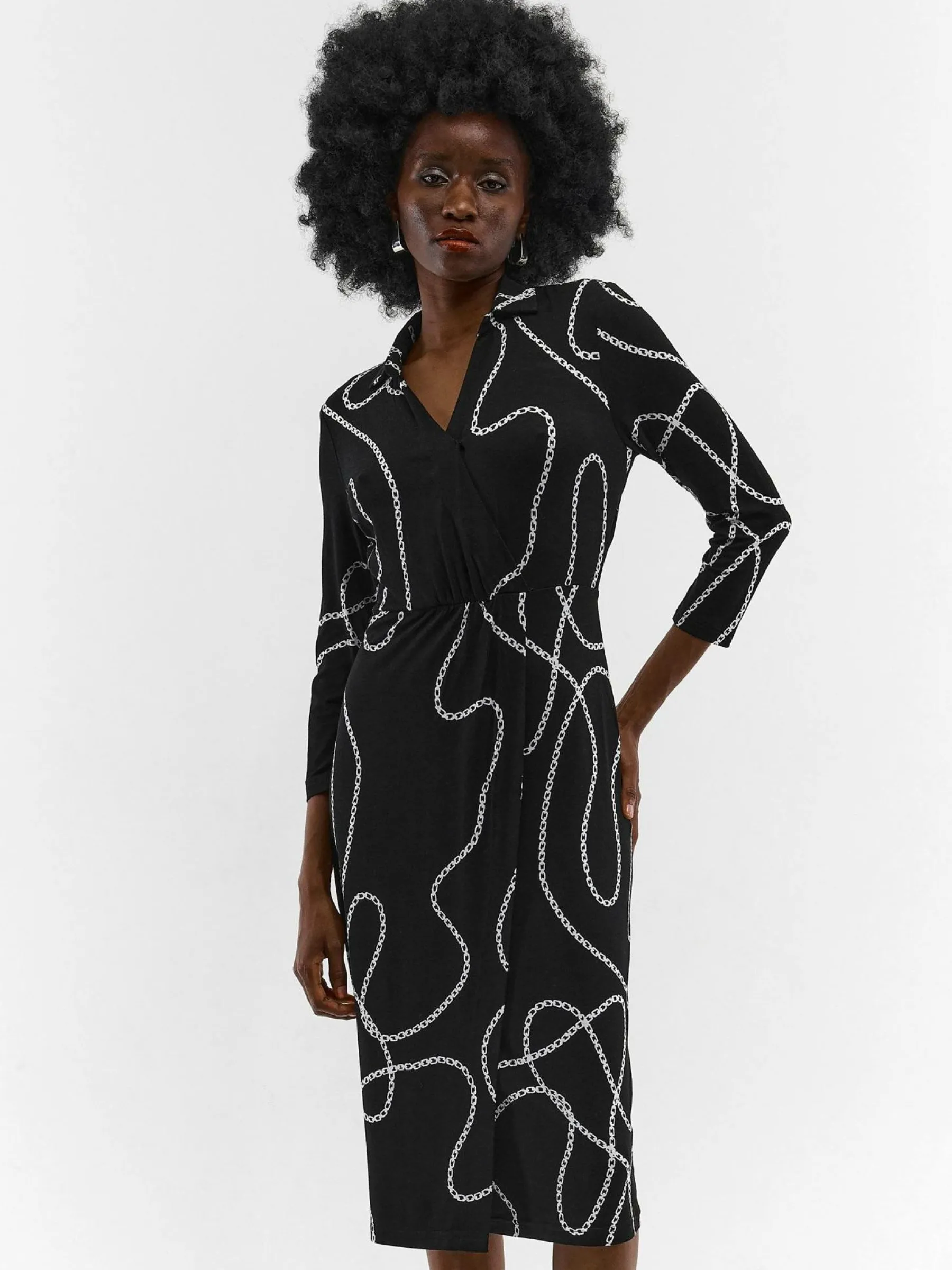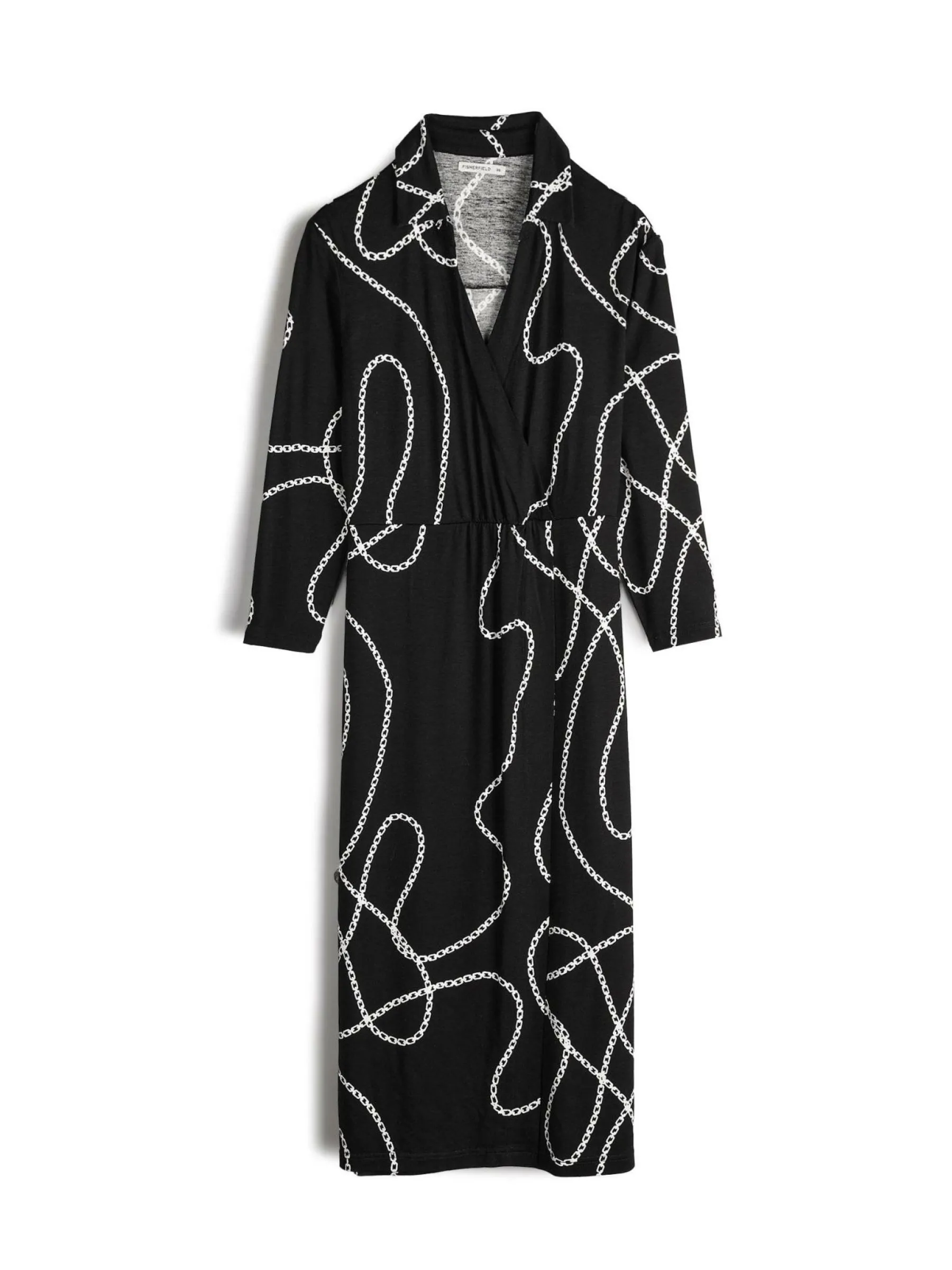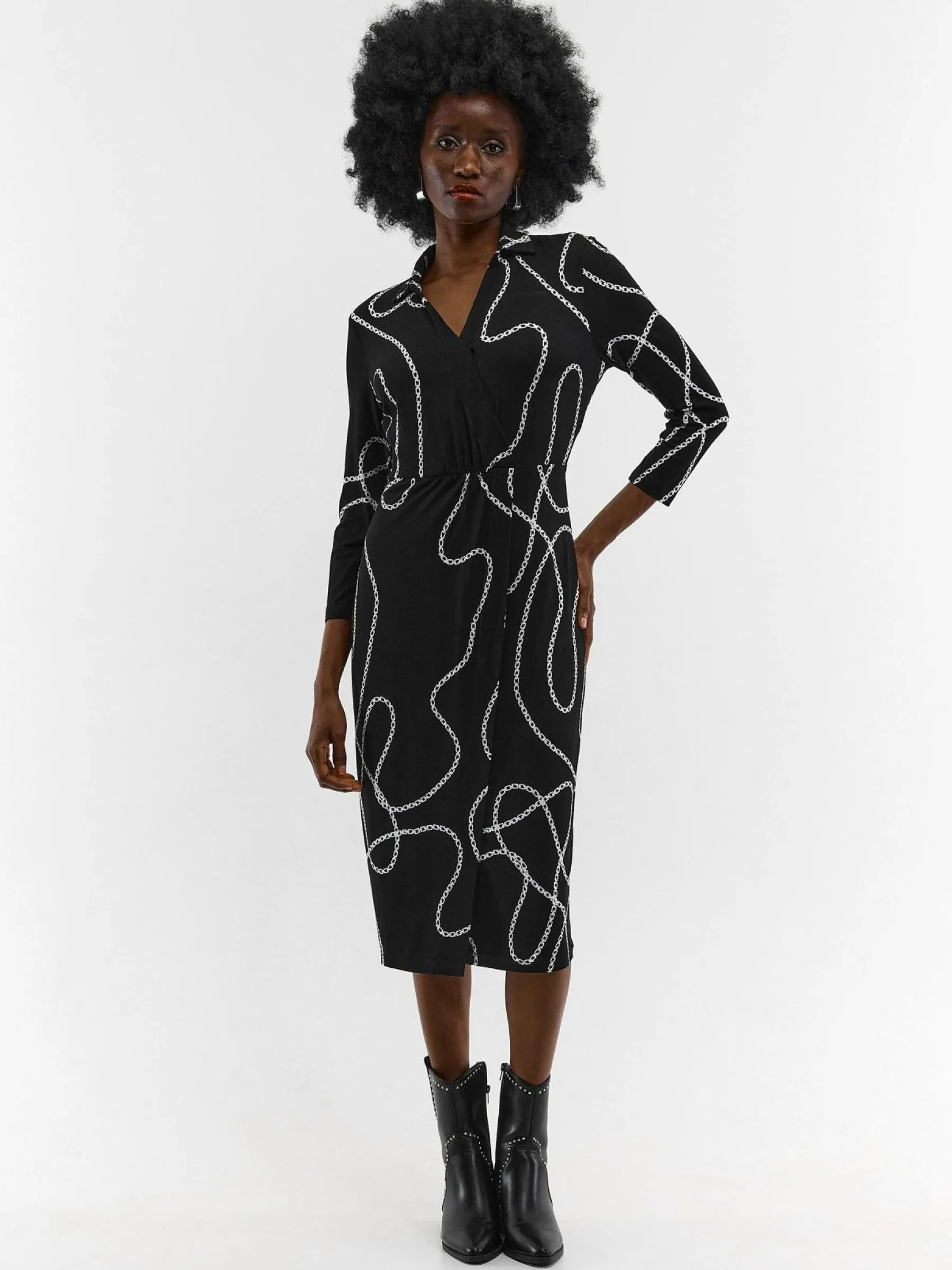 Kolor: czarnyKrój: kopertówkiTyp: sukienkaRekaw: rękaw 3/4Długość: midiPattern style: z nadrukiemDetal: v-neck, na…