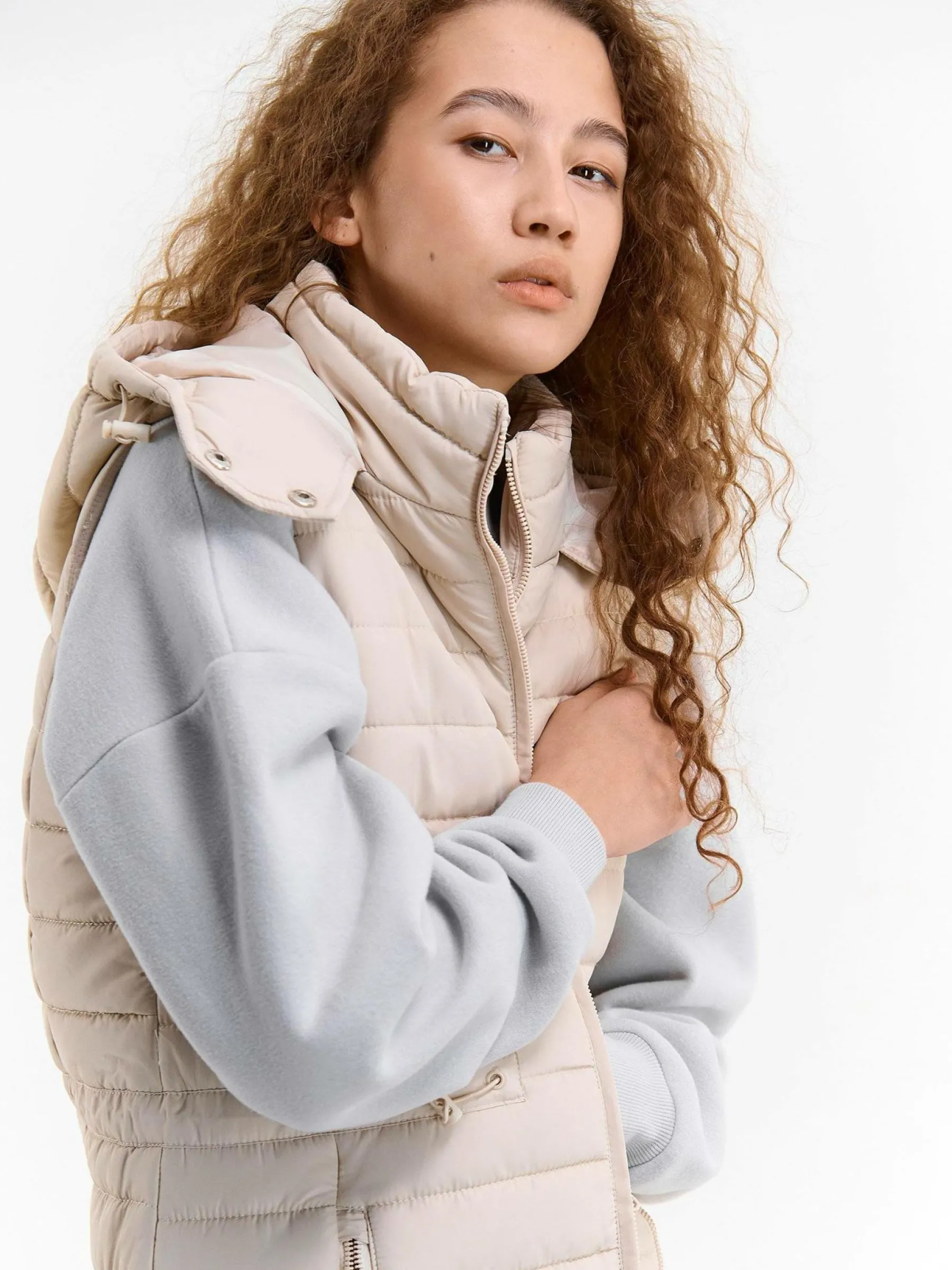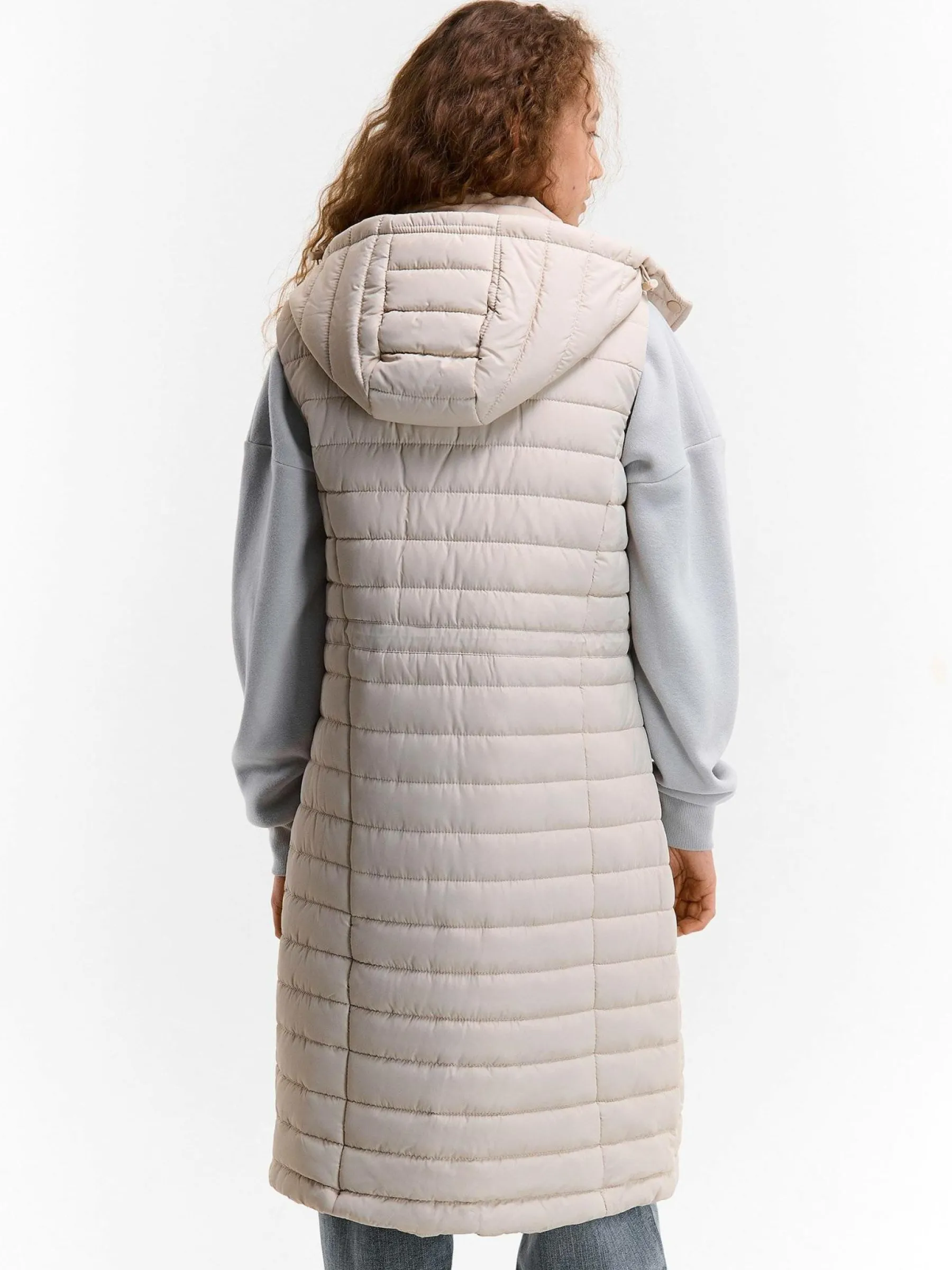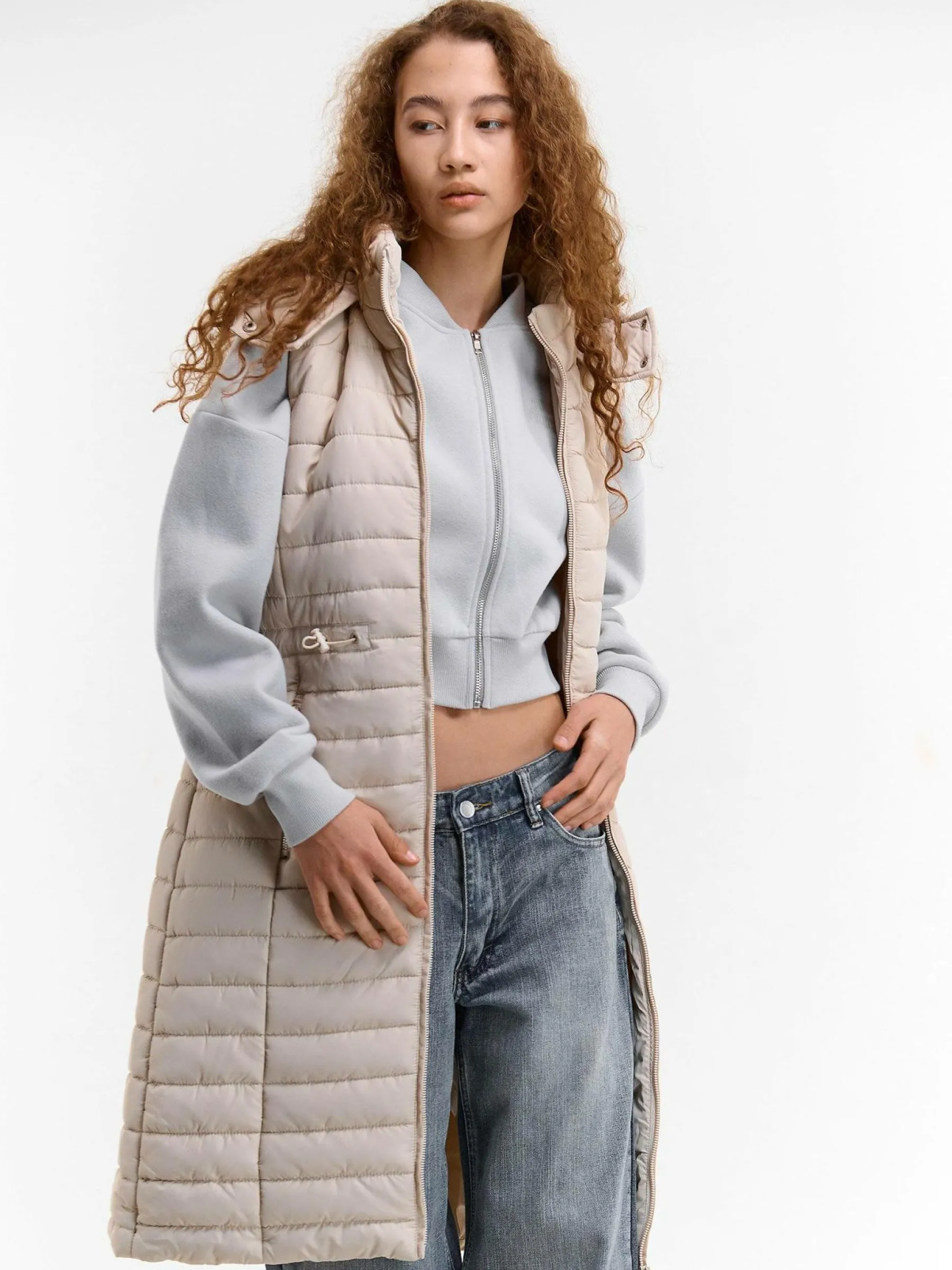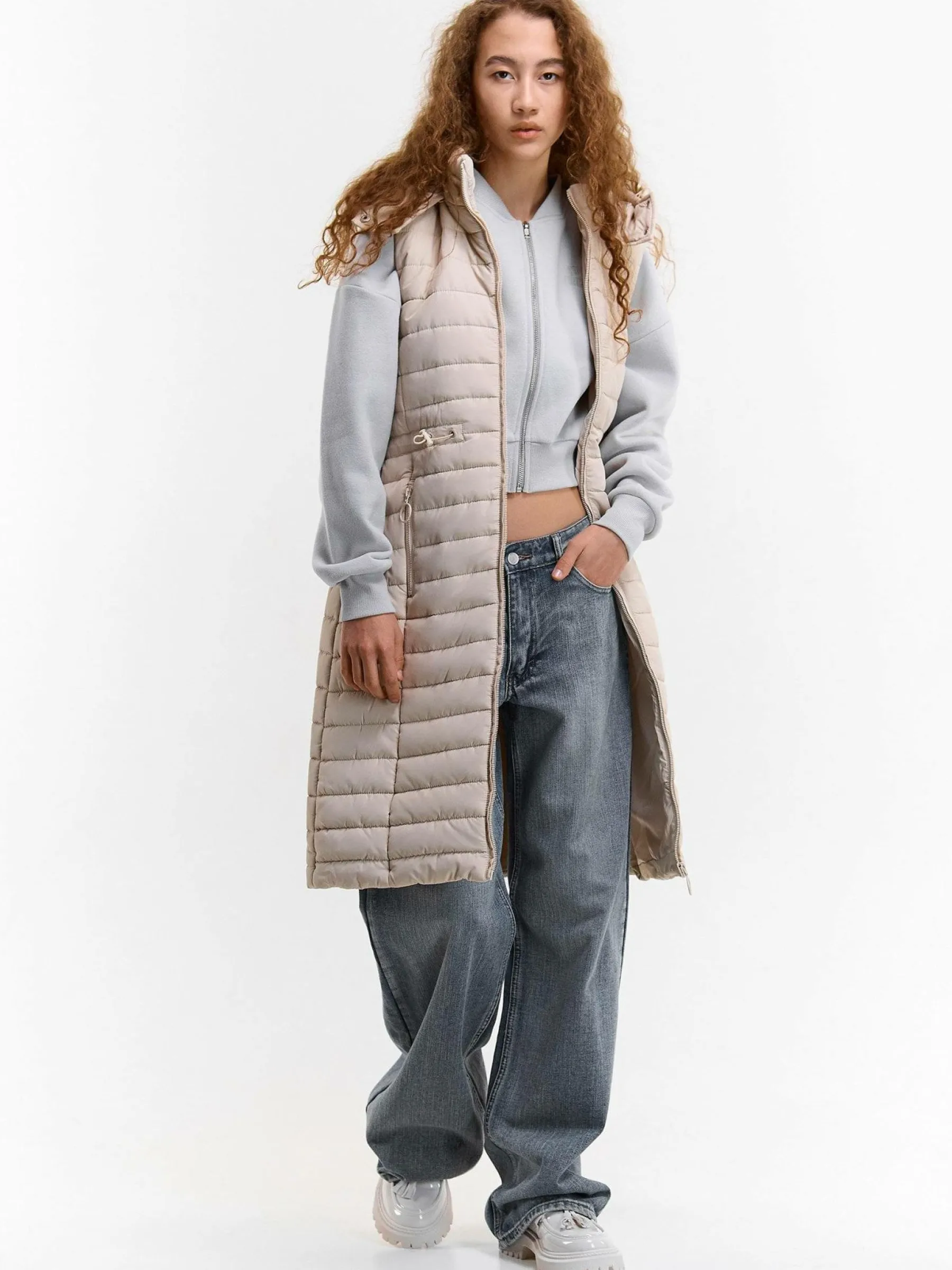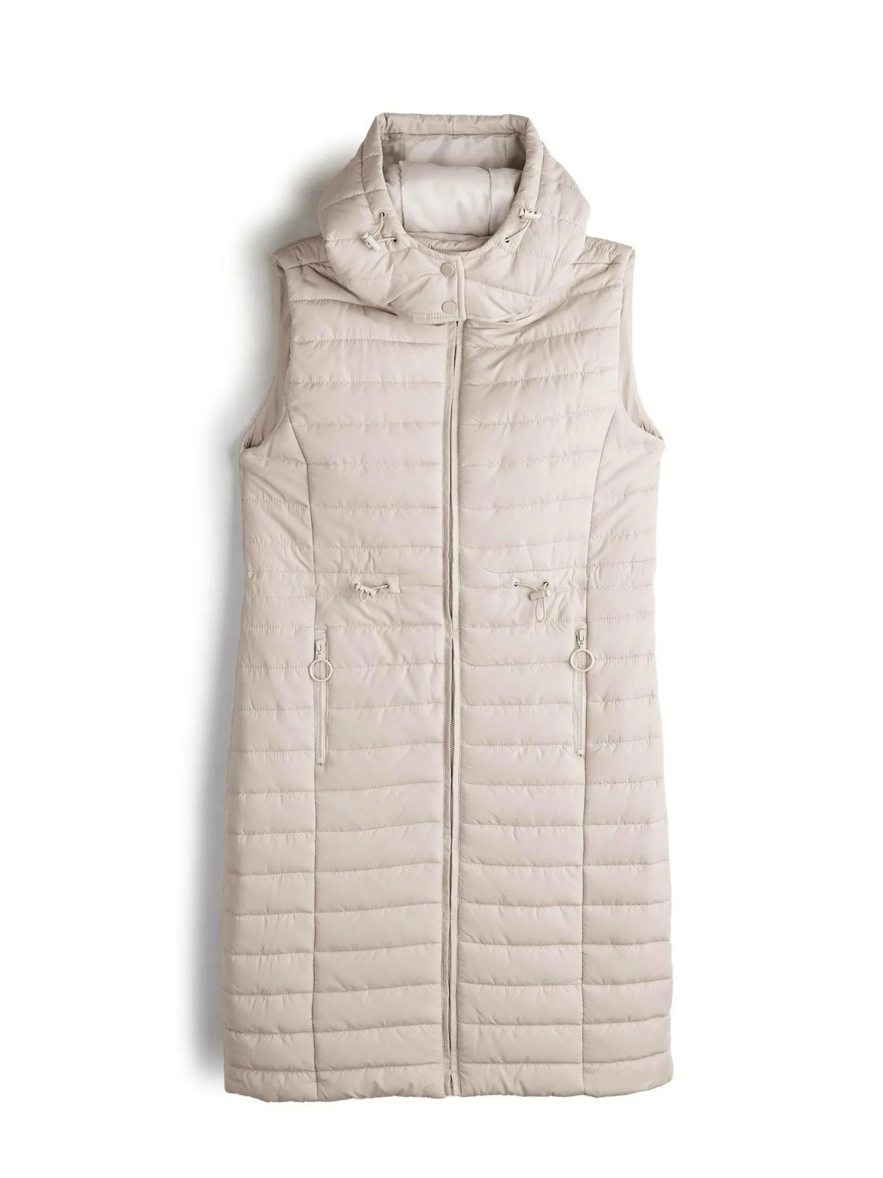 Kolor: beżowyKrój: pikowaneTyp: zimowa/przejściowa kamizelkaRekaw: bez rękawówDługość: dlugiePattern style: poje…