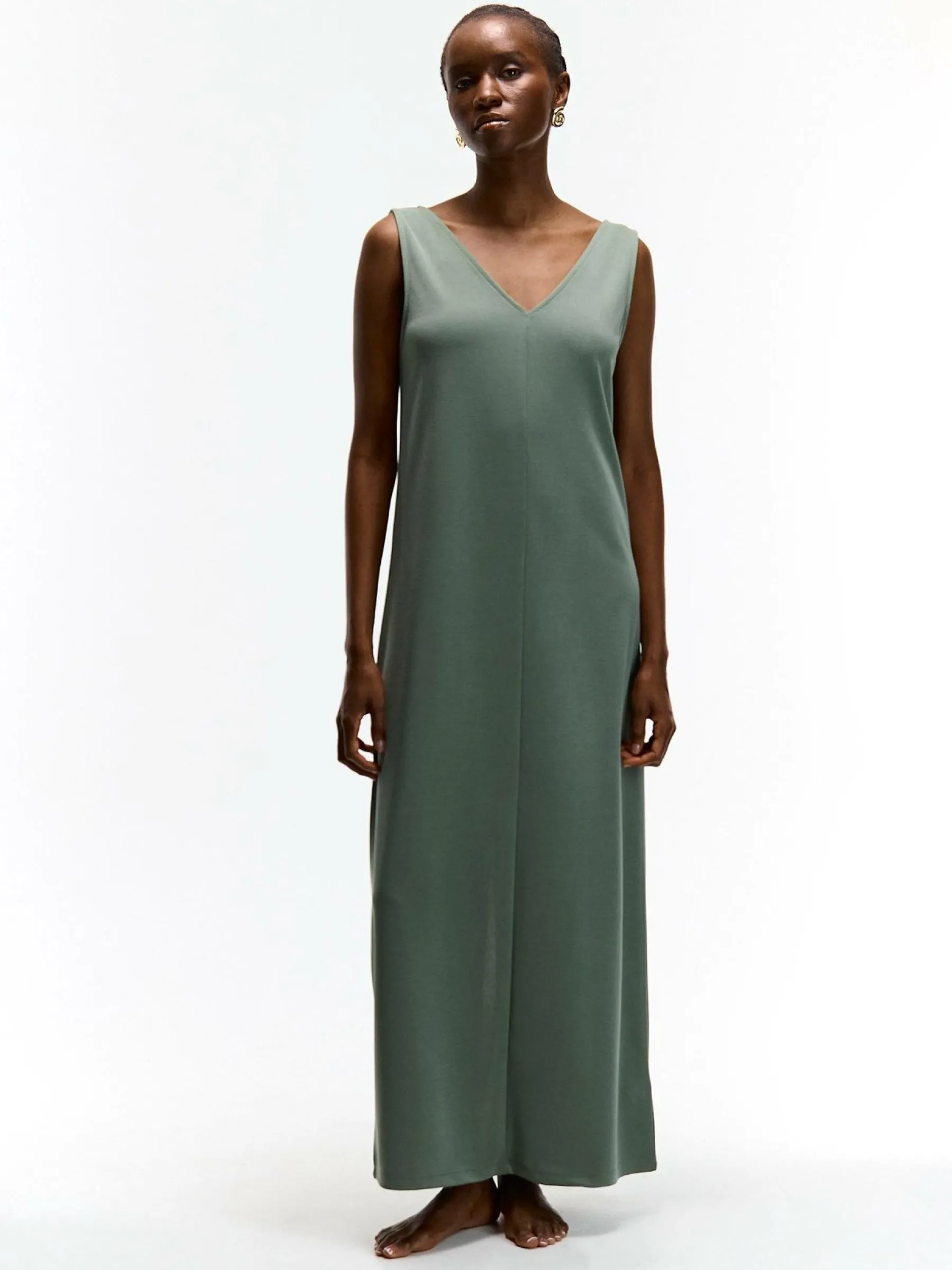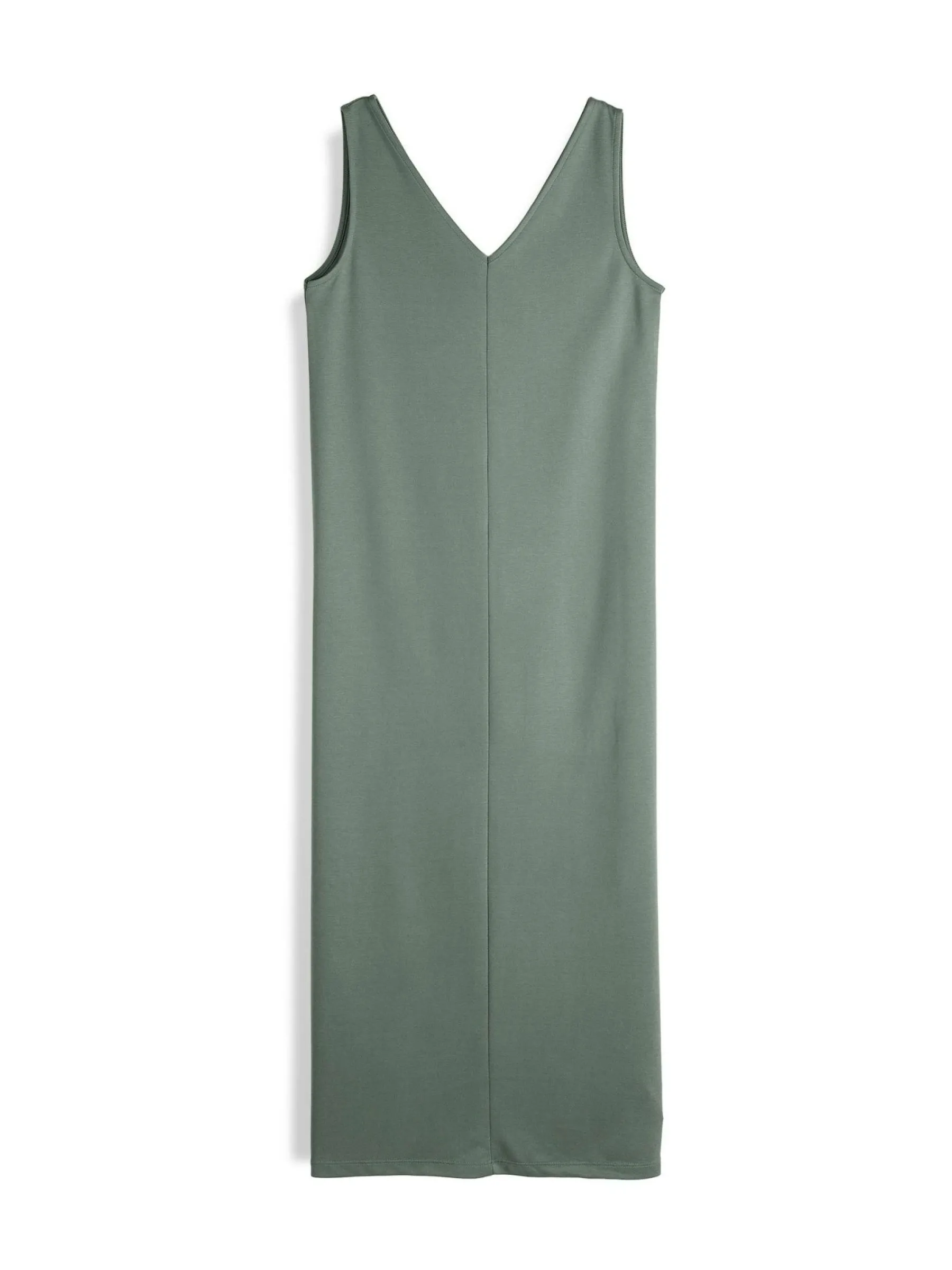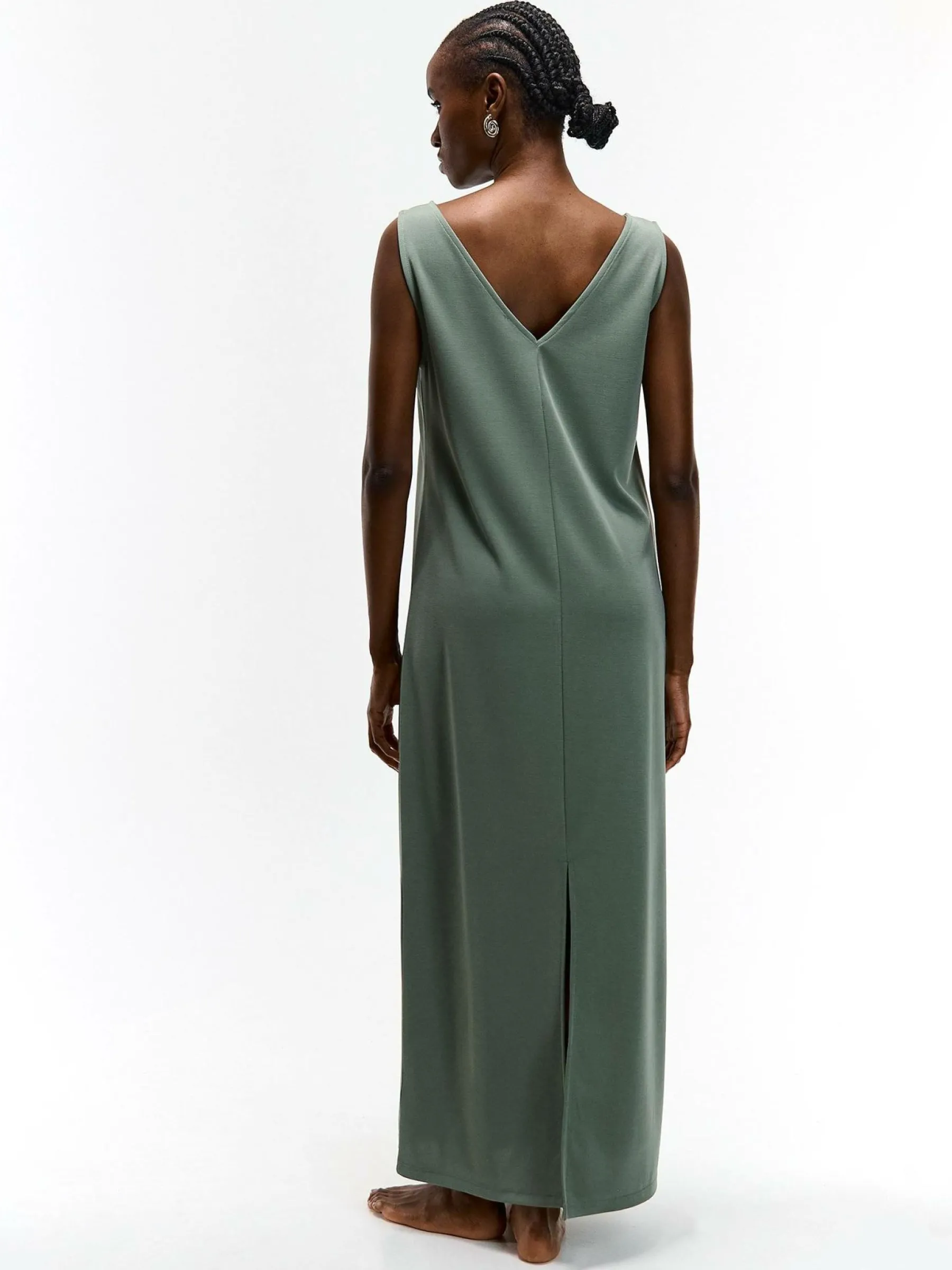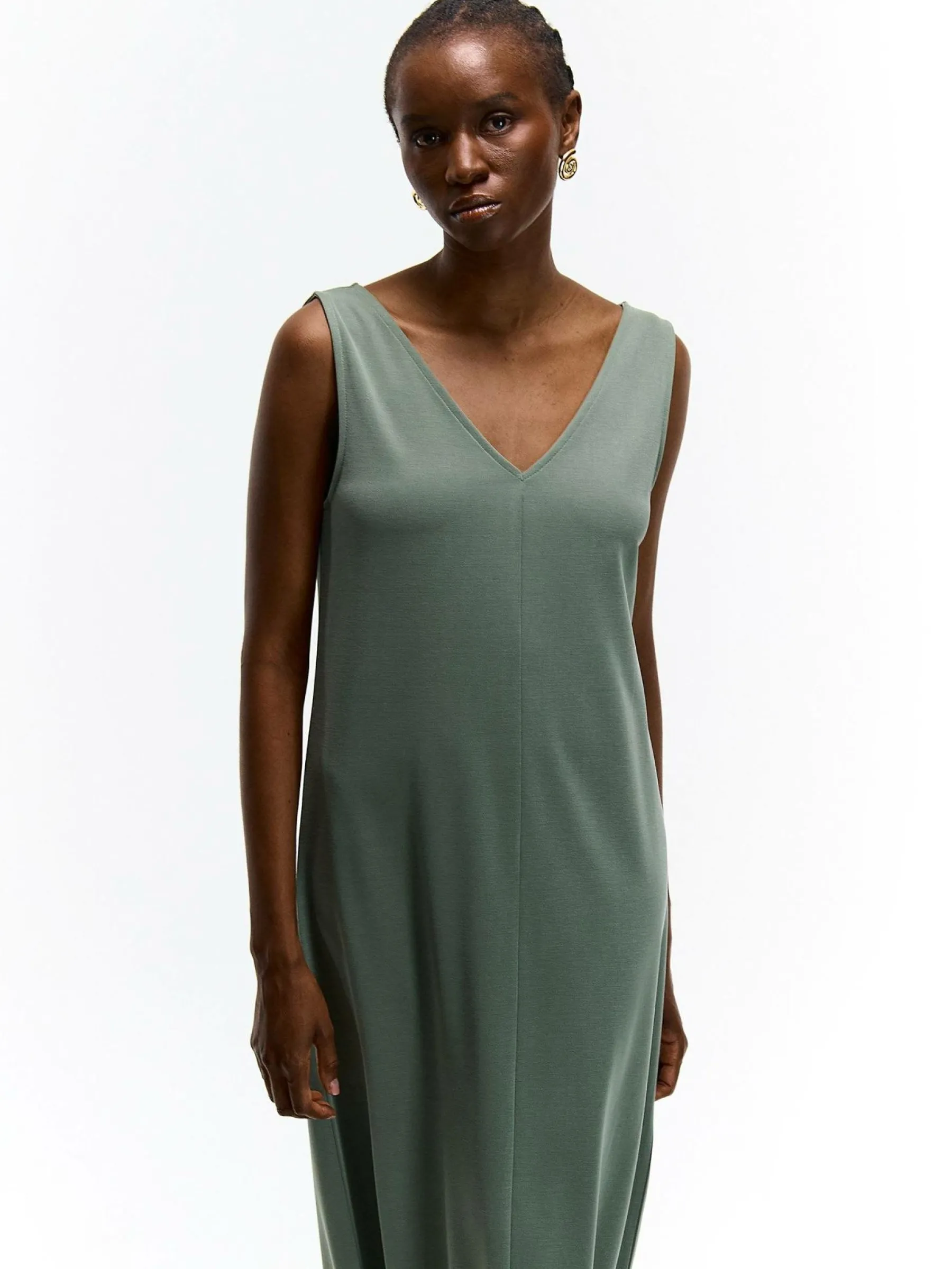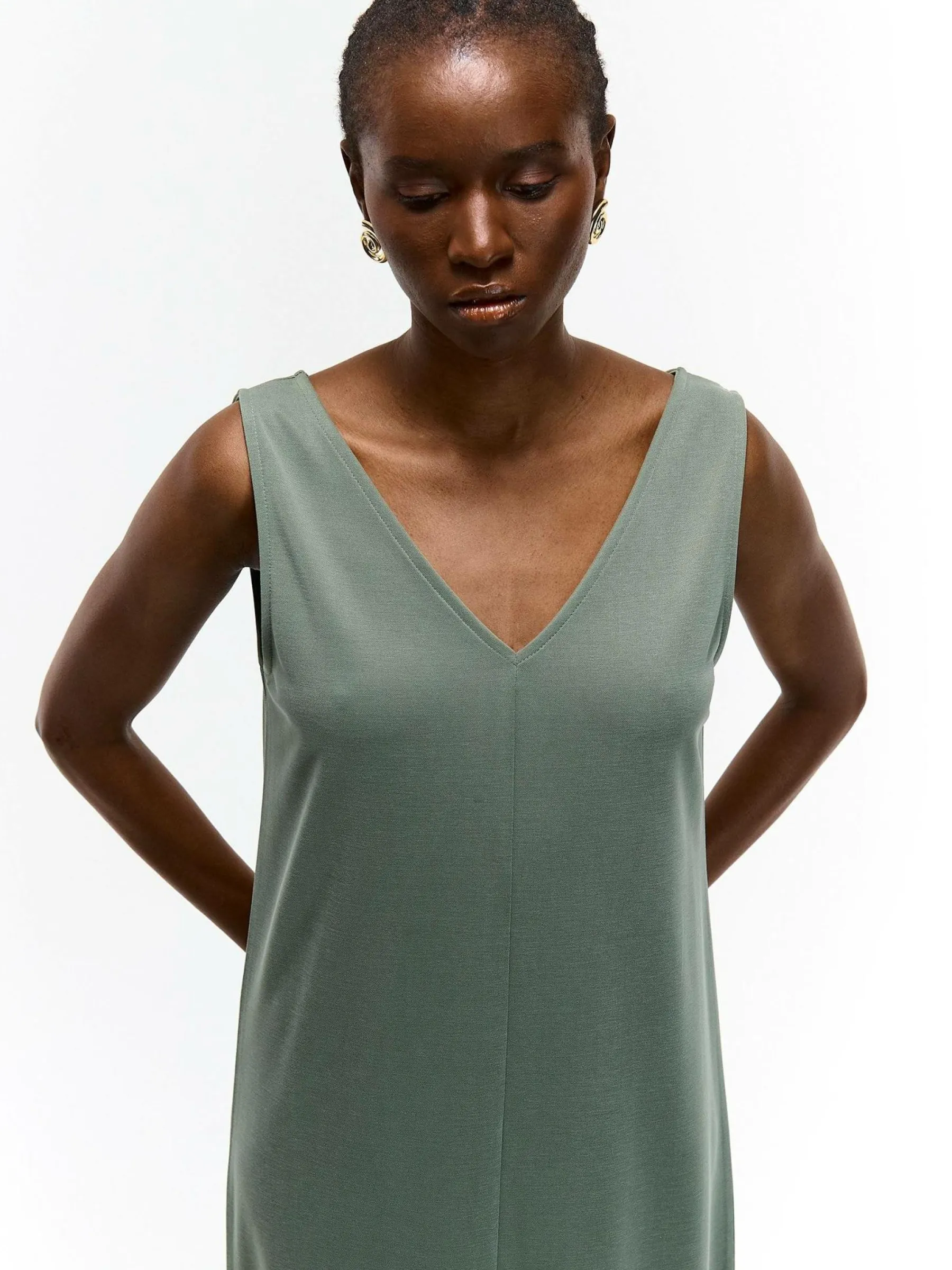 Kolor: khakiKrój: regularTyp: sukienkaRekaw: bez rękawówDługość: midiPattern style: pojedynczy kolorDetal: v-neck,…