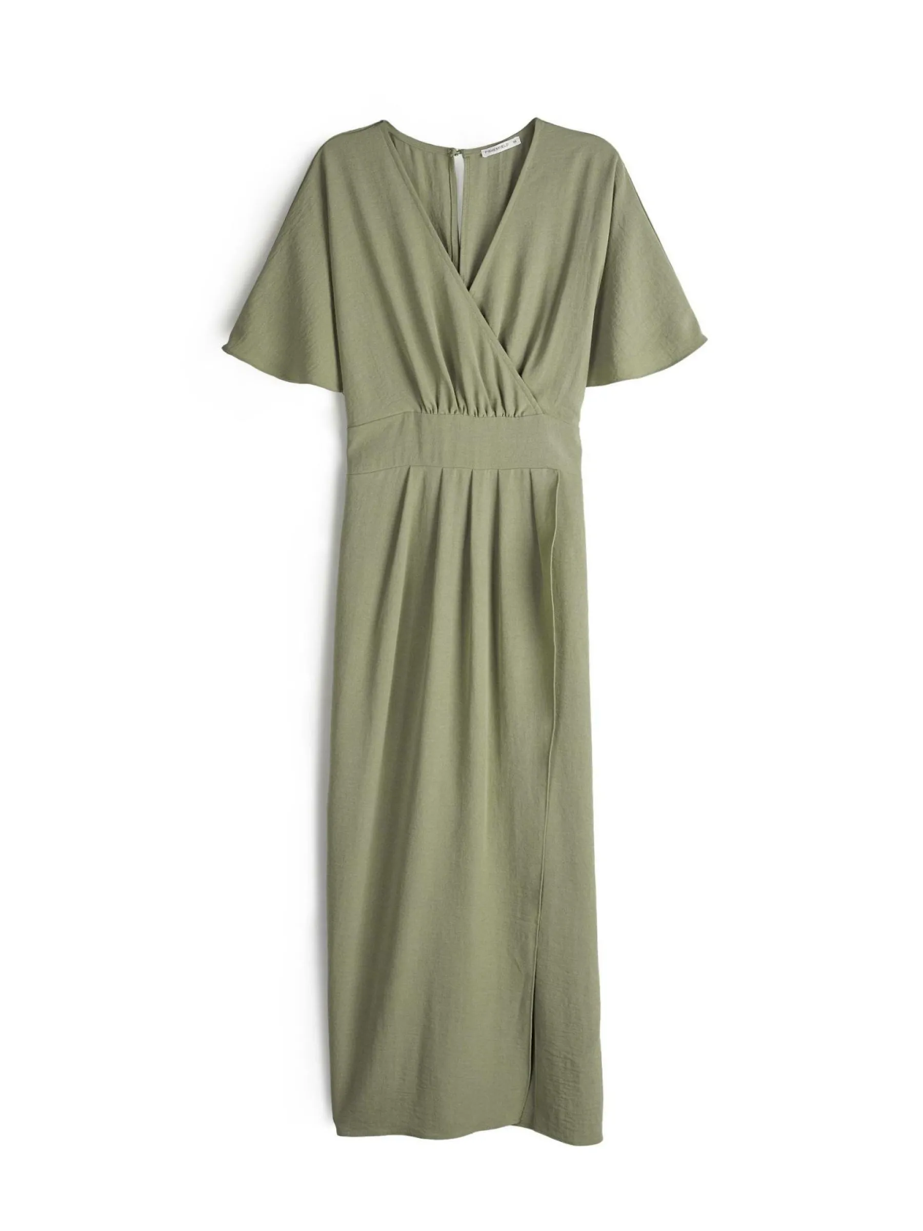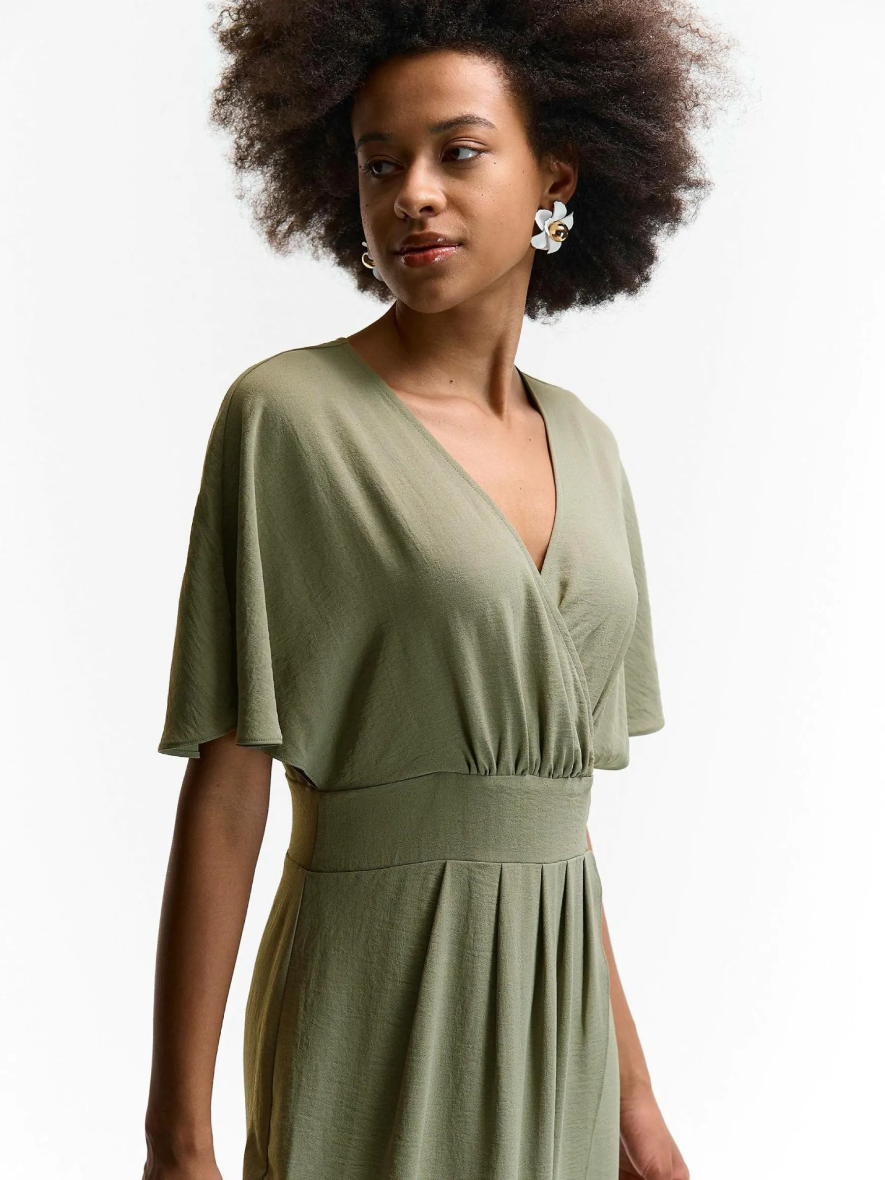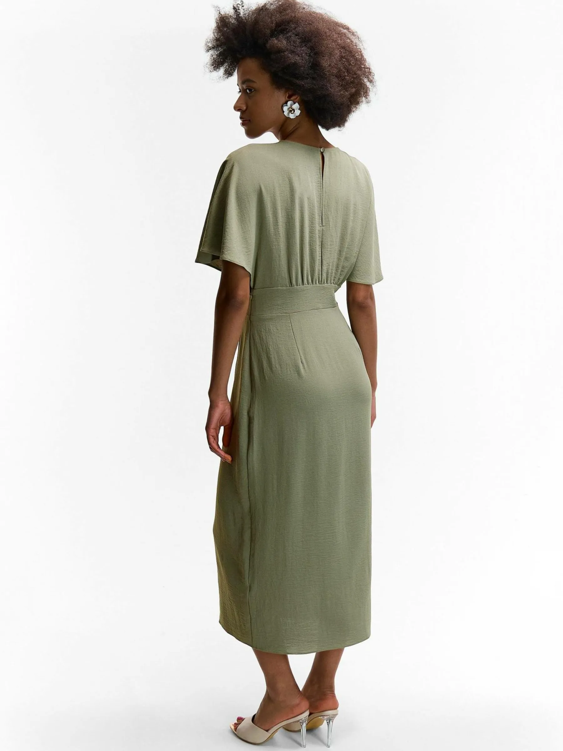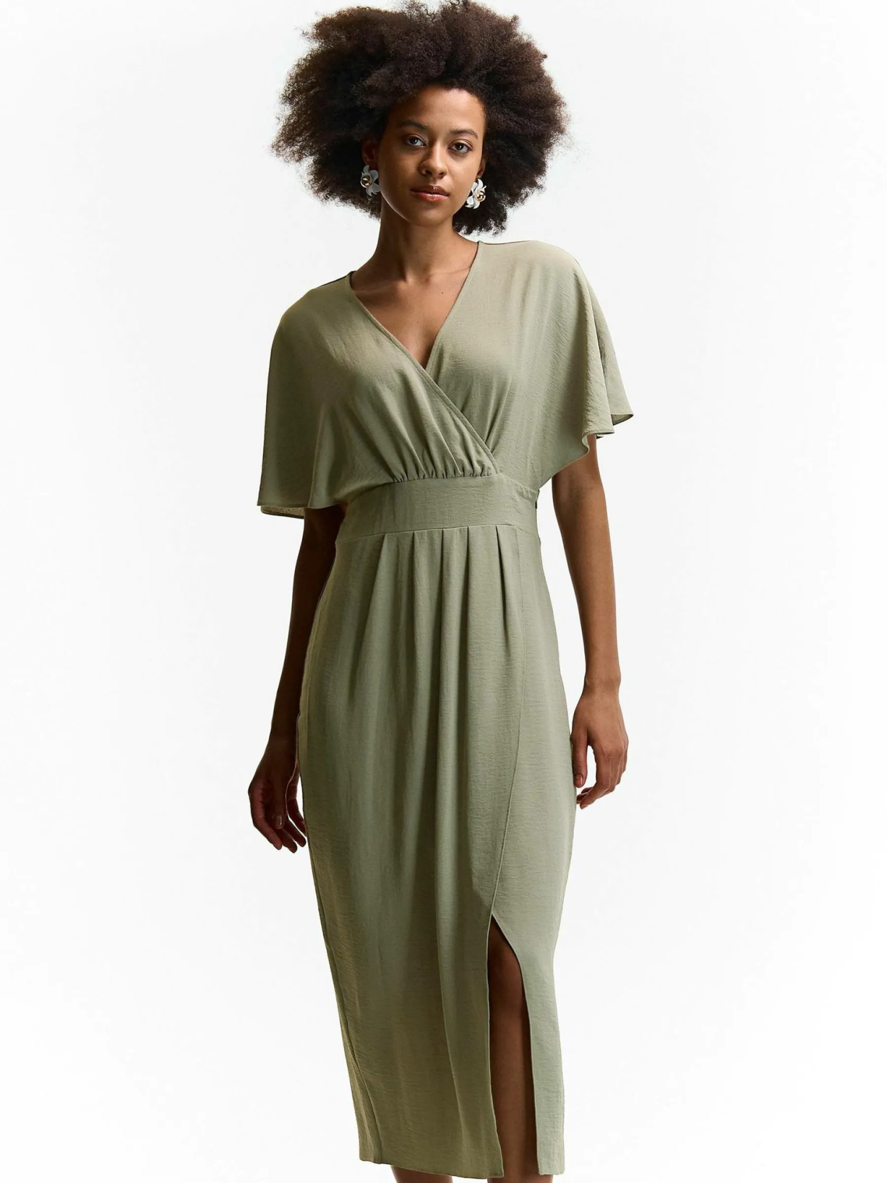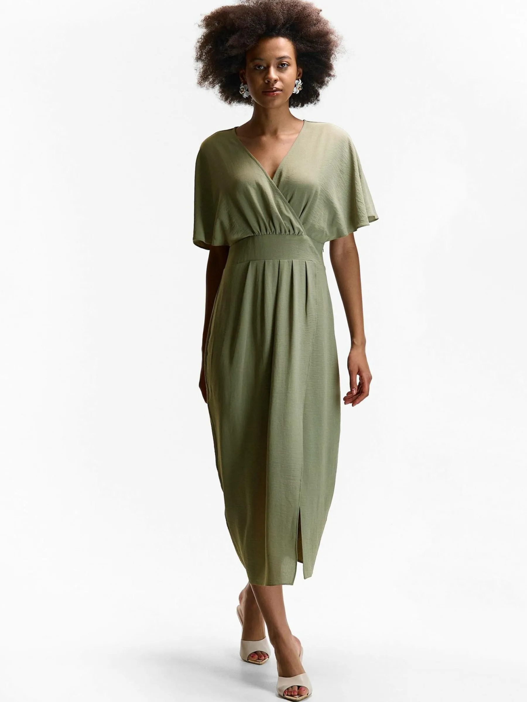 Kolor: zielonyKrój: kopertówkiTyp: sukienkaRekaw: krótki rękawDługość: midiPattern style: pojedynczy kolorDetal: …