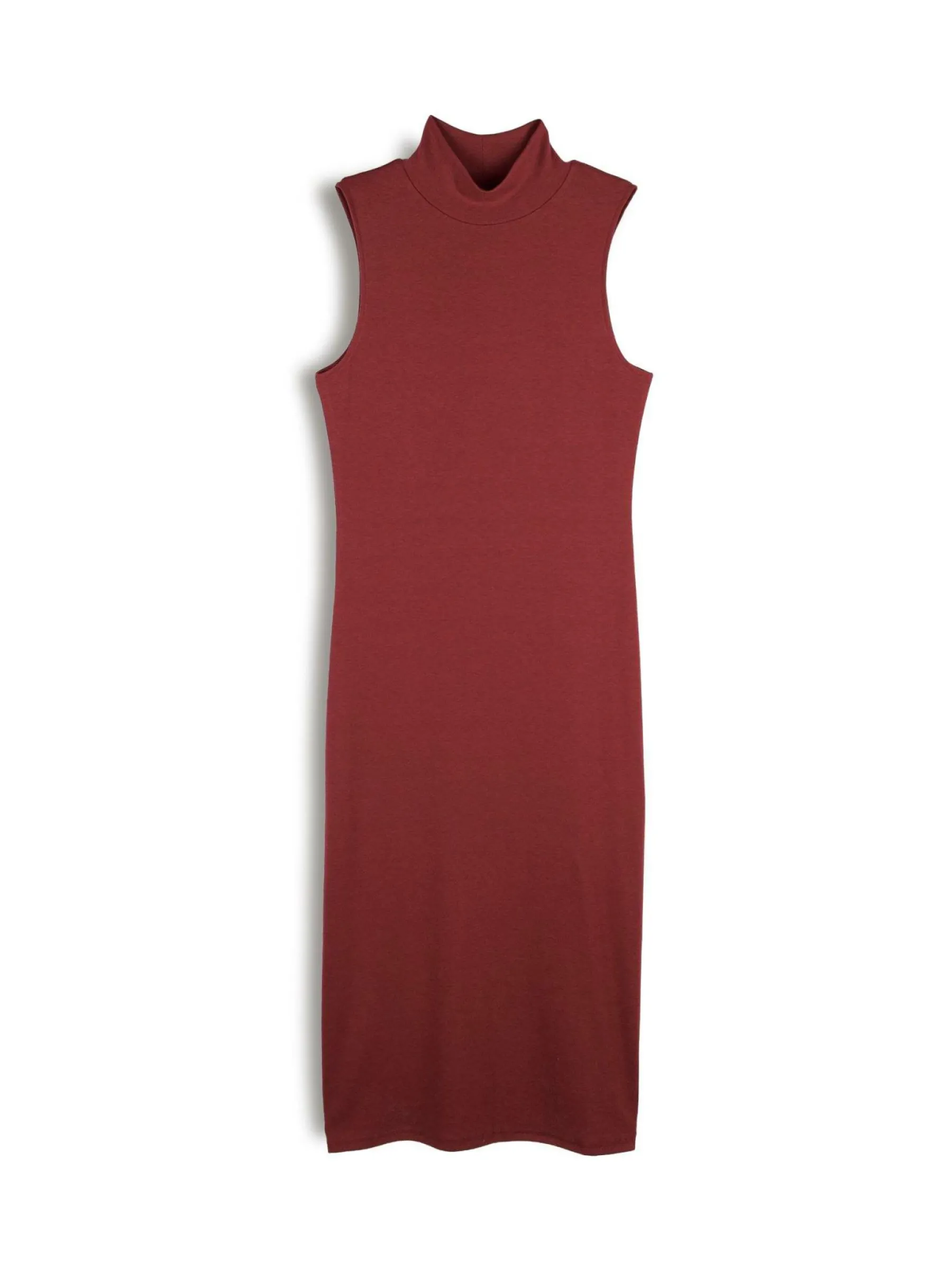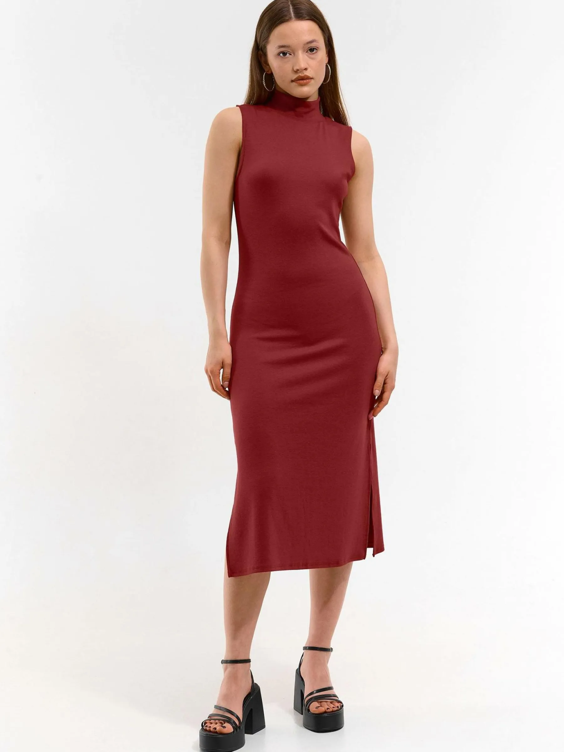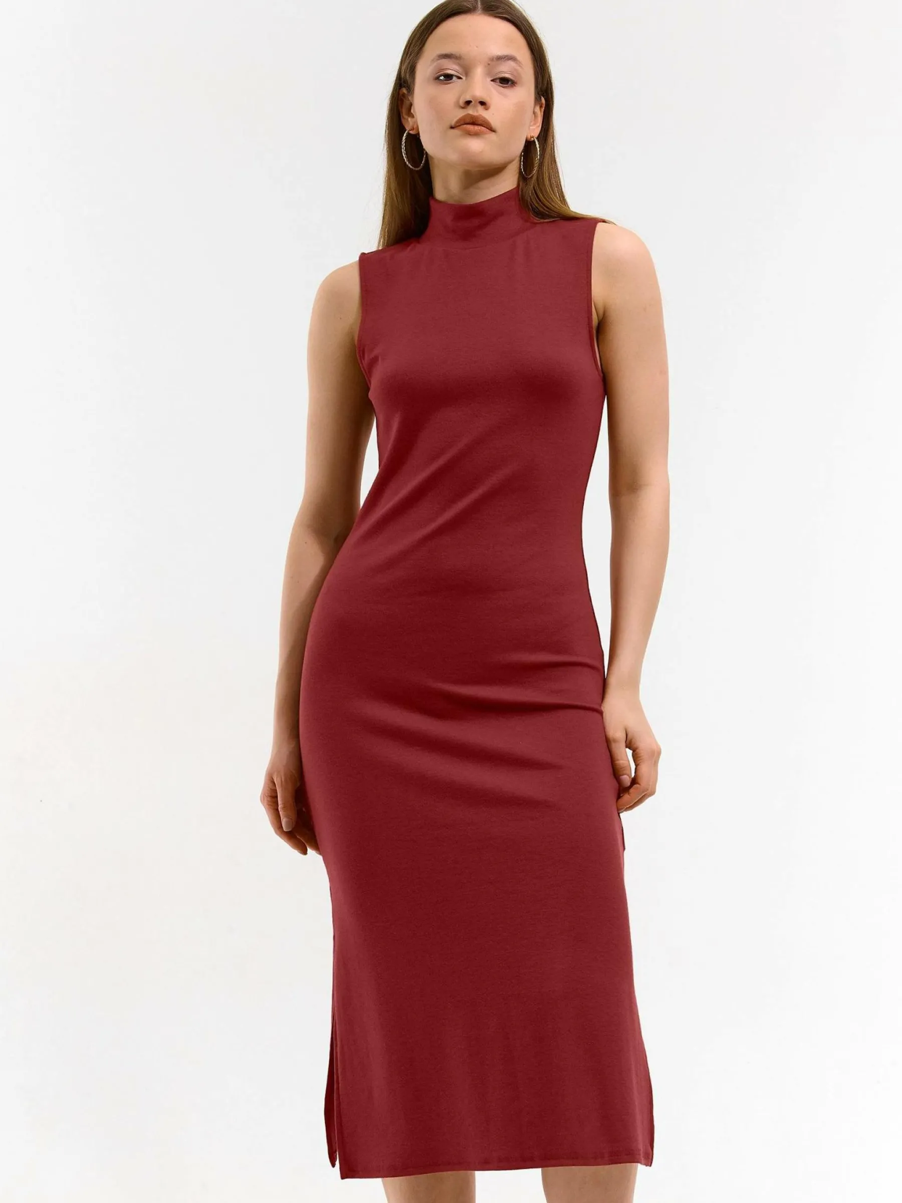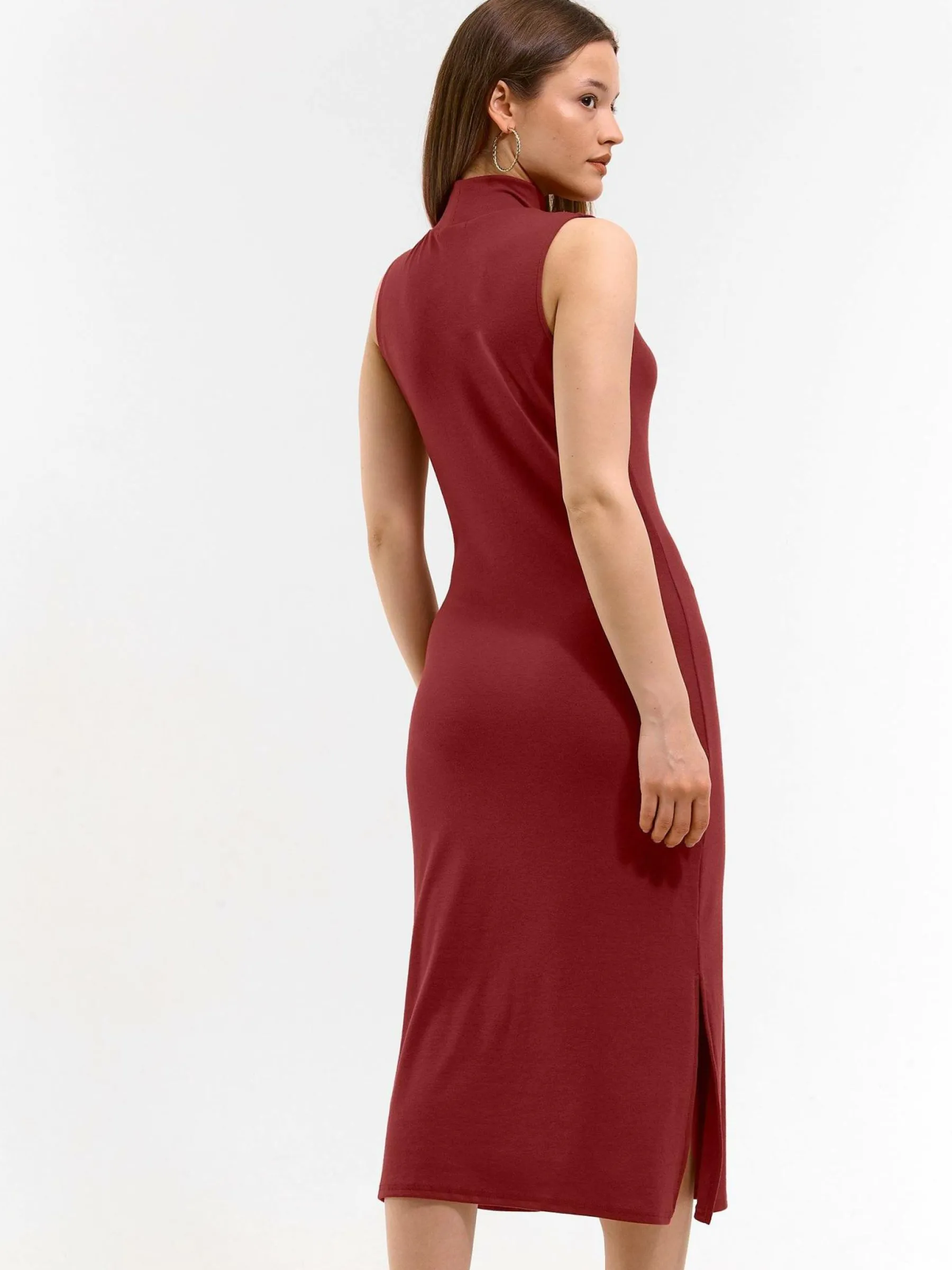 Kolor: burgundyKrój: ołówkoweTyp: sukienkaRekaw: bez rękawówDługość: midiPattern style: pojedynczy kolorDetal: z…