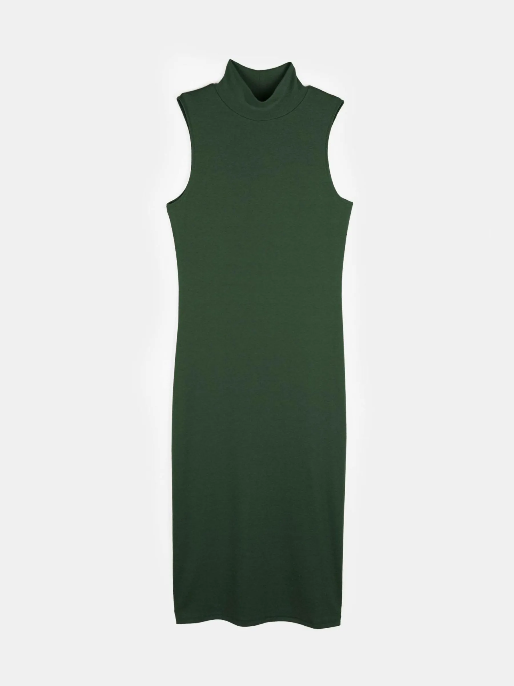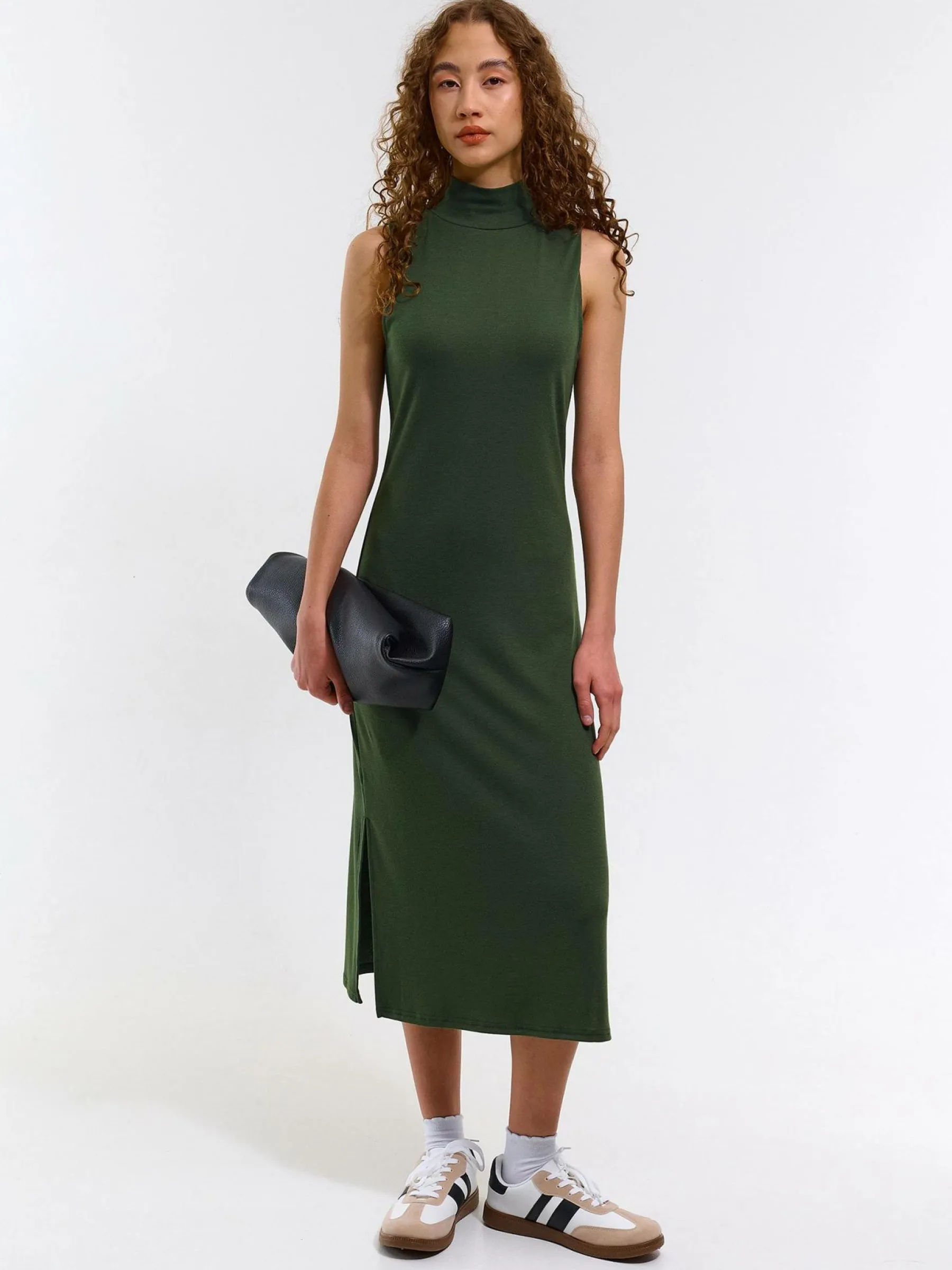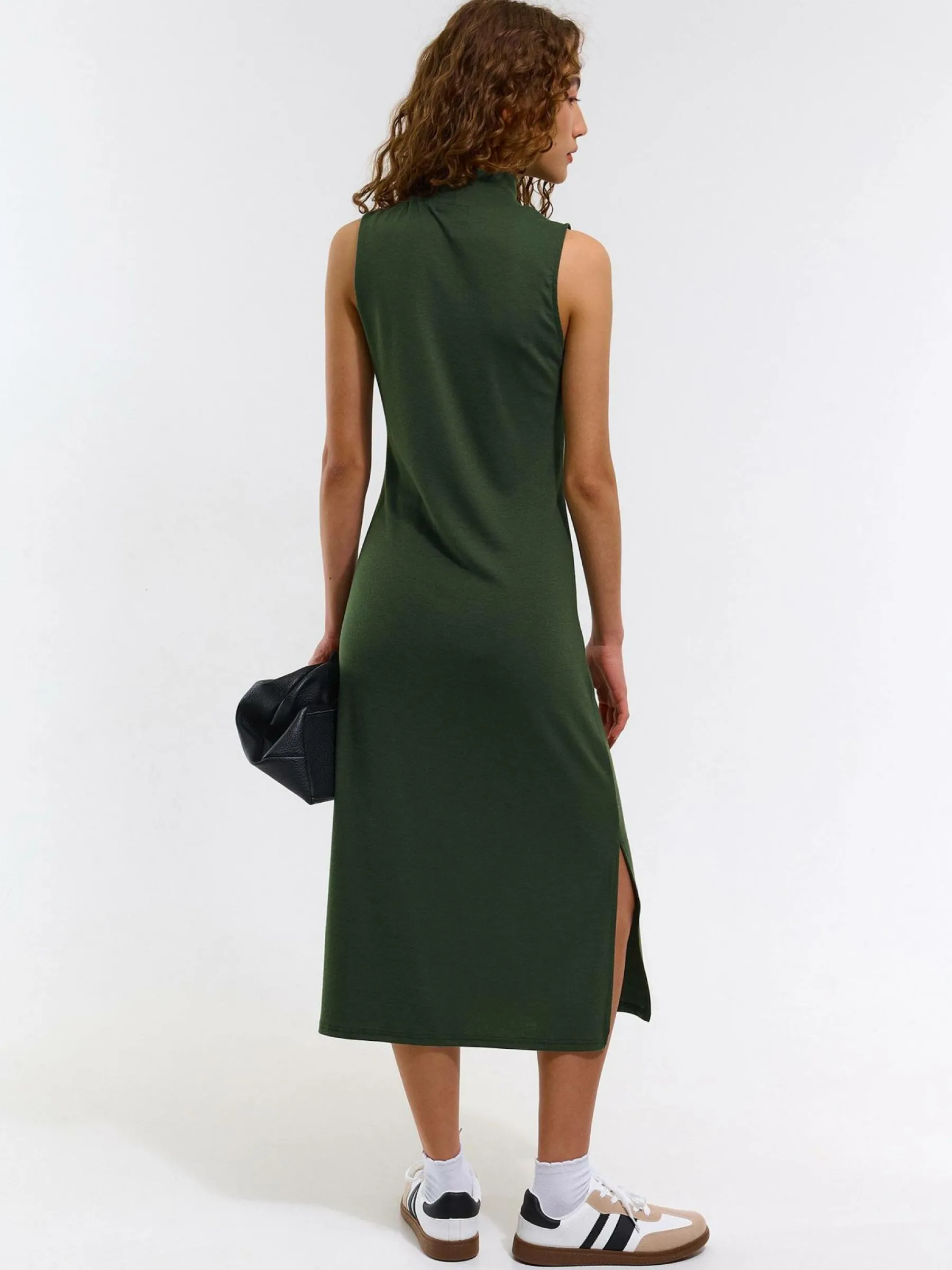 Kolor: khakiKrój: ołówkoweTyp: sukienkaRekaw: bez rękawówDługość: midiPattern style: pojedynczy kolorDetal: nad …