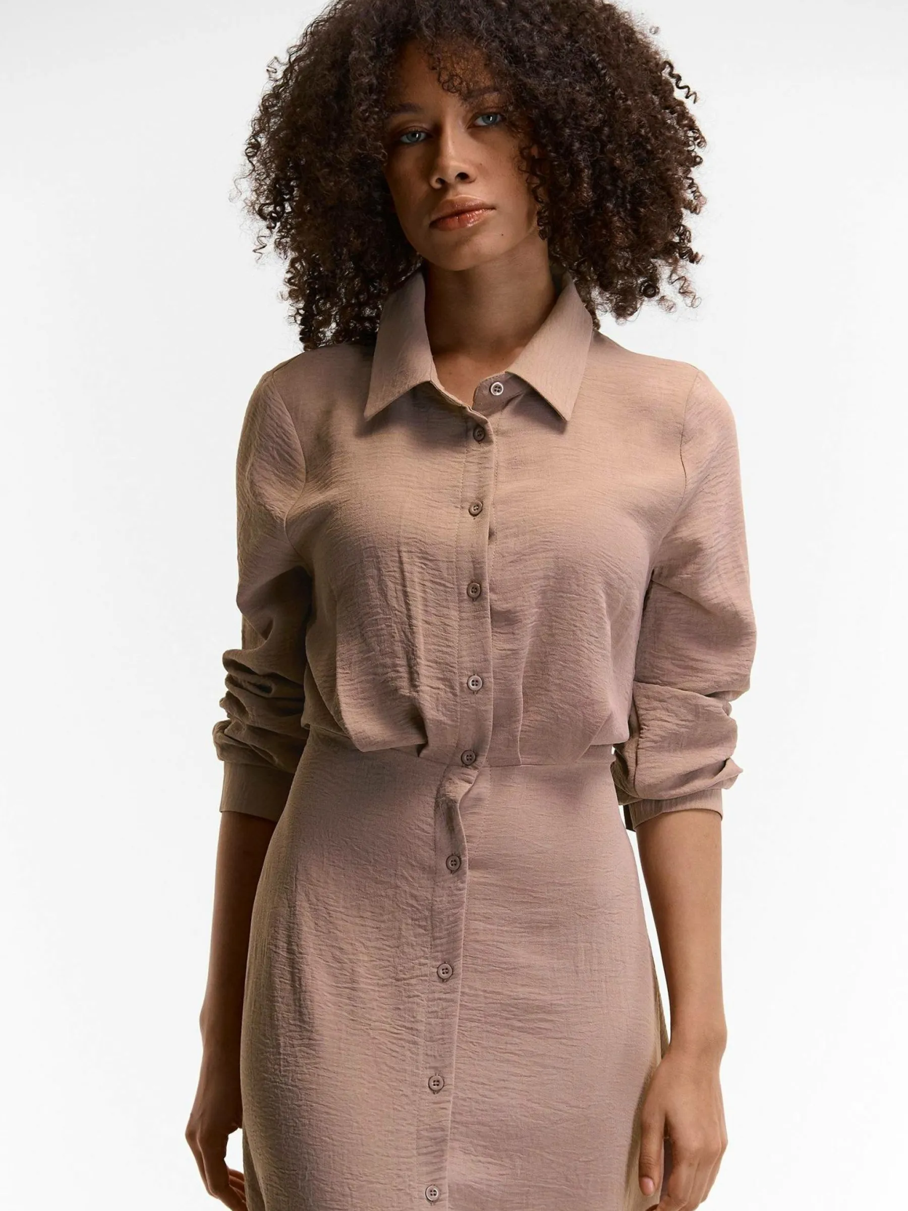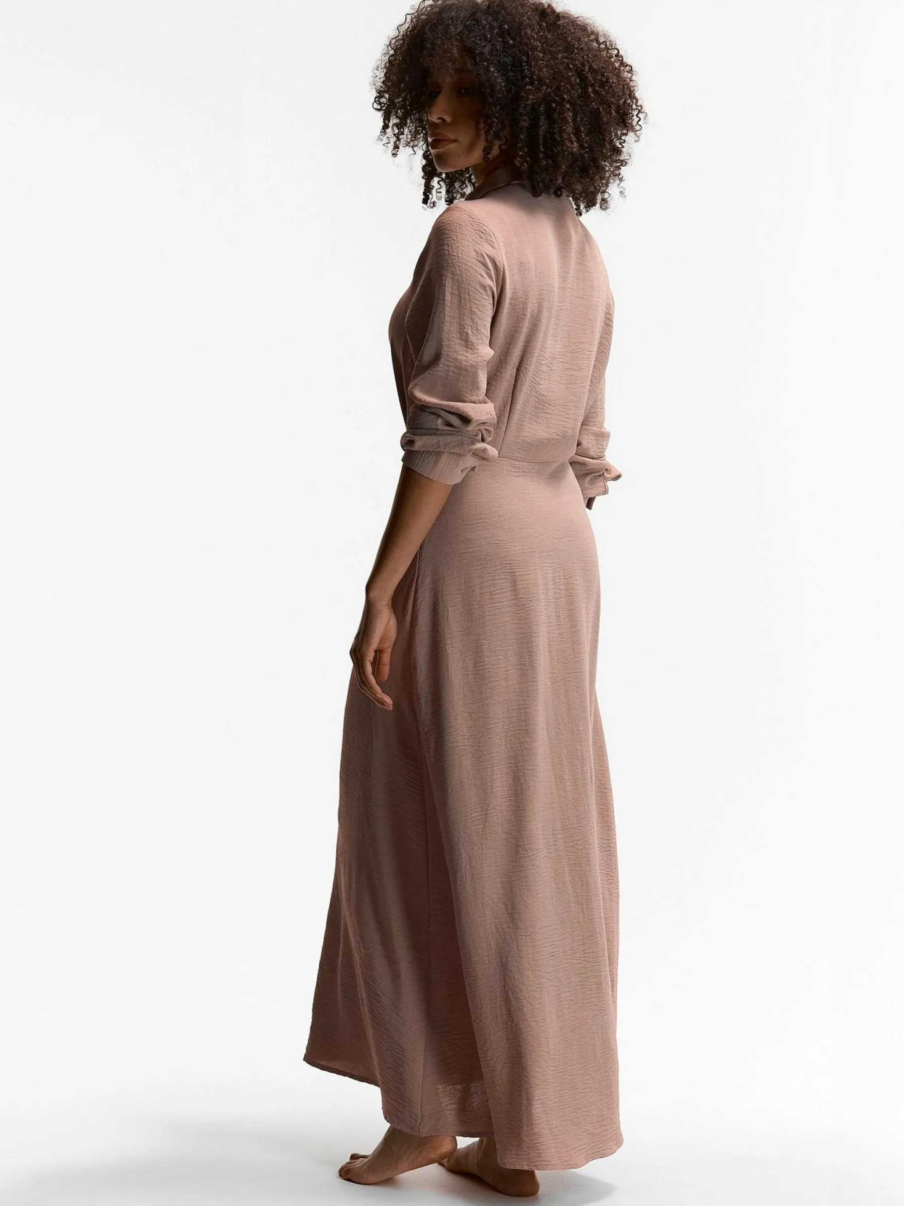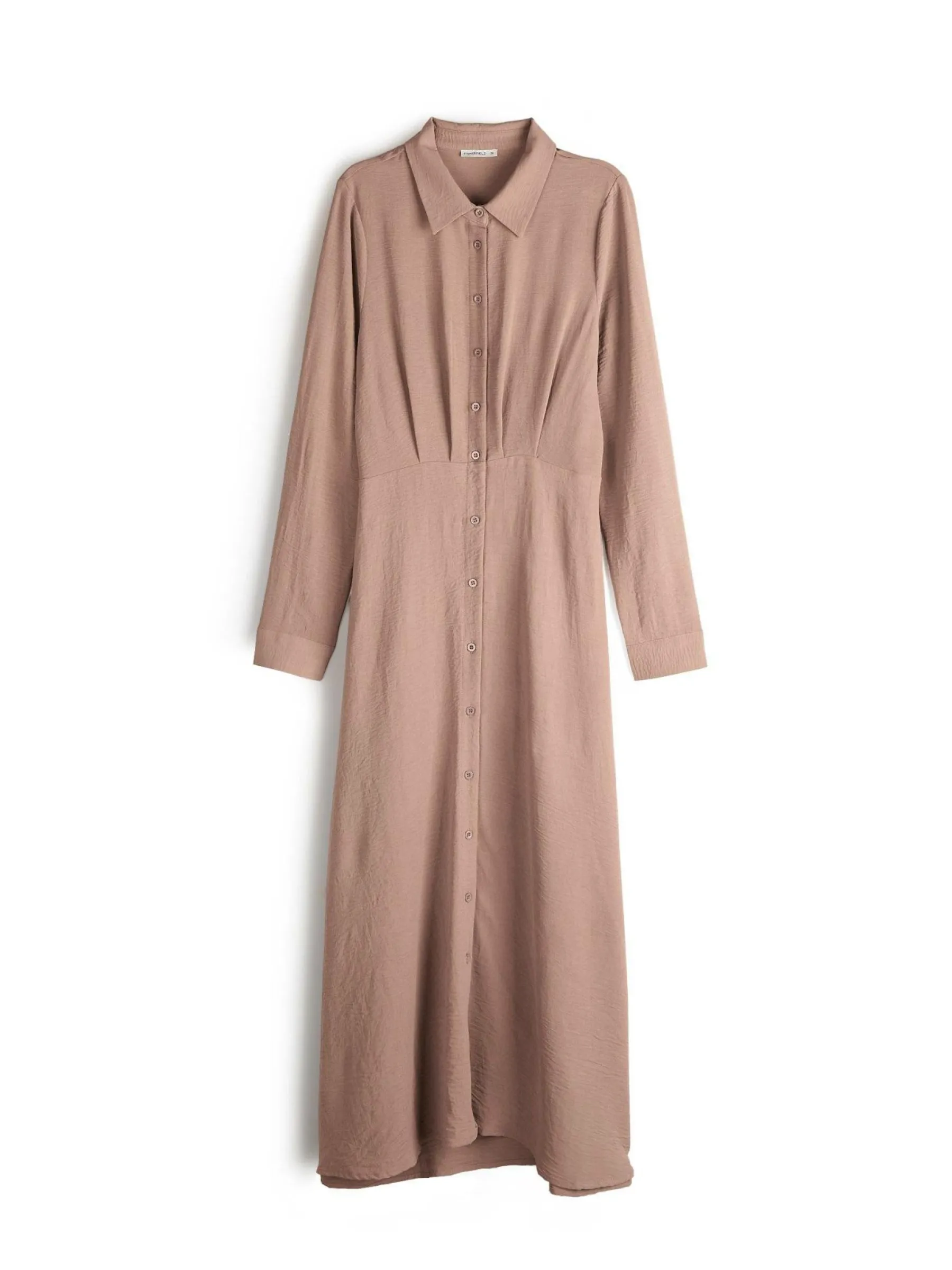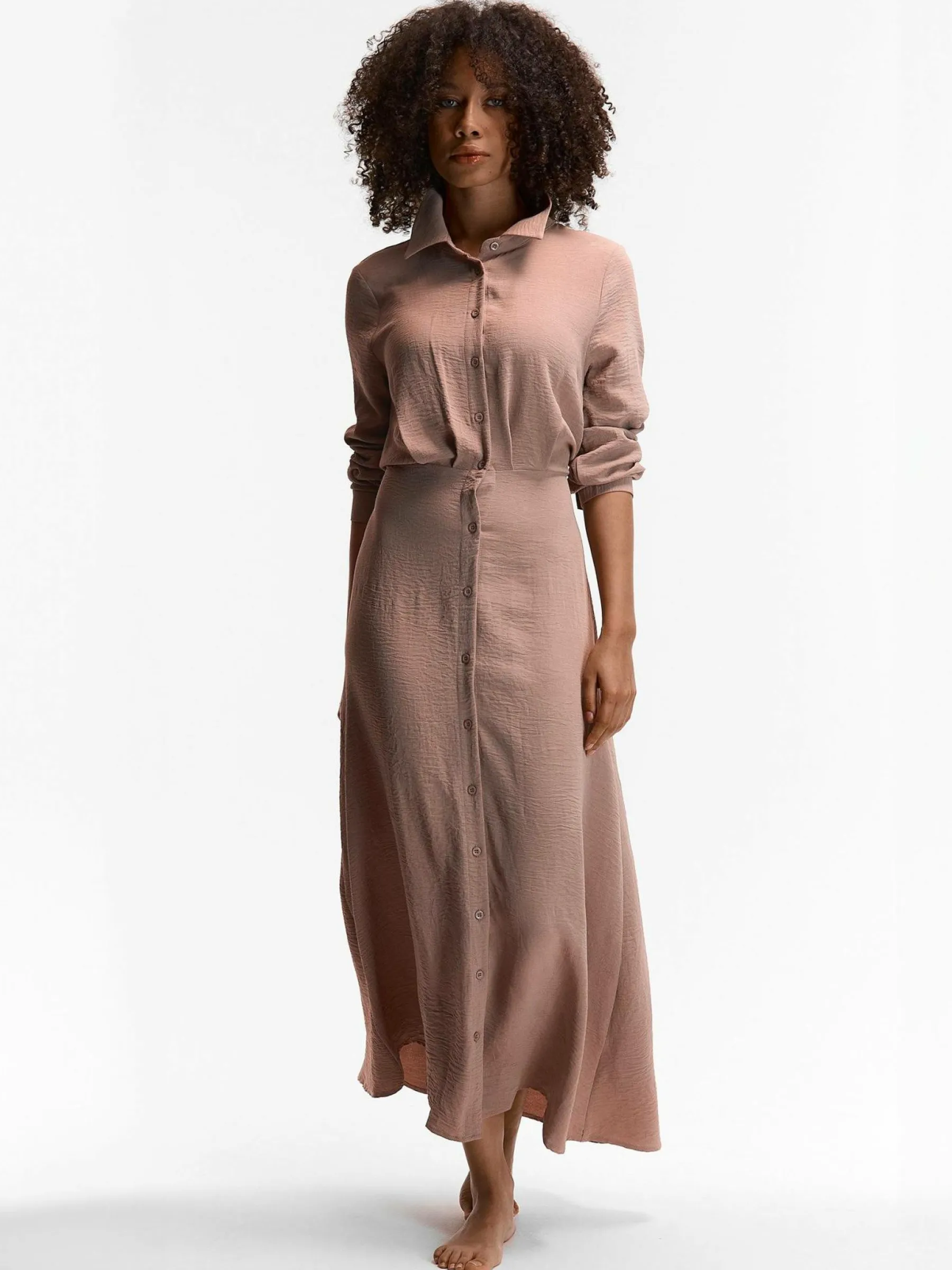 Kolor: różowyKrój: koszulowe, asyTyp: sukienkaRekaw: długi rękawDługość: midiPattern style: pojedynczy kolorDeta…