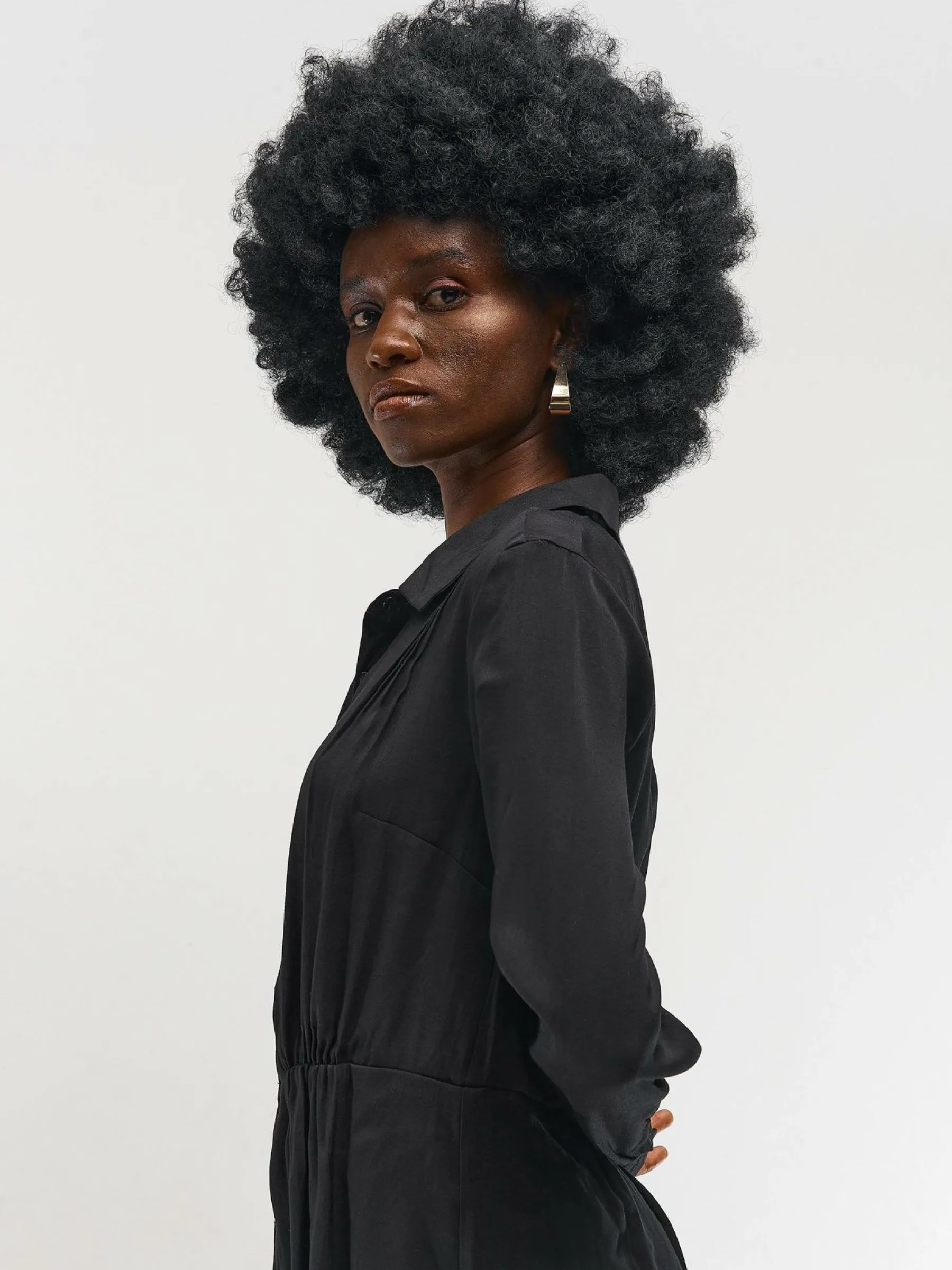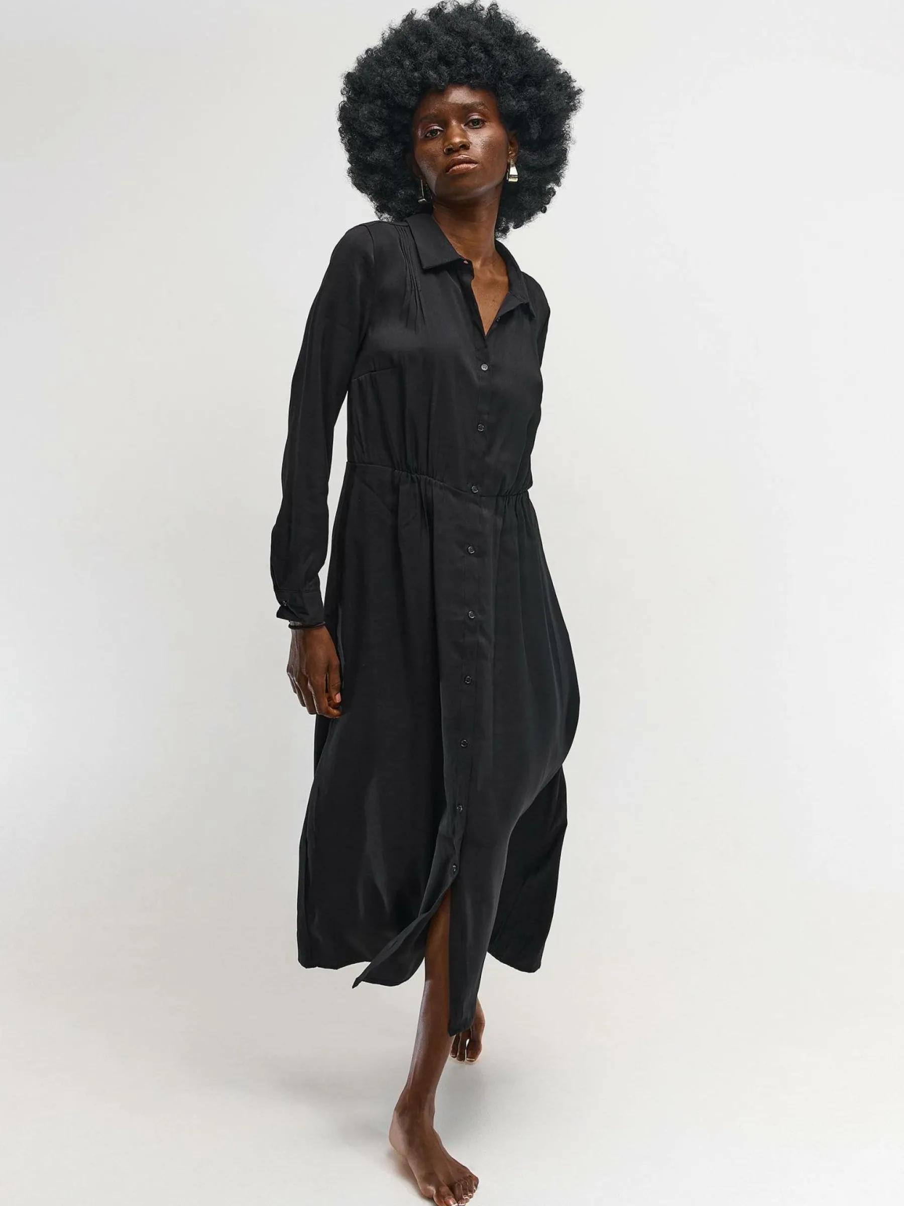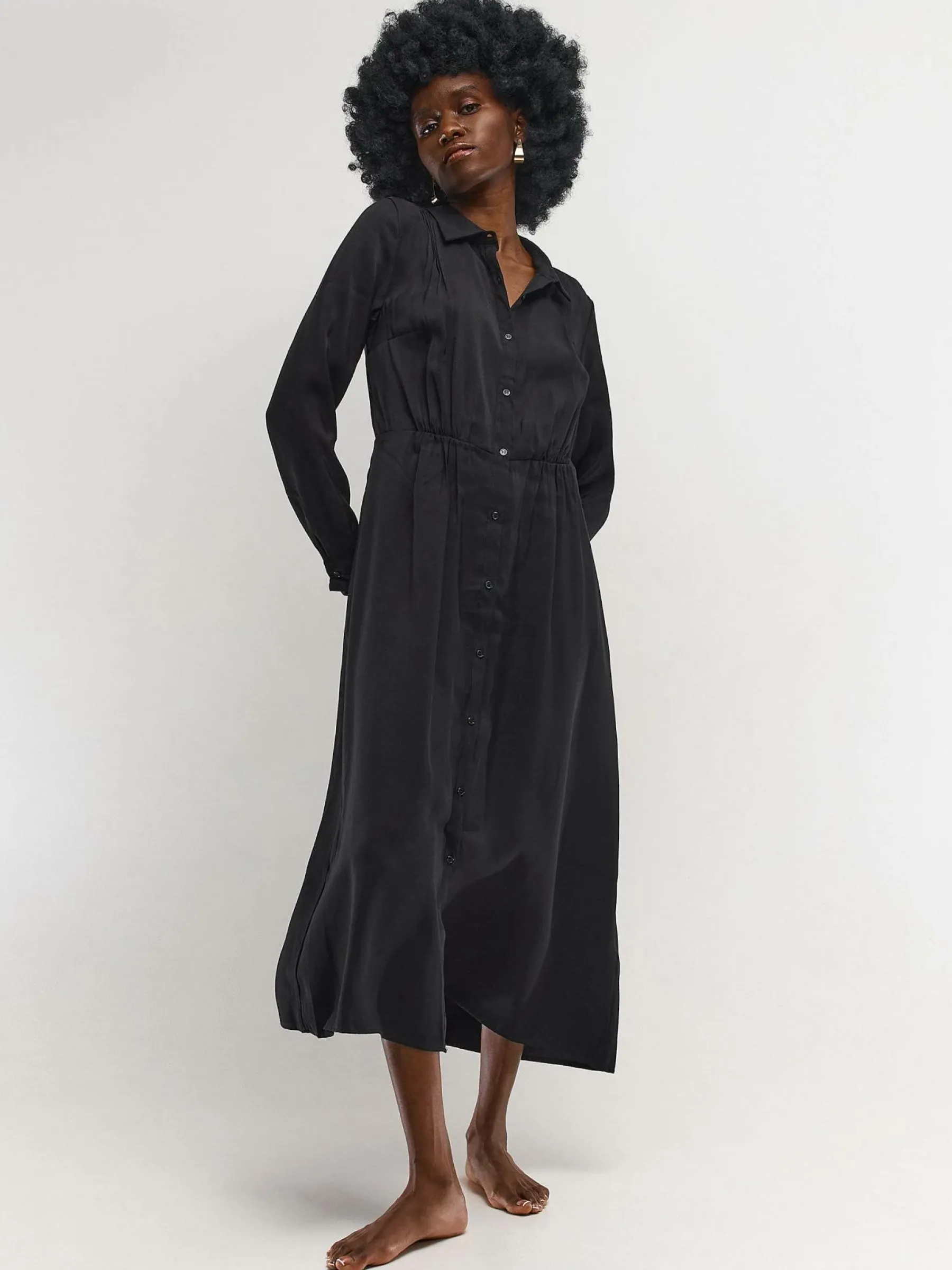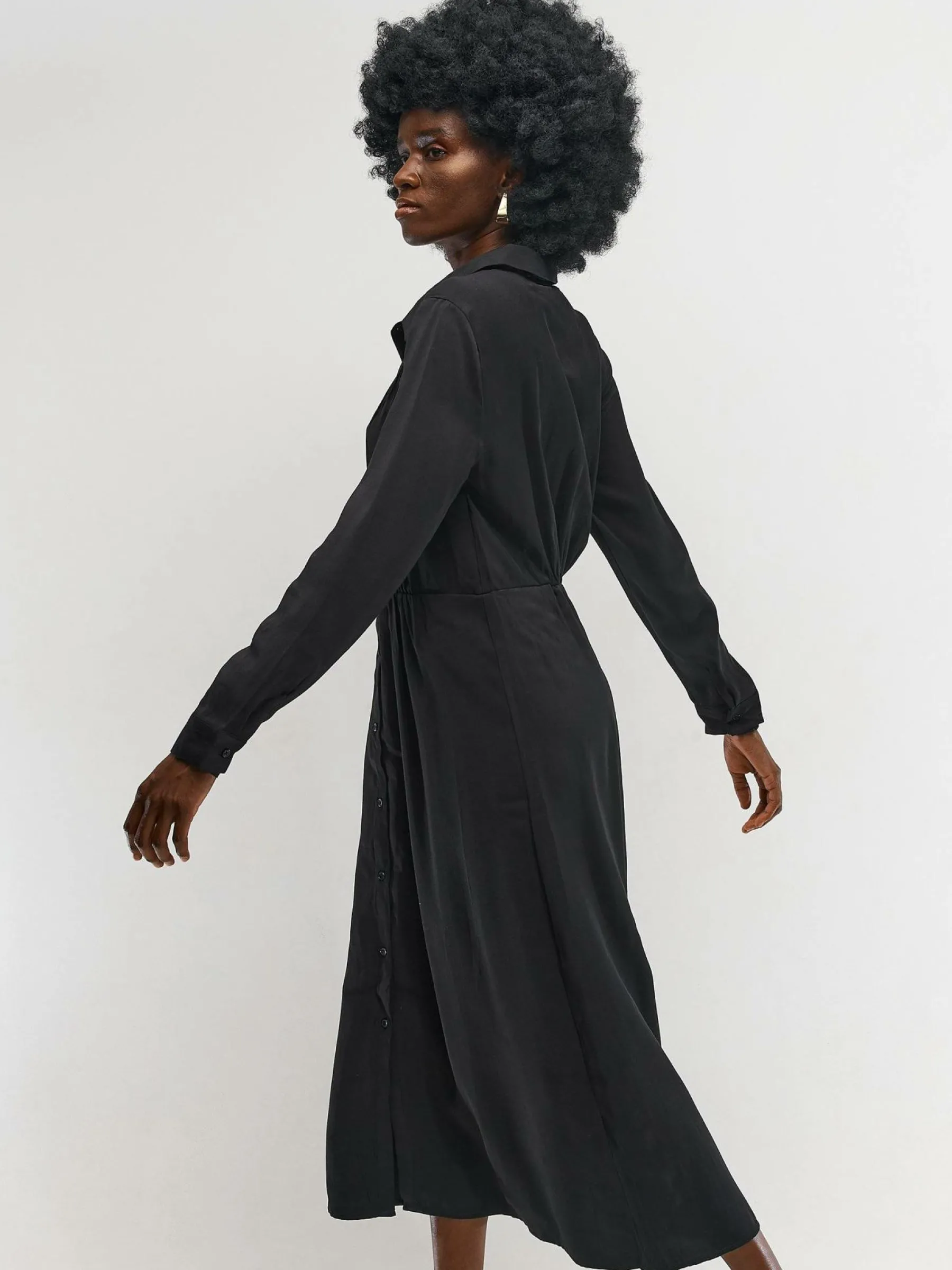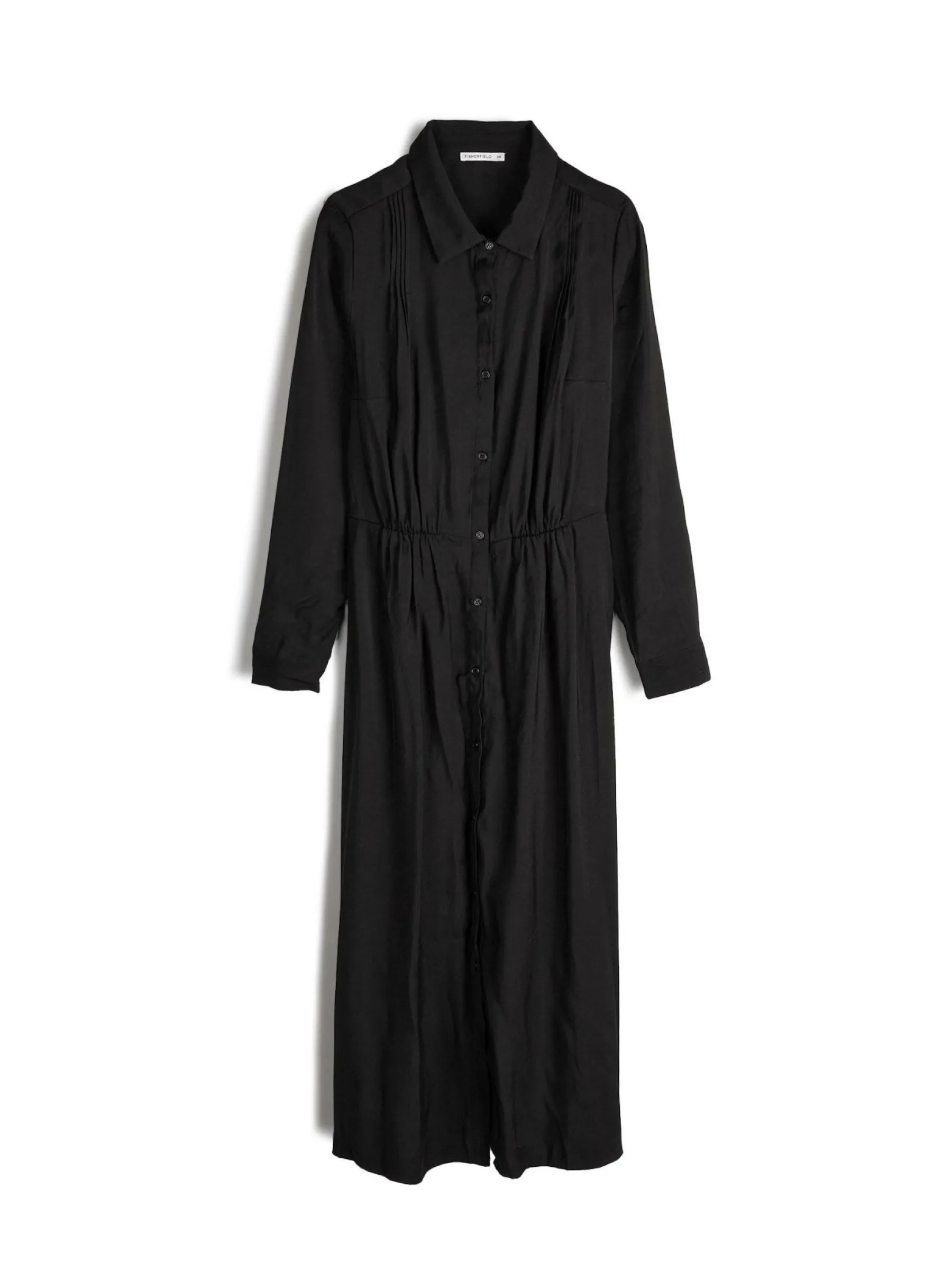 Kolor: czarnyKrój: koszuloweTyp: sukienkaRekaw: długi rękawDługość: midiPattern style: pojedynczy kolorDetal: z fa…