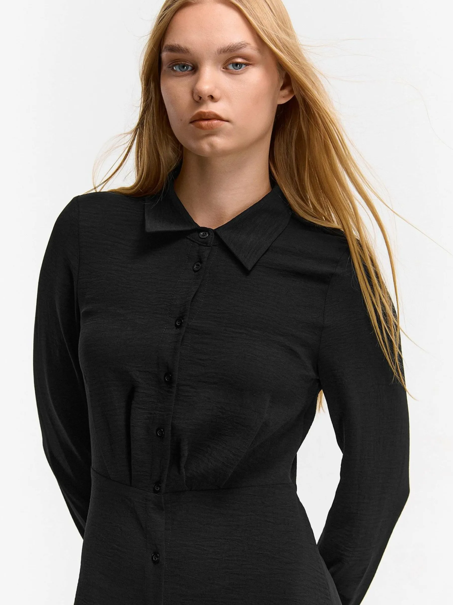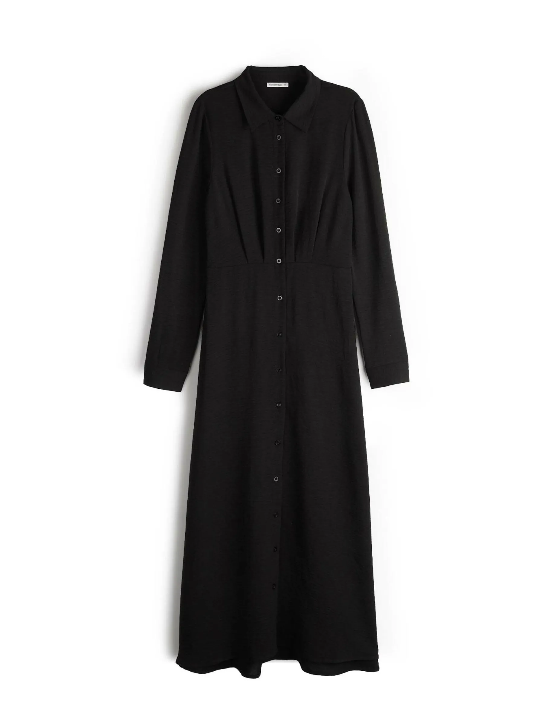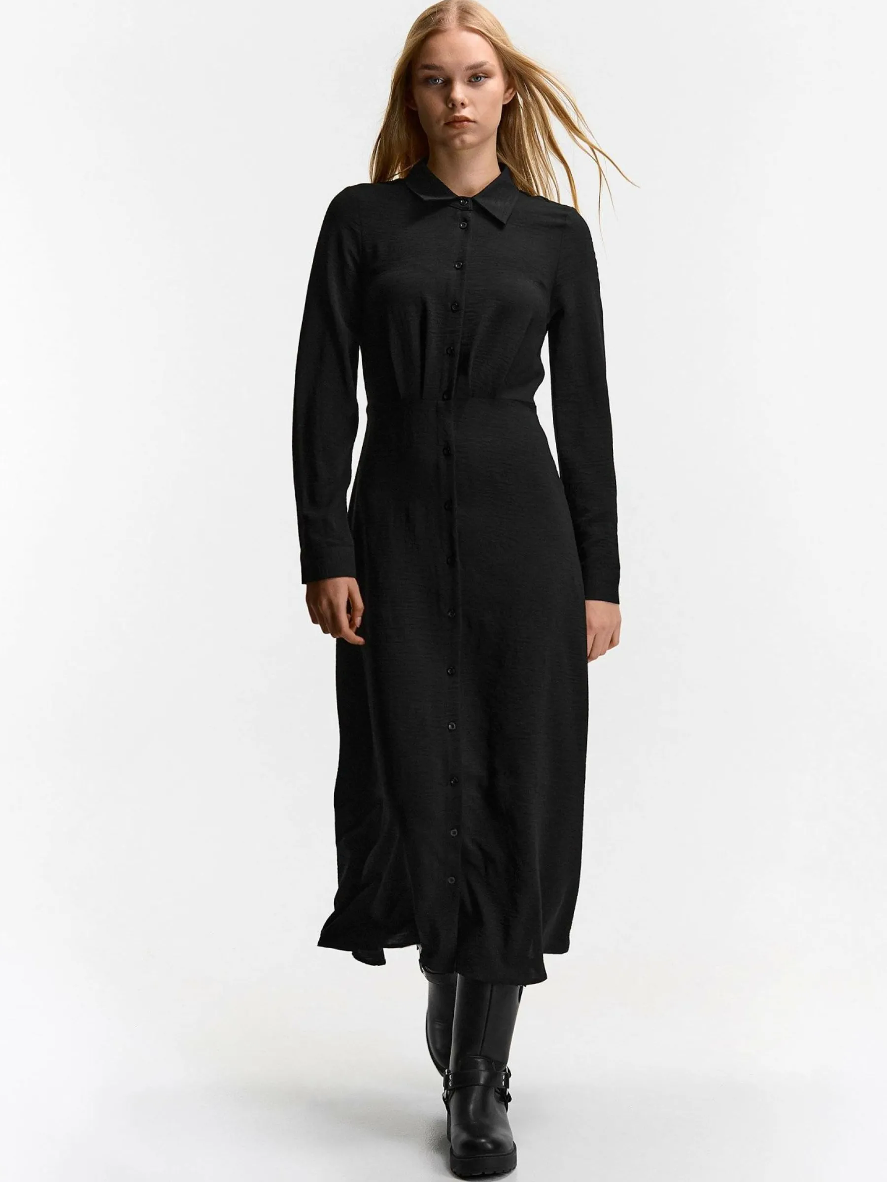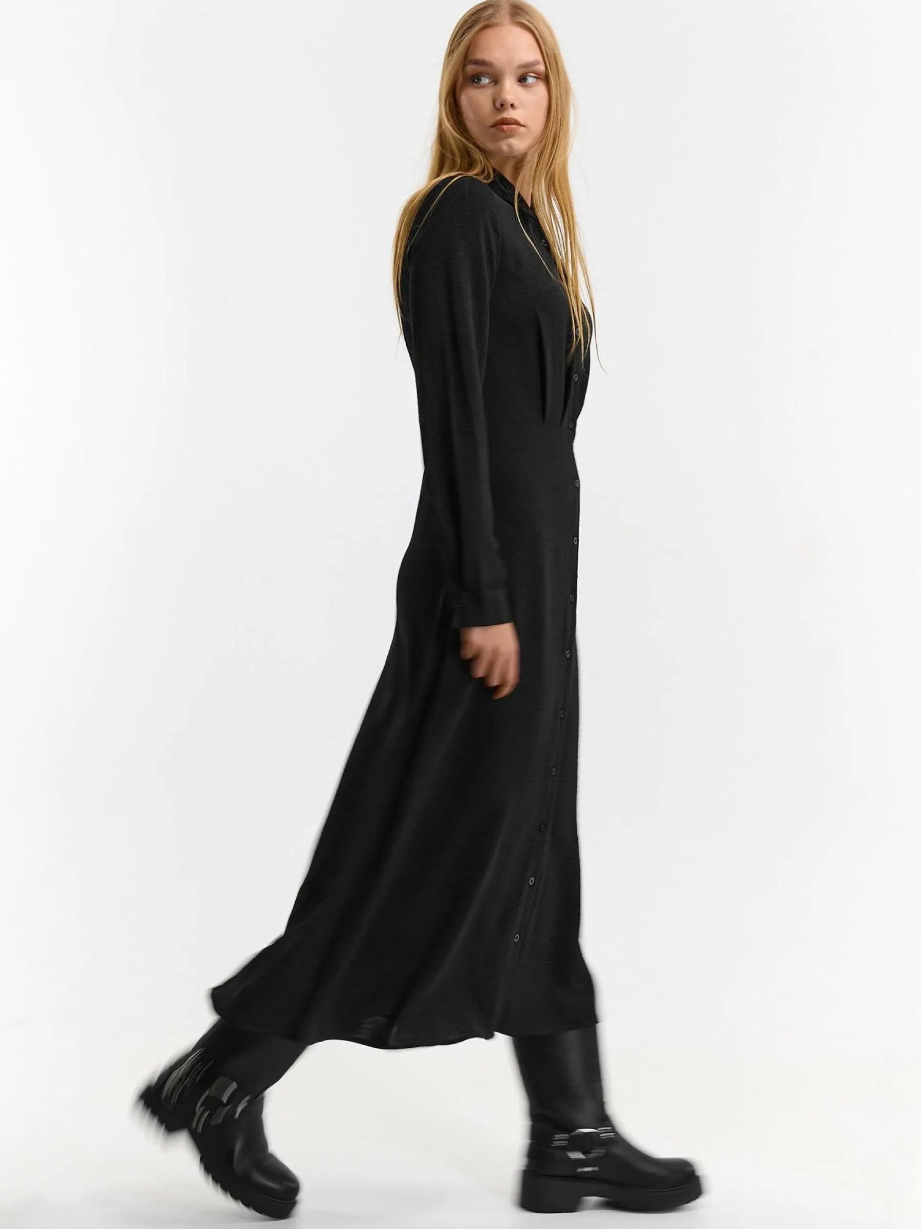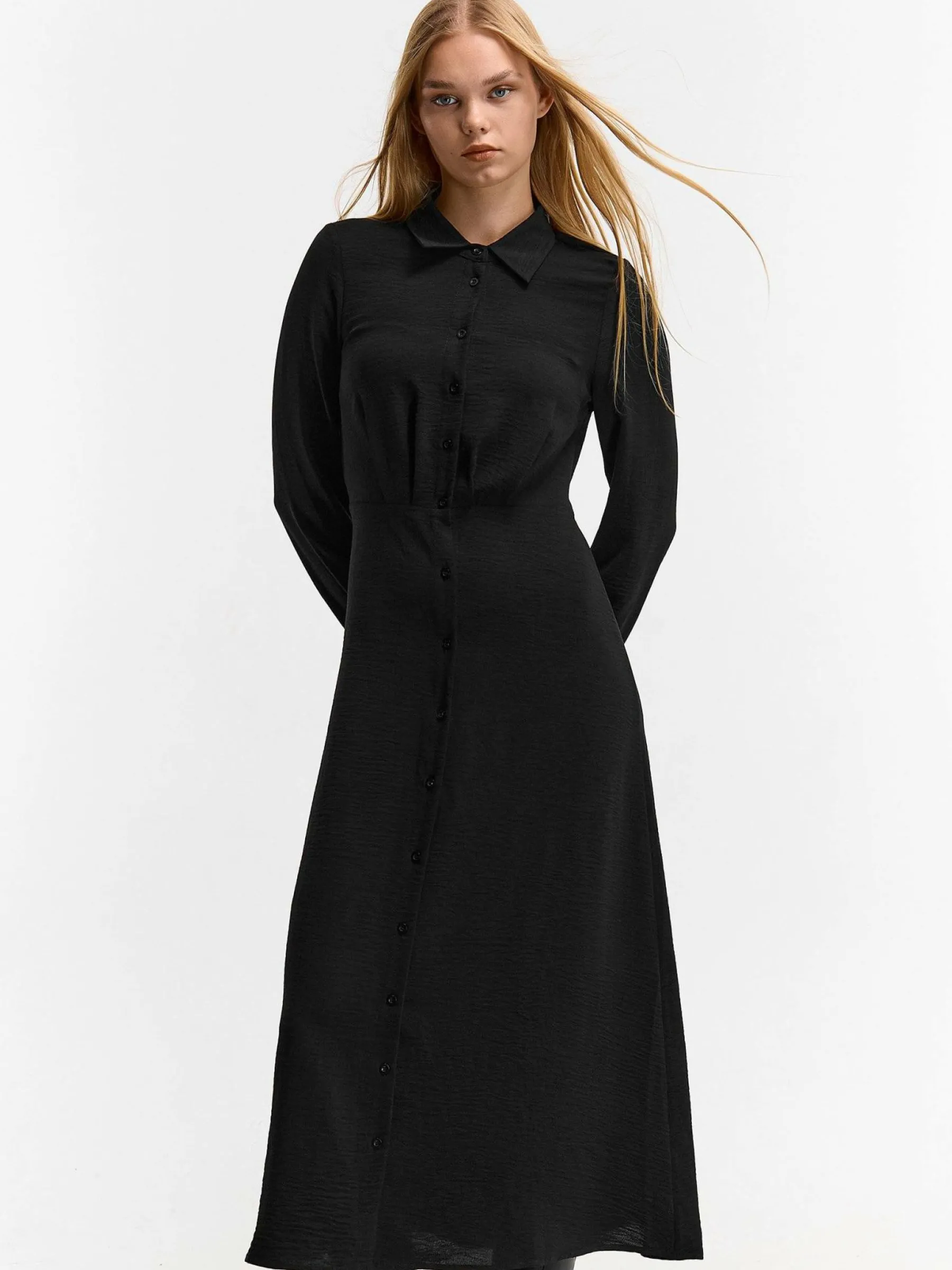 Kolor: czarnyKrój: koszulowe, asyTyp: sukienkaRekaw: długi rękawDługość: midiPattern style: pojedynczy kolorDetal:…