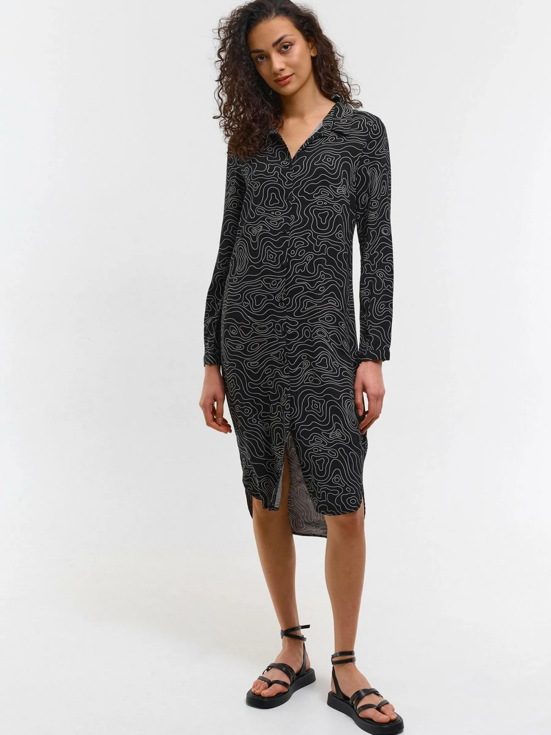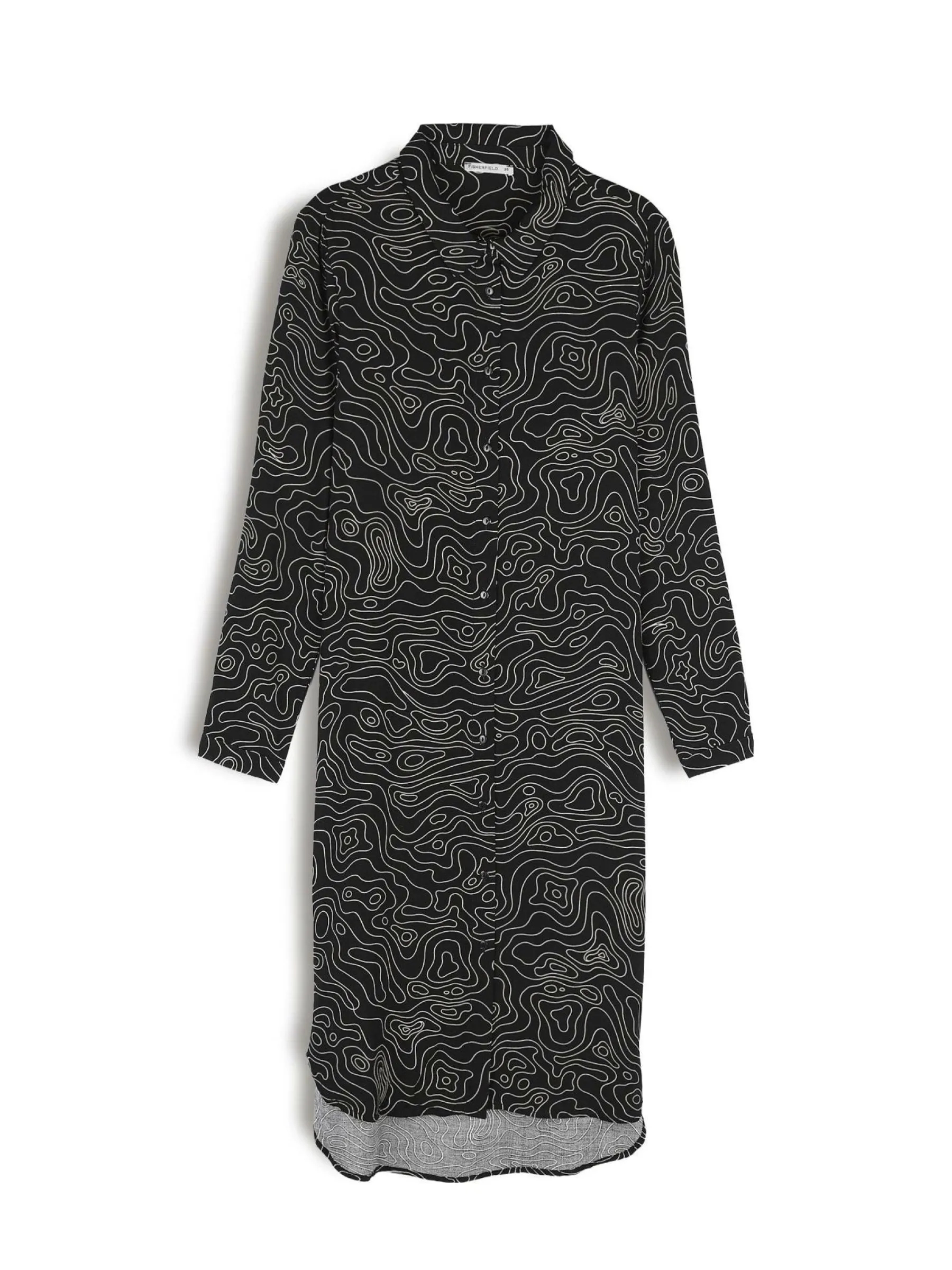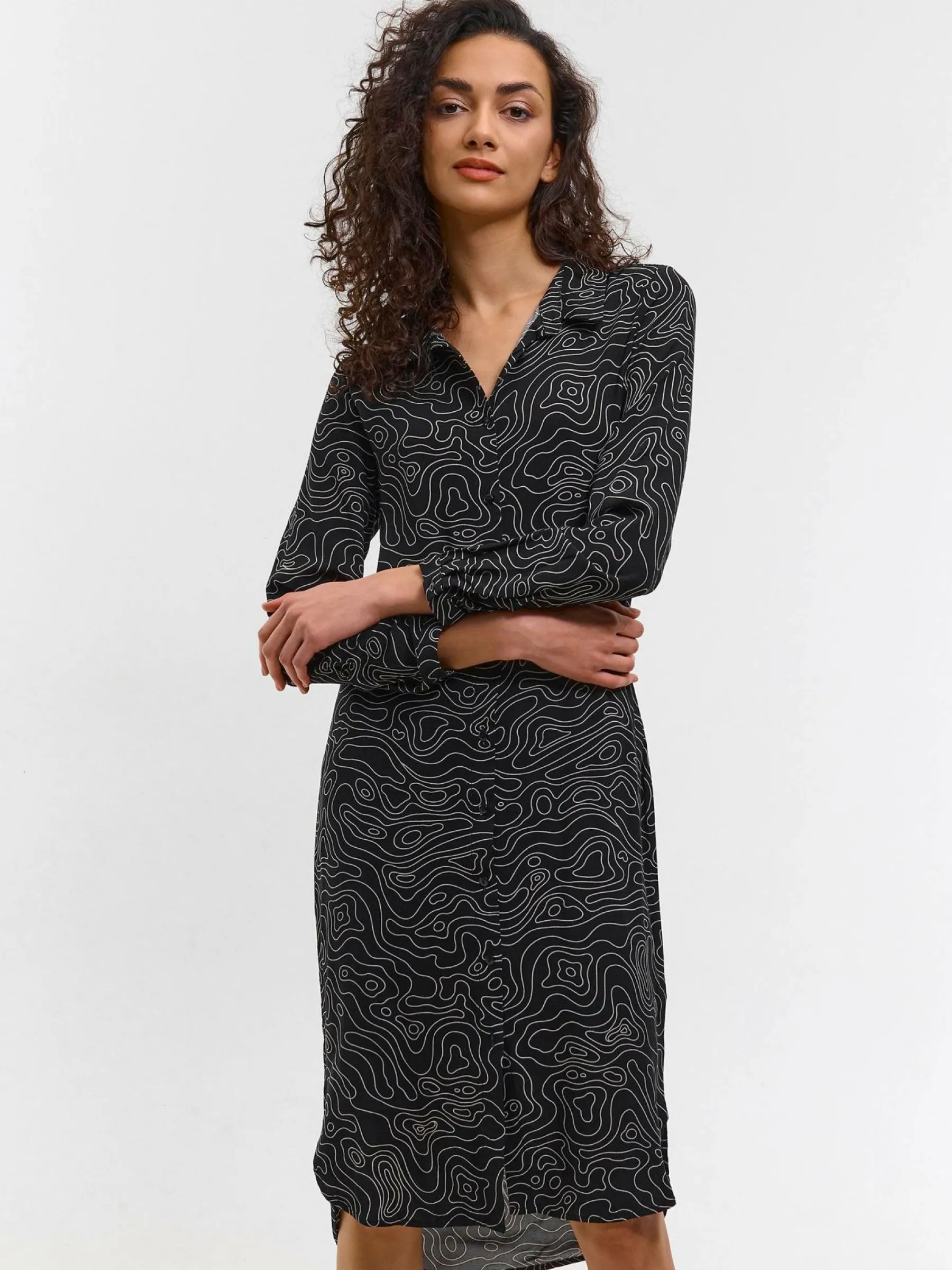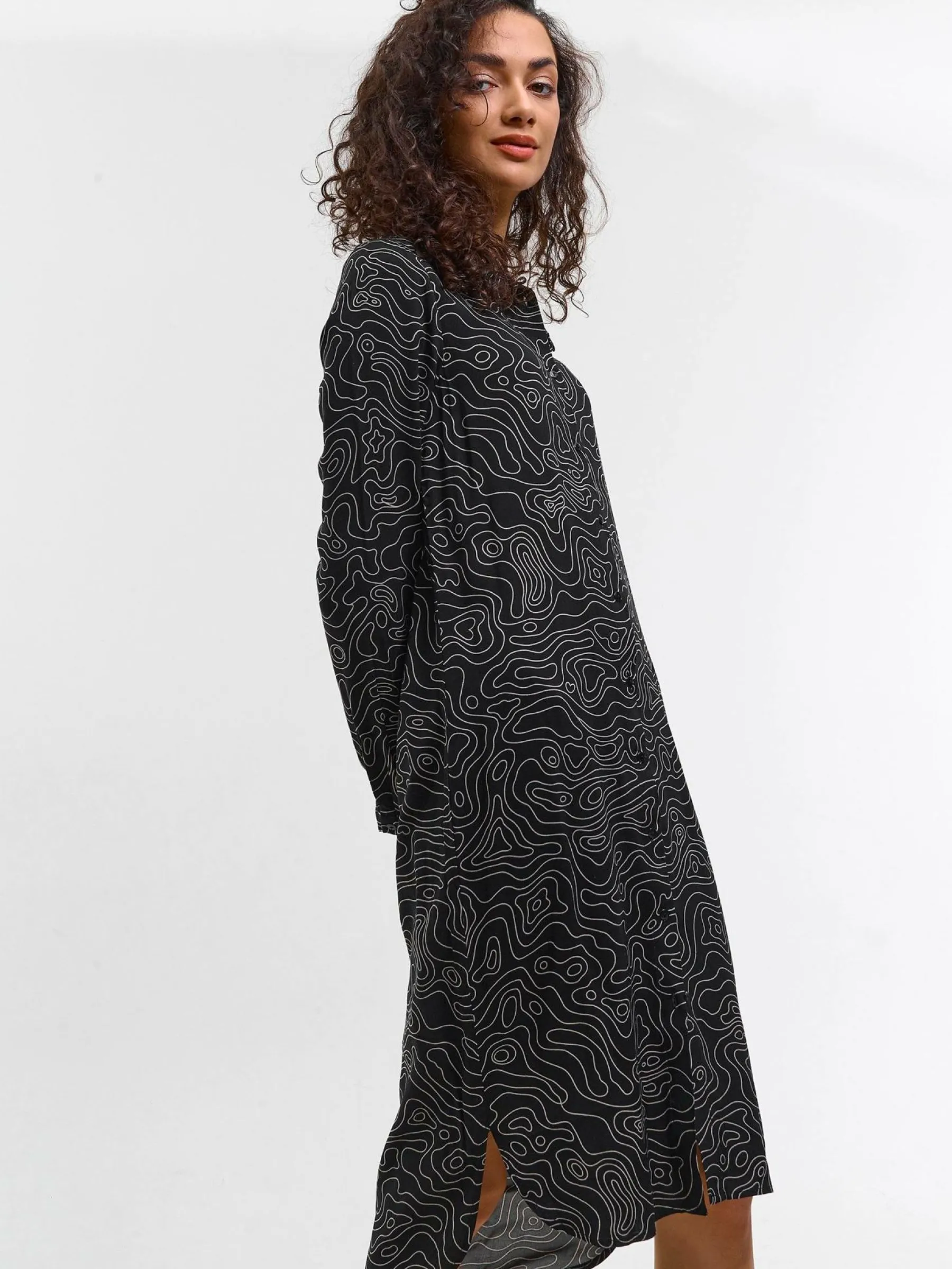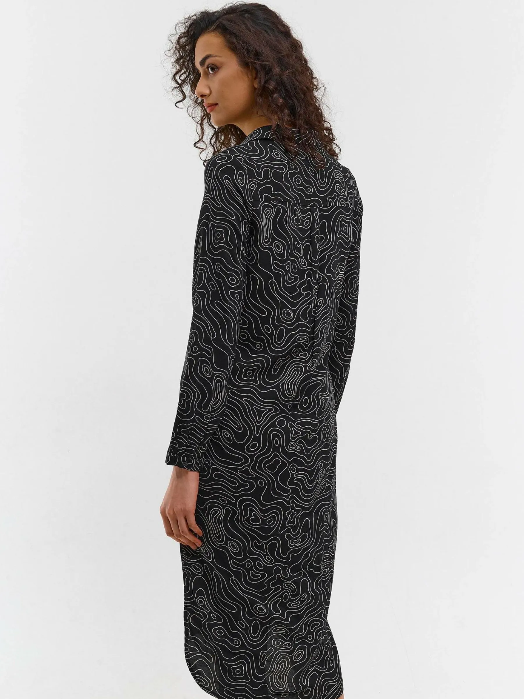 Kolor: czarnyKrój: koszuloweTyp: sukienkaRekaw: długi rękawDługość: maxiPattern style: geometrycznyMateriał: wisk…