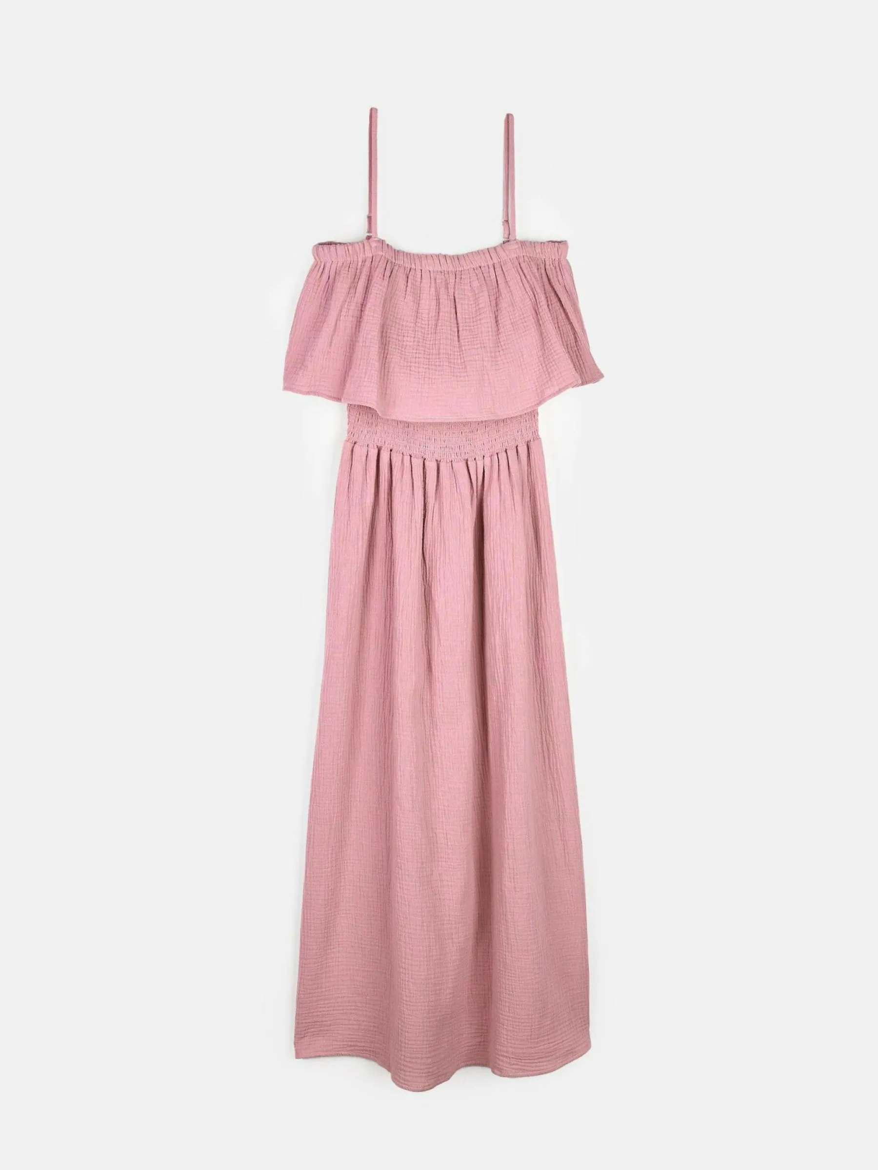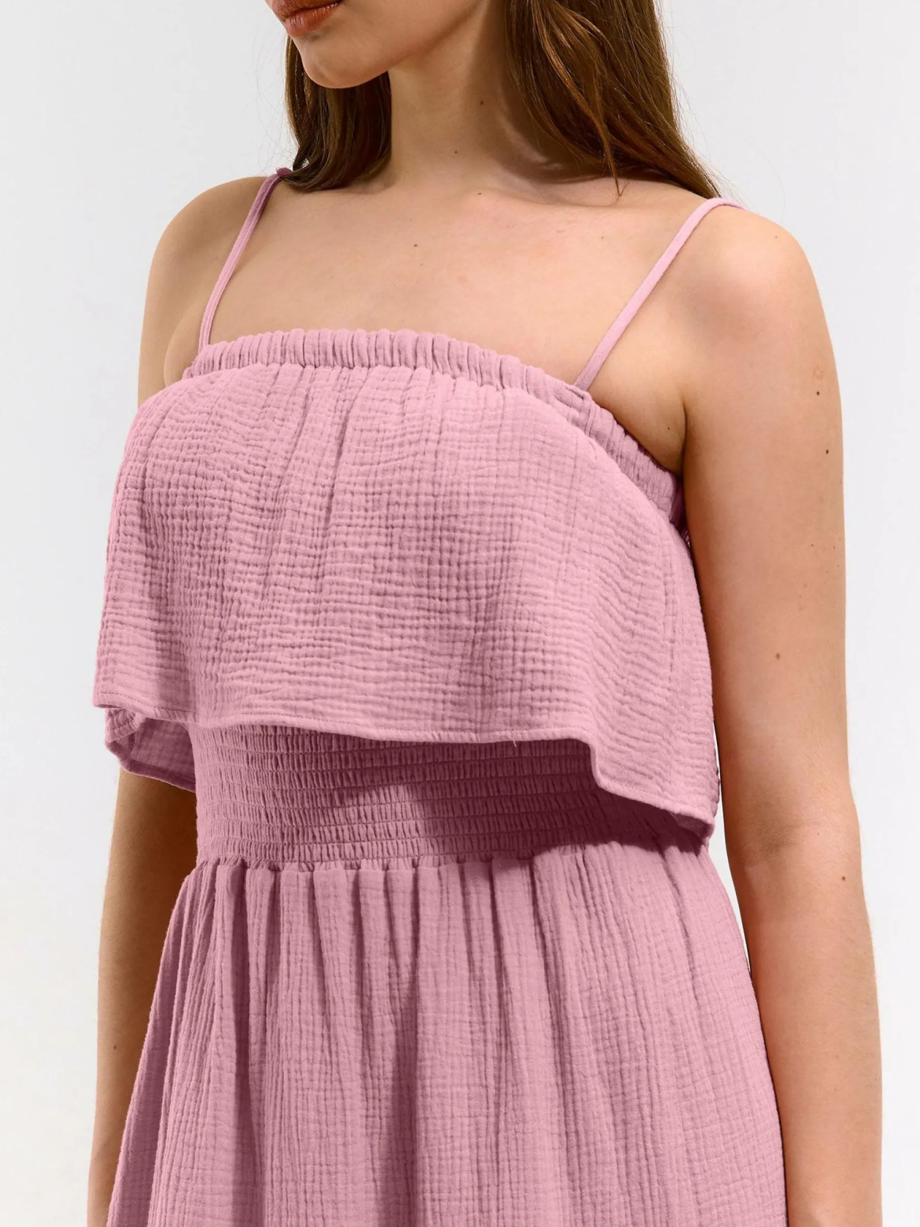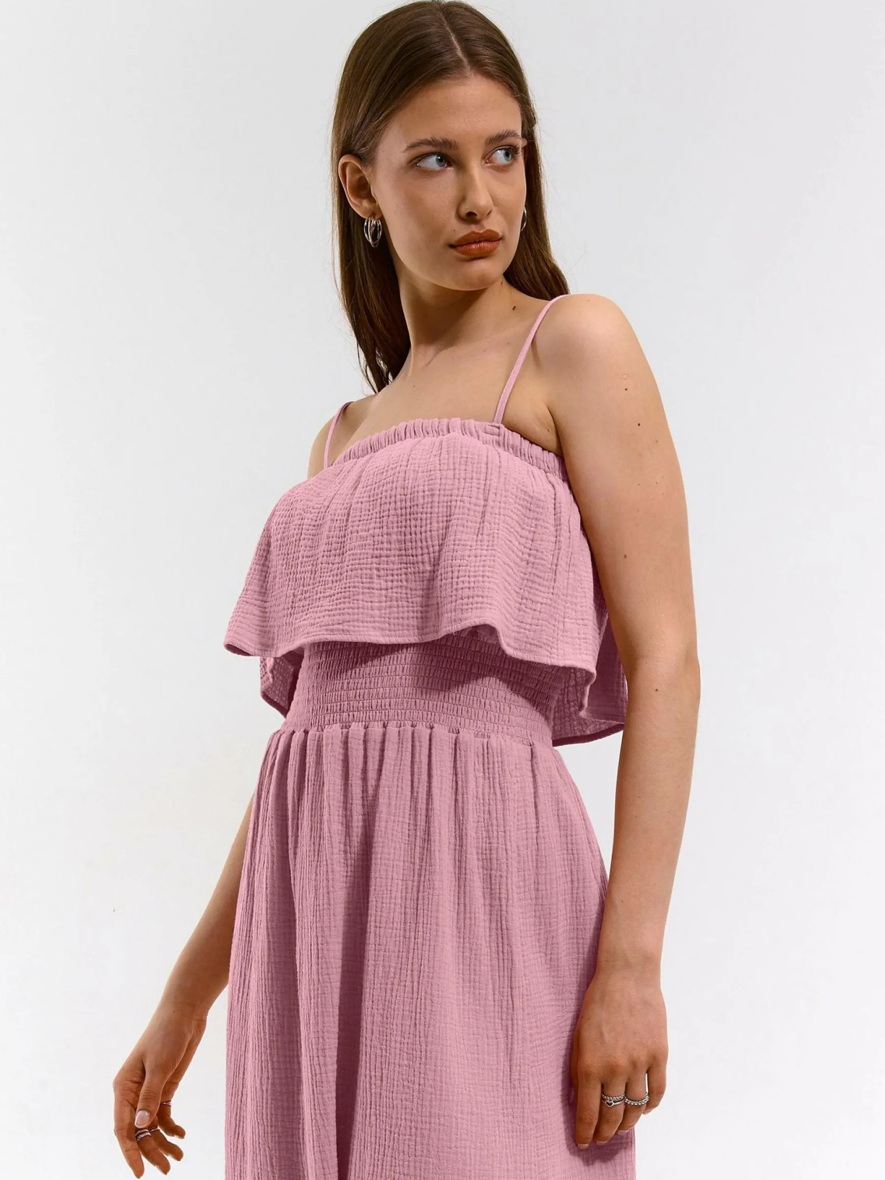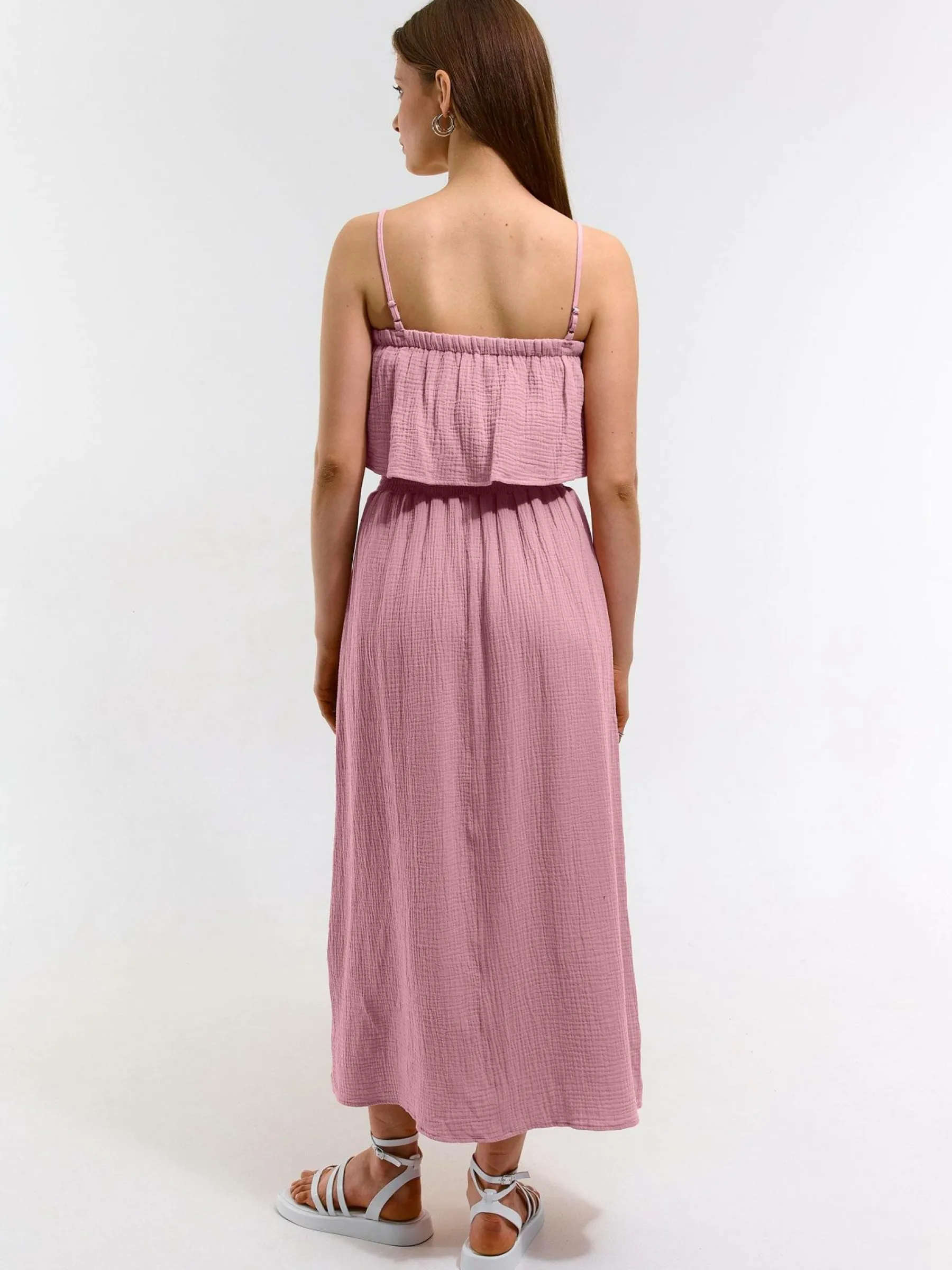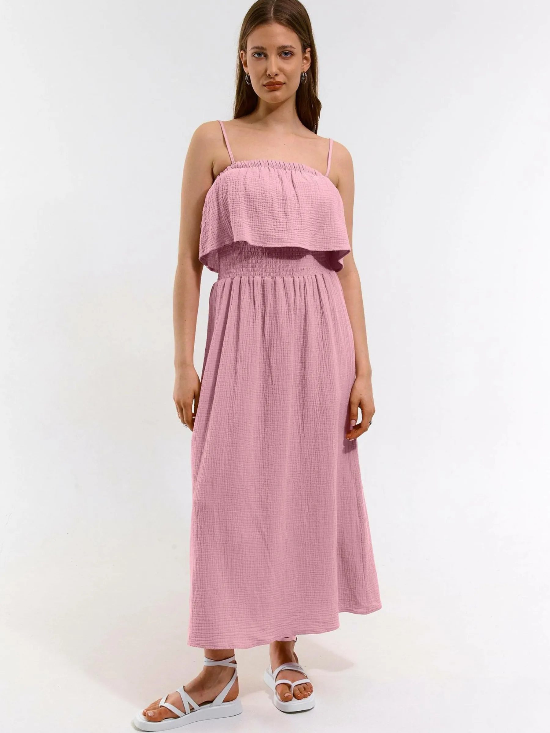 Kolor: różowyKrój: z falbanąTyp: sukienkaRekaw: bez rękawówDługość: midiPattern style: pojedynczy kolor, strukt…
