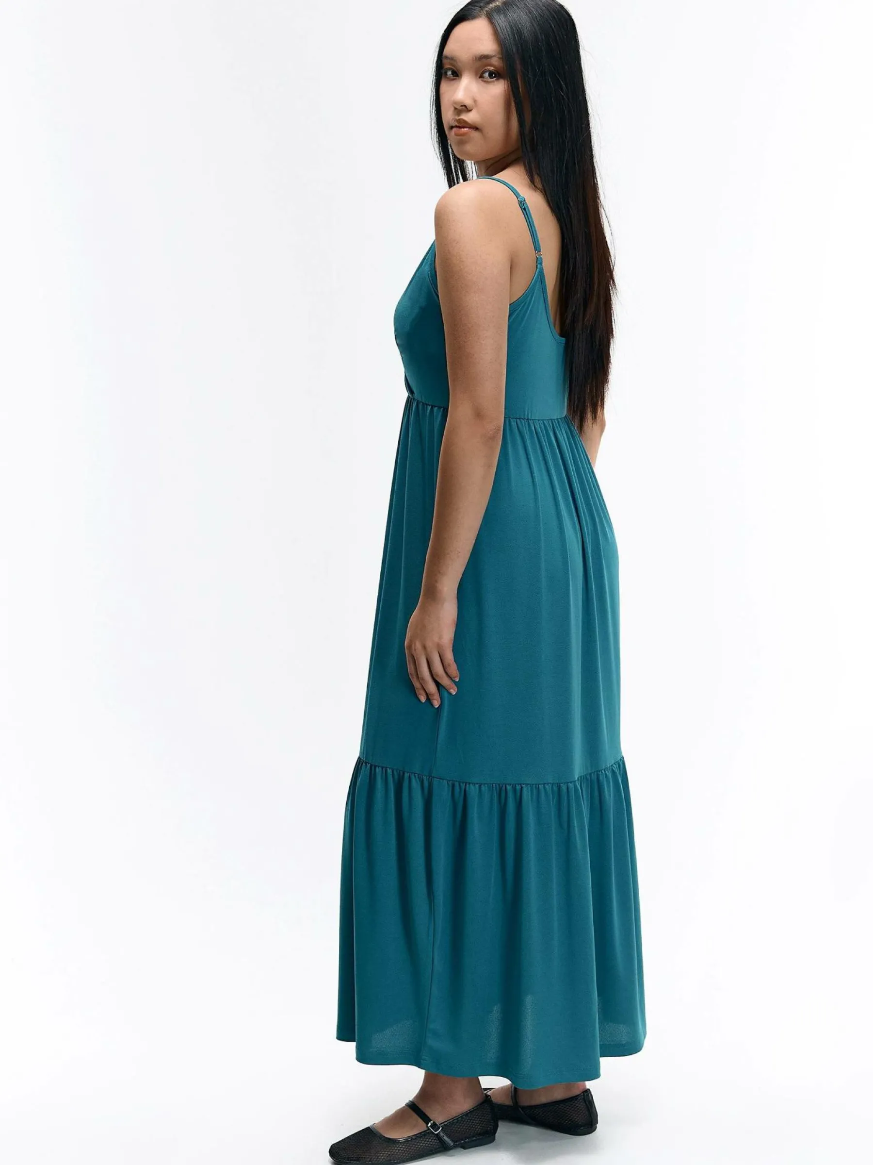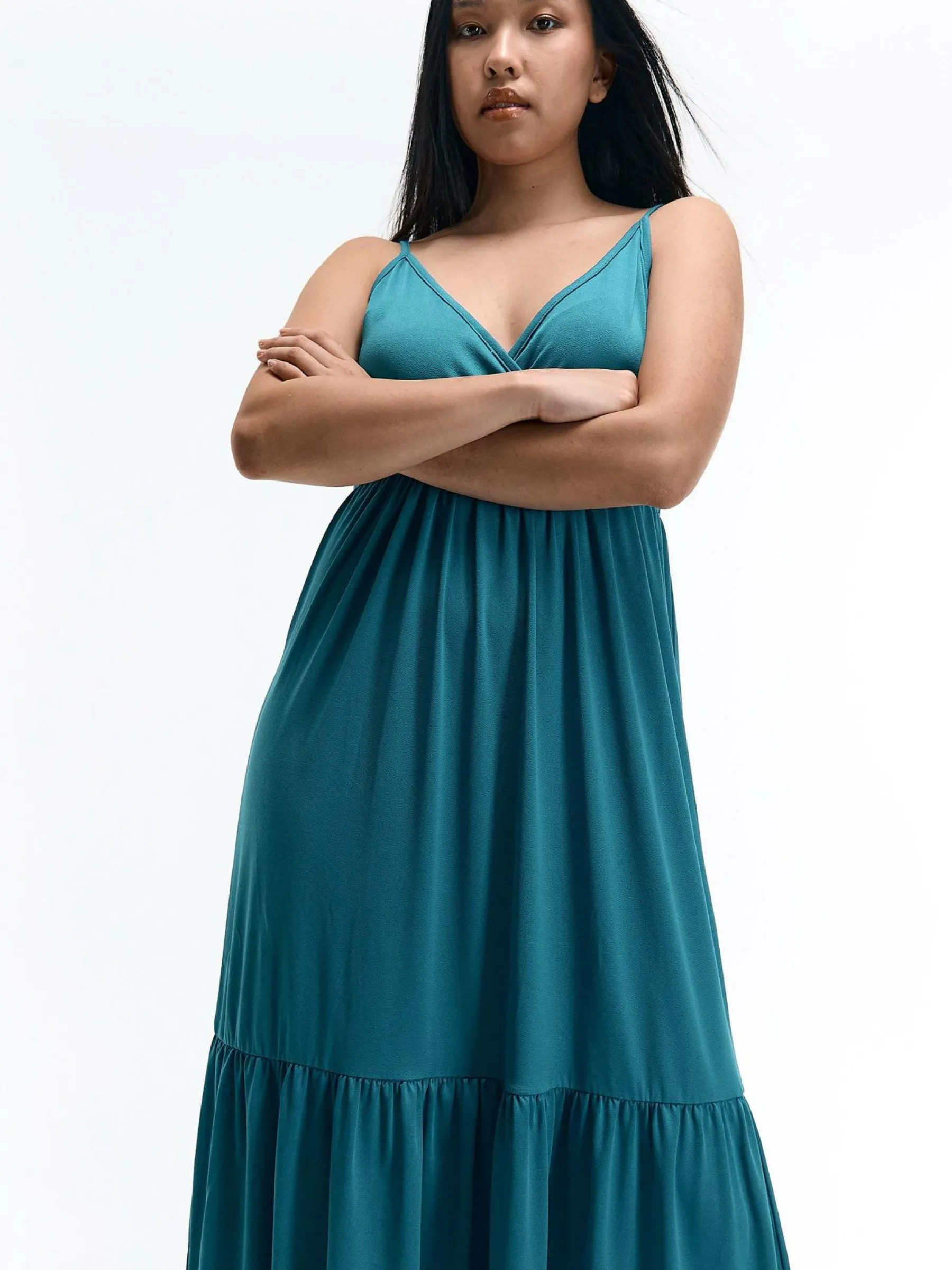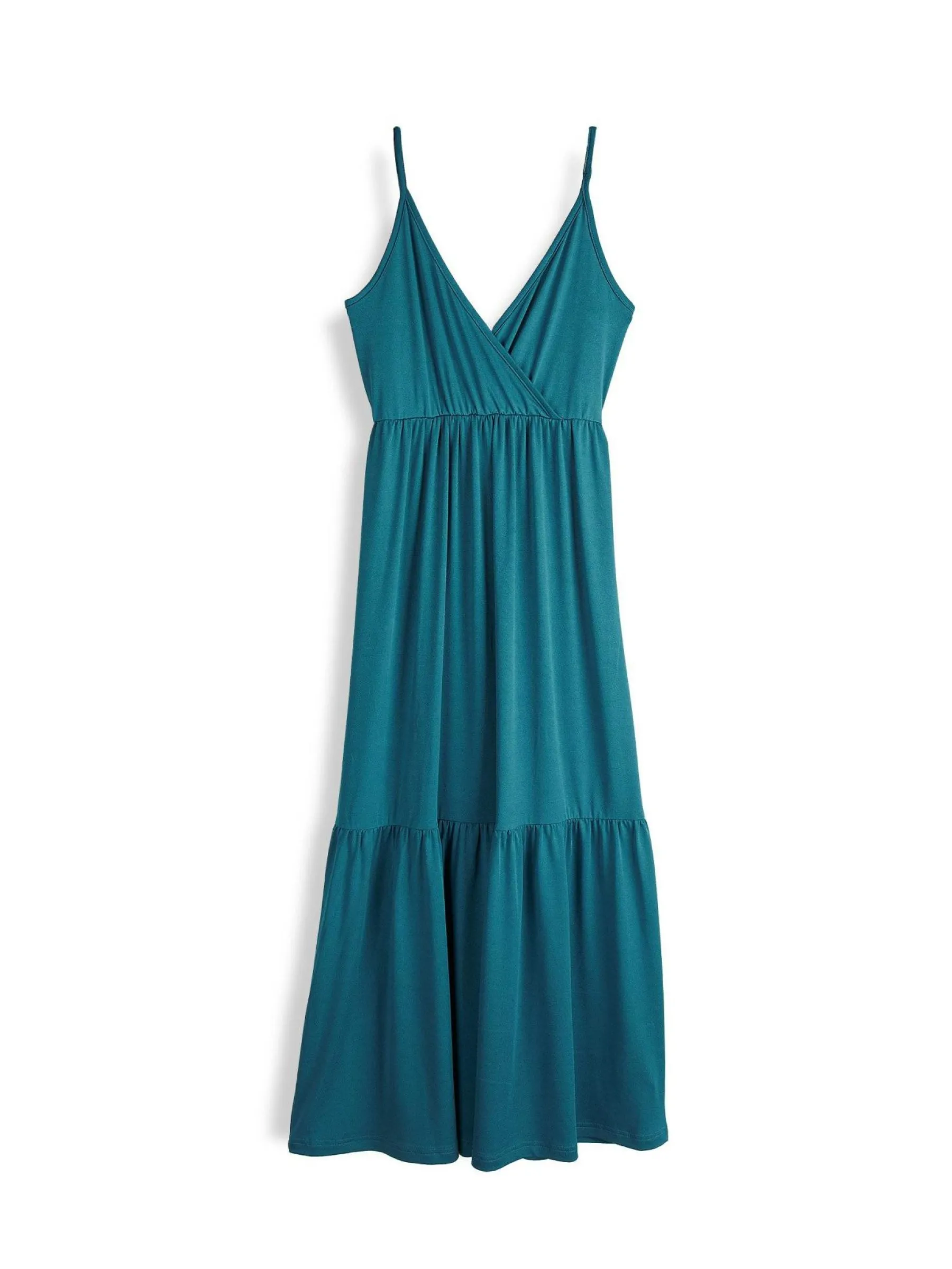 Kolor: niebieskiKrój: z falbanąTyp: sukienkaRekaw: bez rękawówDługość: maxiPattern style: pojedynczy kolorDetal: …
