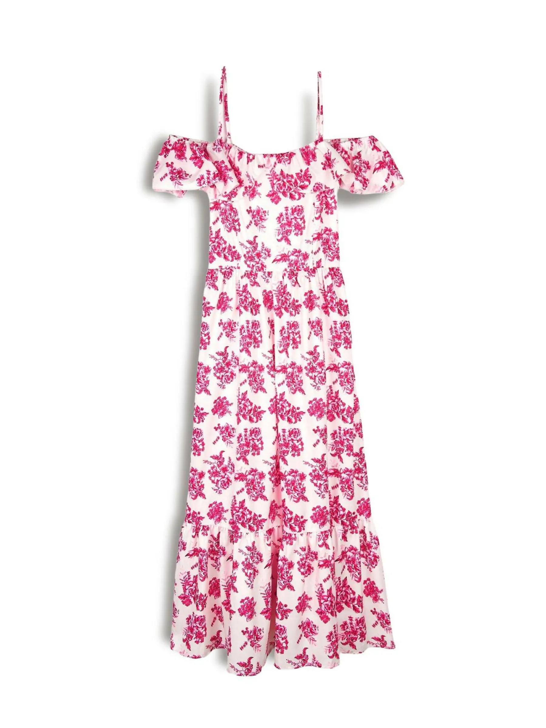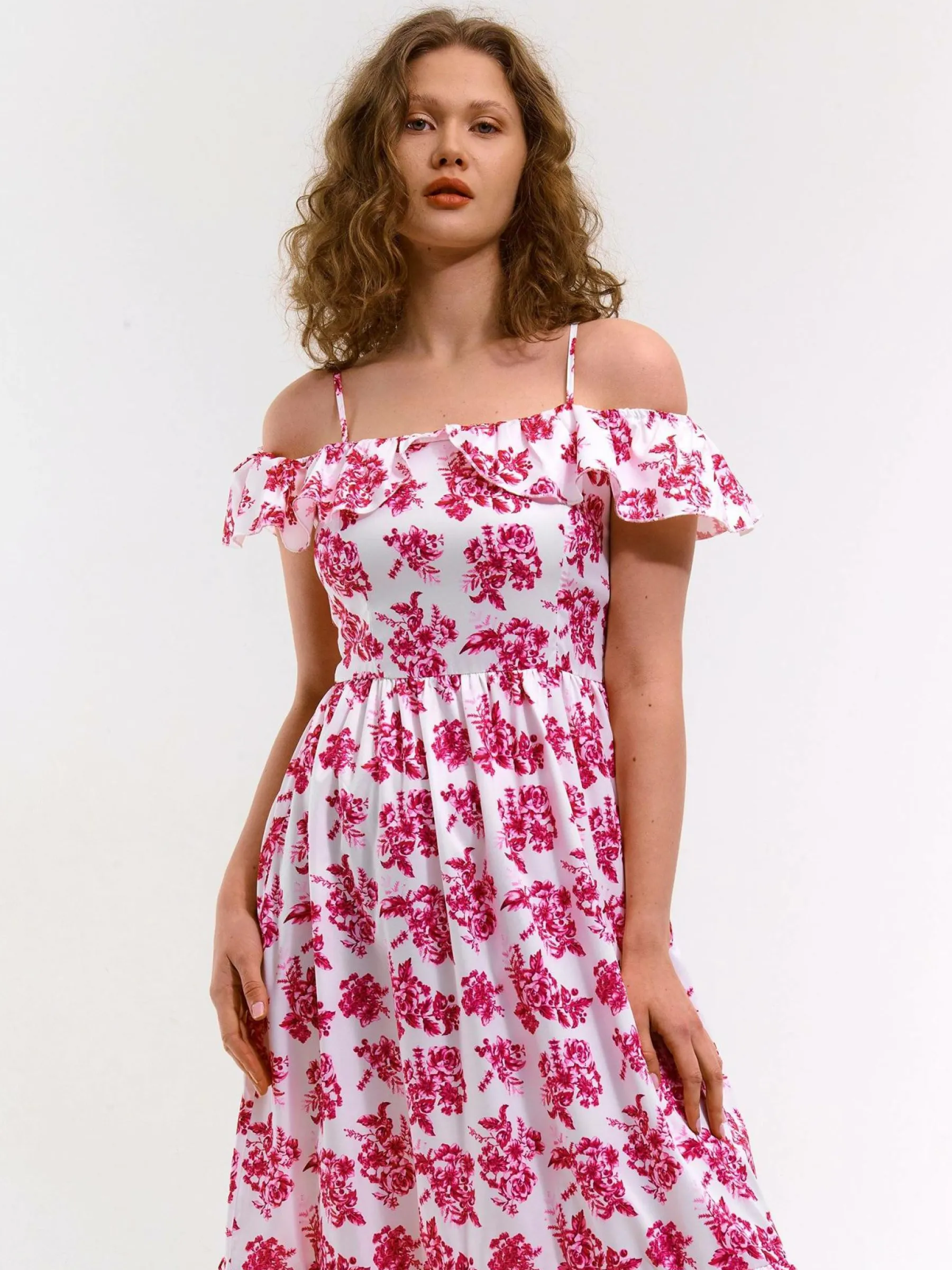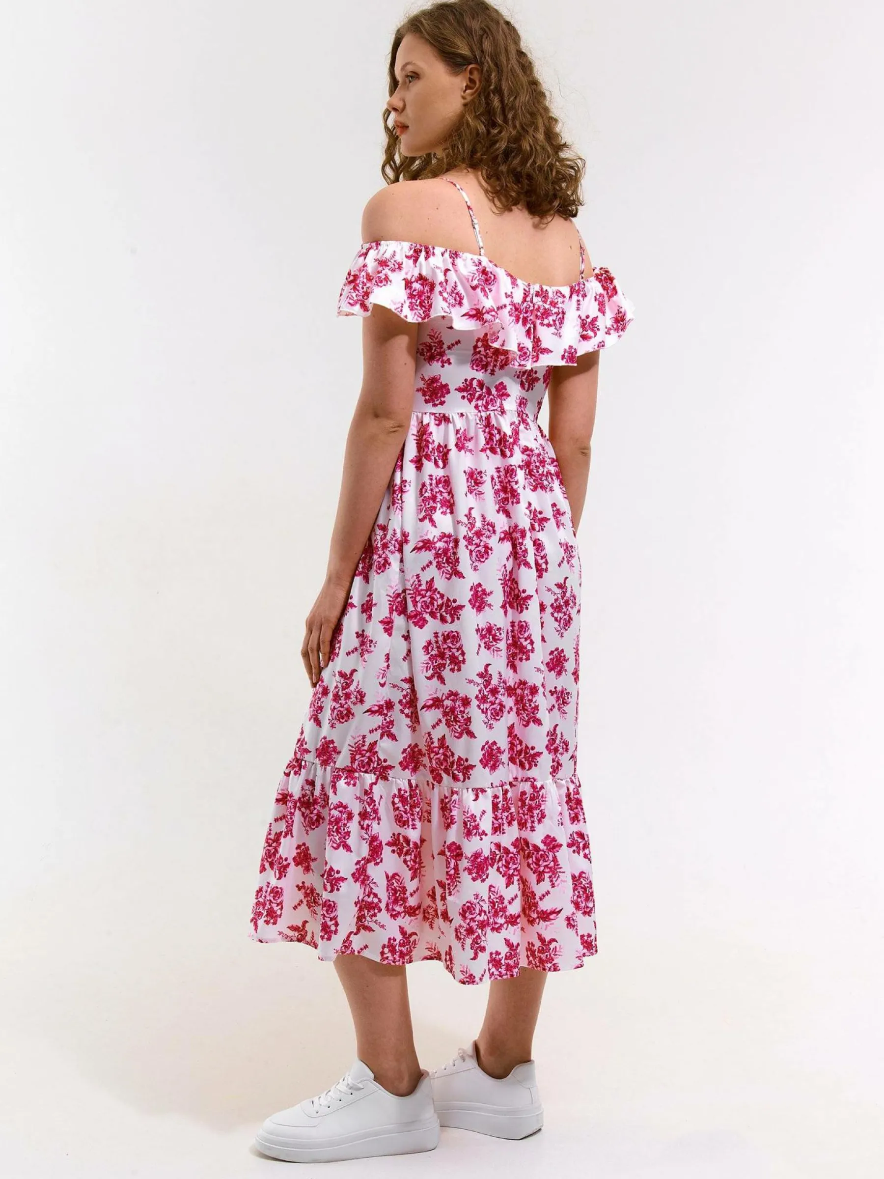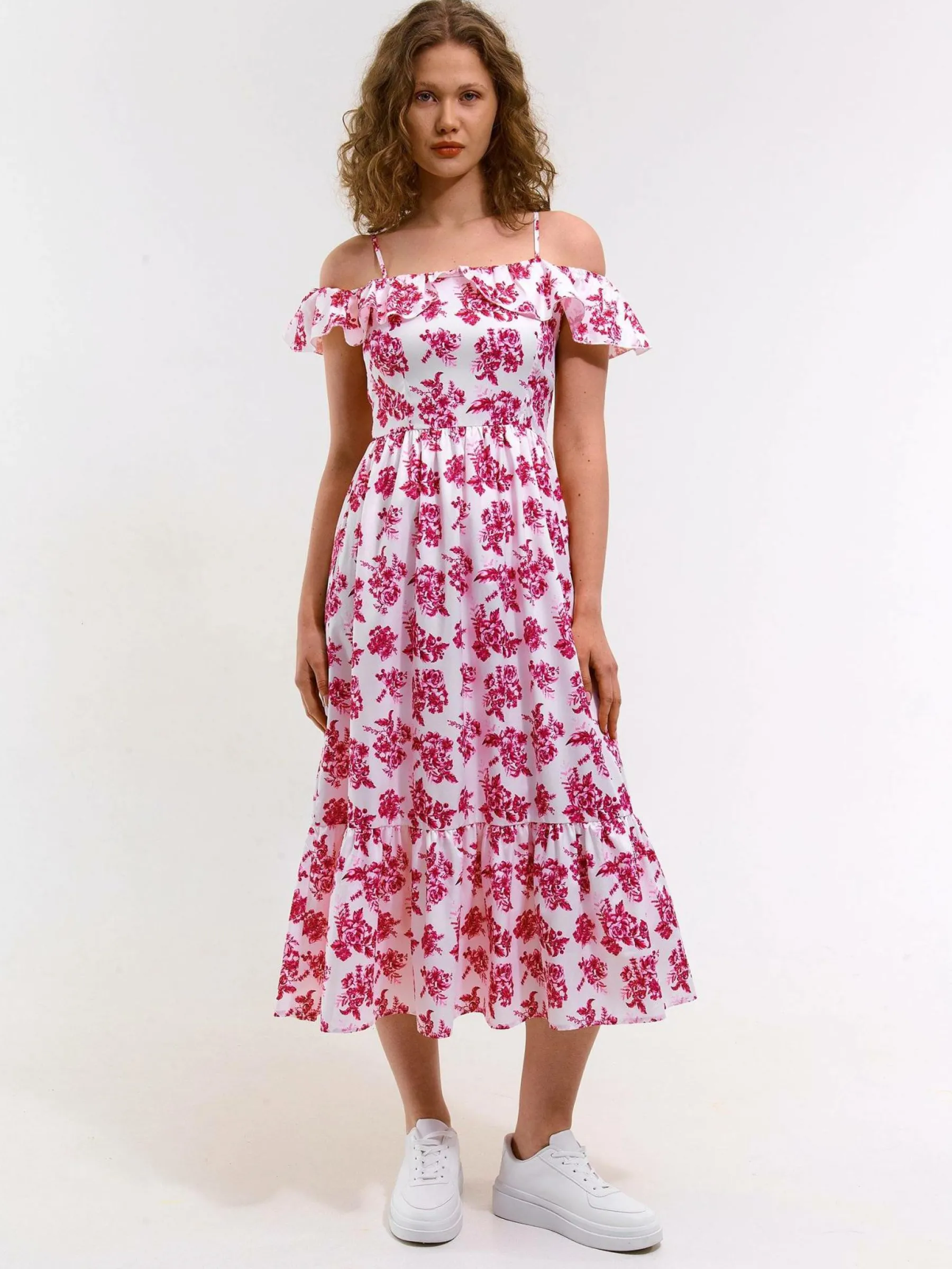 Kolor: białyKrój: z falbanąTyp: sukienkaRekaw: bez rękawówDługość: midiPattern style: kwiatoweDetal: nad głową…