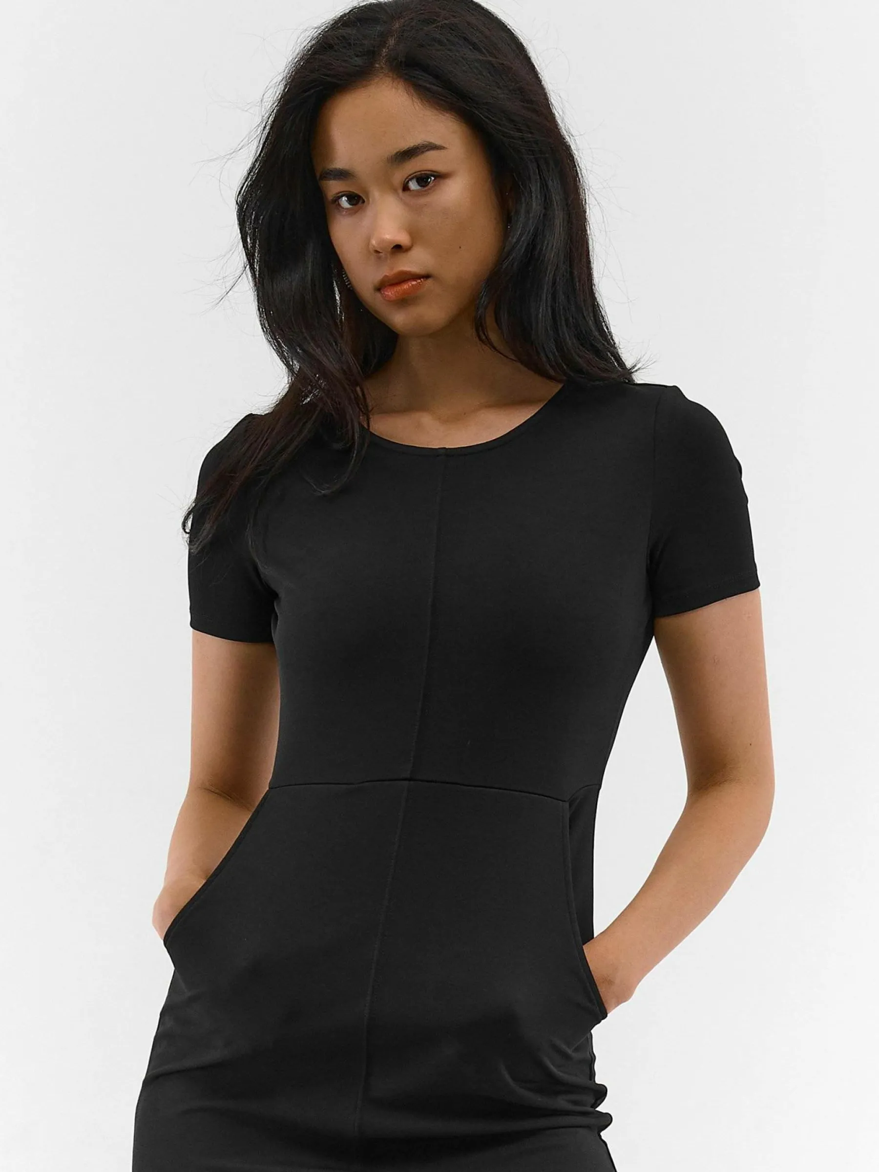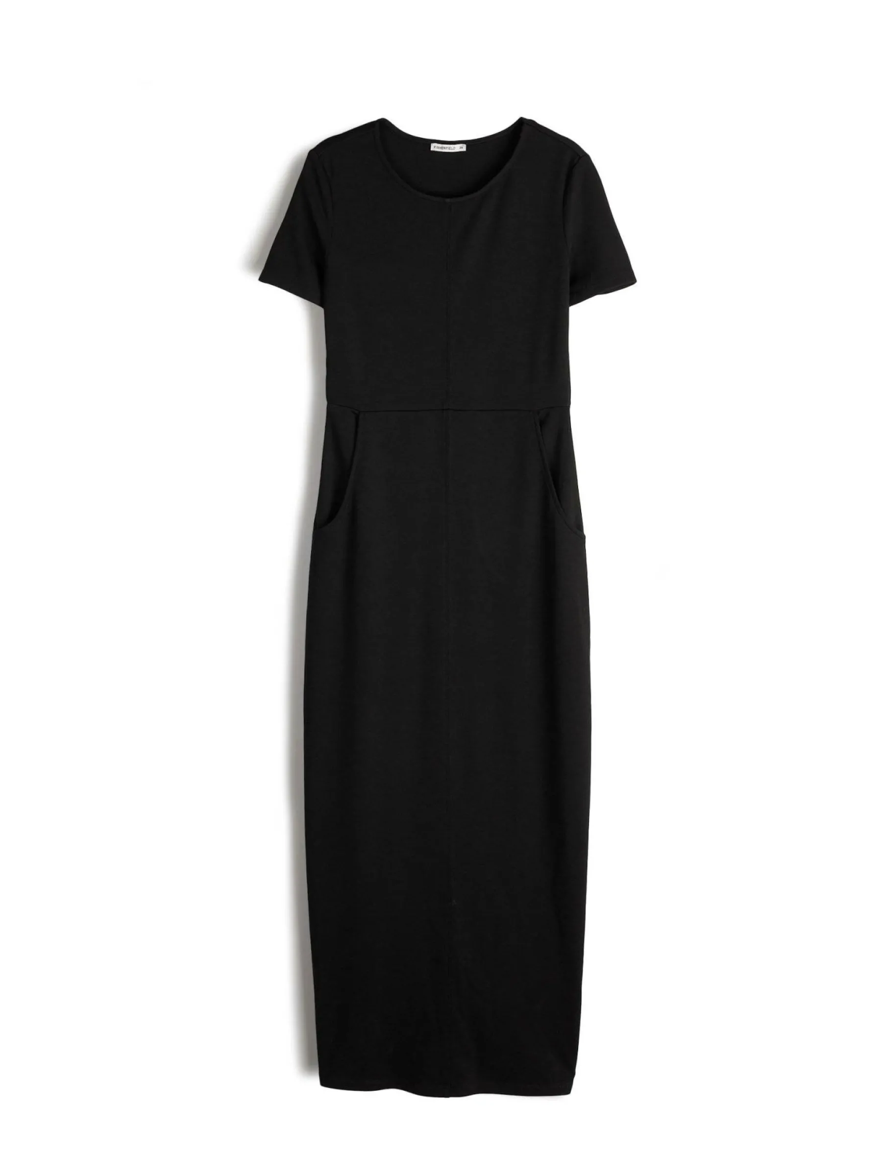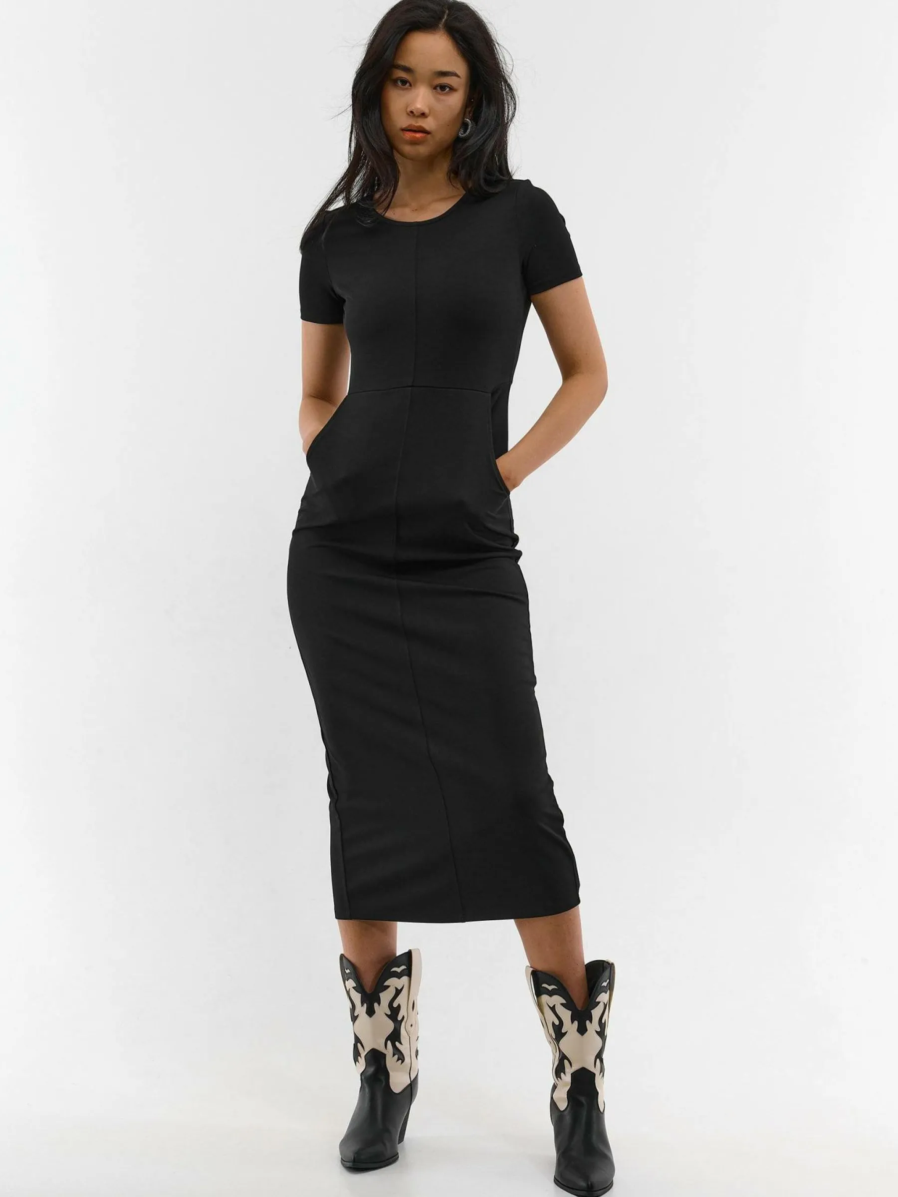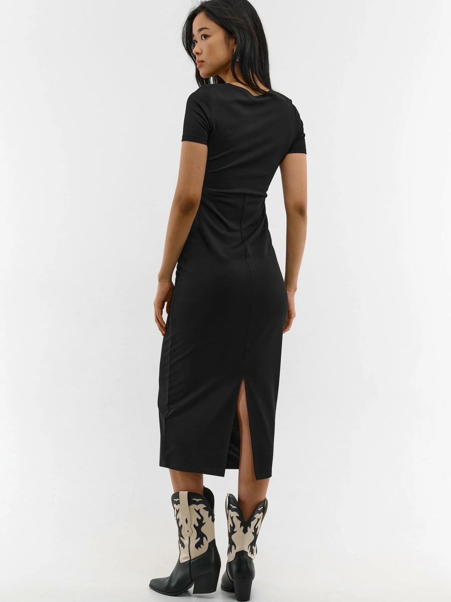 Kolor: czarnyKrój: ołówkoweTyp: sukienkaRekaw: krótki rękawDługość: midiPattern style: pojedynczy kolorDetal: z …