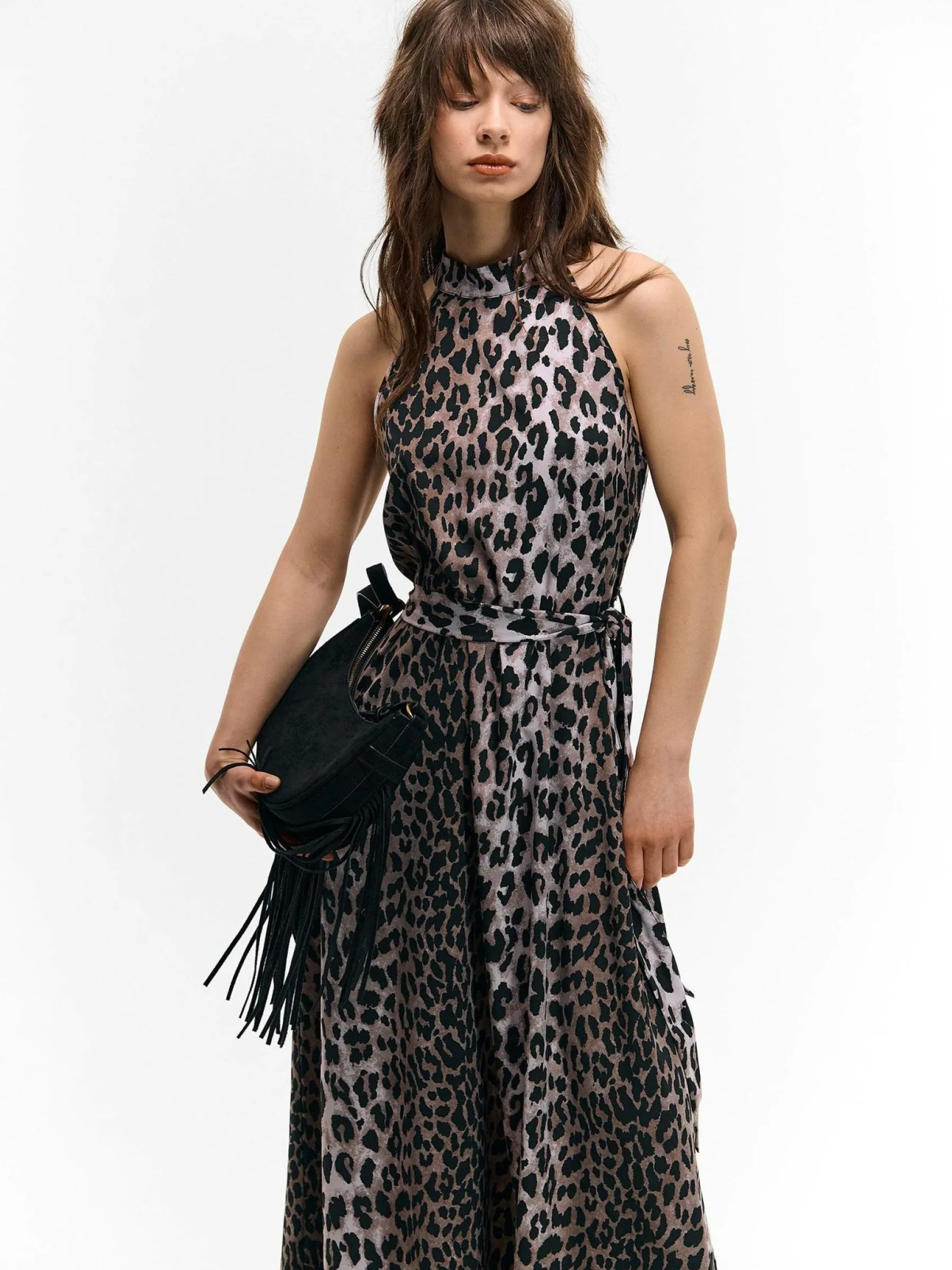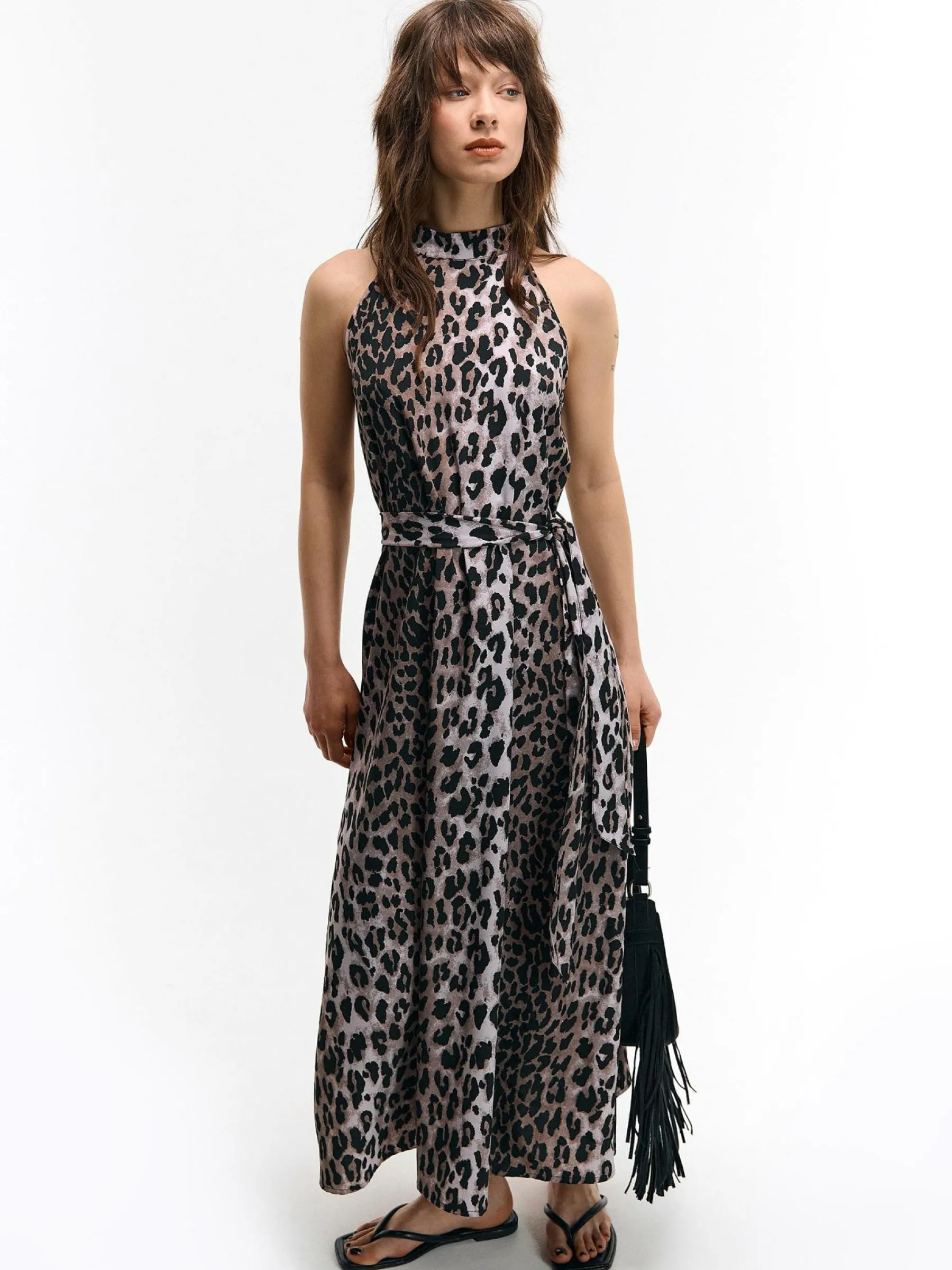 Kolor: brązowyKrój: asyTyp: sukienkaRekaw: bez rękawówDługość: maxiPattern style: zwierzecyDetal: z paskiem, nad …