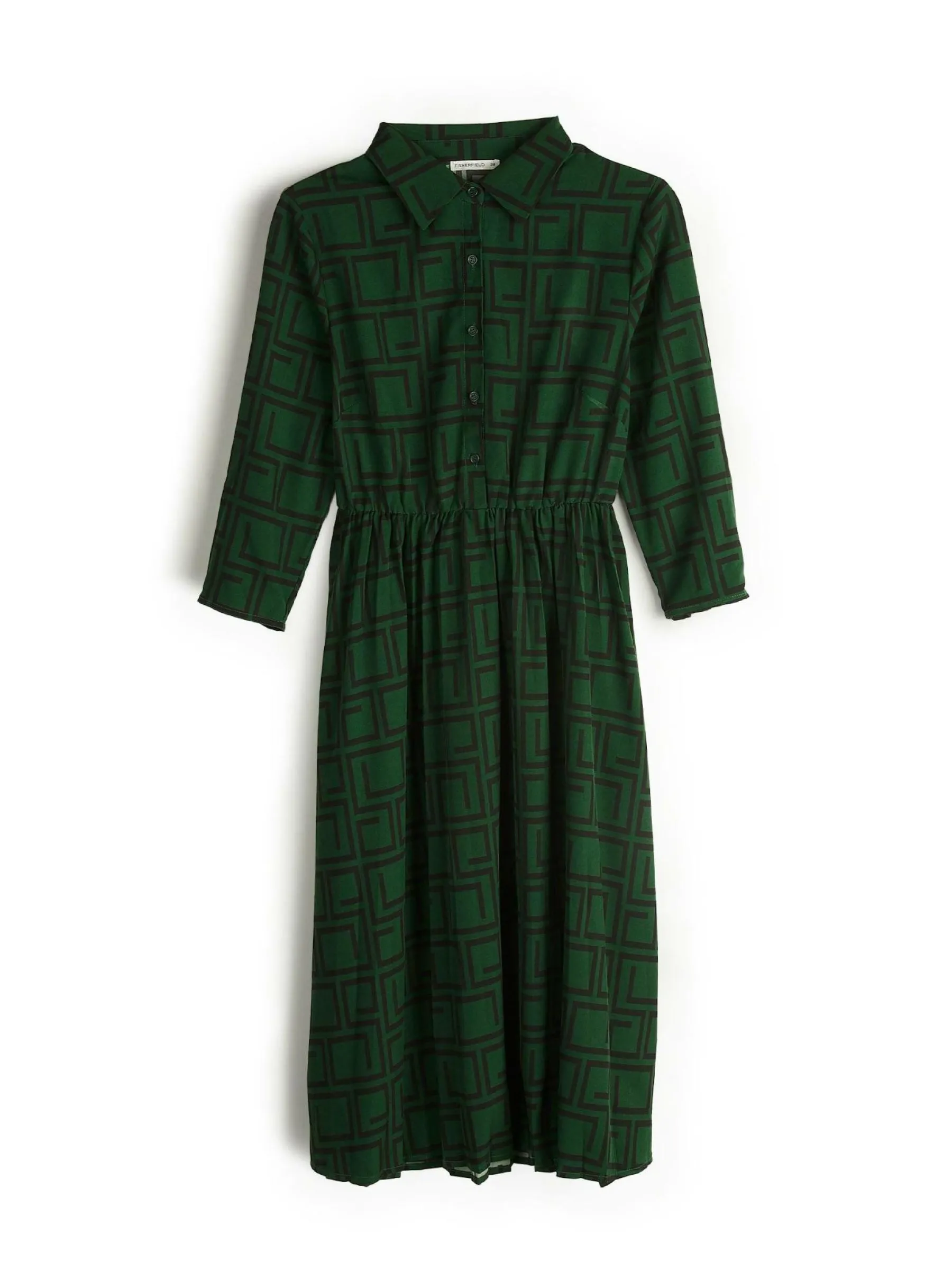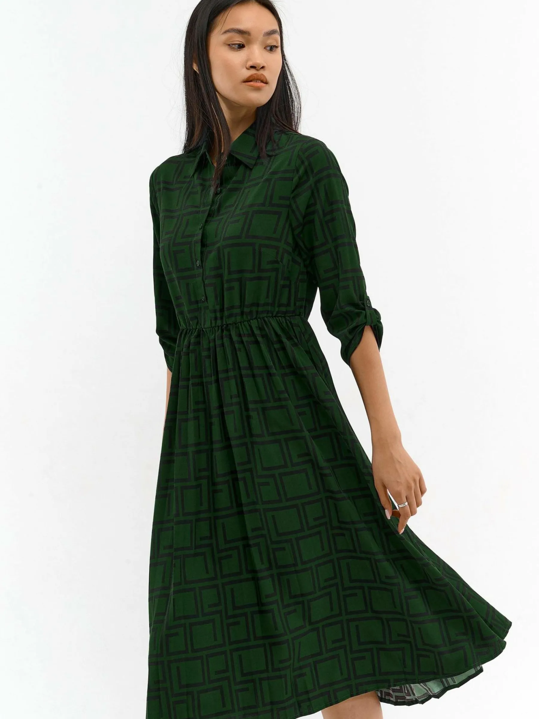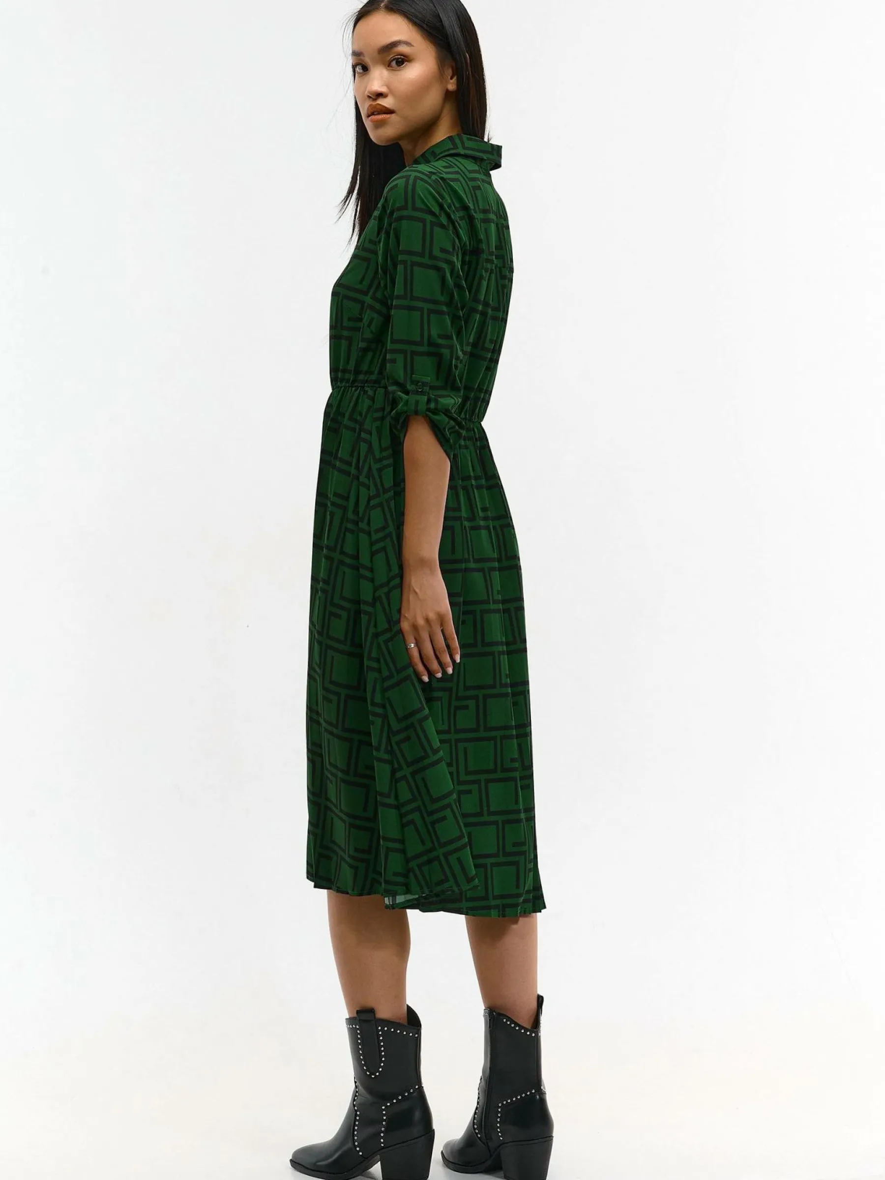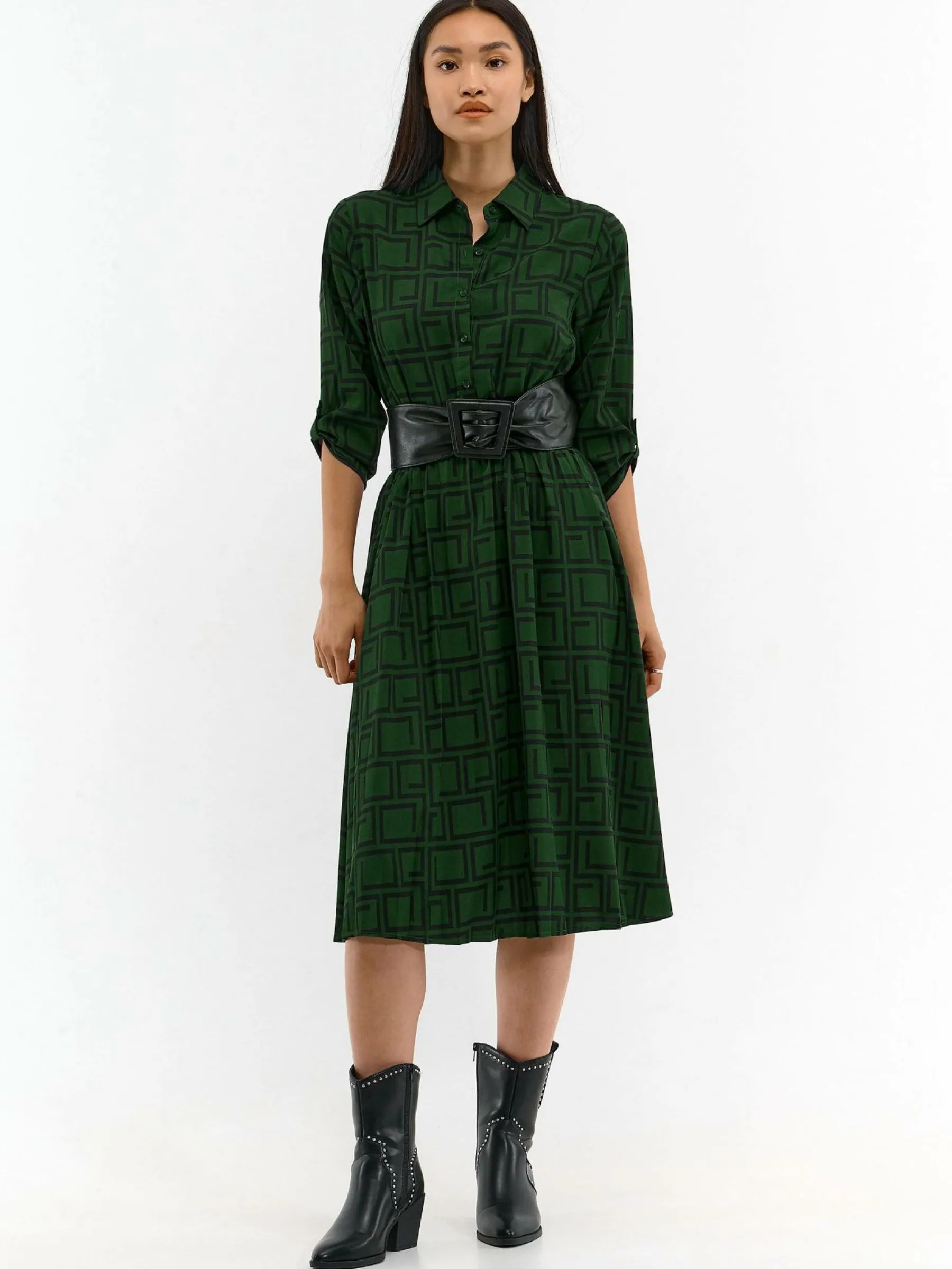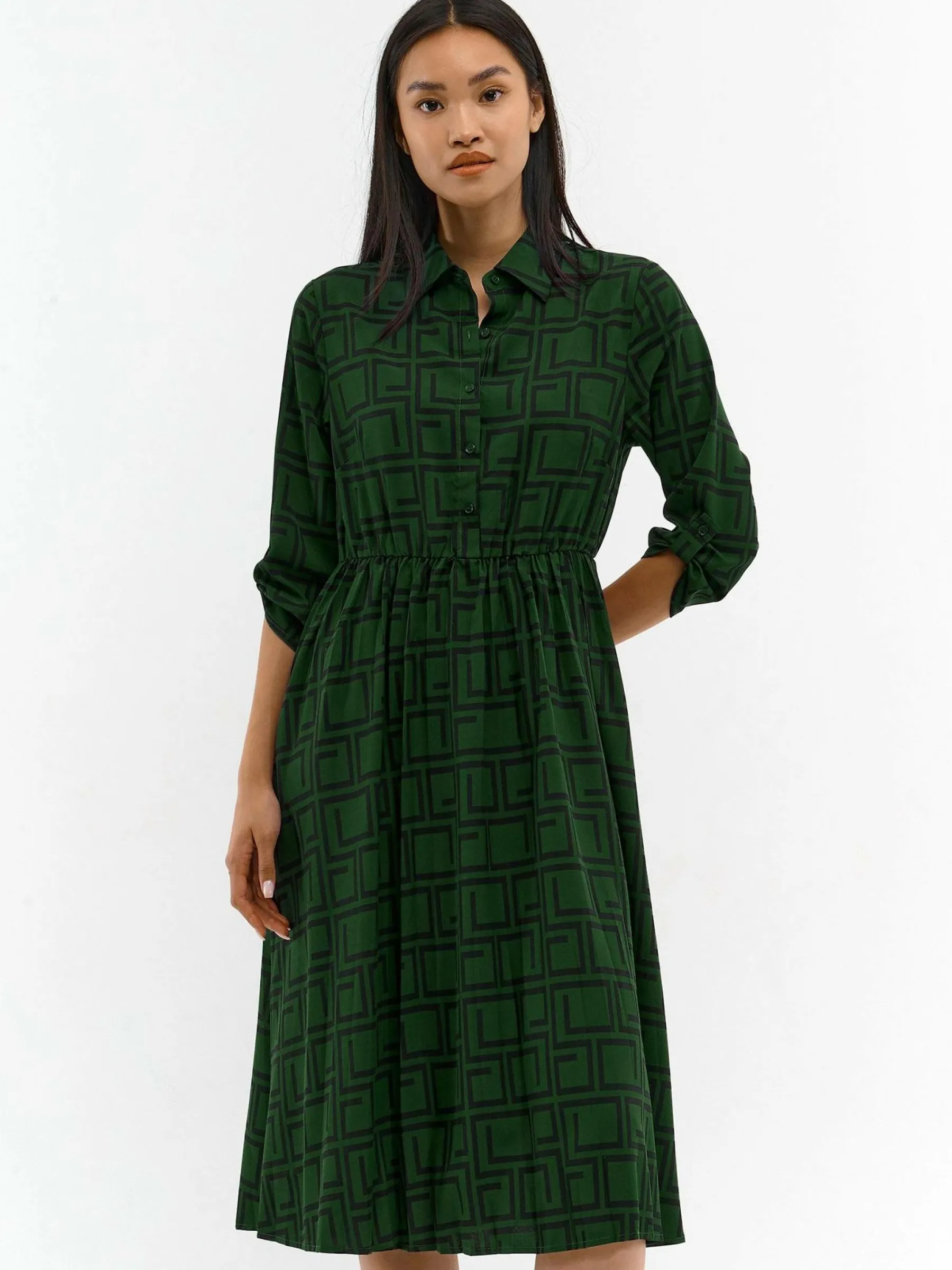 Kolor: zielonyKrój: koszulowe, asyTyp: sukienkaRekaw: rękaw 3/4Długość: midiPattern style: wzorzysteDetal: na guzik…