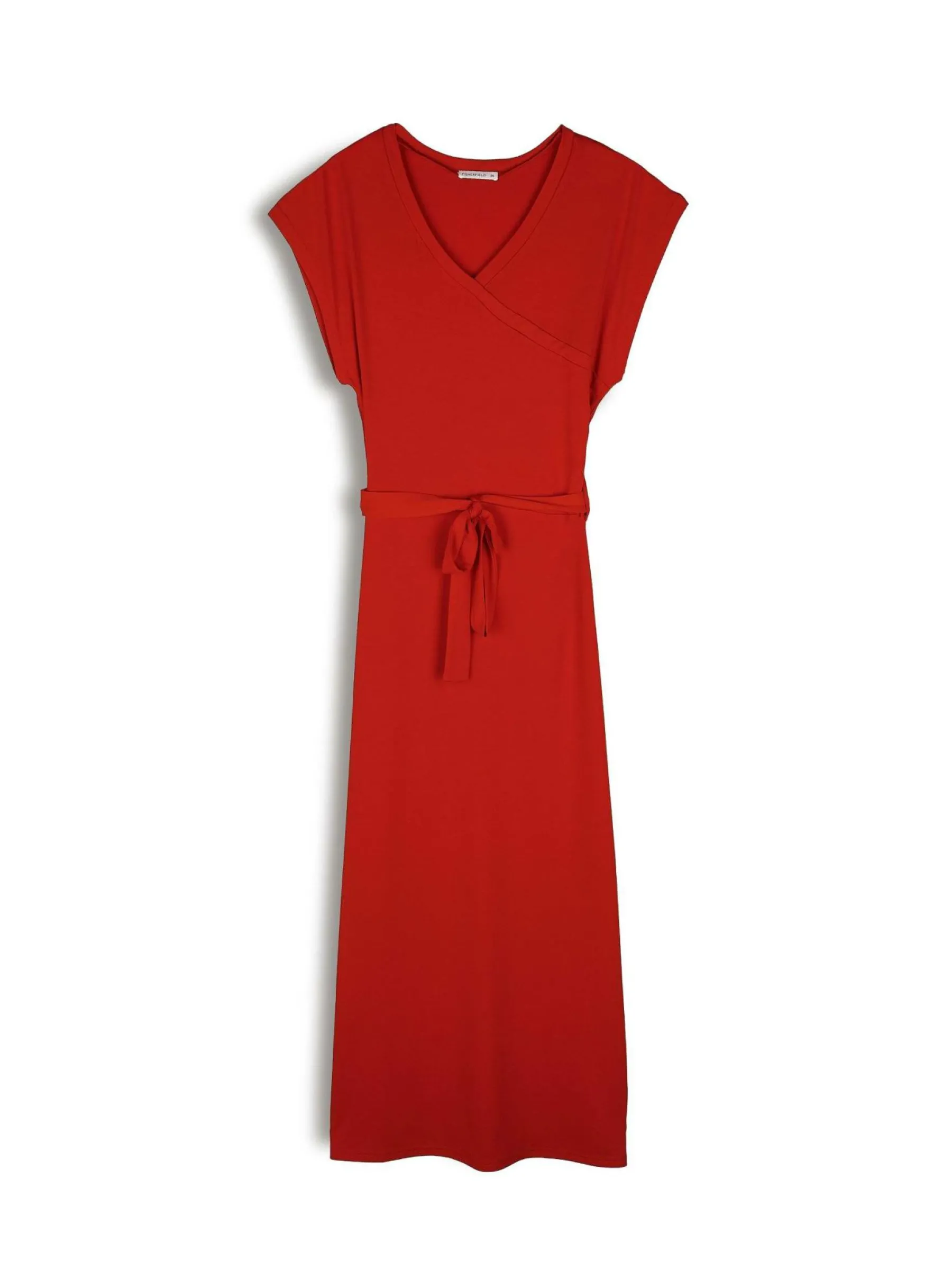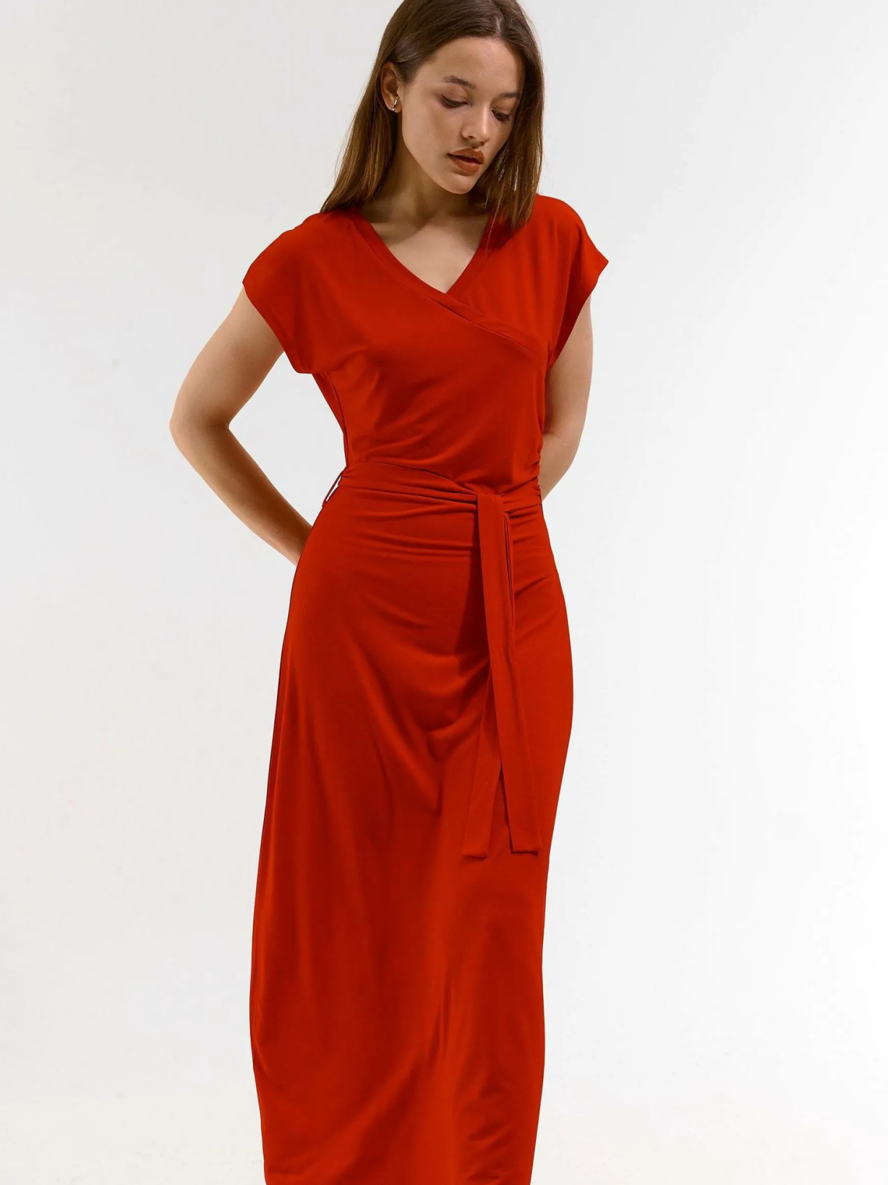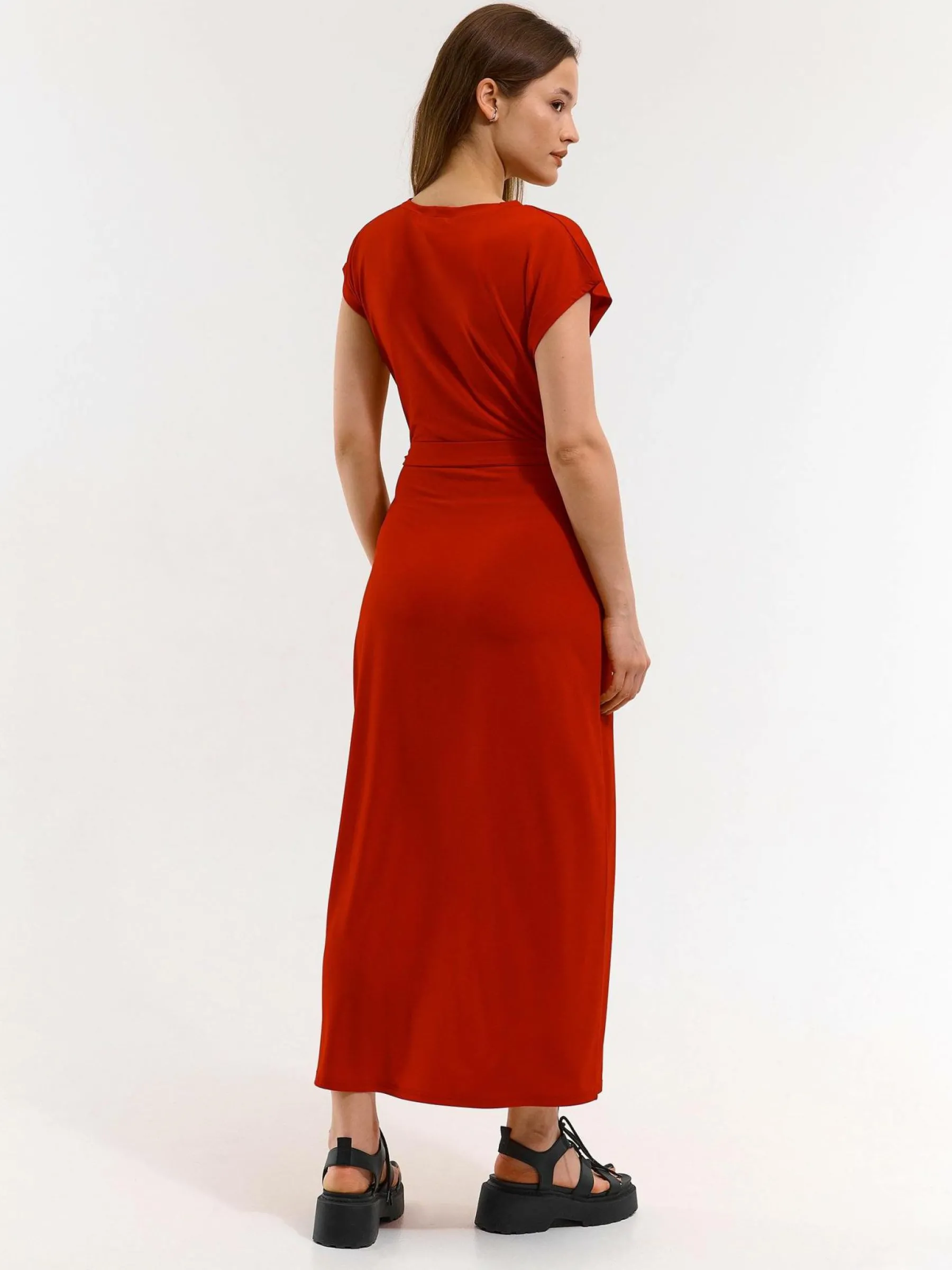 Kolor: czerwonyKrój: kopertówkiTyp: sukienkaRekaw: krótki rękawDługość: midiPattern style: pojedynczy kolorDetal:…