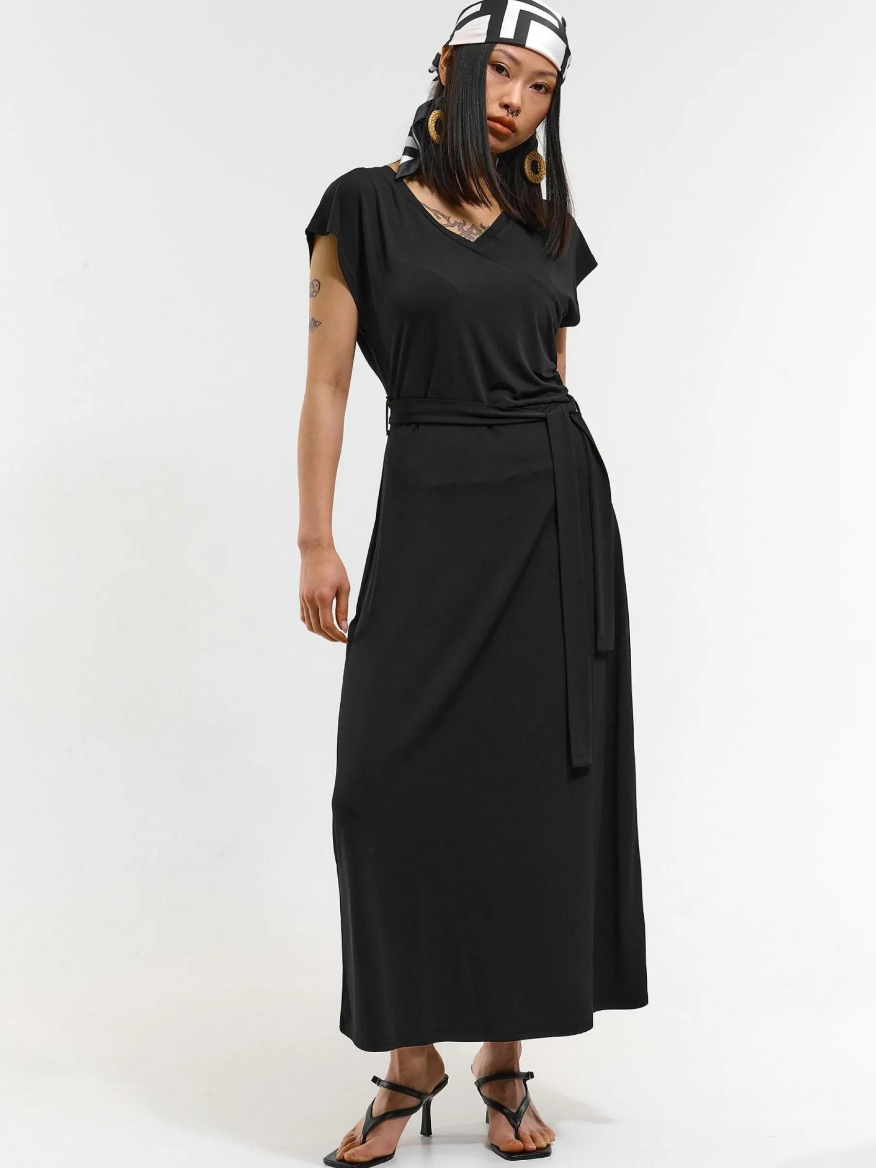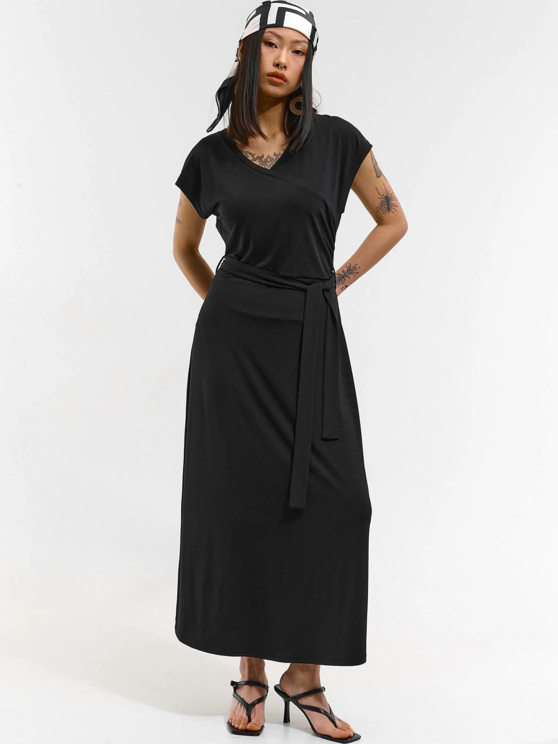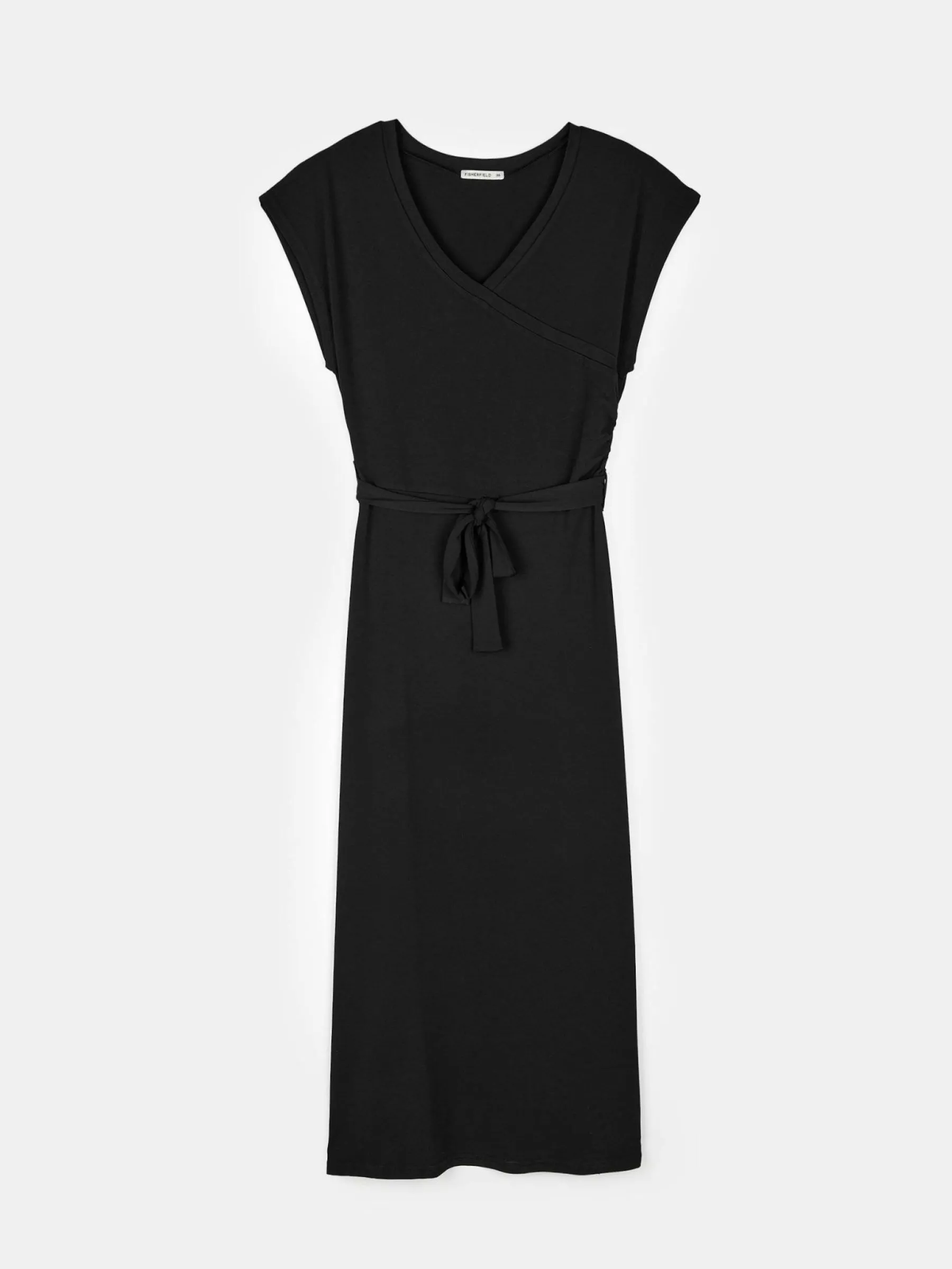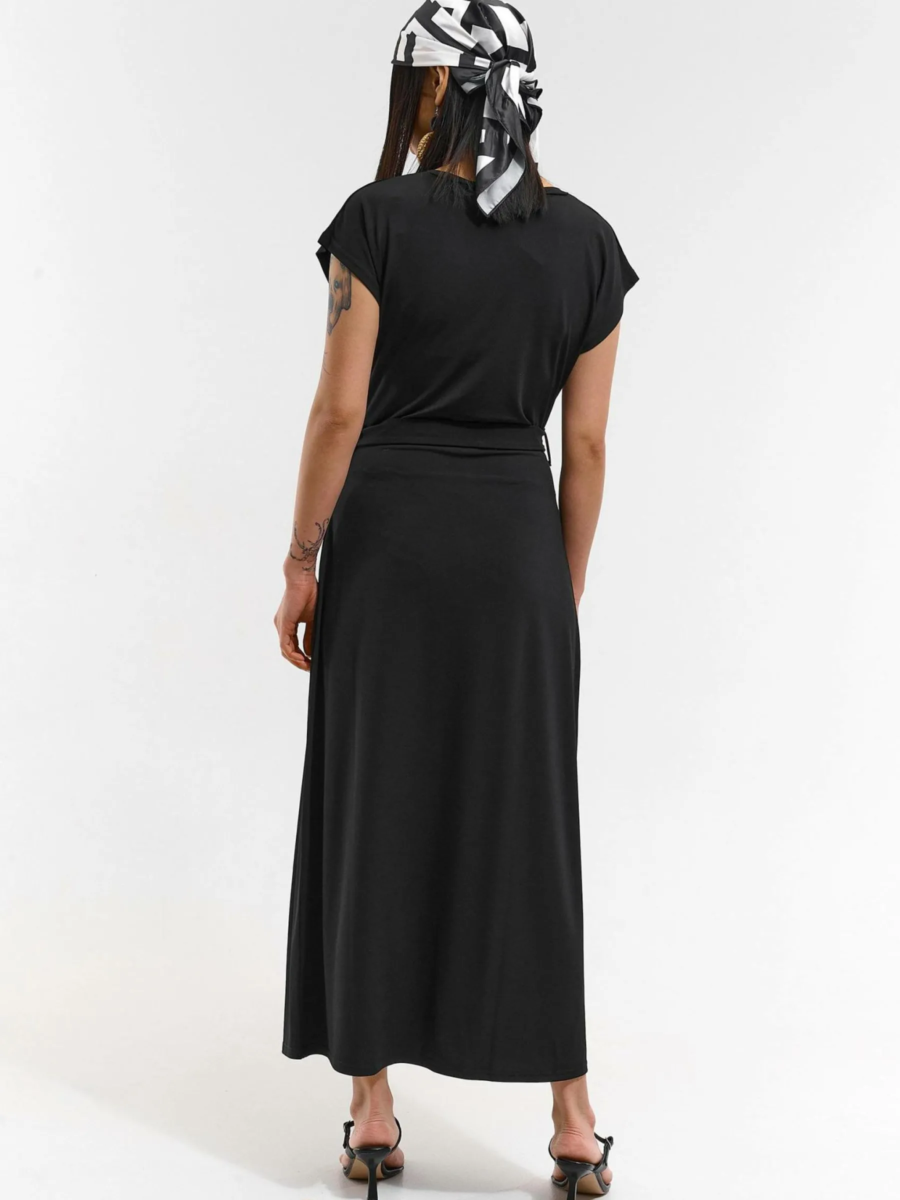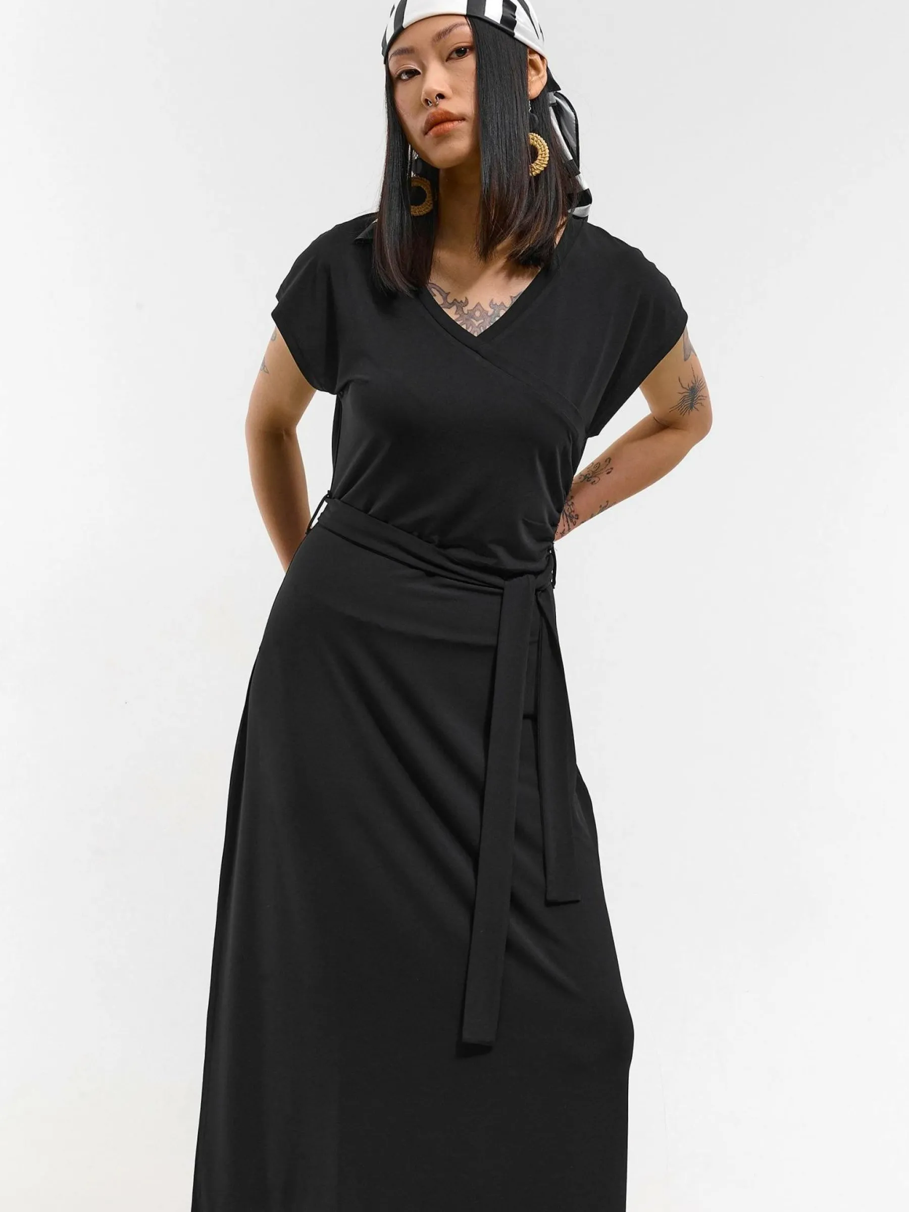 Kolor: czarnyKrój: kopertówkiTyp: sukienkaRekaw: krótki rękawDługość: midiPattern style: pojedynczy kolorDetal: n…