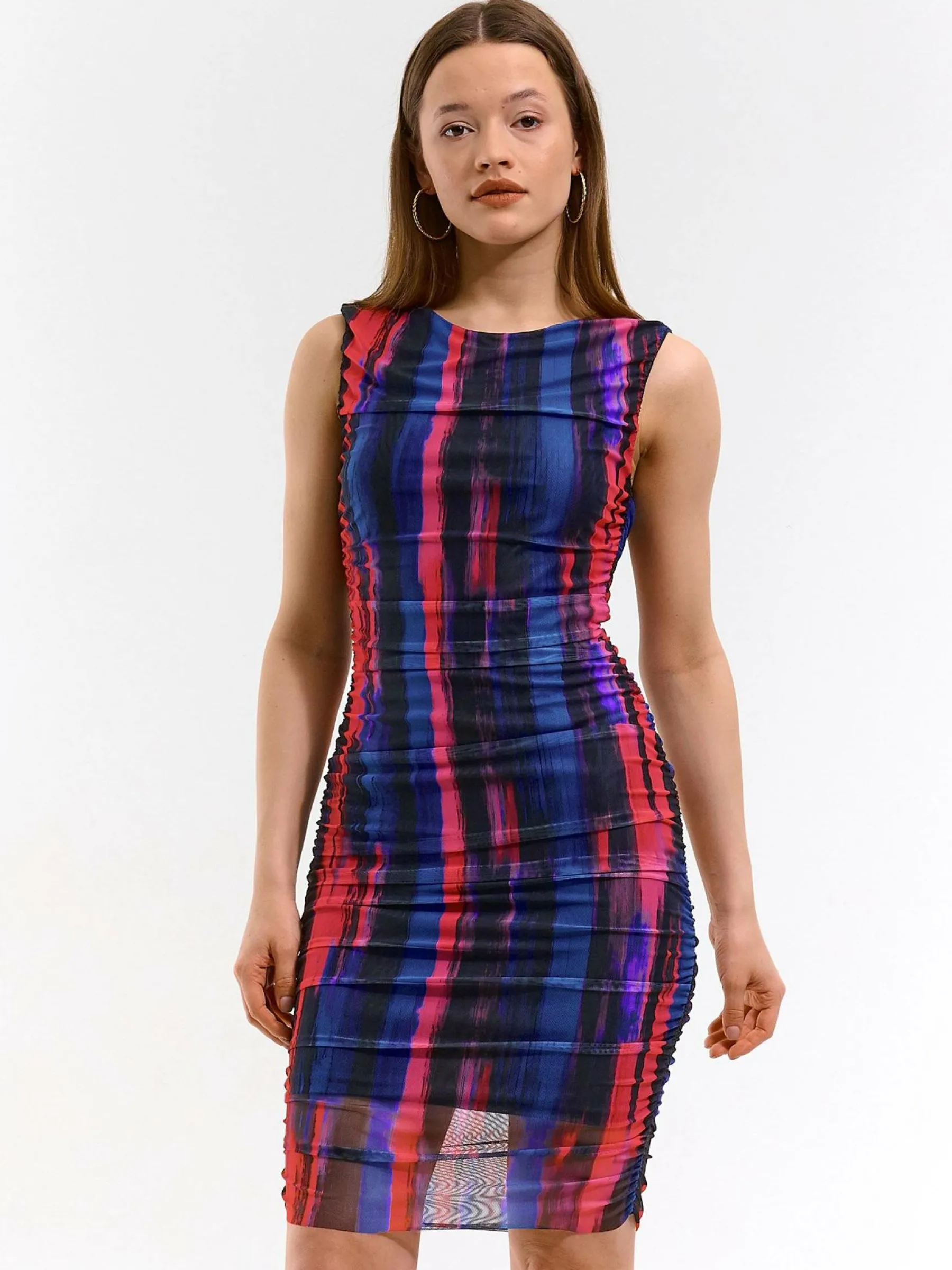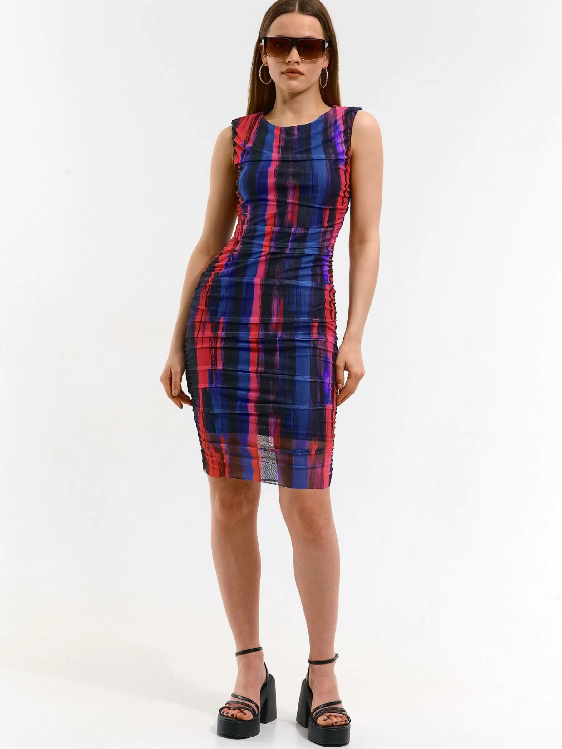 Kolor: różowyKrój: z marszczeniemTyp: sukienkaRekaw: bez rękawówDługość: miniPattern style: wielobarwnyDetal: na…