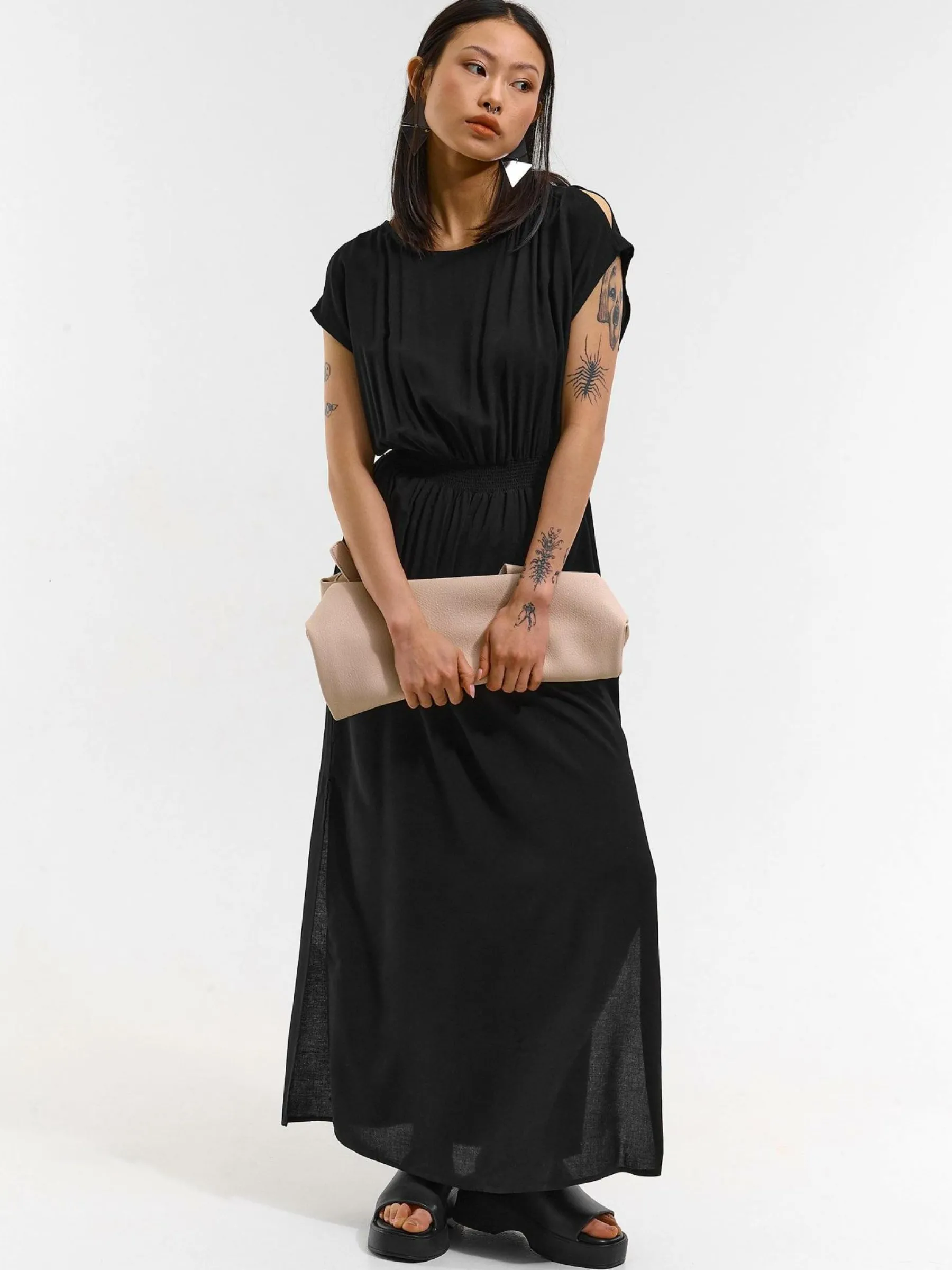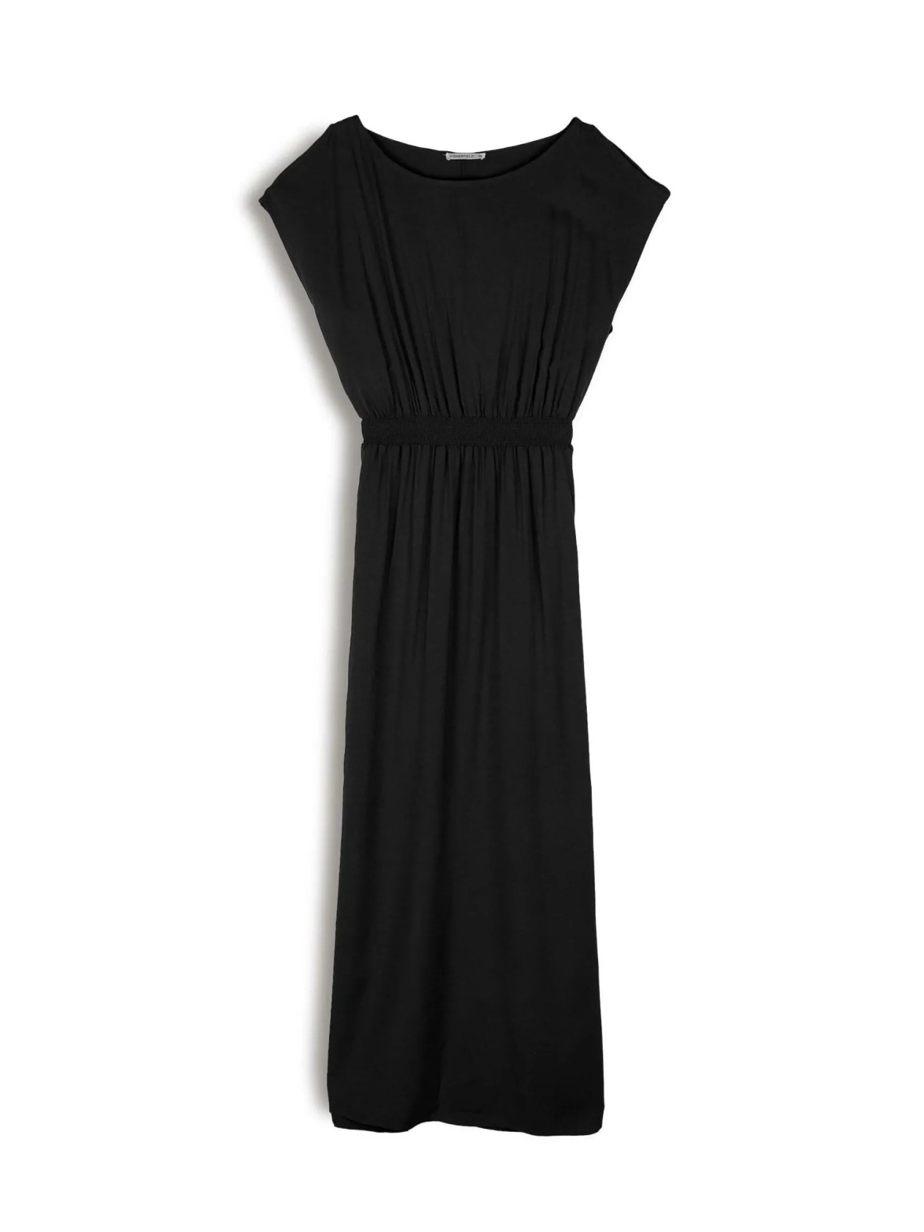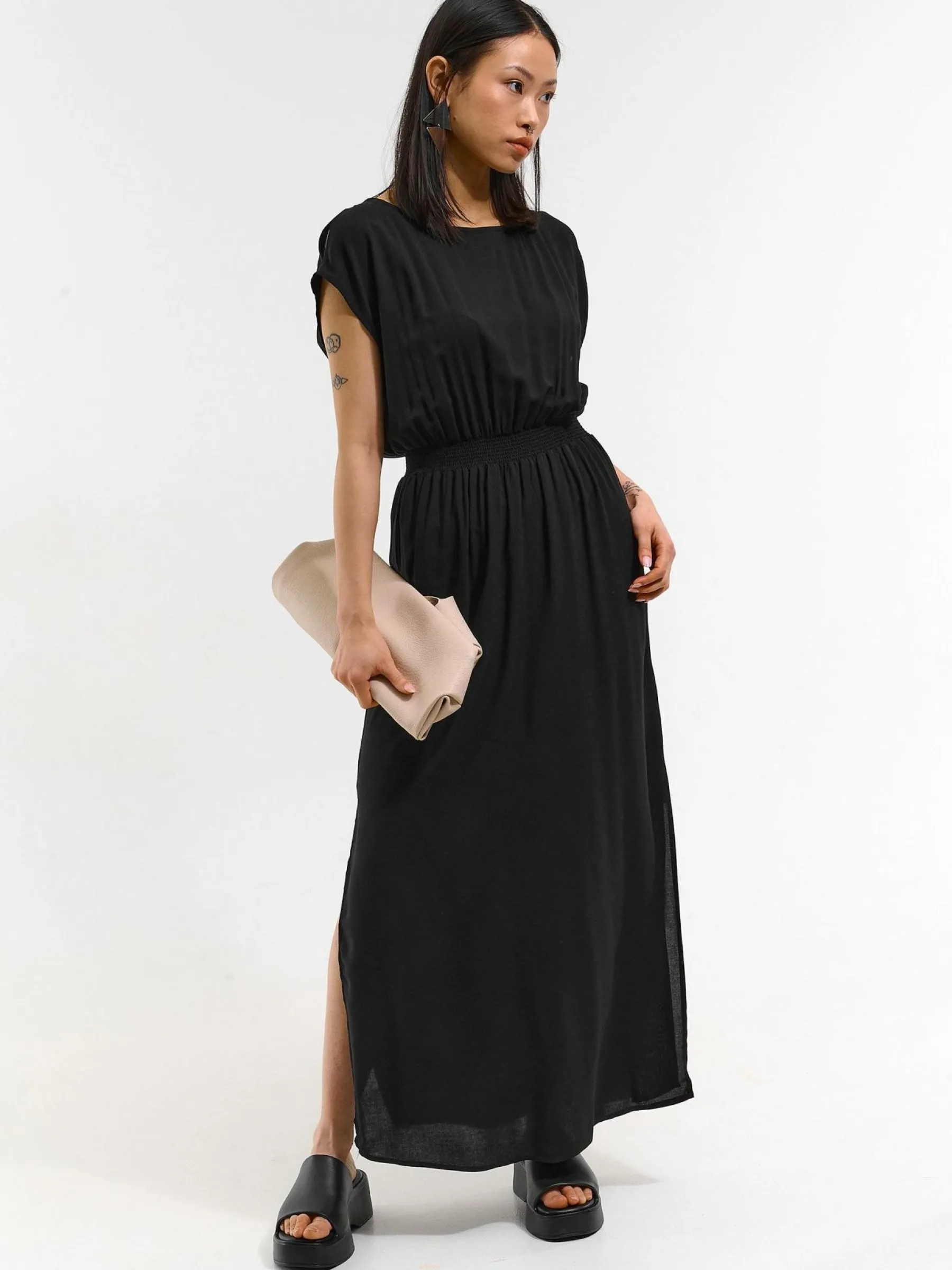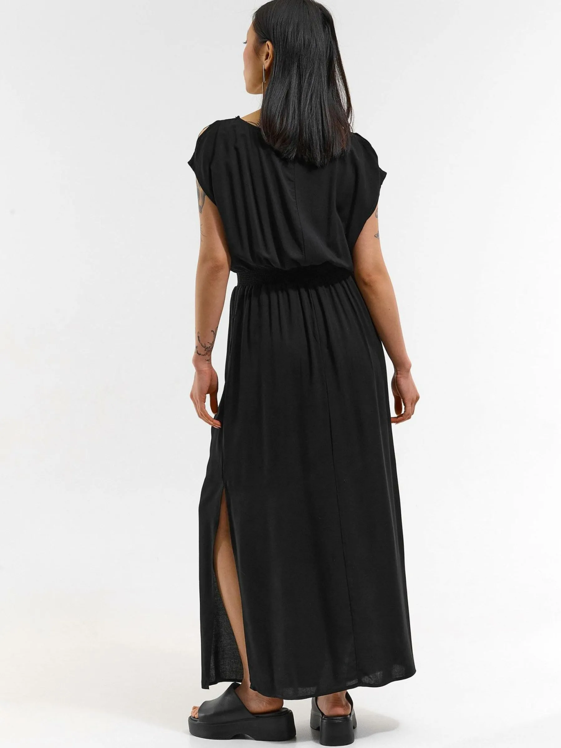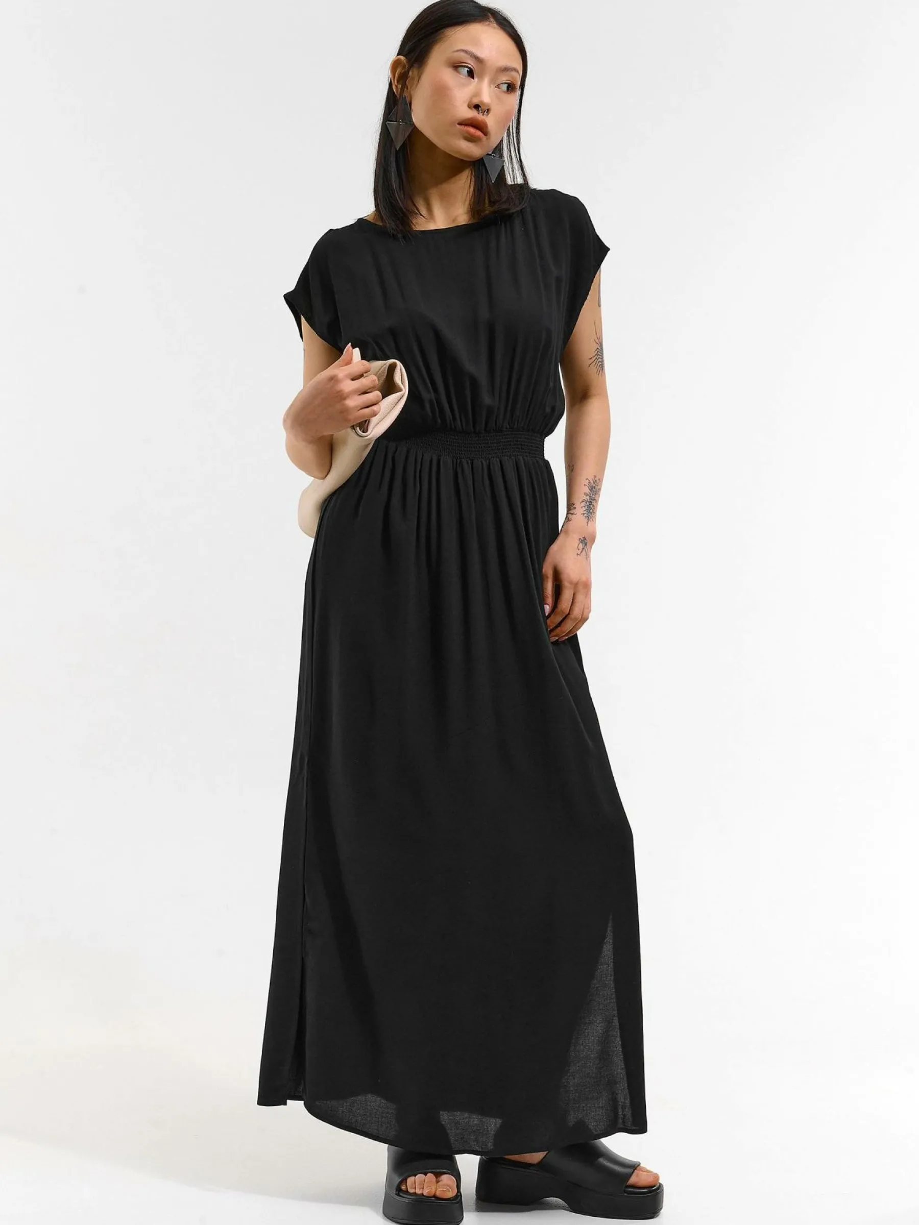 Kolor: czarnyKrój: z marszczeniemTyp: sukienkaRekaw: krótki rękawDługość: maxiPattern style: pojedynczy kolorDetal…