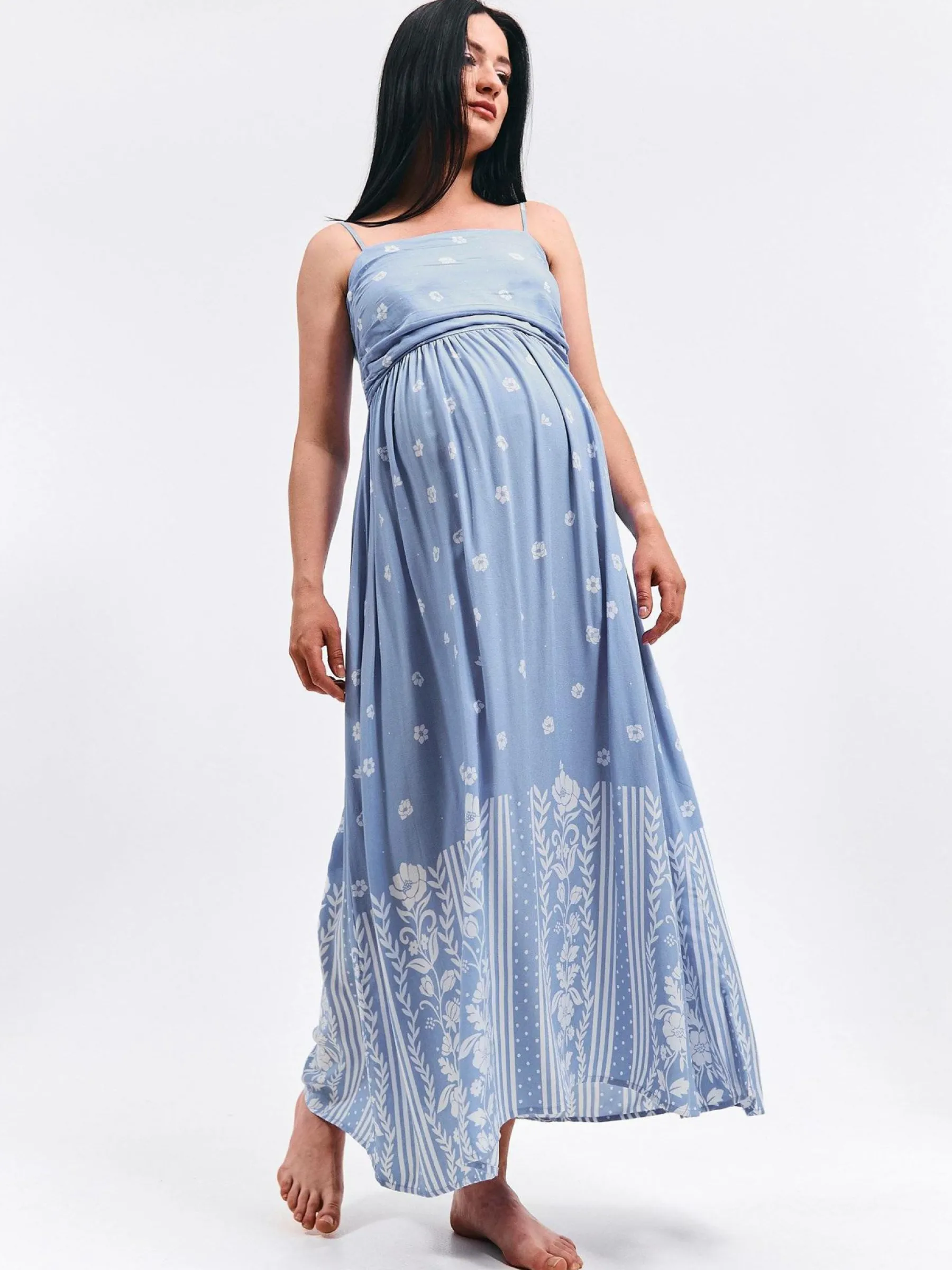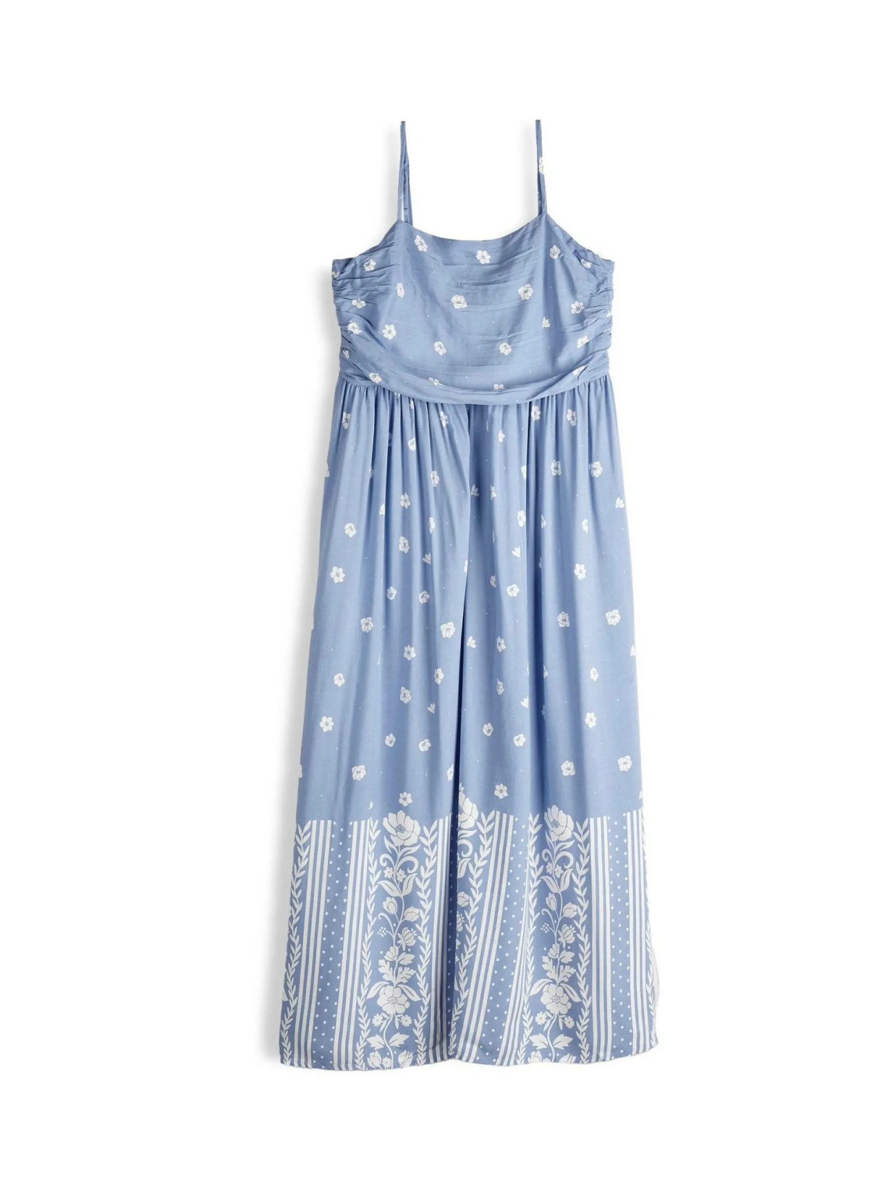Kolor: niebieskiKrój: z marszczeniemTyp: sukienkaRekaw: bez rękawówDługość: midiPattern style: kwiatoweDetal: z ra…
