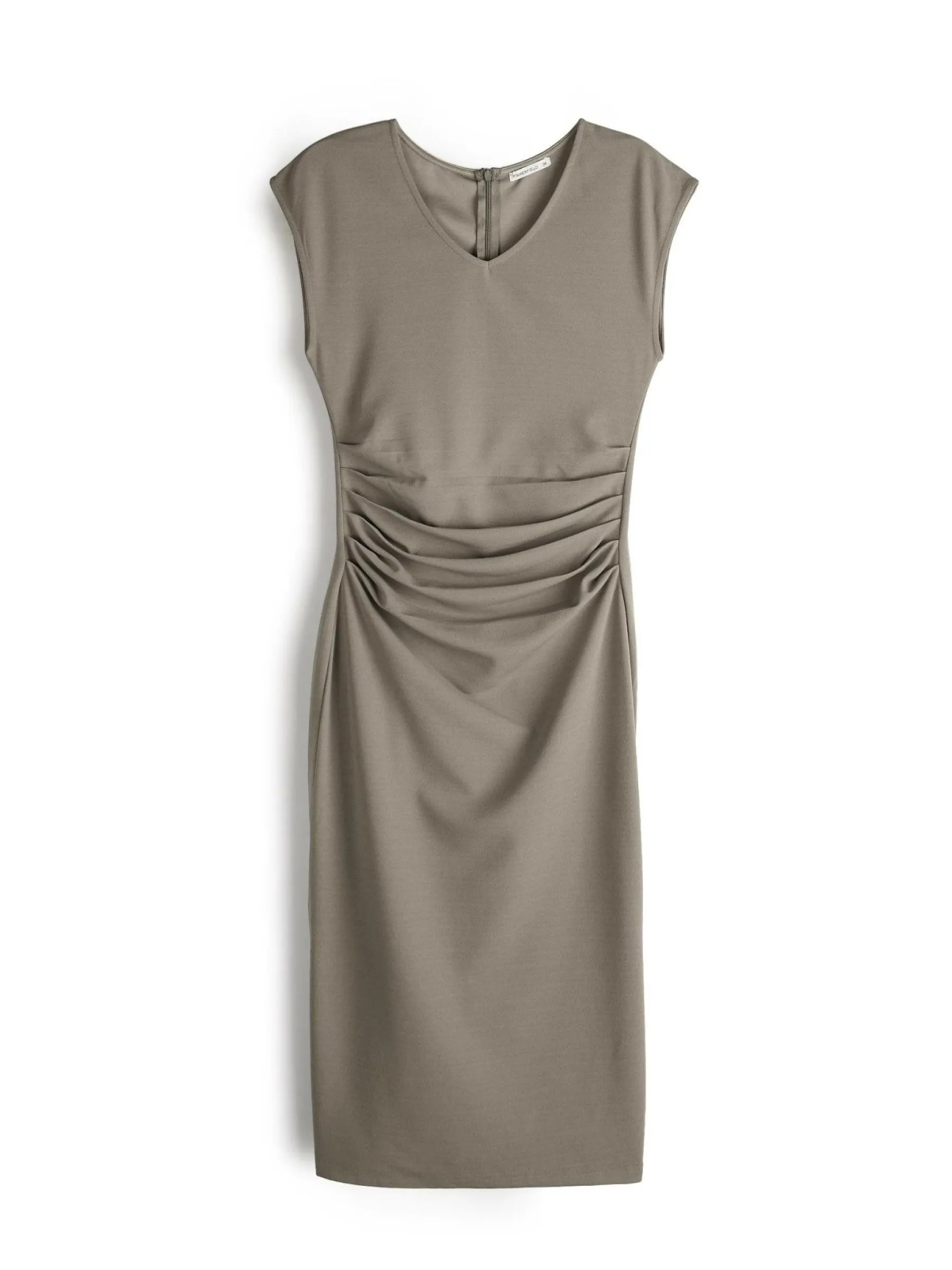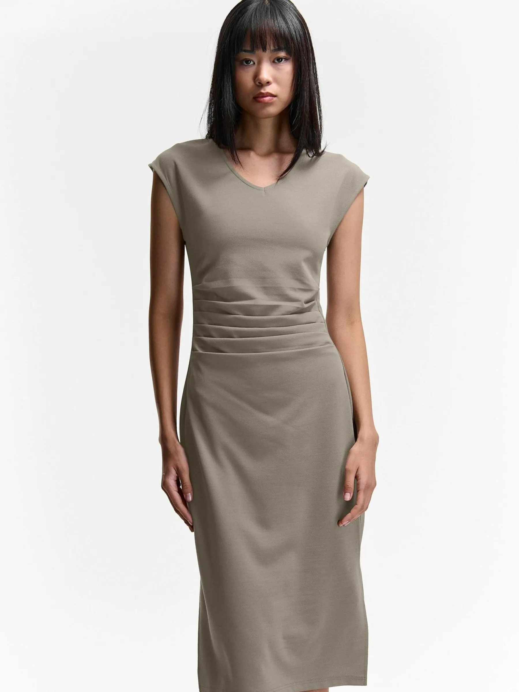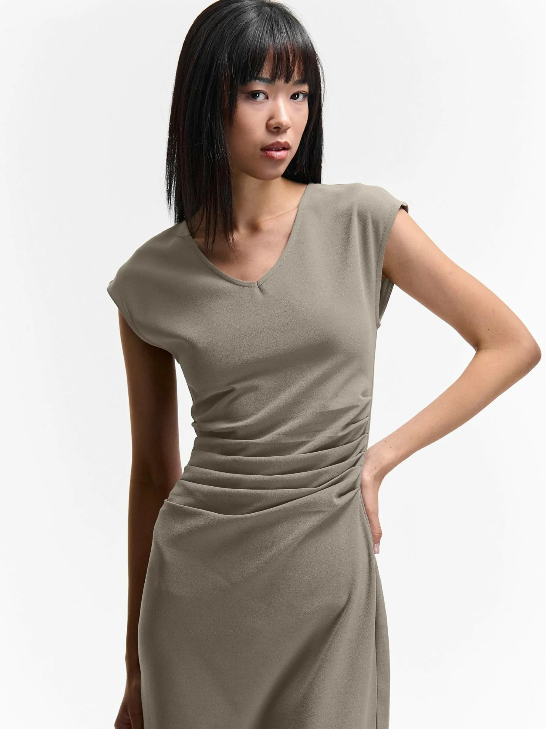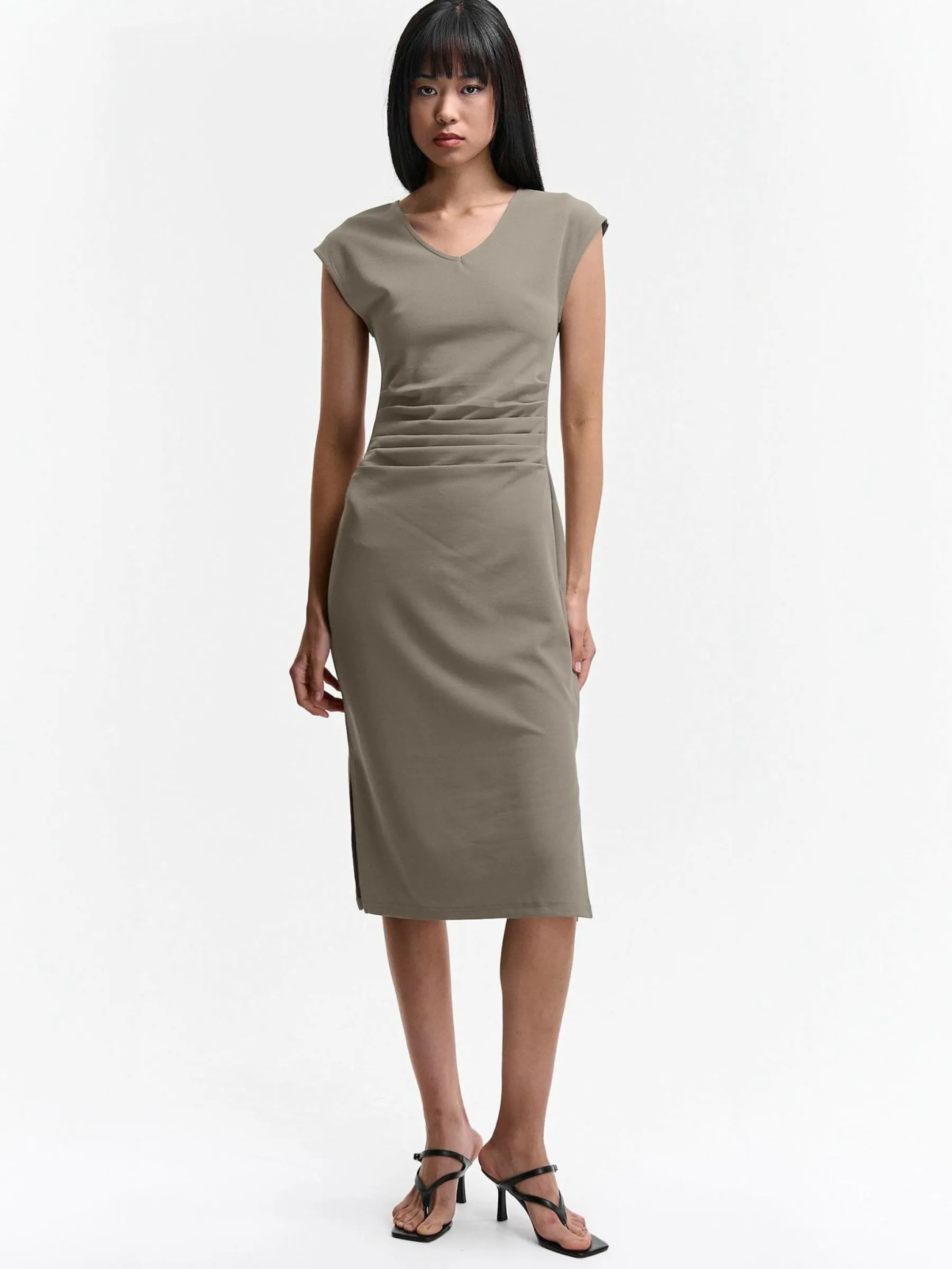 Kolor: szaryKrój: z marszczeniemTyp: sukienkaRekaw: bez rękawówDługość: midiPattern style: pojedynczy kolorDetal: …