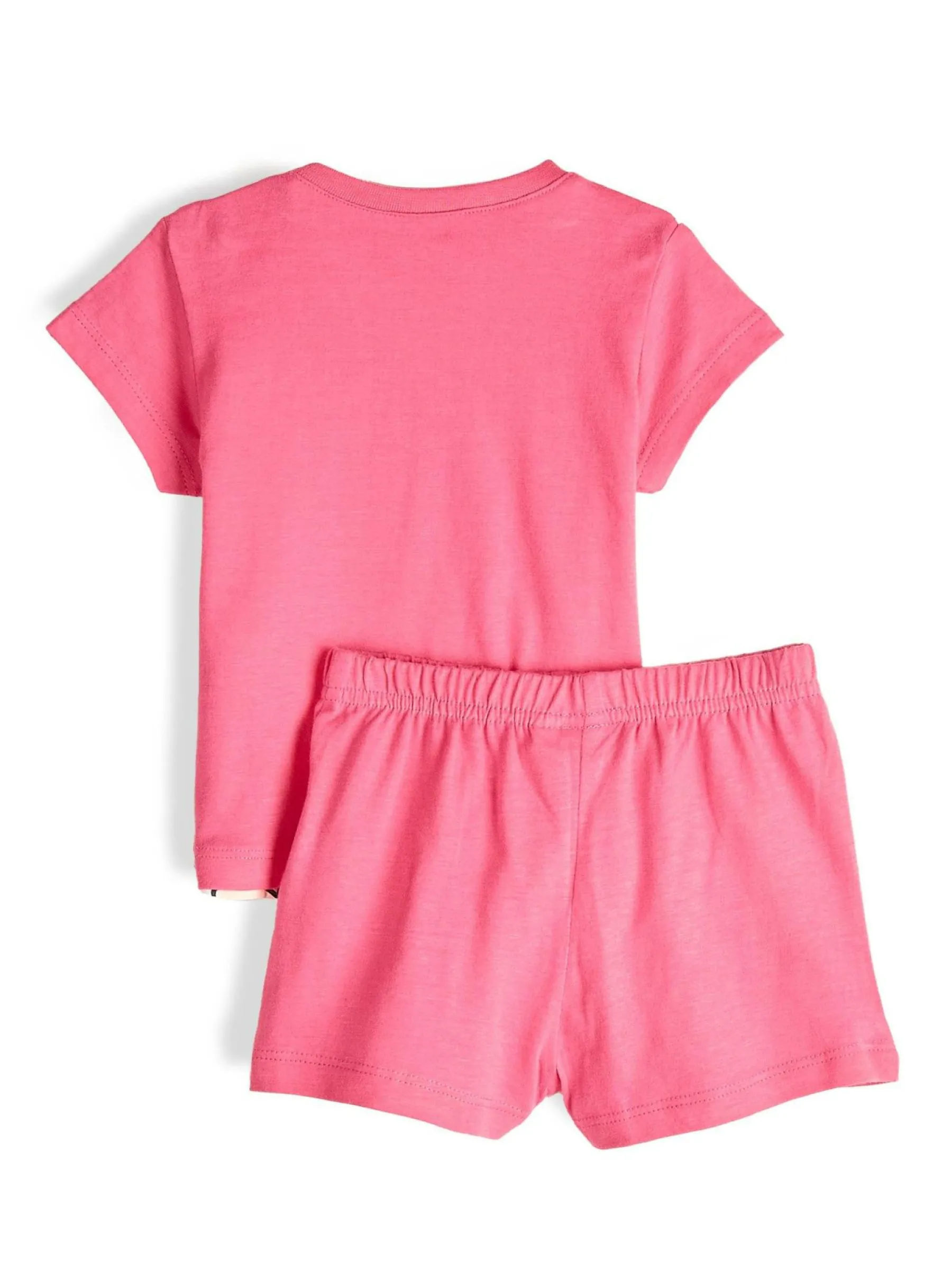 Kolor: różowyKrój: dwuczęściowy, podstawowyTyp: piżama, koszulkaRekaw: krótki rękawDługość: krótkiPattern st…
