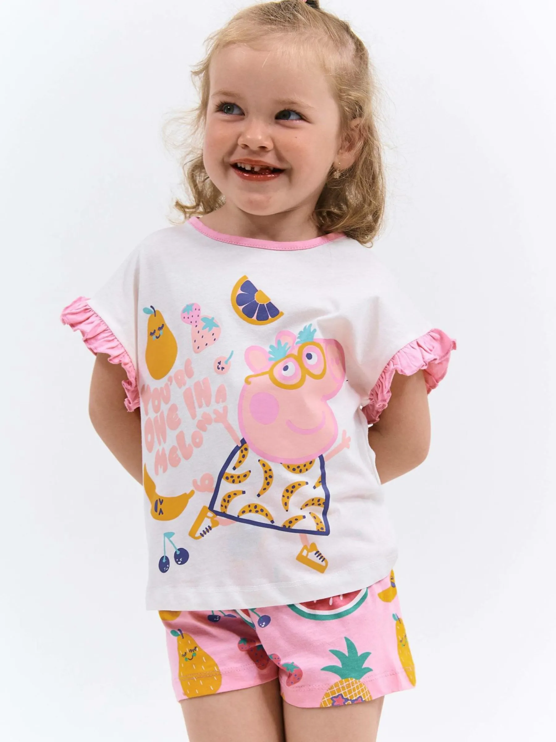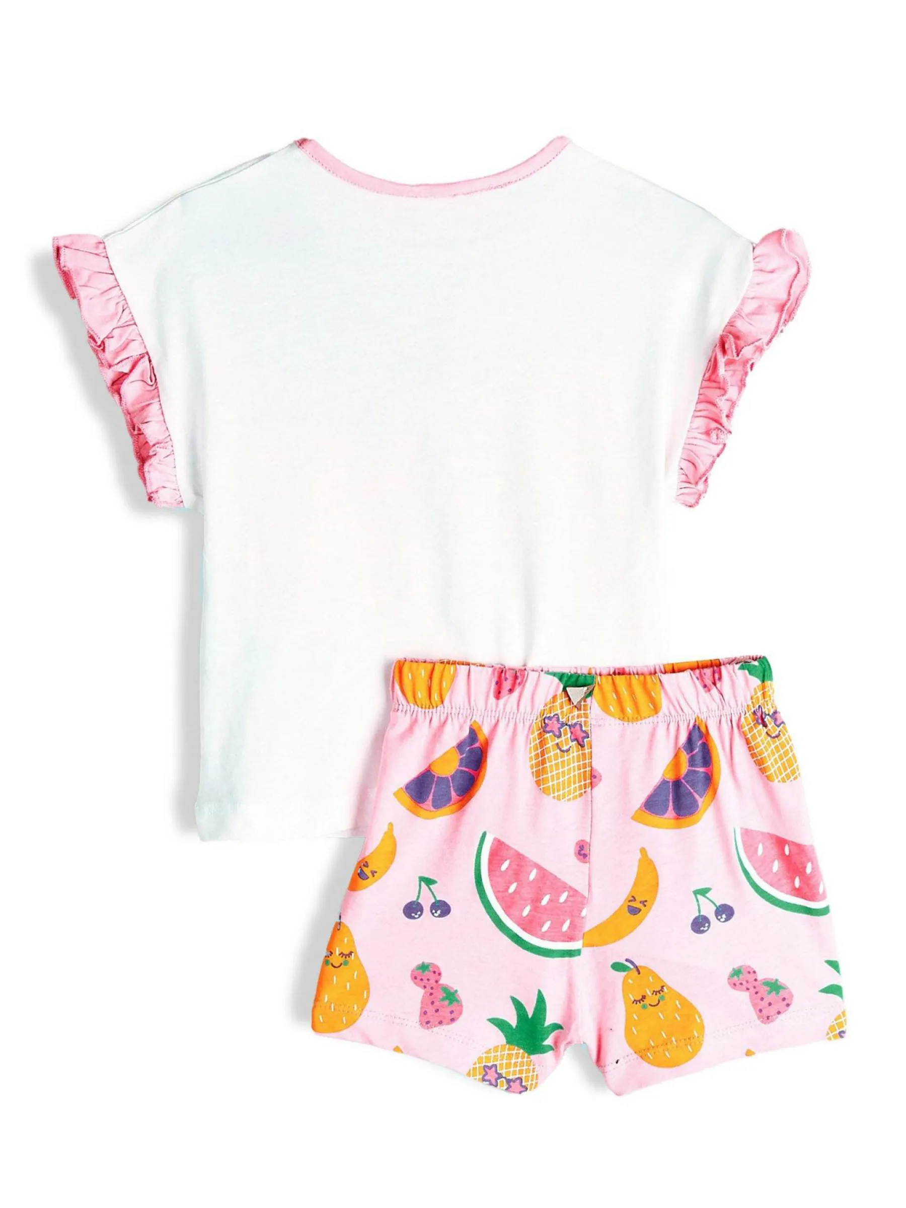 Kolor: białyKrój: z falbaną, dwuczęściowyTyp: piżama, koszulkaRekaw: krótki rękawDługość: krótkiPattern styl…
