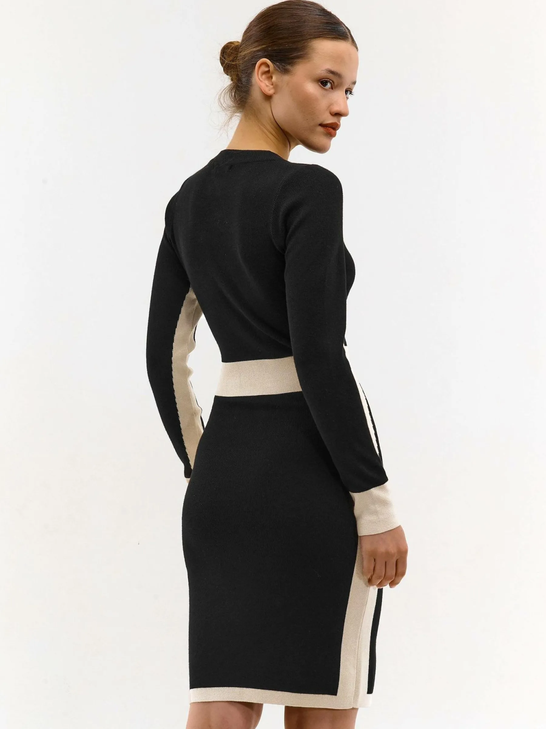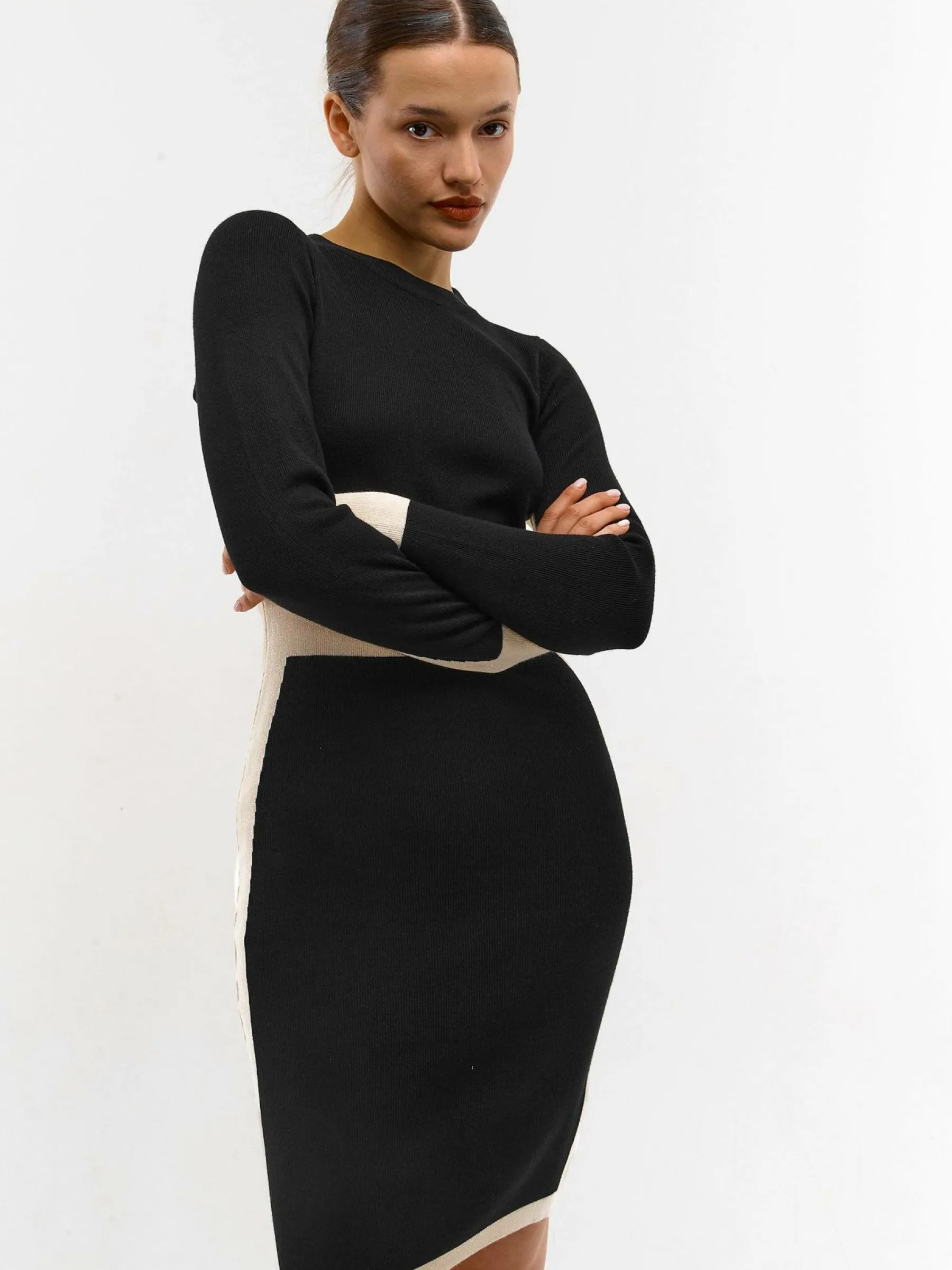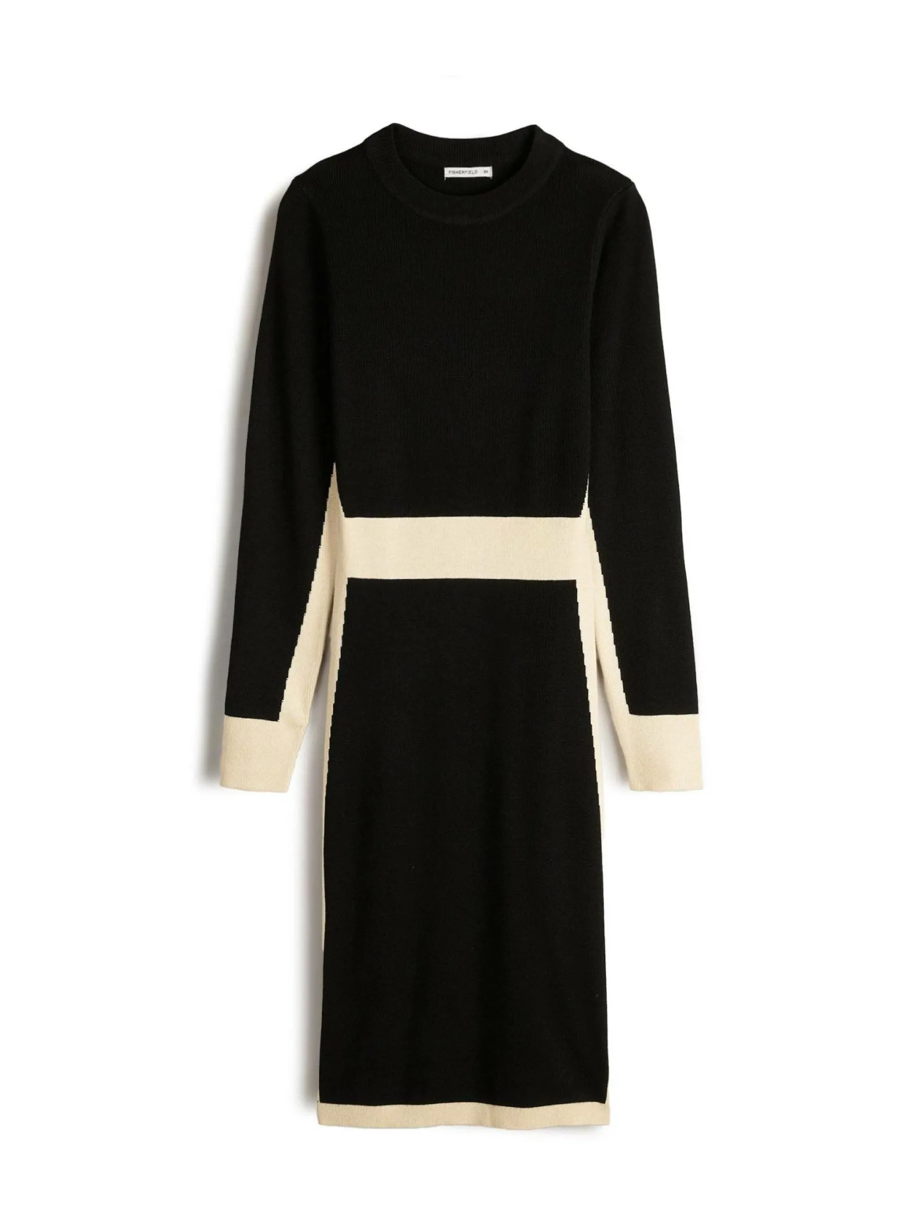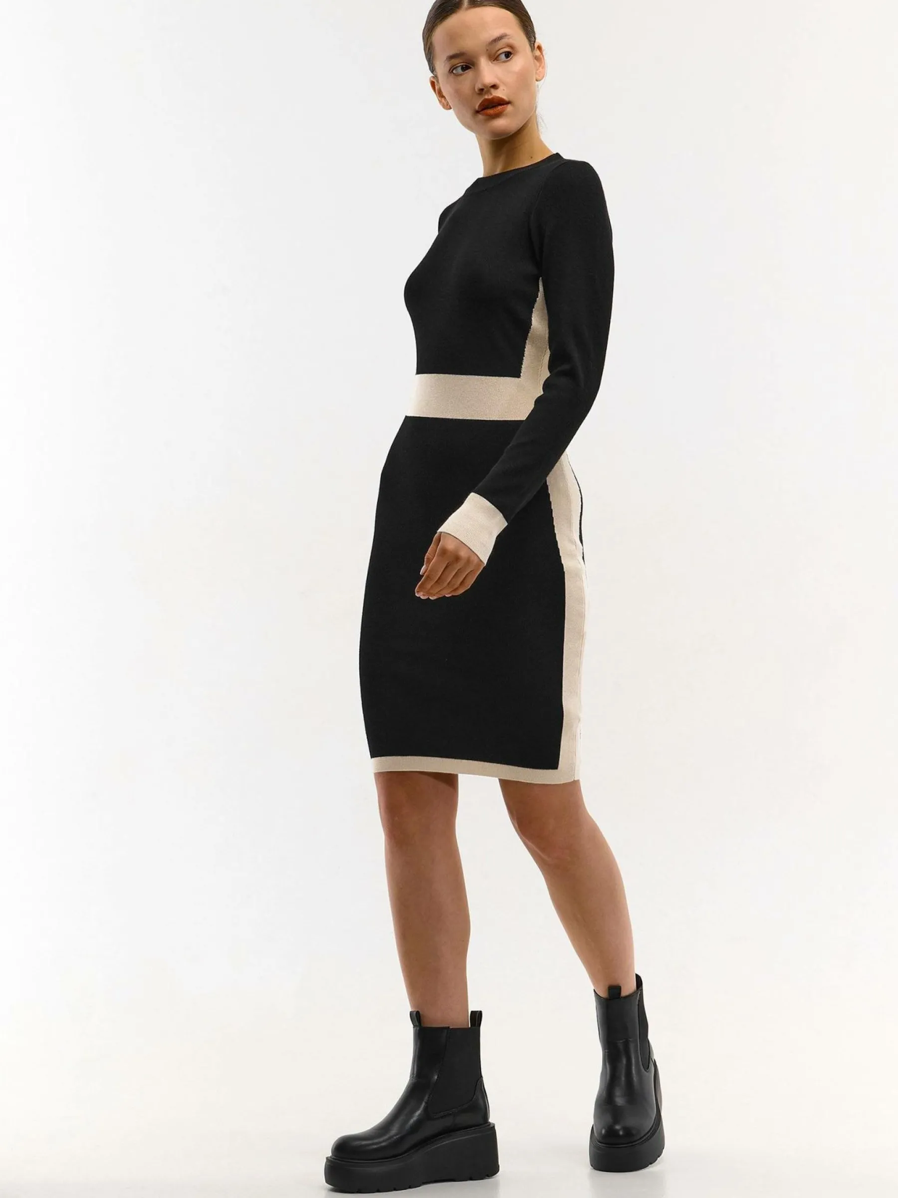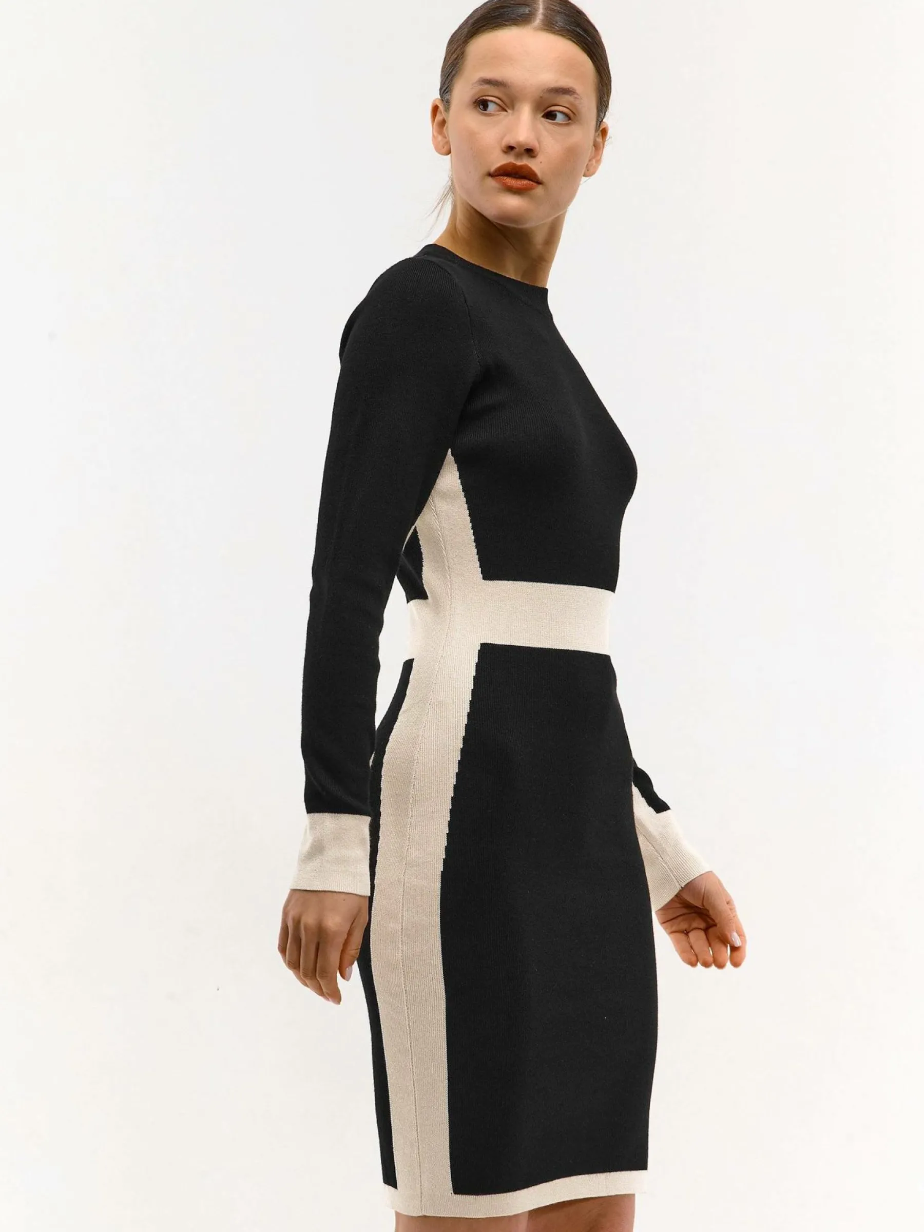Kolor: czarnyKrój: ołówkoweTyp: sukienkaRekaw: długi rękawDługość: miniPattern style: colour block, pojedynczy k…